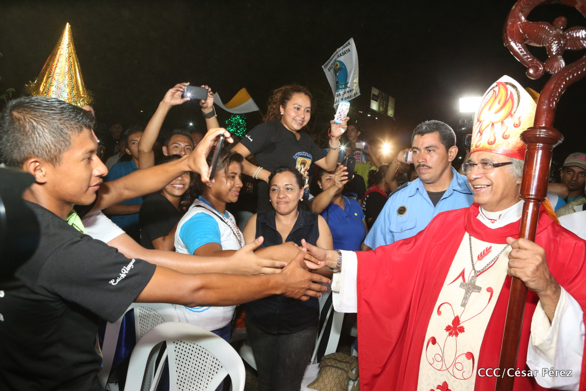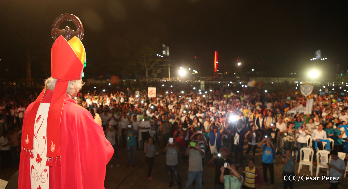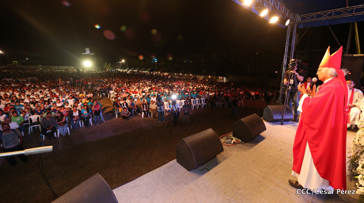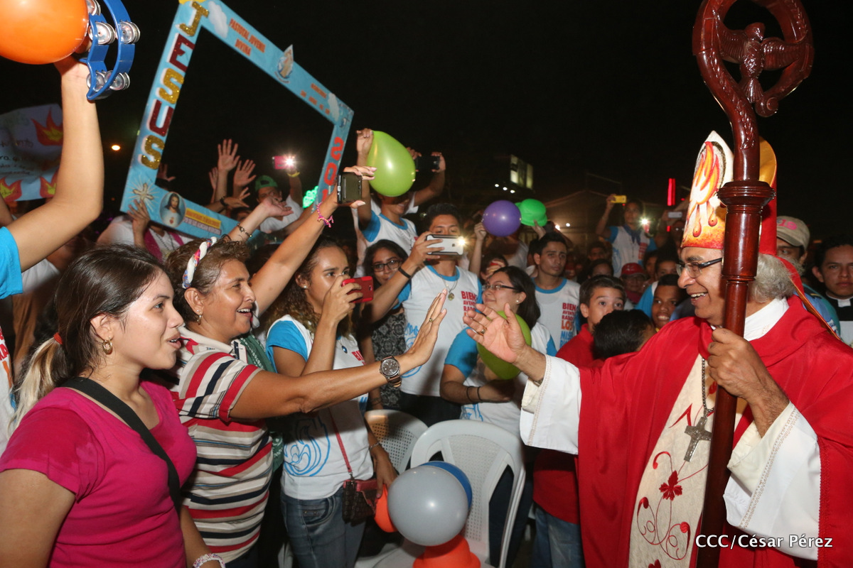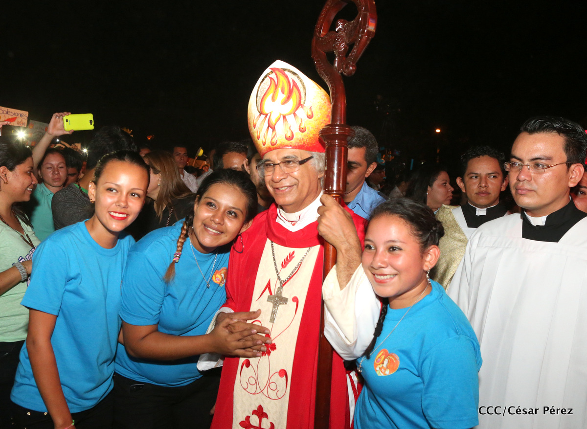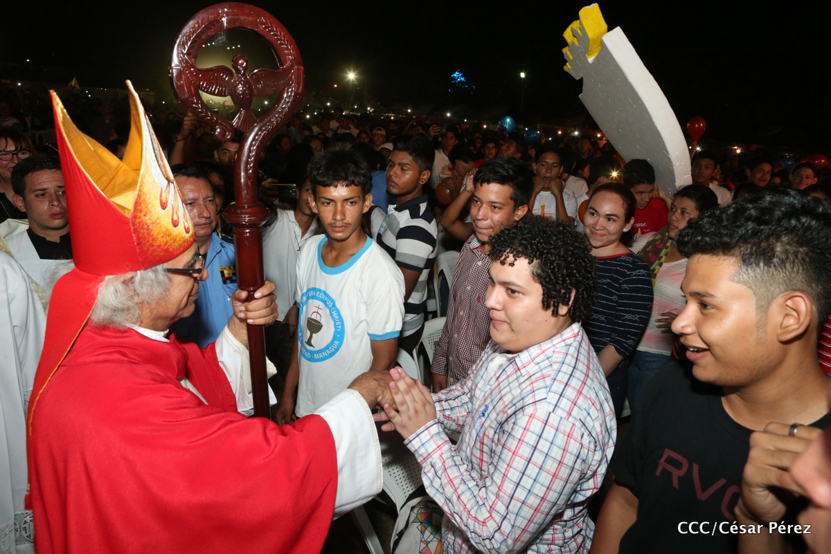Miles de jóvenes católicos, le rindieron un efusivo homenaje la noche de este sábado a Su Eminencia Reverendísima, Cardenal Leopoldo Brenes, quien se encuentra celebrando su Undécimo Aniversario como Arzobispo de la Arquidiócesis de Managua, en el contexto de la XXIV Vigilia de Pentecostés Juvenil.