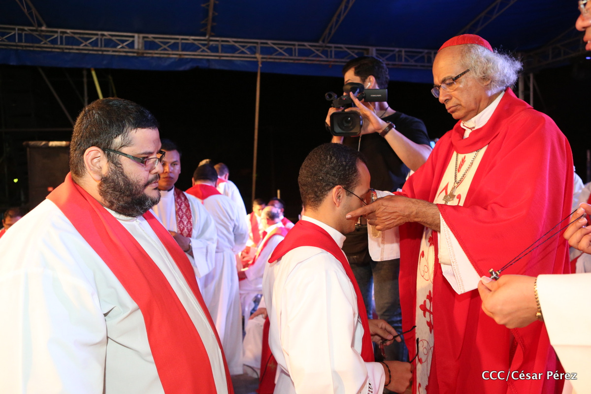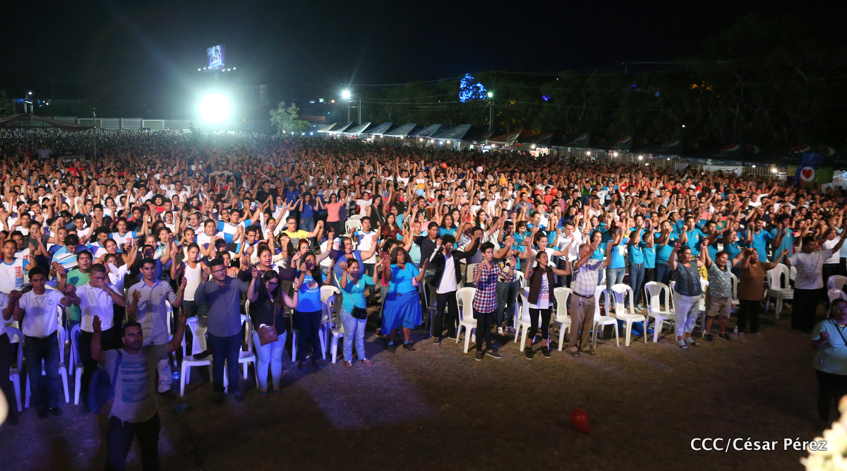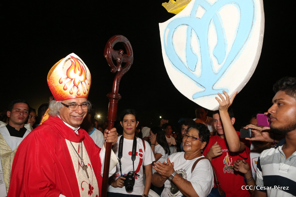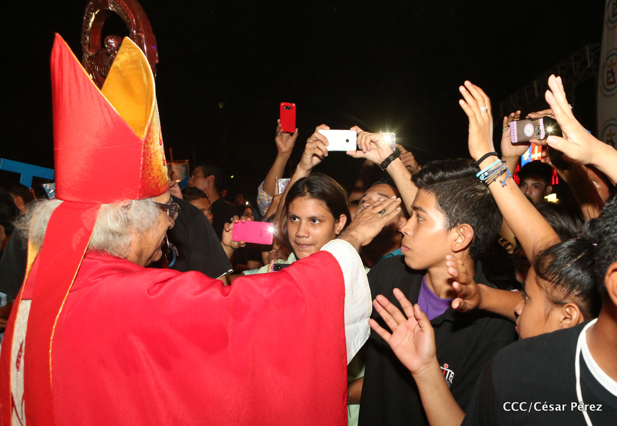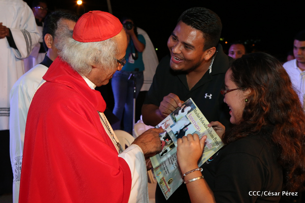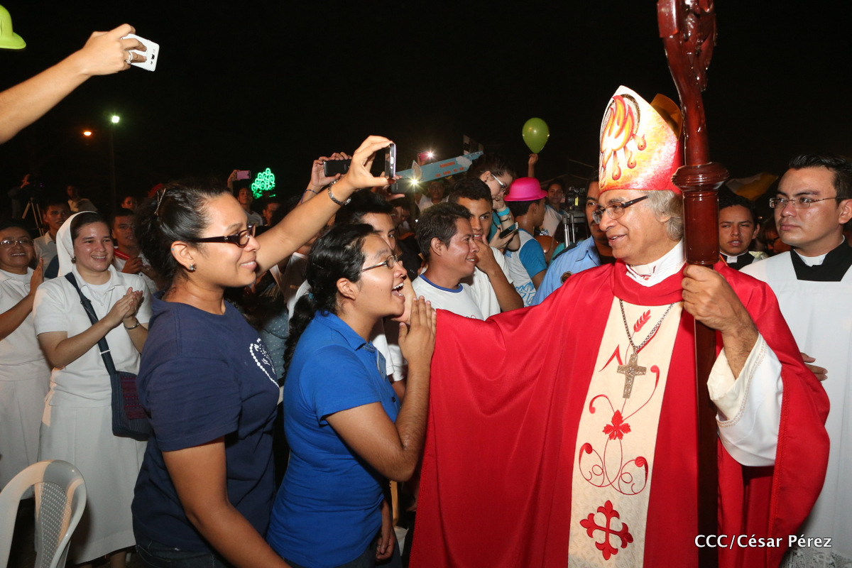 Miles de jóvenes católicos, le rindieron un efusivo homenaje la noche de este sábado a Su Eminencia Reverendísima, Cardenal Leopoldo Brenes, quien se encuentra celebrando su Undécimo Aniversario como Arzobispo de la Arquidiócesis de Managua, en el contexto de la XXIV Vigilia de Pentecostés Juvenil.