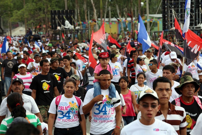 Juventud marcha hacia la Plaza de la Fe San Juan Pablo II para celebrar con Daniel el 34 Aniversario de la Revolución Sandinista.