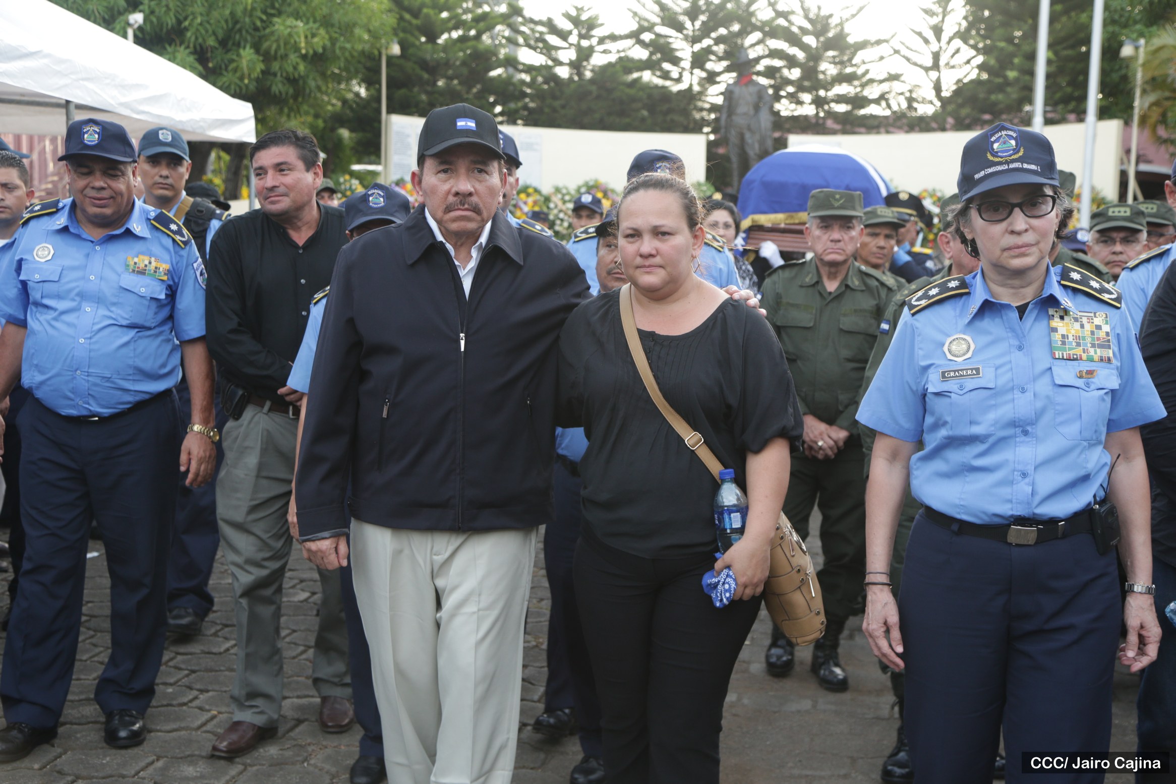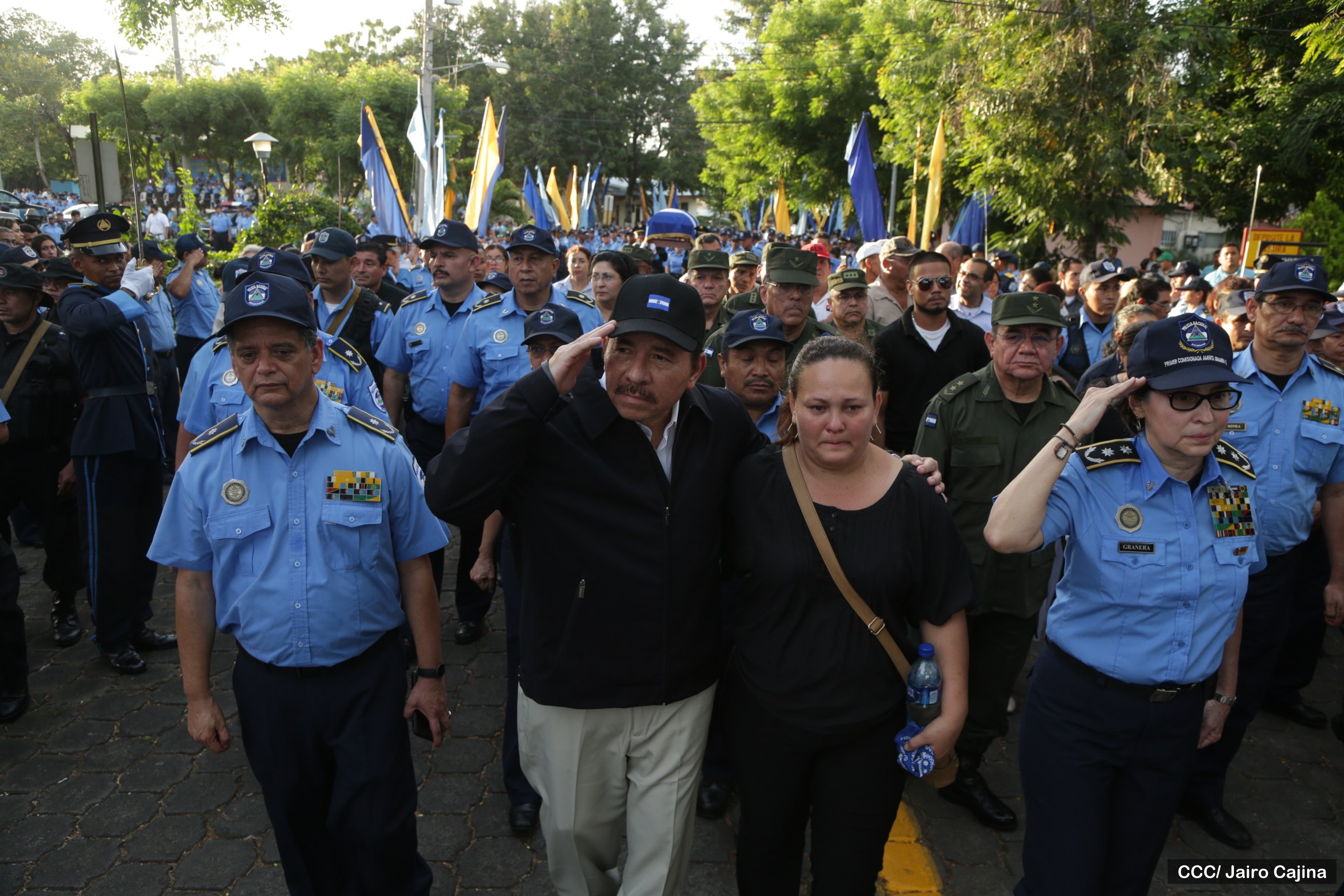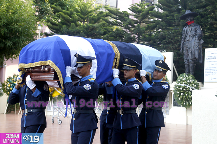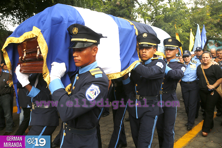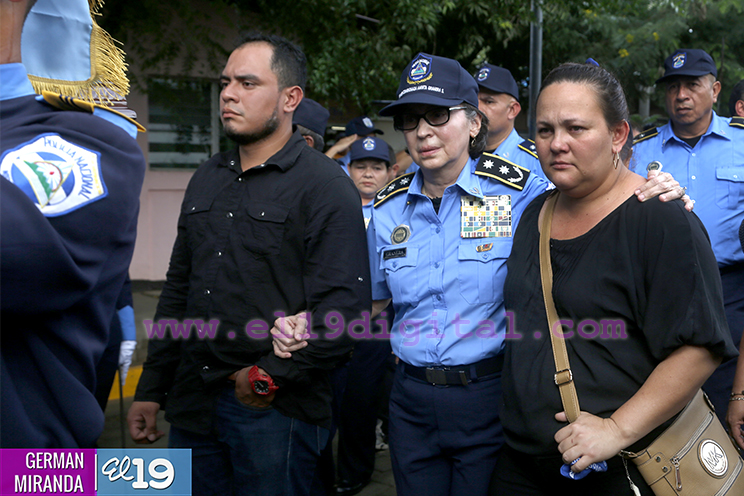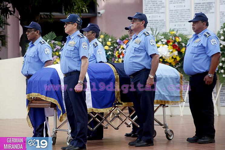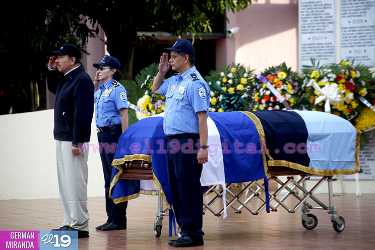 El Presidente de la República y Jefe Supremo de la Policía Nacional, Comandante Daniel Ortega Saavedra, la Primera Comisionada Aminta Granera, y la jefatura de esa institución rindieron homenaje póstumo al Comisionado Buenaventura Miranda Fitoria, jefe policial de Boaco, quien fue asesinado este miércoles por la noche.