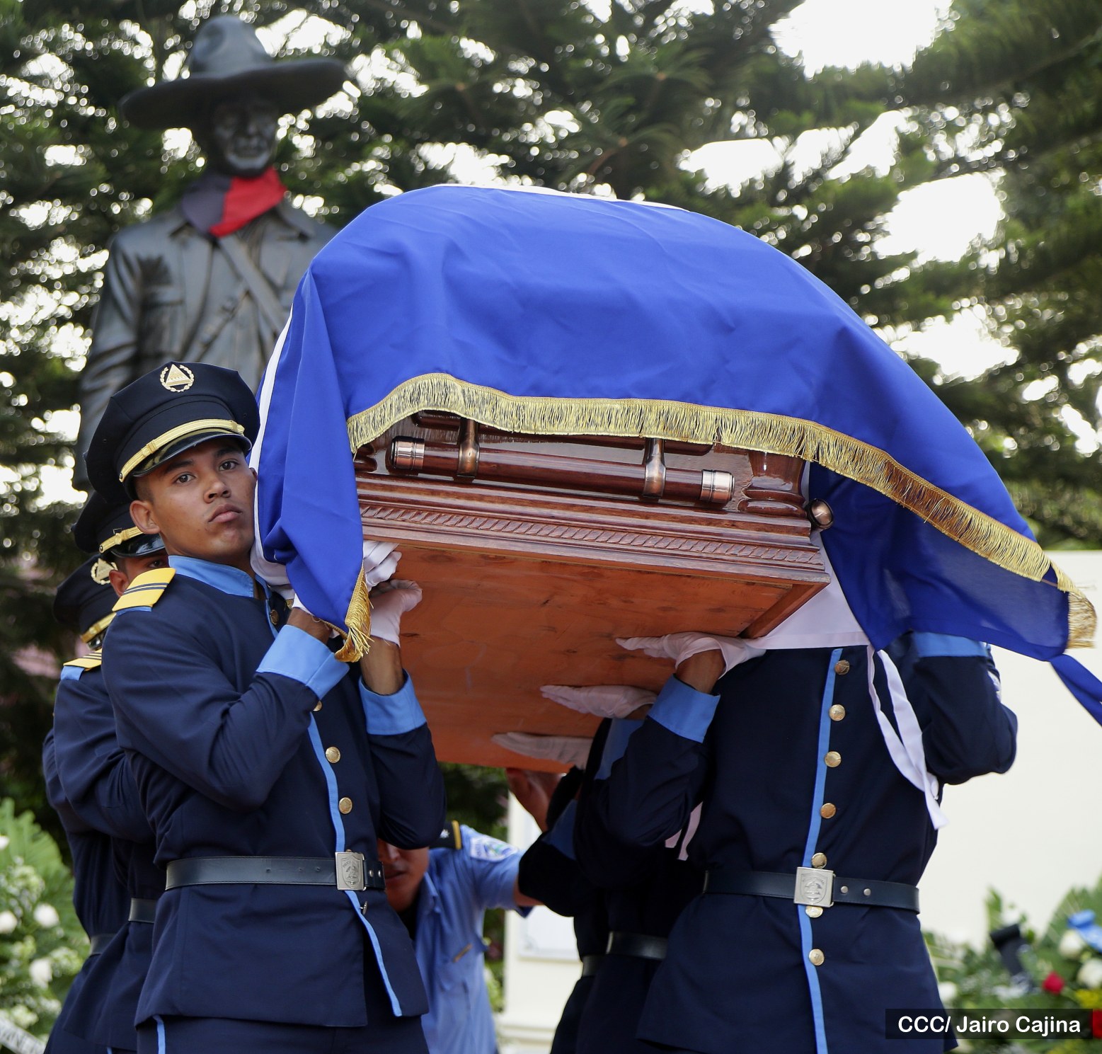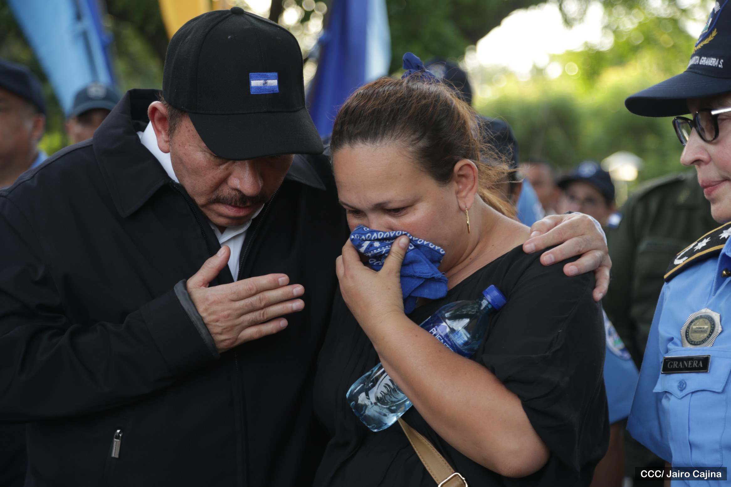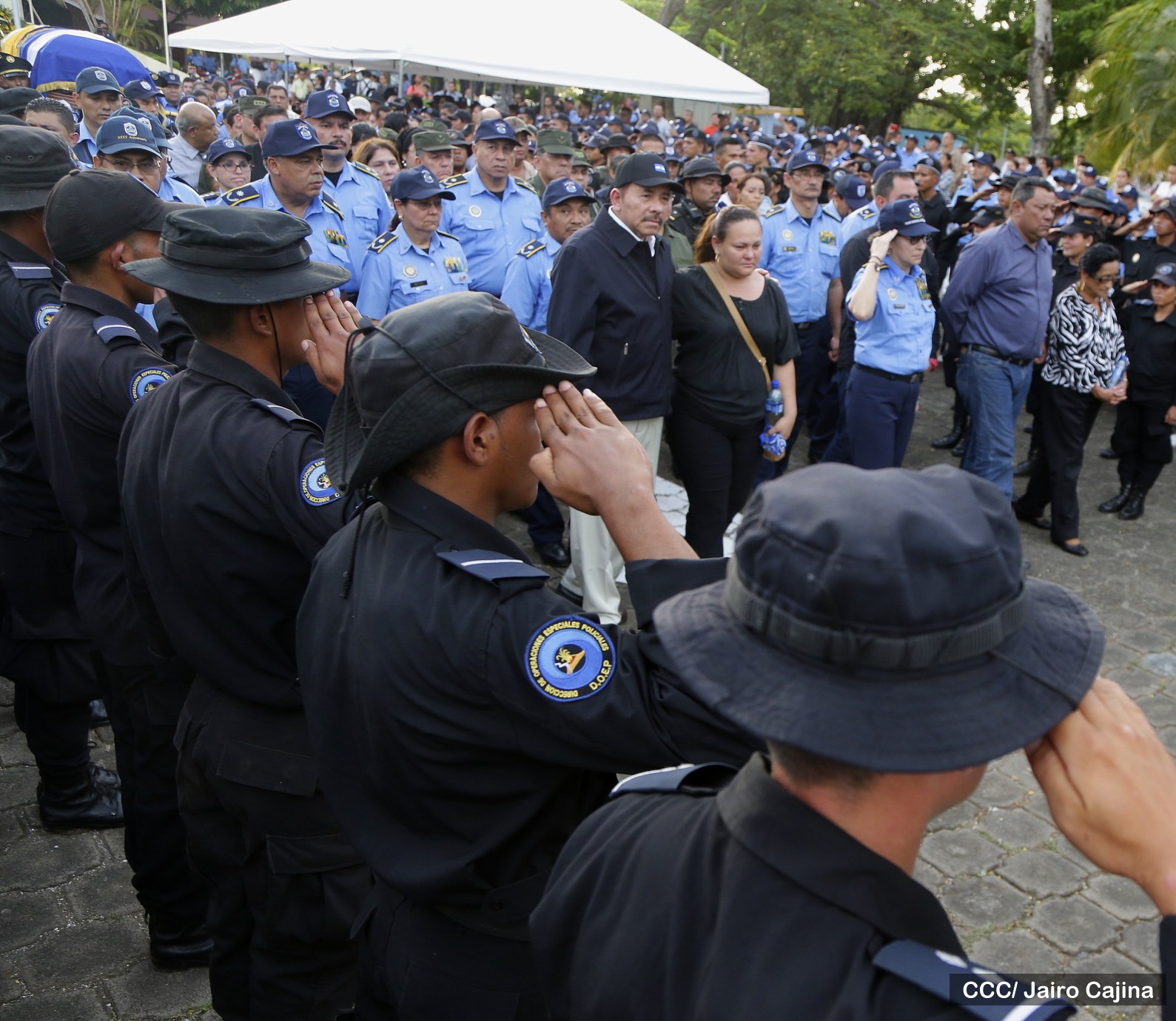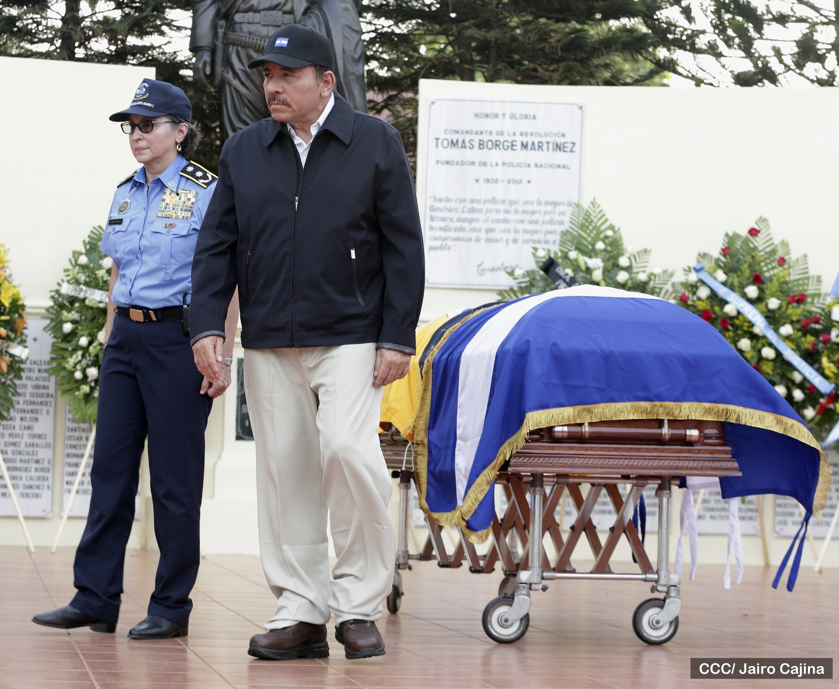 El Presidente de la República y Jefe Supremo de la Policía Nacional, Comandante Daniel Ortega Saavedra, la Primera Comisionada Aminta Granera, y la jefatura de esa institución rindieron homenaje póstumo al Comisionado Buenaventura Miranda Fitoria, jefe policial de Boaco, quien fue asesinado este miércoles por la noche.