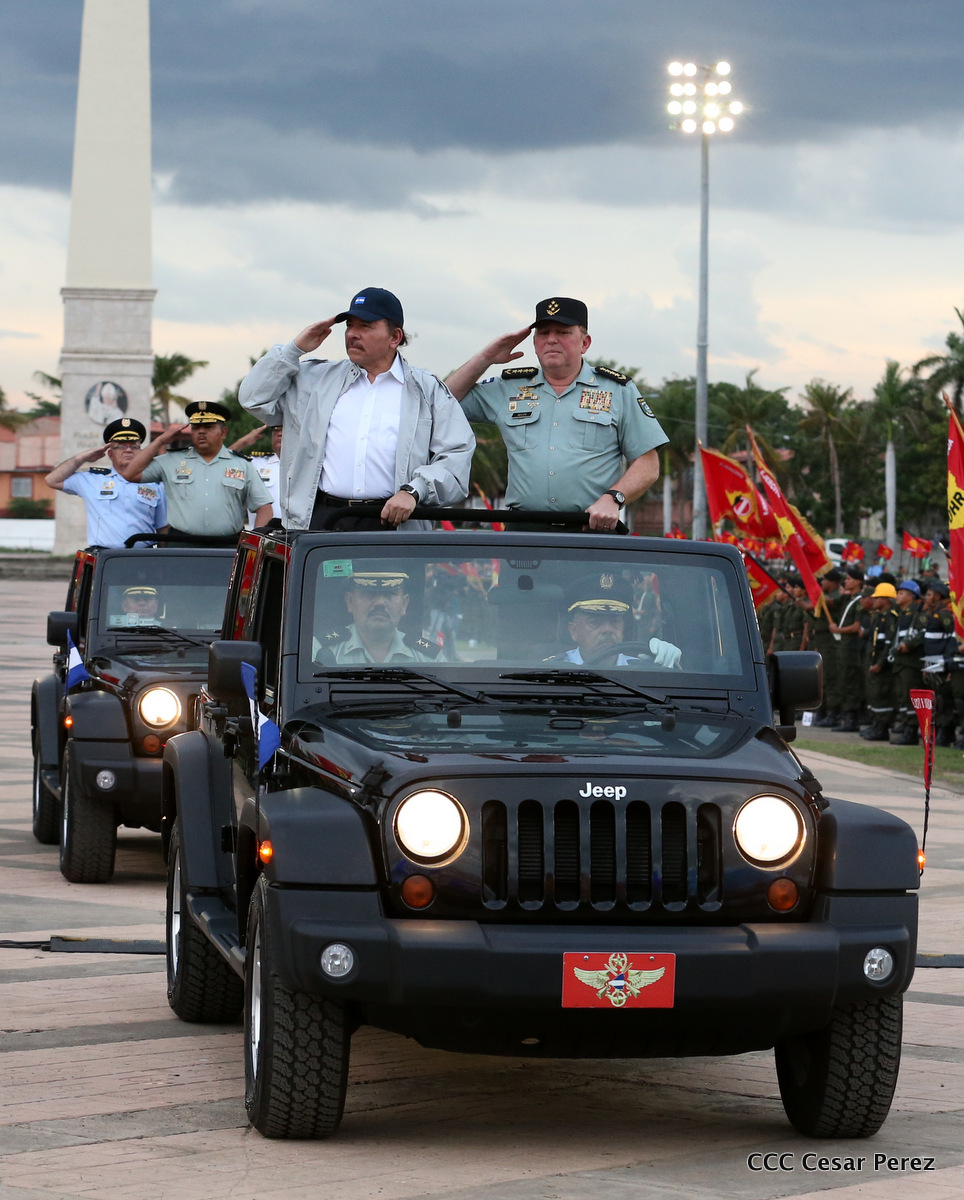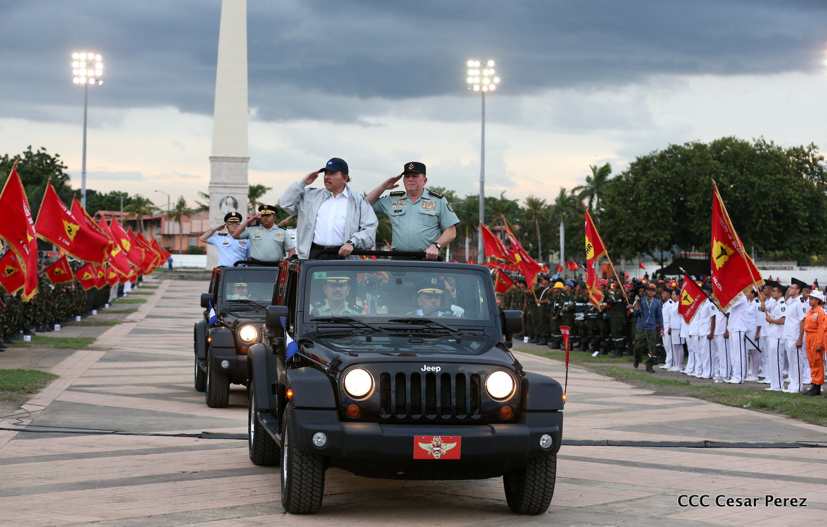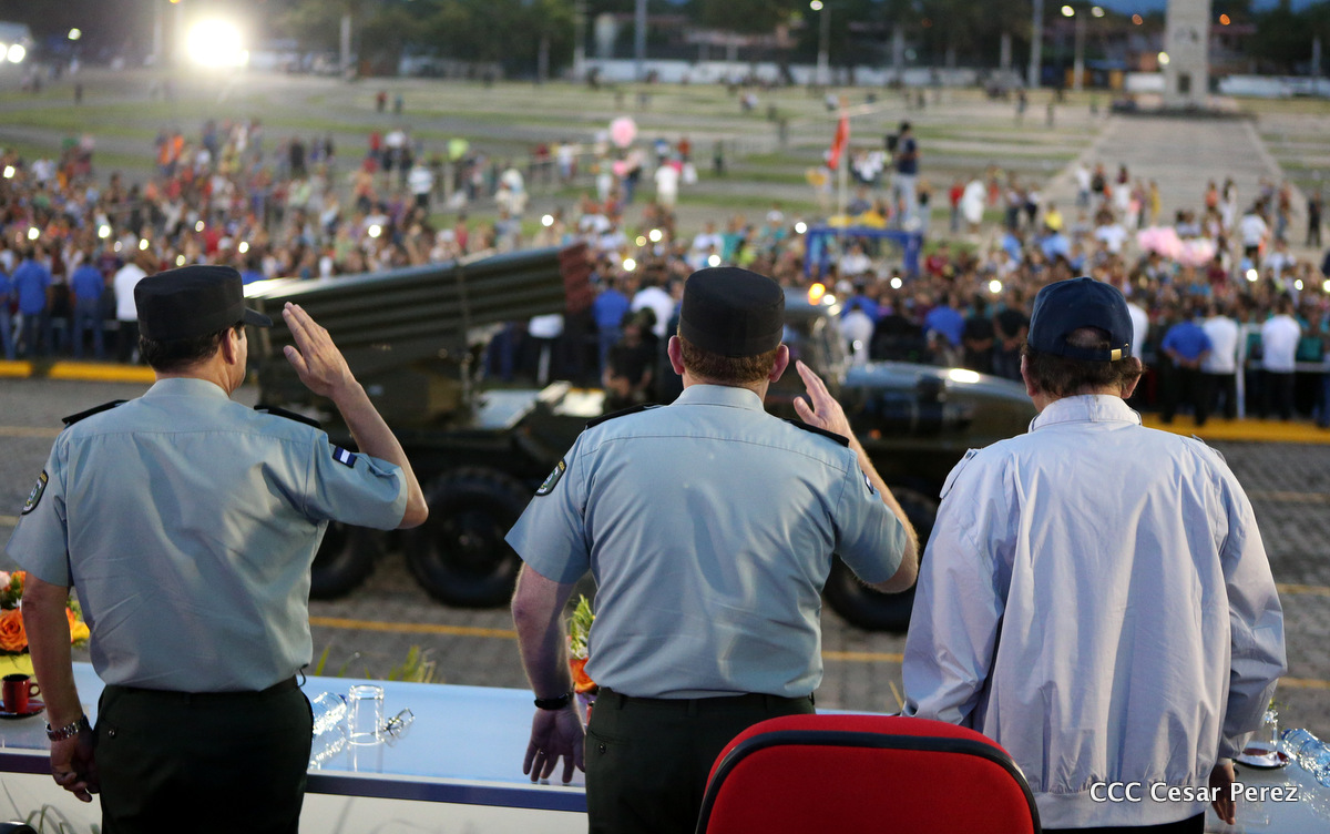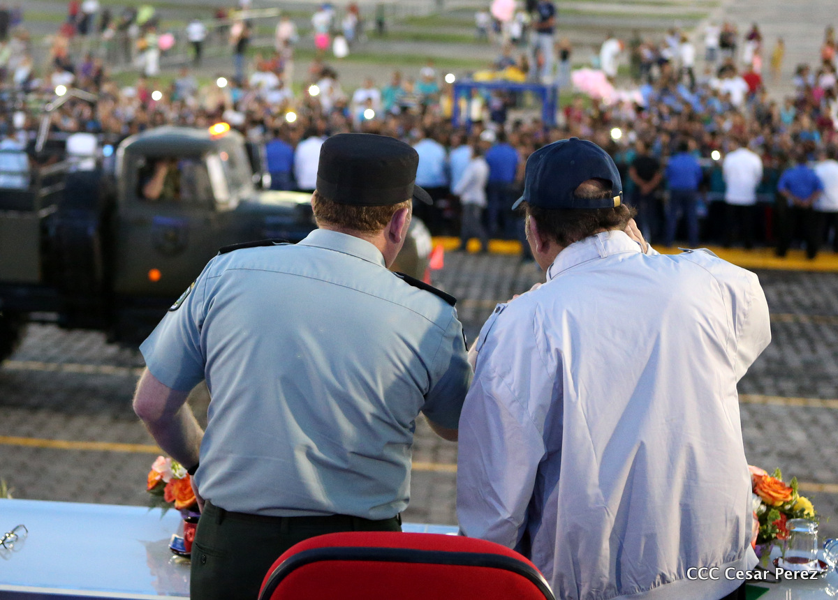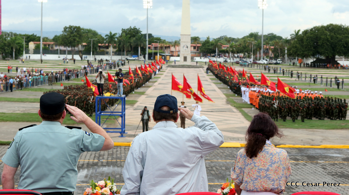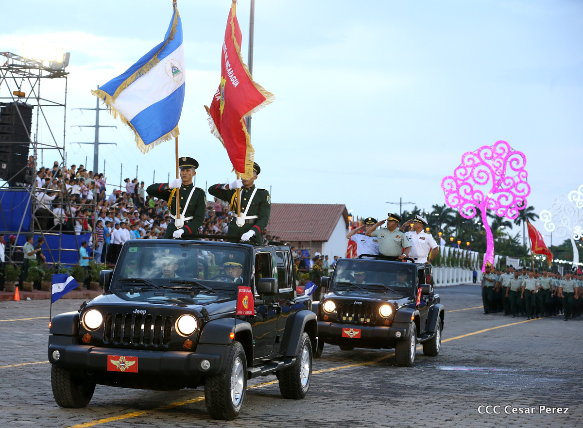 El Presidente de Nicaragua, Comandante Daniel Ortega Saavedra, y la Coordinadora del Consejo de Comunicación y Ciudadanía, Compañera Rosario Murillo, encabezaron este sábado el desfile militar en ocasión del 37 aniversario de la fundación de las fuerzas armadas de Nicaragua.