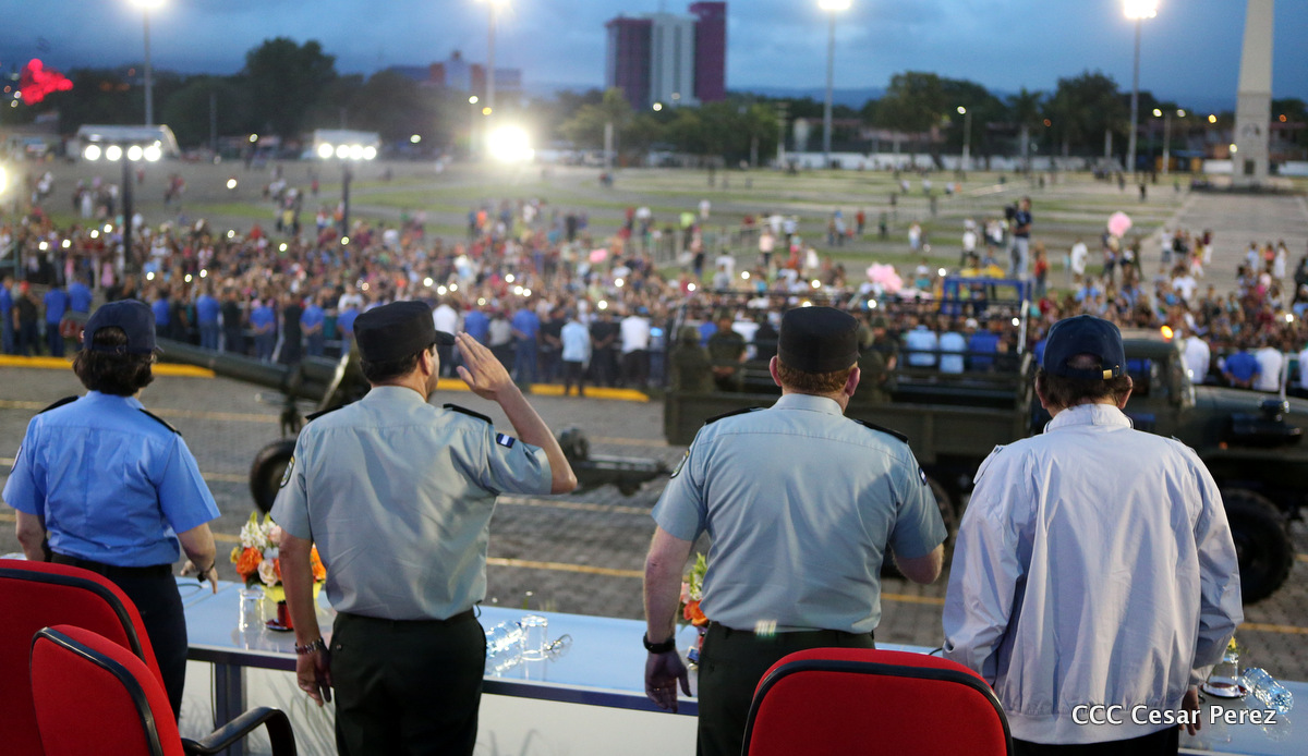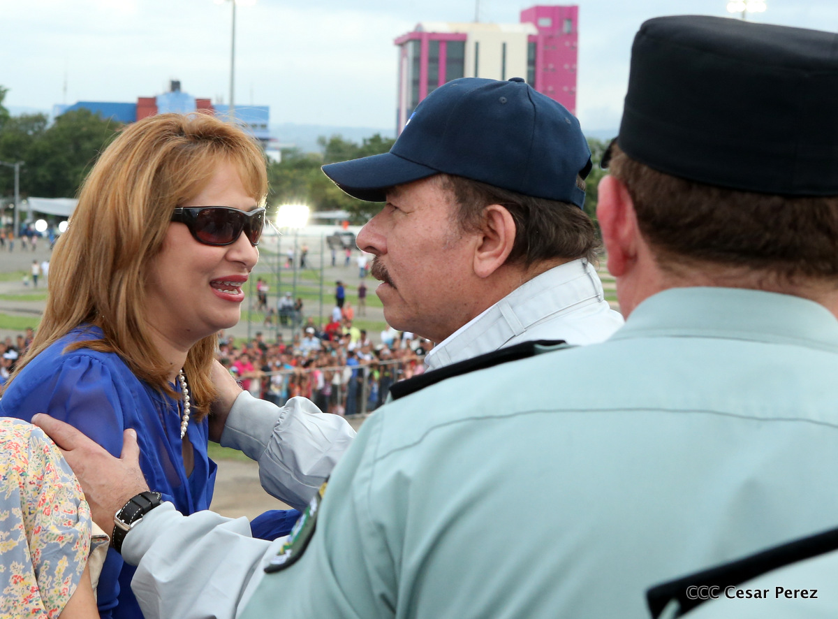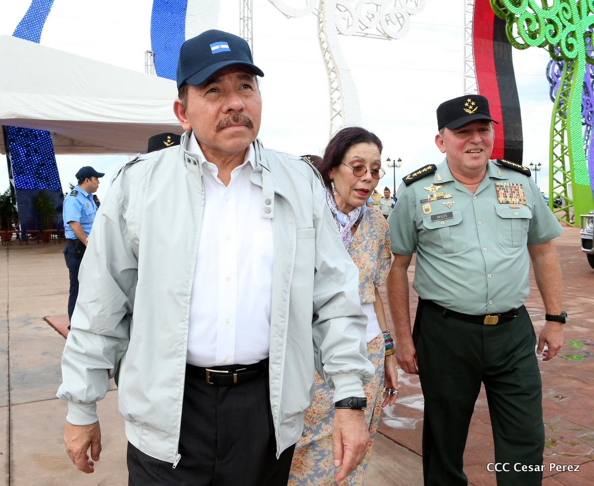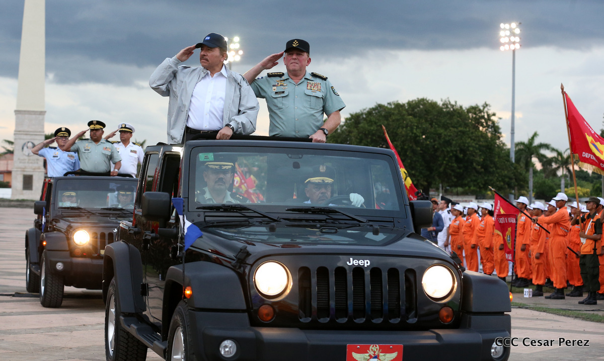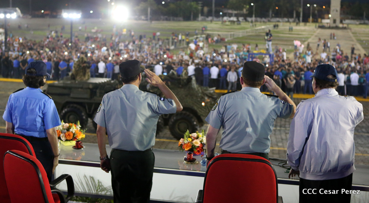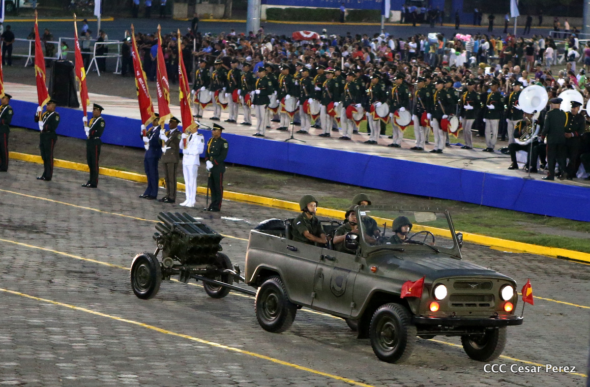 El Presidente de Nicaragua, Comandante Daniel Ortega Saavedra, y la Coordinadora del Consejo de Comunicación y Ciudadanía, Compañera Rosario Murillo, encabezaron este sábado el desfile militar en ocasión del 37 aniversario de la fundación de las fuerzas armadas de Nicaragua.