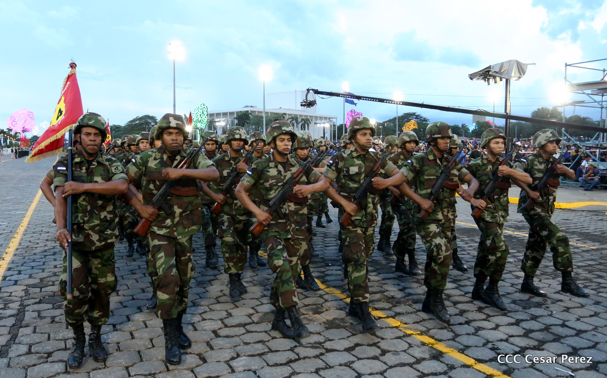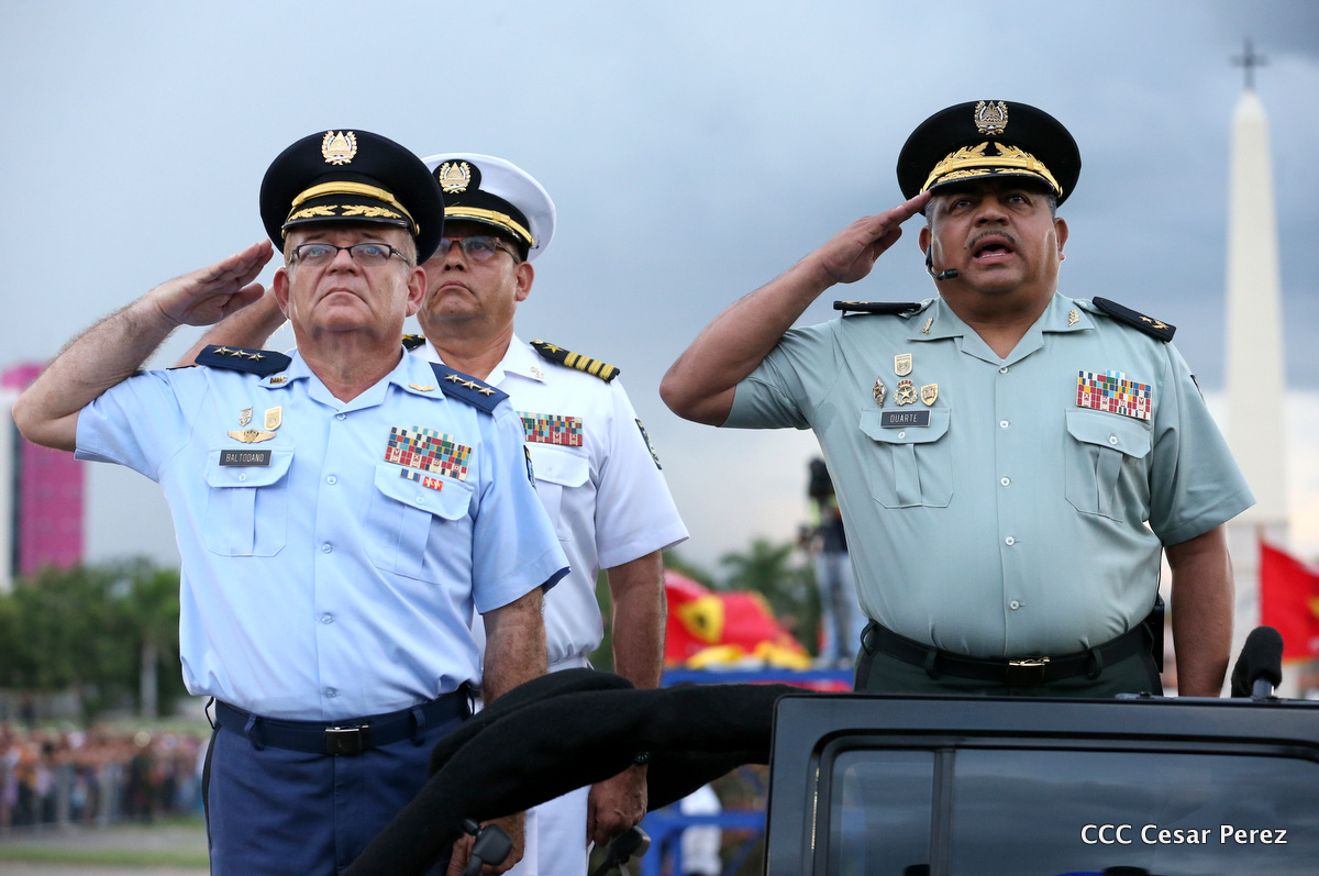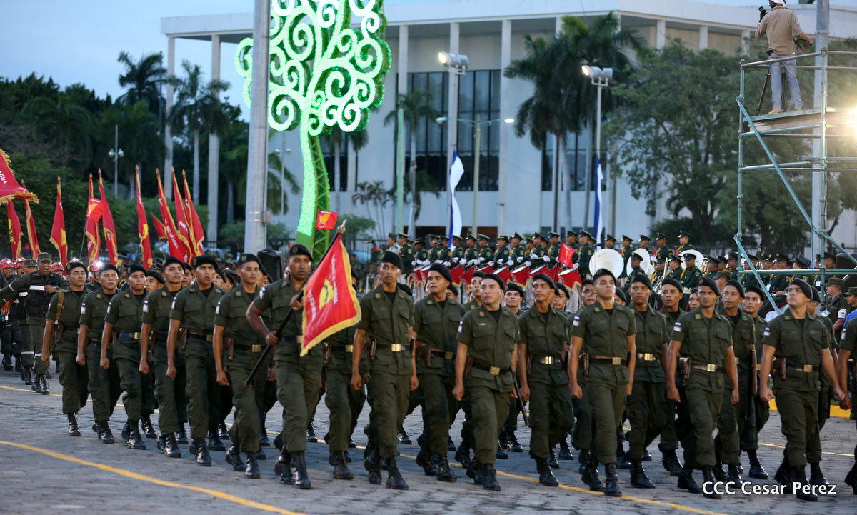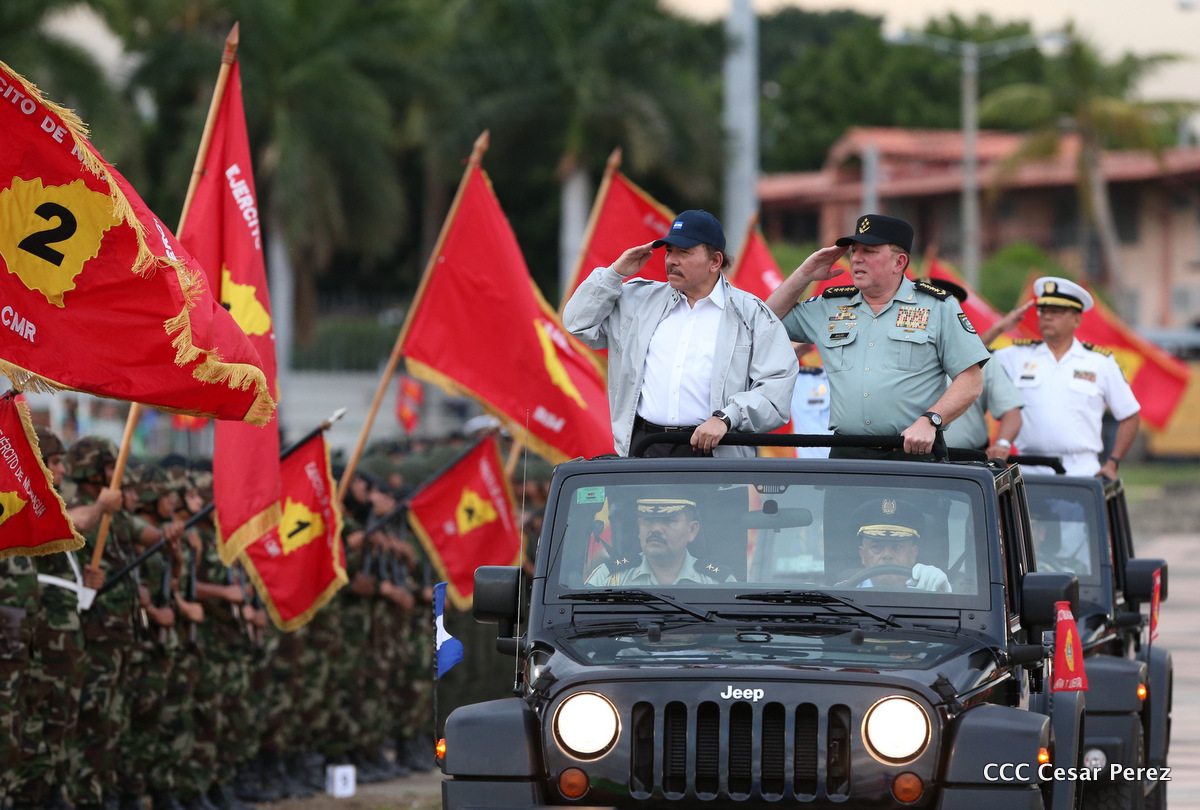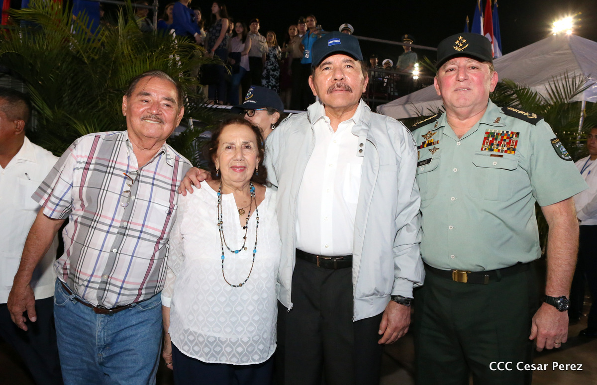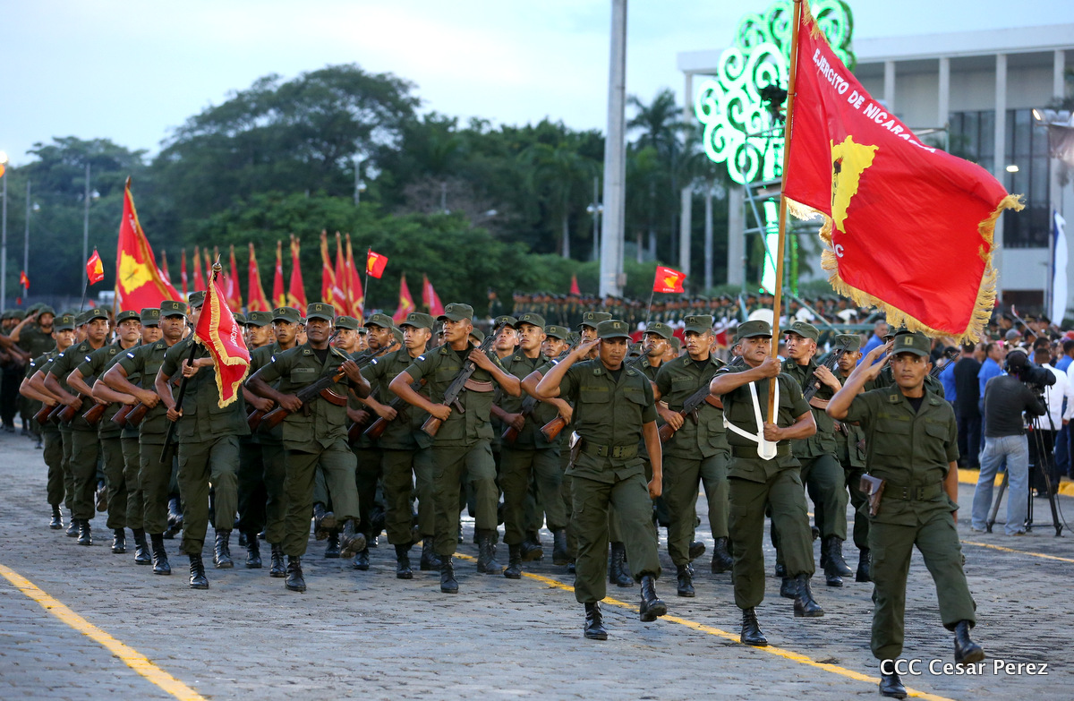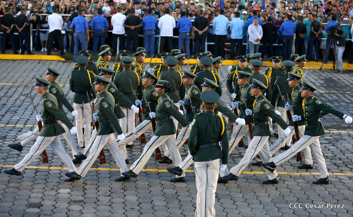 El Presidente de Nicaragua, Comandante Daniel Ortega Saavedra, y la Coordinadora del Consejo de Comunicación y Ciudadanía, Compañera Rosario Murillo, encabezaron este sábado el desfile militar en ocasión del 37 aniversario de la fundación de las fuerzas armadas de Nicaragua.