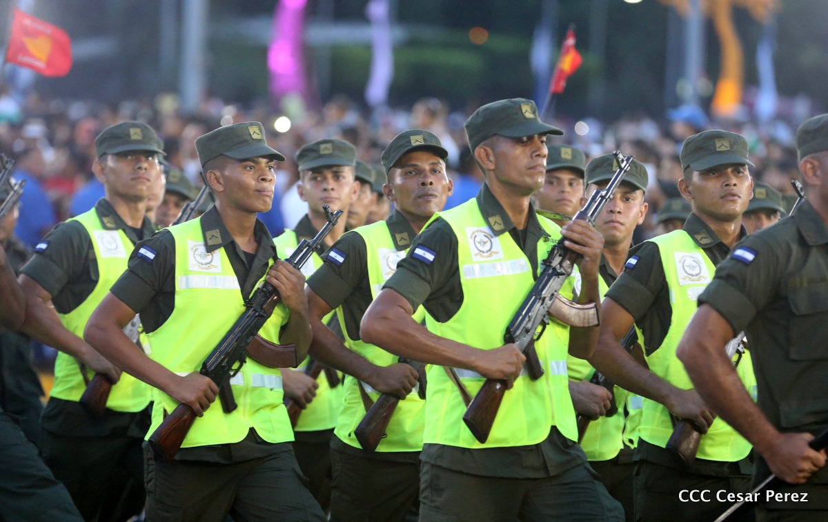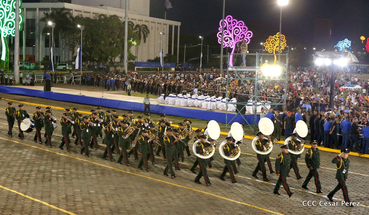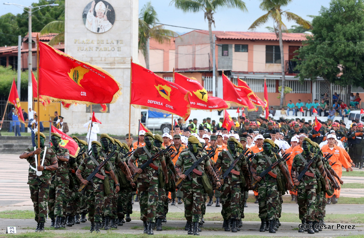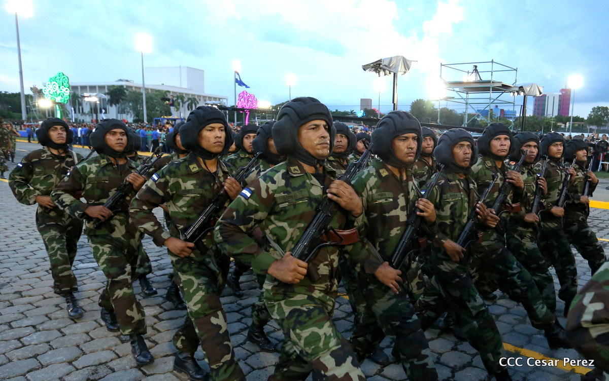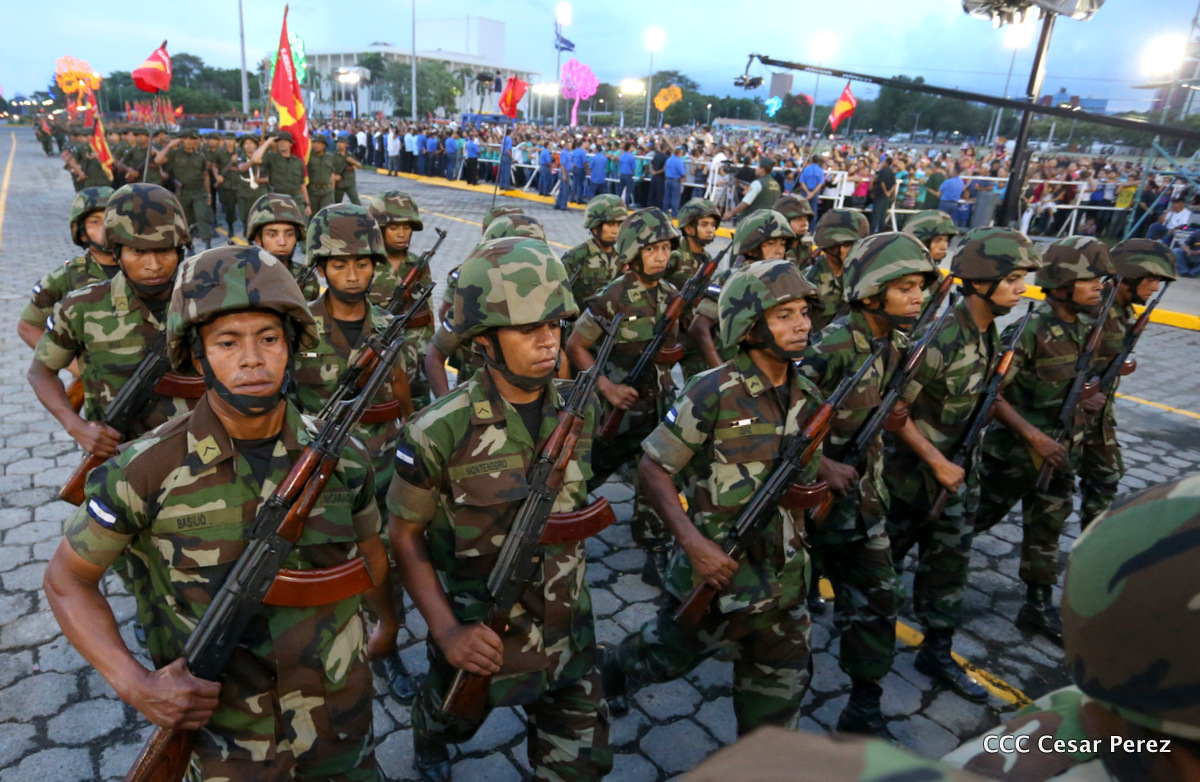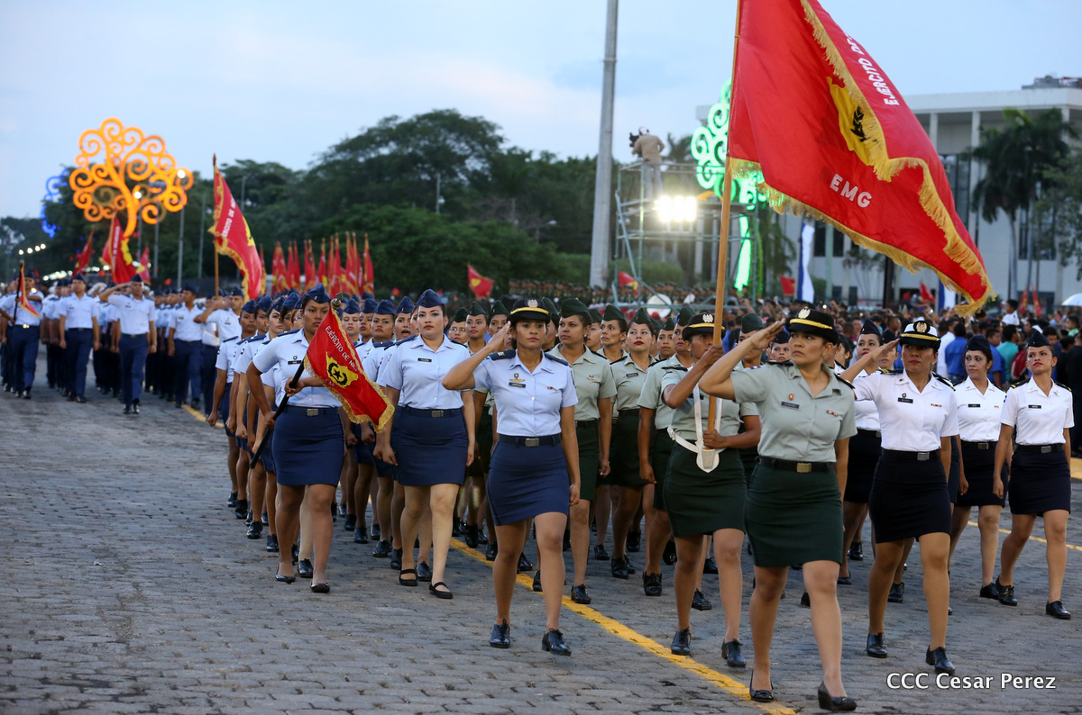 El Presidente de Nicaragua, Comandante Daniel Ortega Saavedra, y la Coordinadora del Consejo de Comunicación y Ciudadanía, Compañera Rosario Murillo, encabezaron este sábado el desfile militar en ocasión del 37 aniversario de la fundación de las fuerzas armadas de Nicaragua.