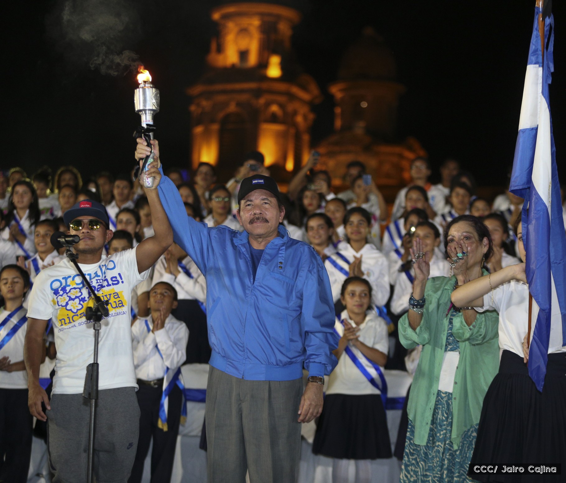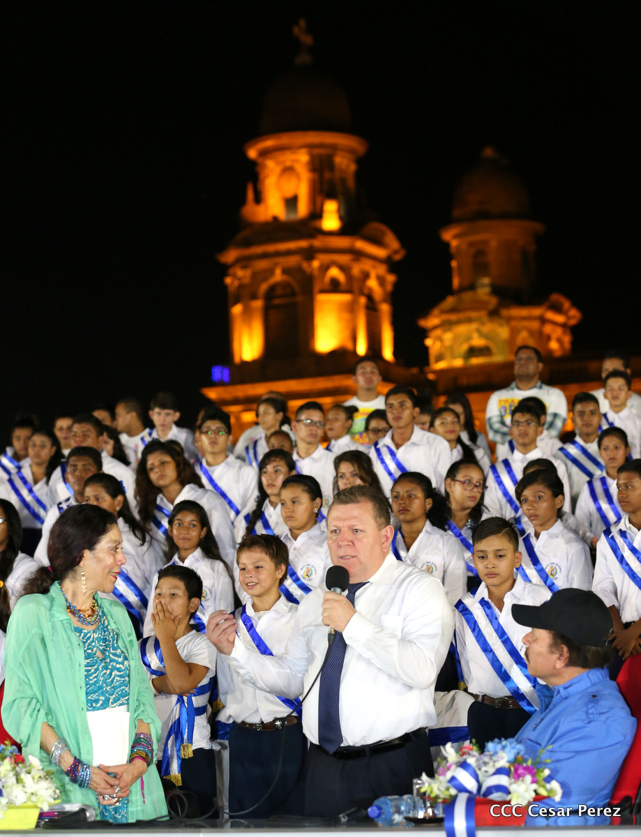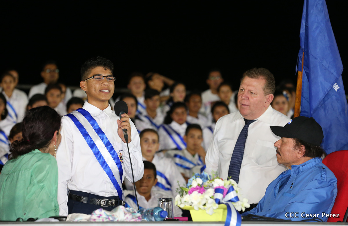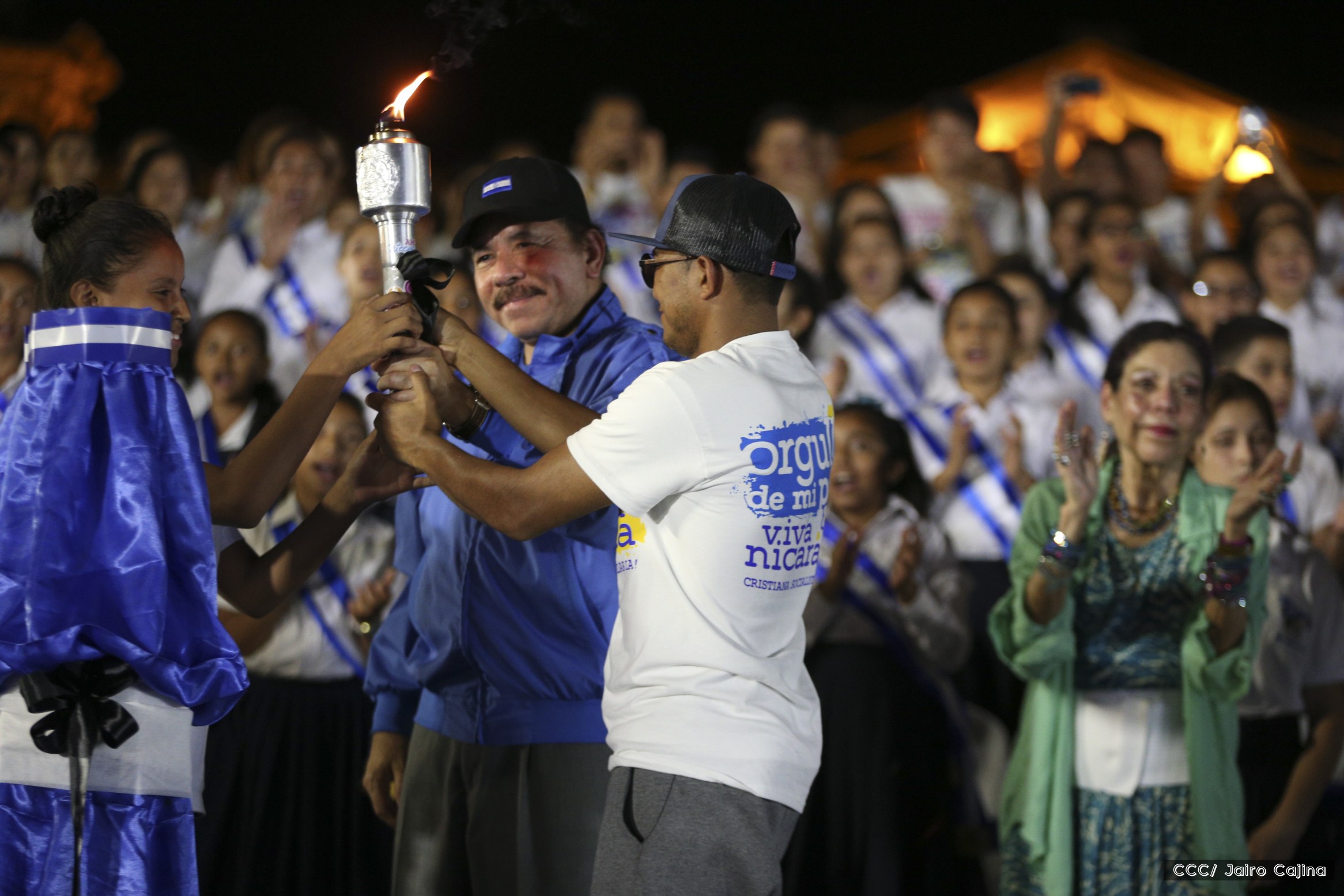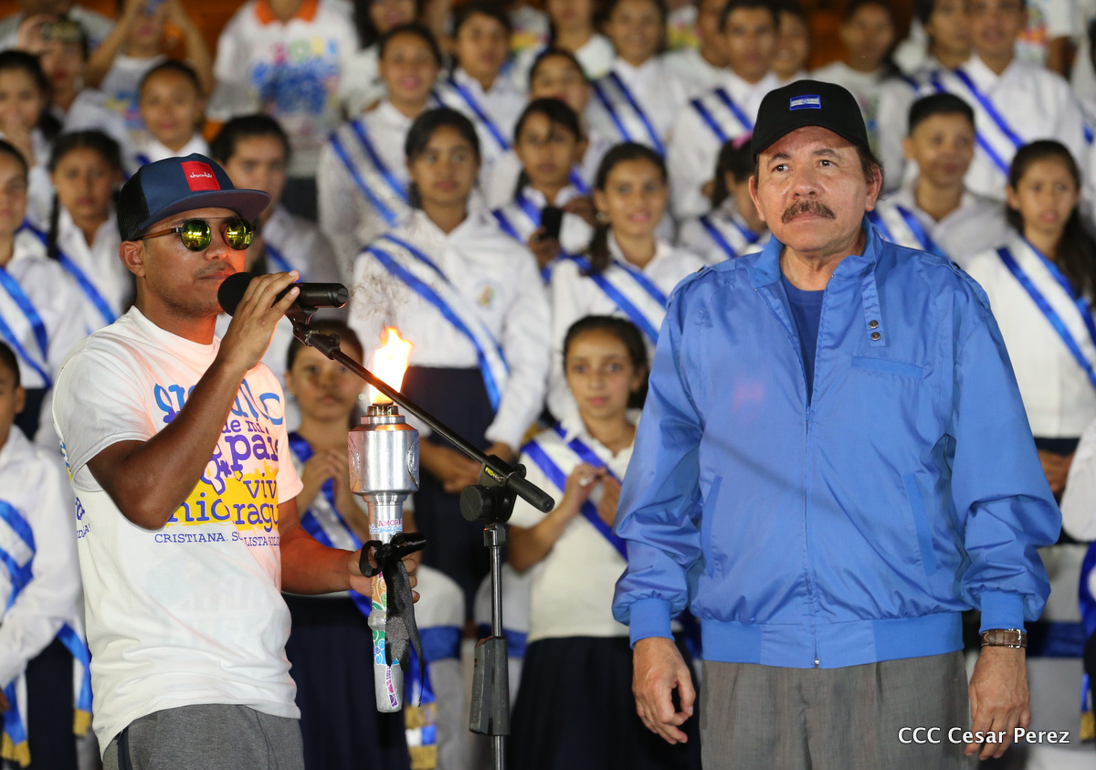El Presidente de la República, Comandante Daniel Ortega, y la Coordinadora del Consejo de Comunicación y Ciudadanía, Compañera Rosario Murillo, recibieron este lunes de manos del tetracampeón mundial de boxeo, Román “Chocolate” González, la Antorcha de la Libertad y la Unidad Centroamericana.