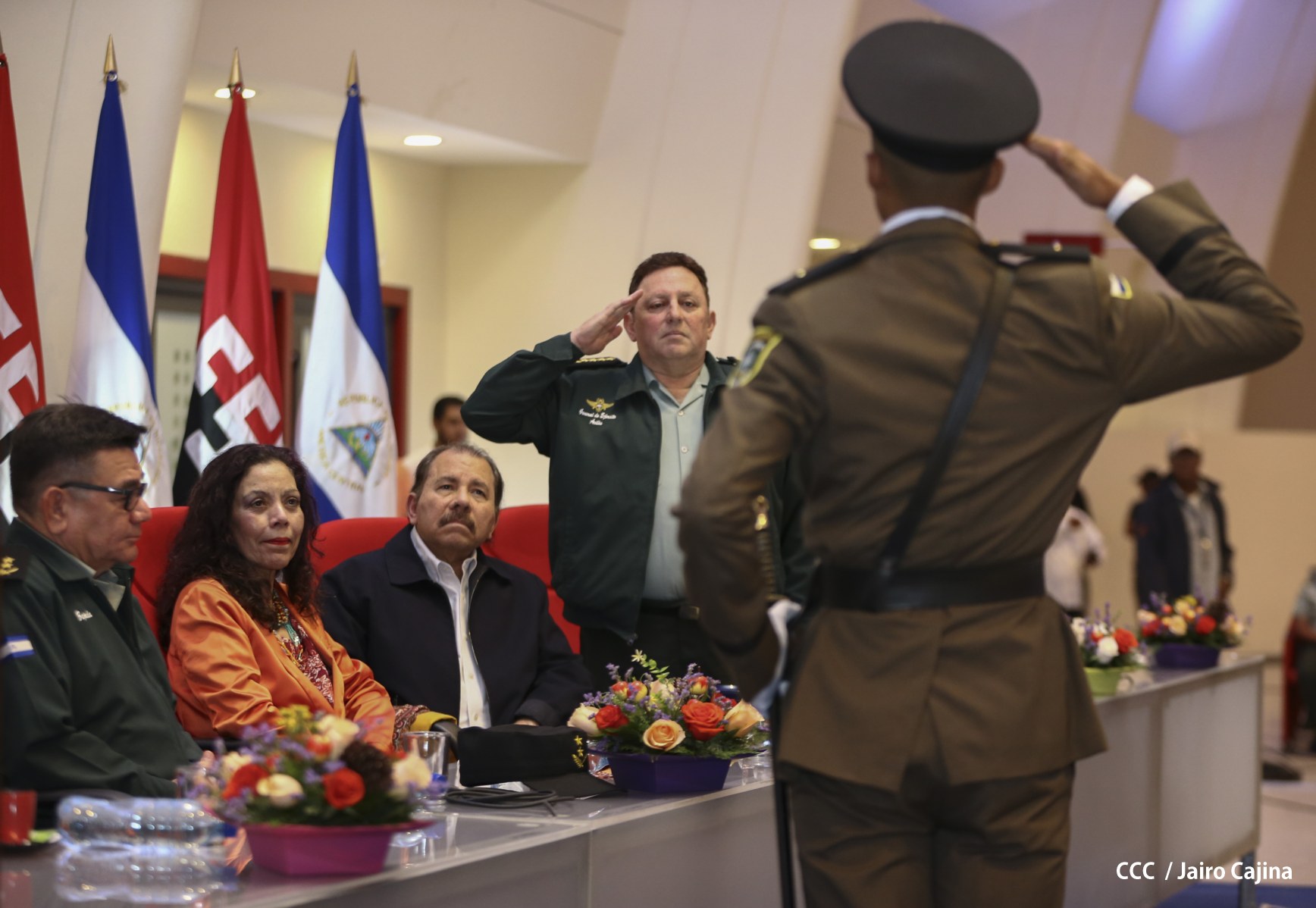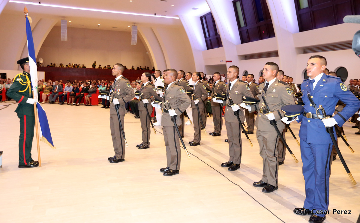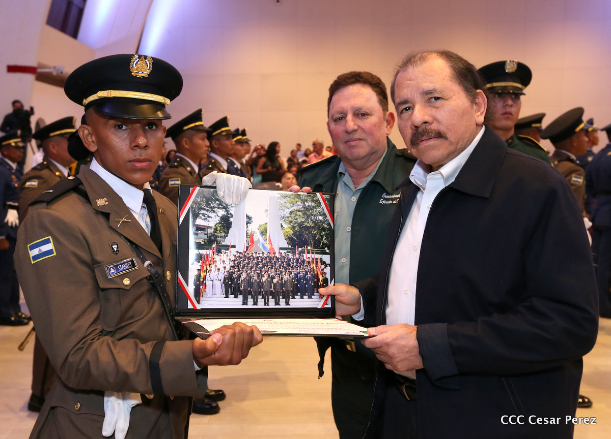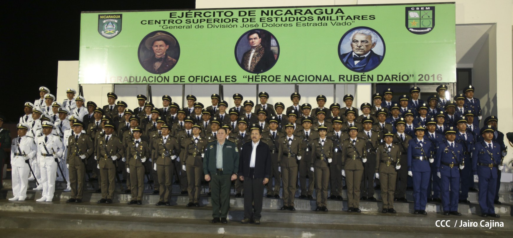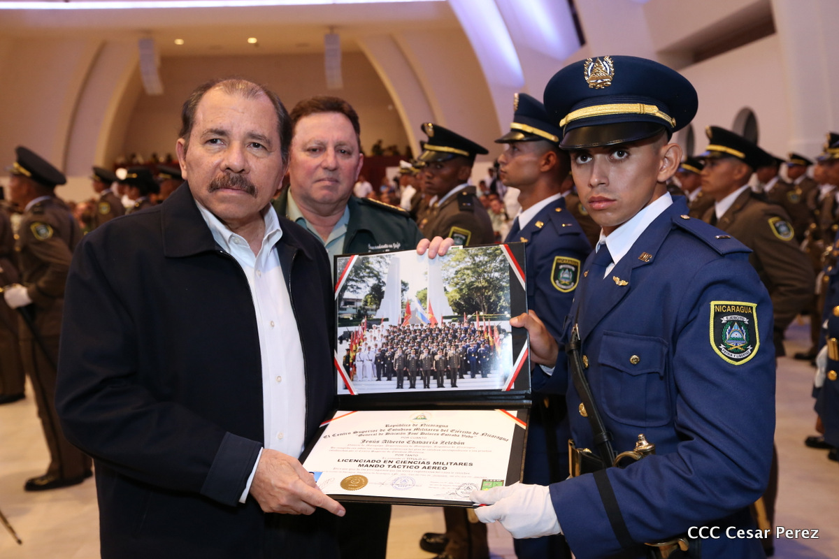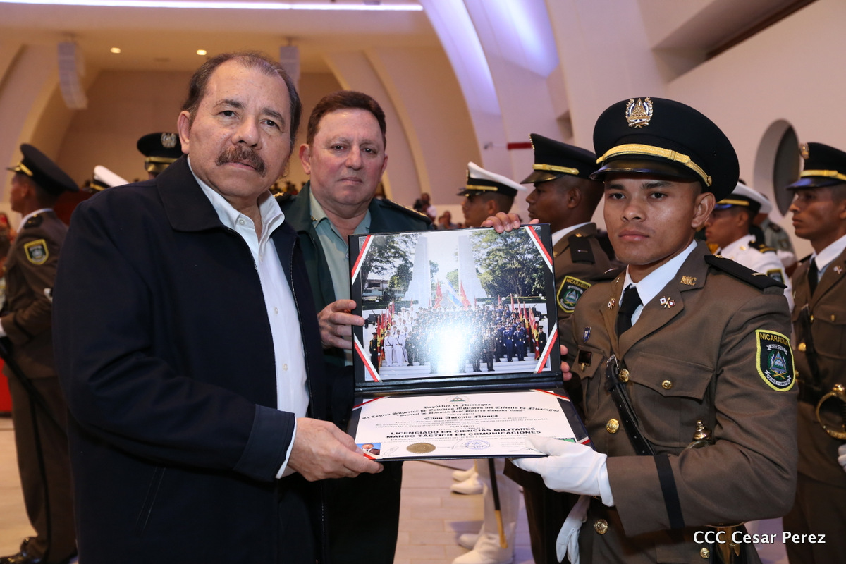 El Presidente de la República, Comandante Daniel Ortega Saavedra, y la Coordinadora del Consejo de Comunicación y Ciudadanía, Compañera Rosario Murillo, presidieron este lunes la XXI Graduación del Curso Regular de Damas y Caballeros Cadetes del Ejército de Nicaragua “Héroe Nacional Rubén Darío”.