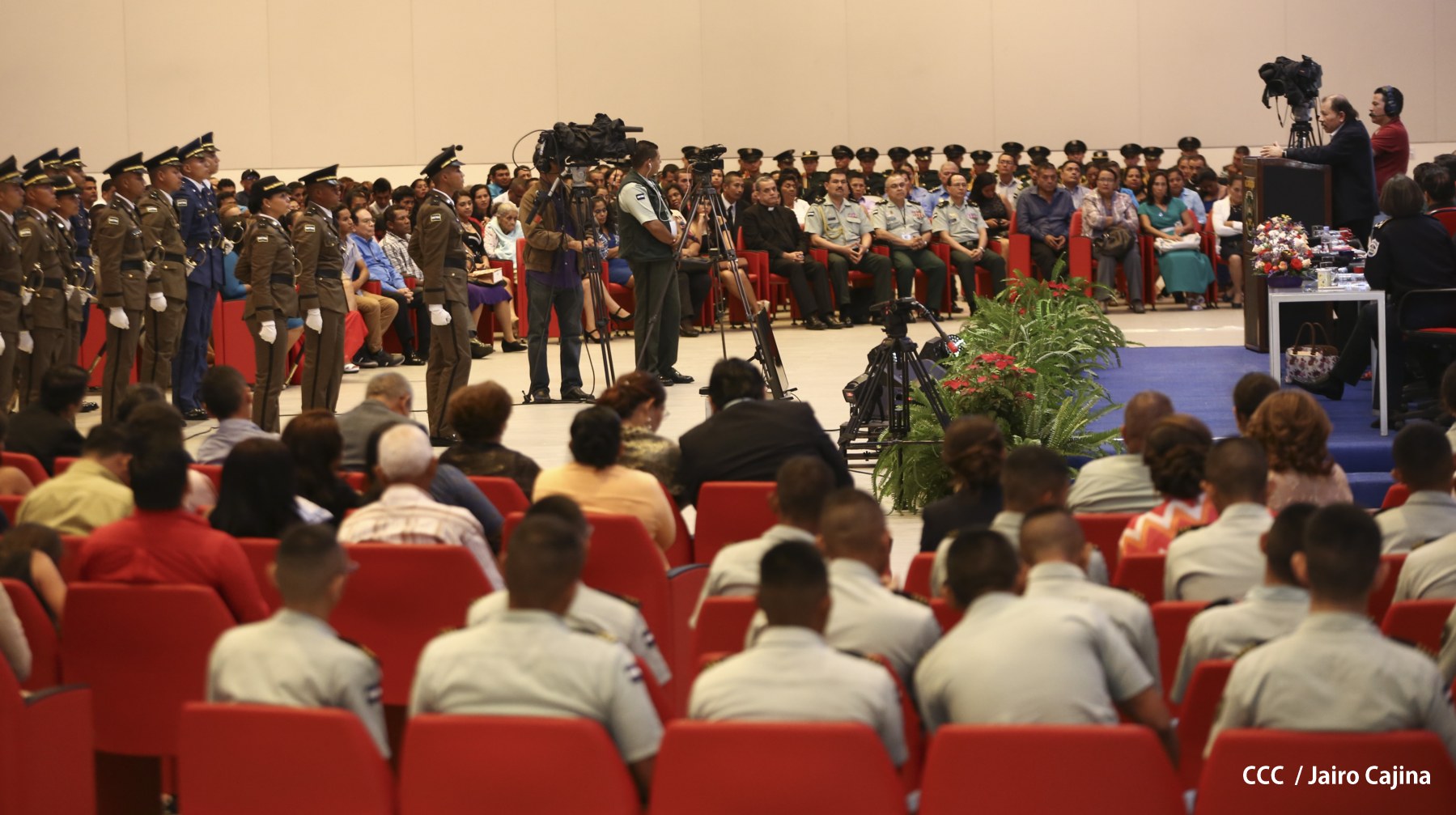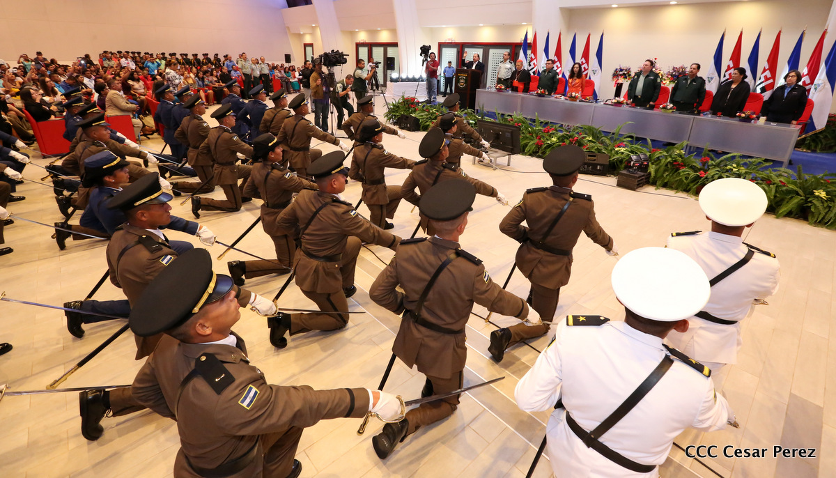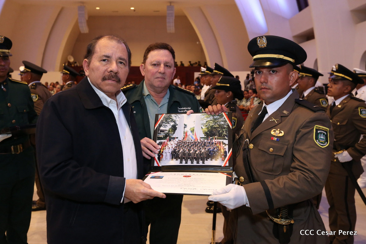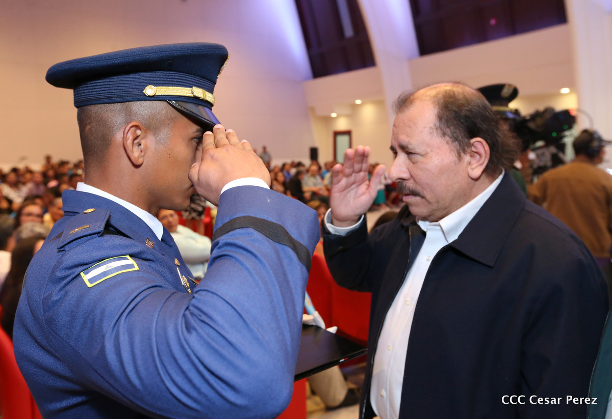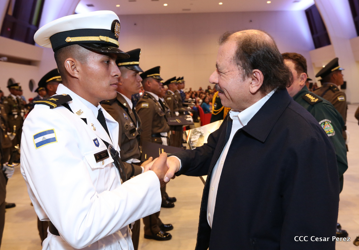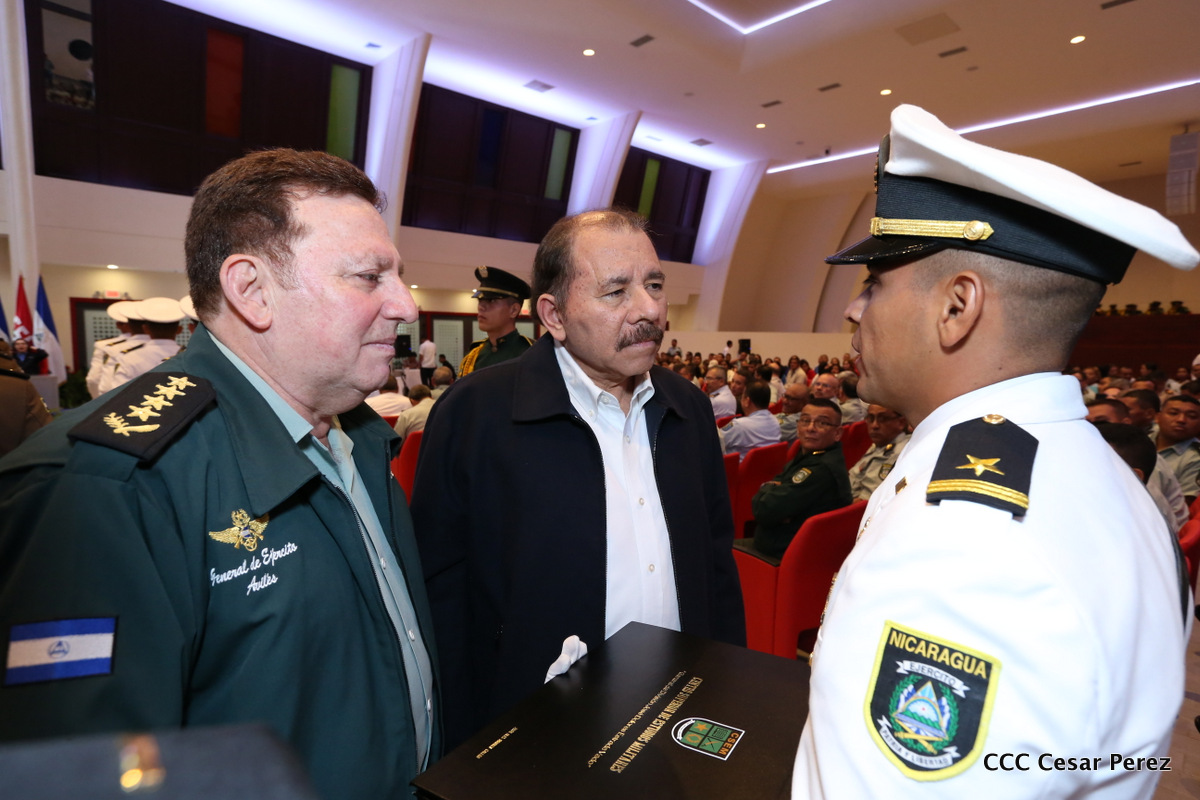 El Presidente de la República, Comandante Daniel Ortega Saavedra, y la Coordinadora del Consejo de Comunicación y Ciudadanía, Compañera Rosario Murillo, presidieron este lunes la XXI Graduación del Curso Regular de Damas y Caballeros Cadetes del Ejército de Nicaragua “Héroe Nacional Rubén Darío”.