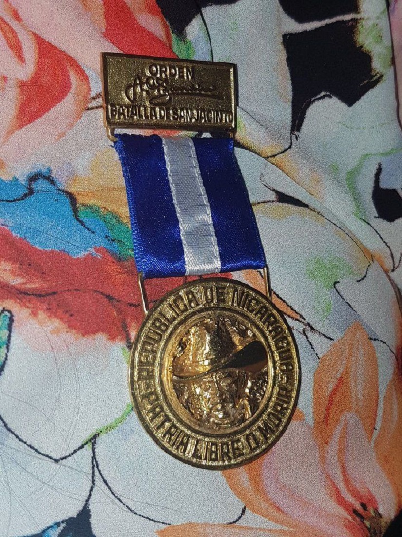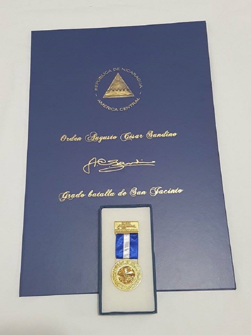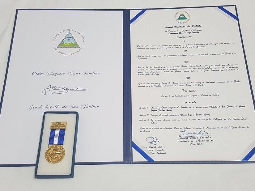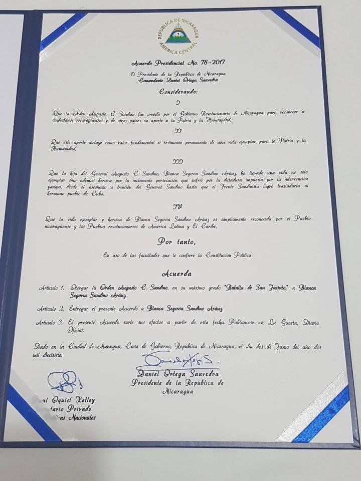 En celebración del 84 aniversario natal de Blanca Segovia Sandino Aráuz, hija del General Sandino, el Comandante Daniel Ortega le entregó la Orden Augusto C. Sandino en el grado "Batalla de San Jacinto".