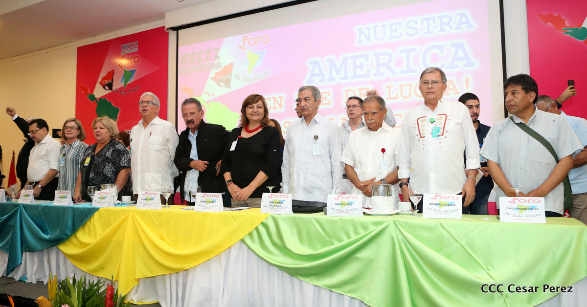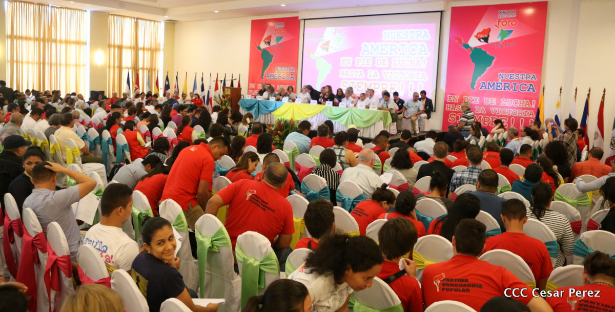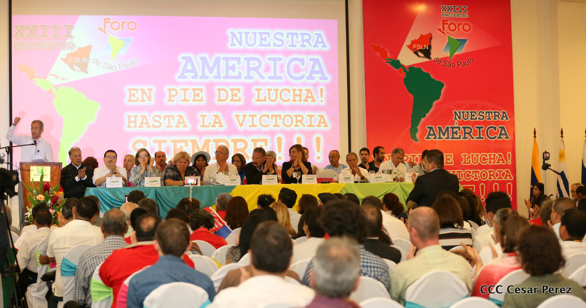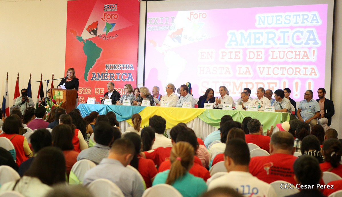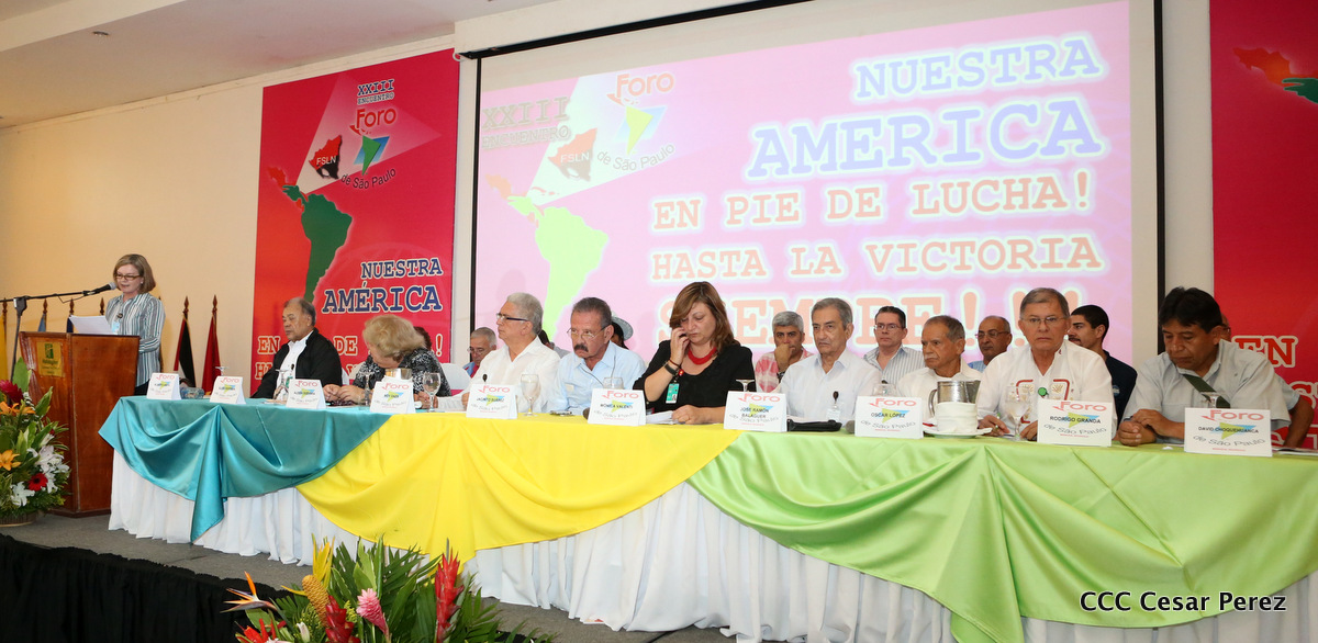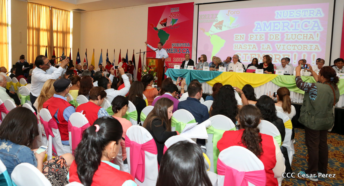 Representantes de partidos políticos y movimientos sociales de 22 países latinoamericanos, participan en el XXIII encuentro del Foro de Sao Paulo, que sesiona en Managua, en saludo al 38 aniversario del triunfo de la Revolución Popular Sandinista.