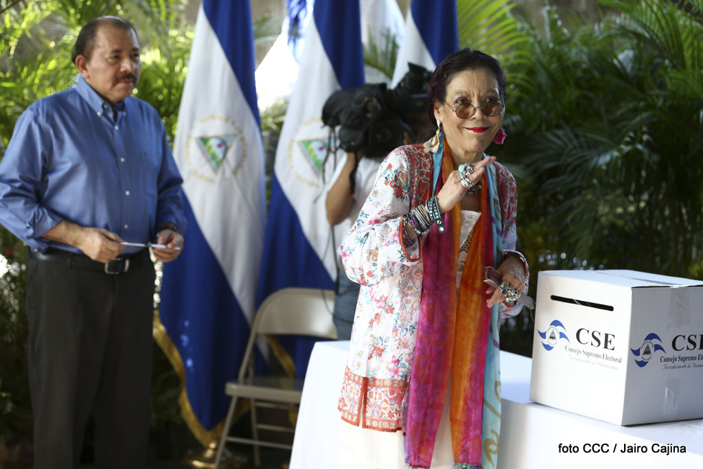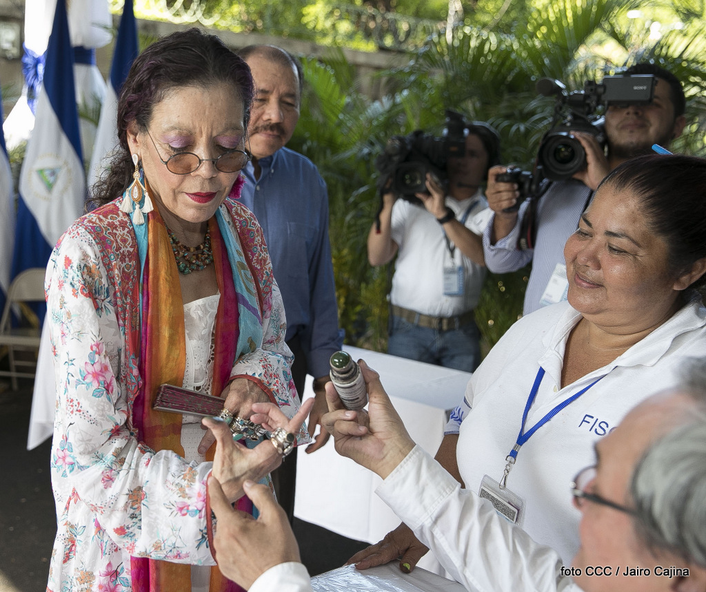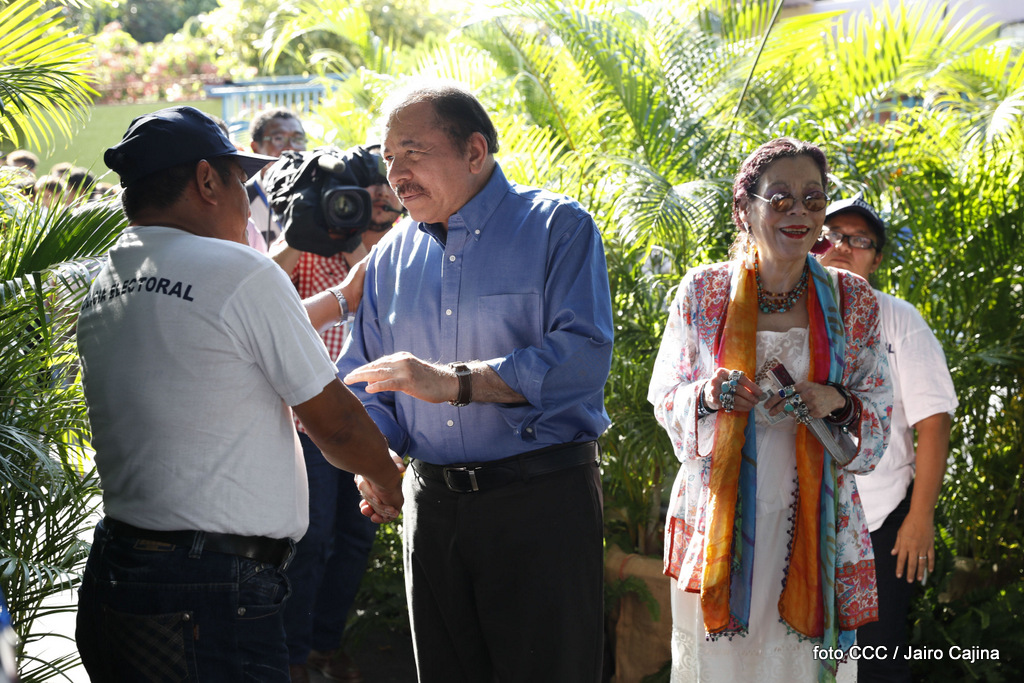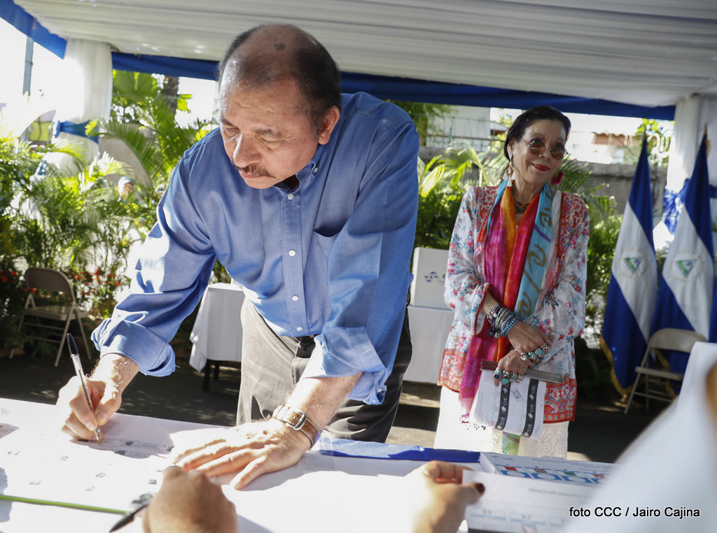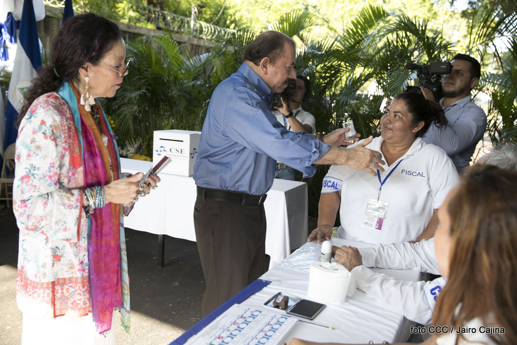 El Presidente Daniel Ortega y la Vicepresidenta de la República, Compañera Rosario Murillo, ejercieron su derecho al voto este domingo en la Junta Receptora de Votos ubicada en la Universidad Central de Nicaragua, del Reparto El Carmen.