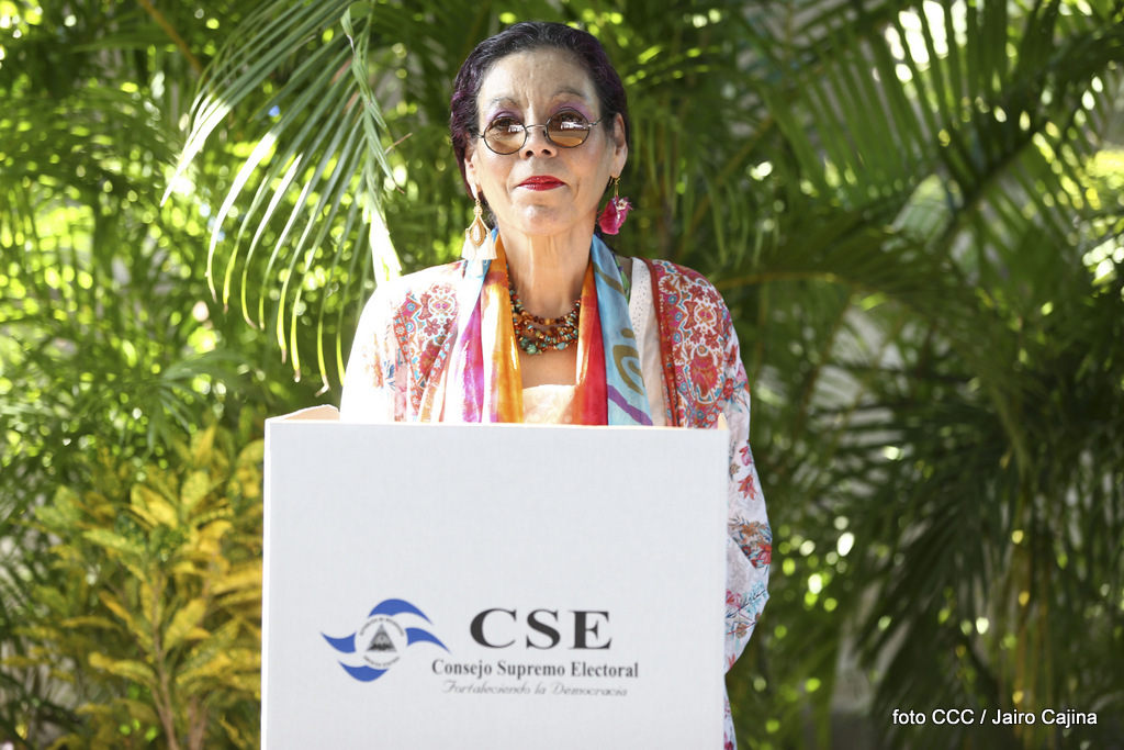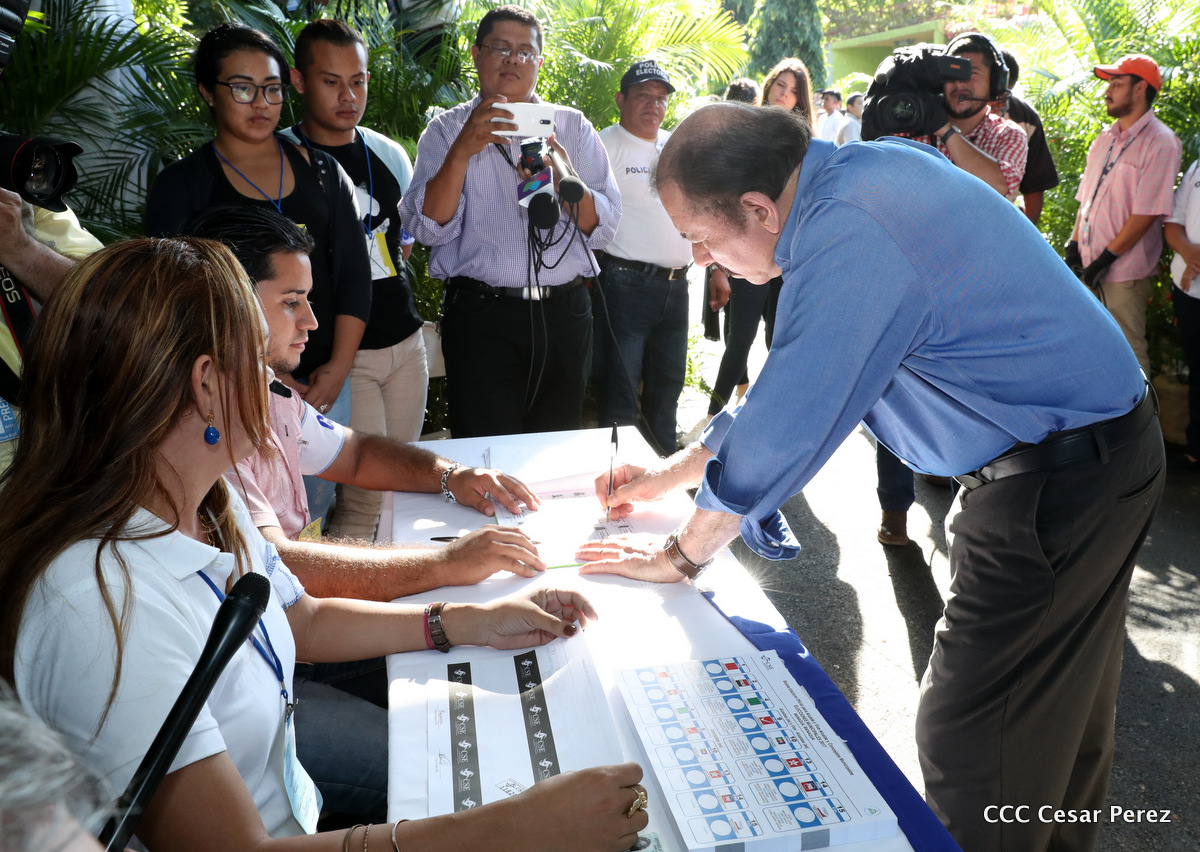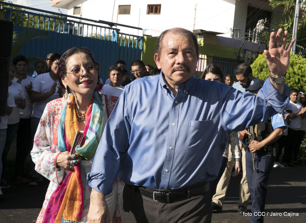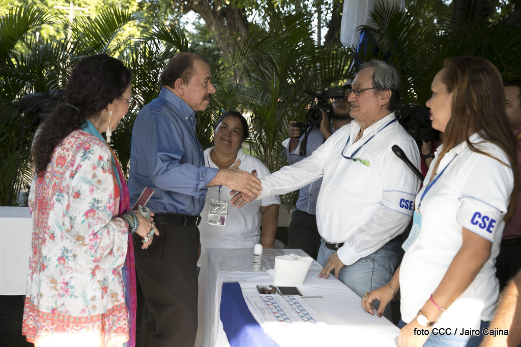 El Presidente Daniel Ortega y la Vicepresidenta de la República, Compañera Rosario Murillo, ejercieron su derecho al voto este domingo en la Junta Receptora de Votos ubicada en la Universidad Central de Nicaragua, del Reparto El Carmen.