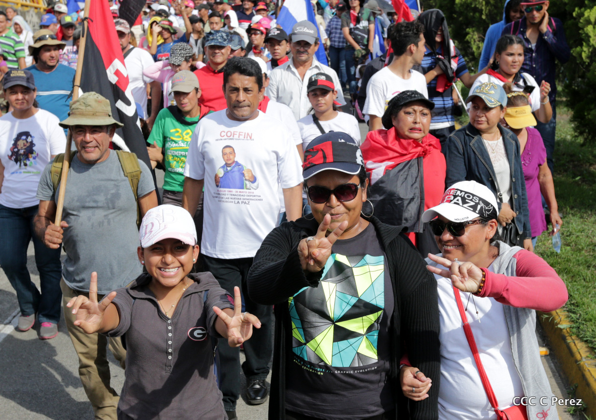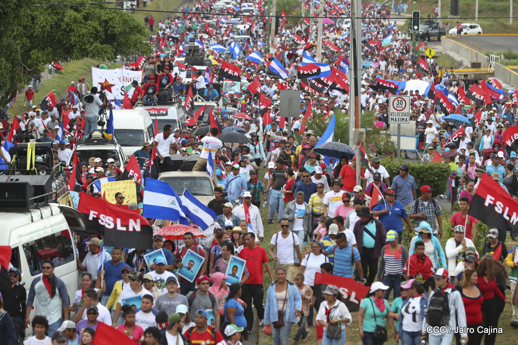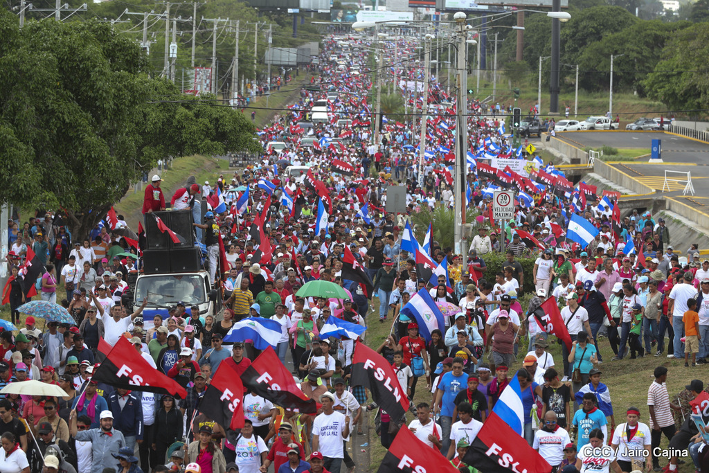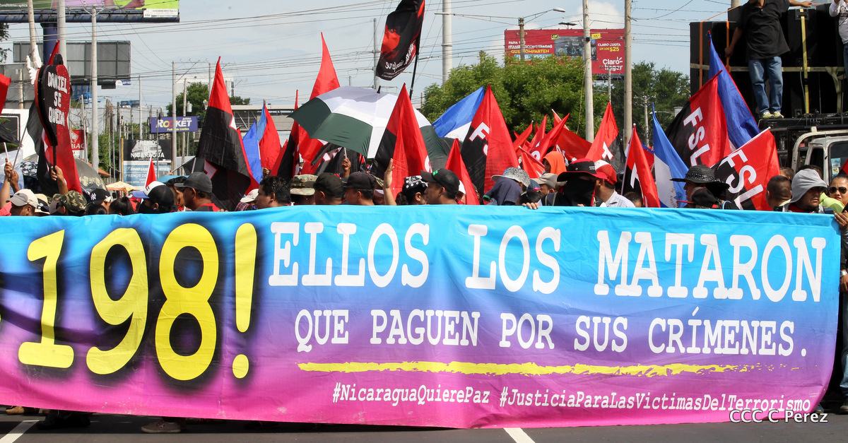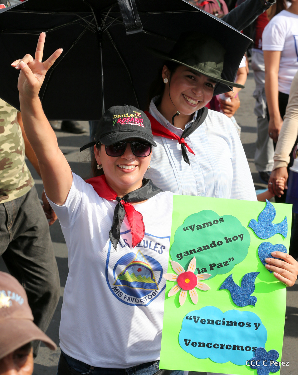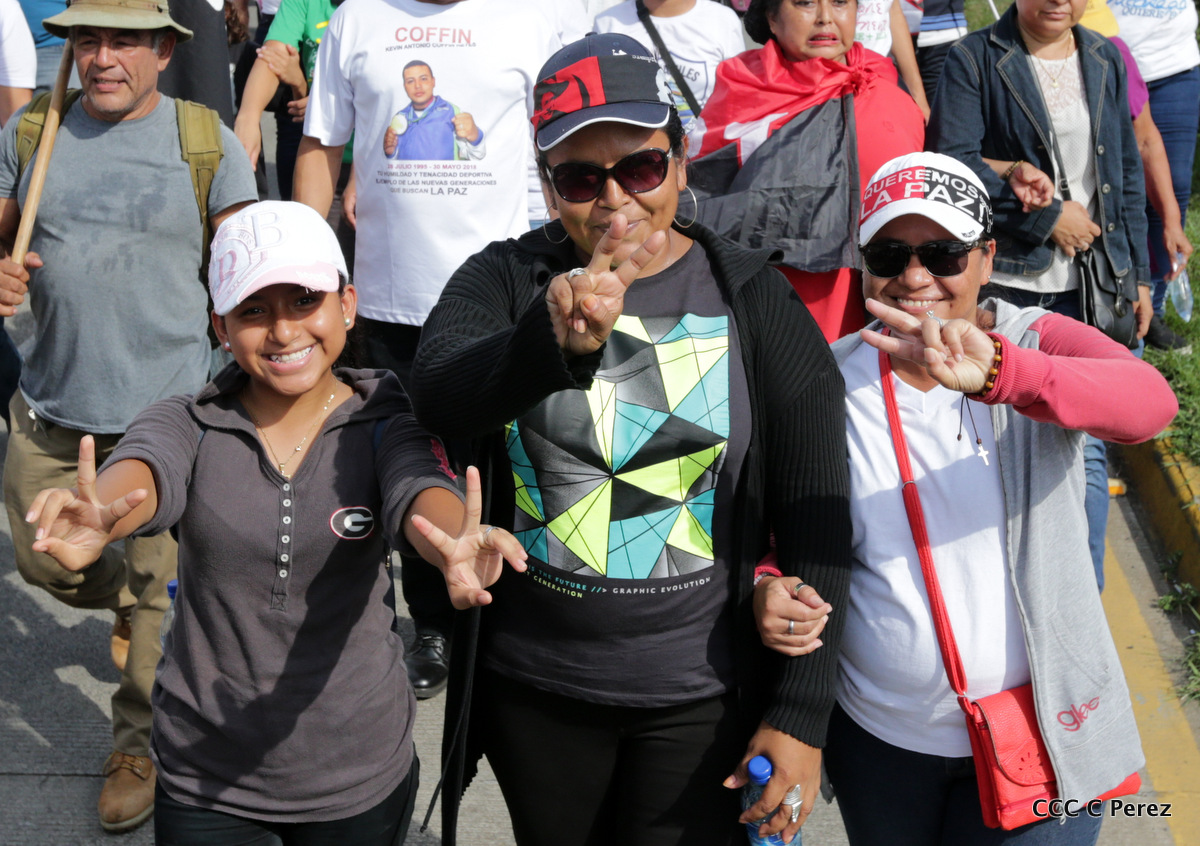 Desde la rotonda Jean Paul Genie cientos de miles de nicaragüenses caminaron hasta llegar a la Avenida de Bolívar a Chávez, en respaldo al Gobierno del Comandante Daniel Ortega y la Compañera Rosario Murillo y en solidaridad con quienes perdieron a un amigo, a un familiar o un compañero de trabajo. Miles recorrieron las principales arterias de la ciudad pidiendo justicia y reparación para las víctimas del terrorismo.