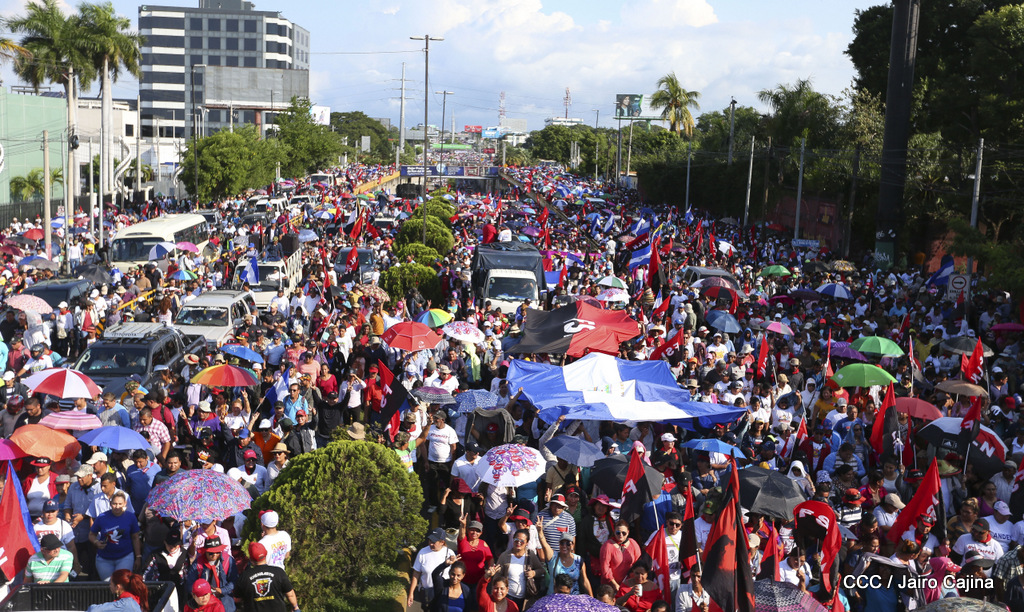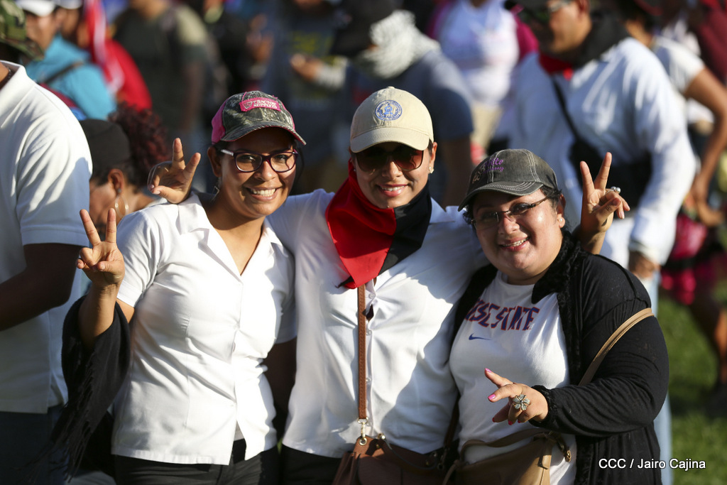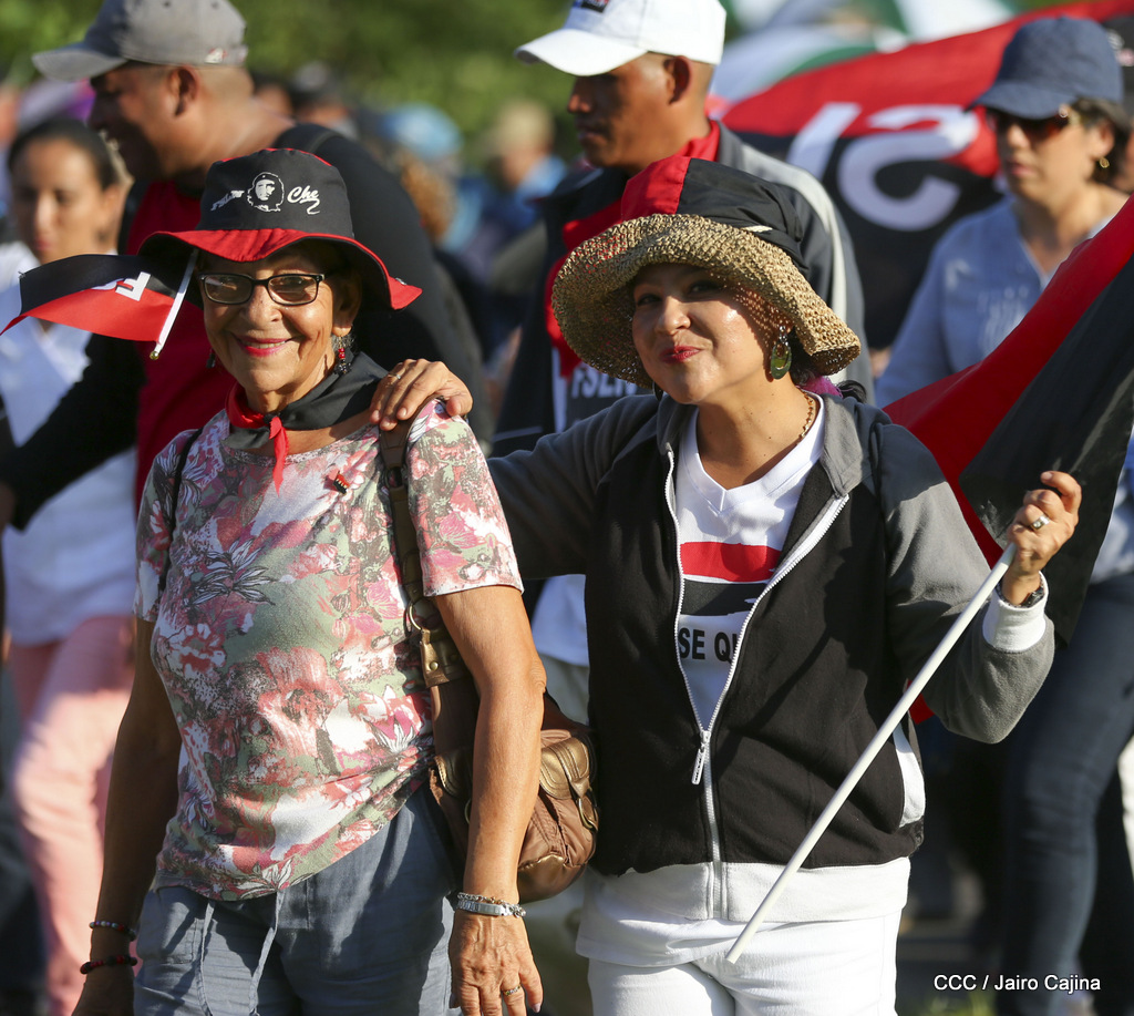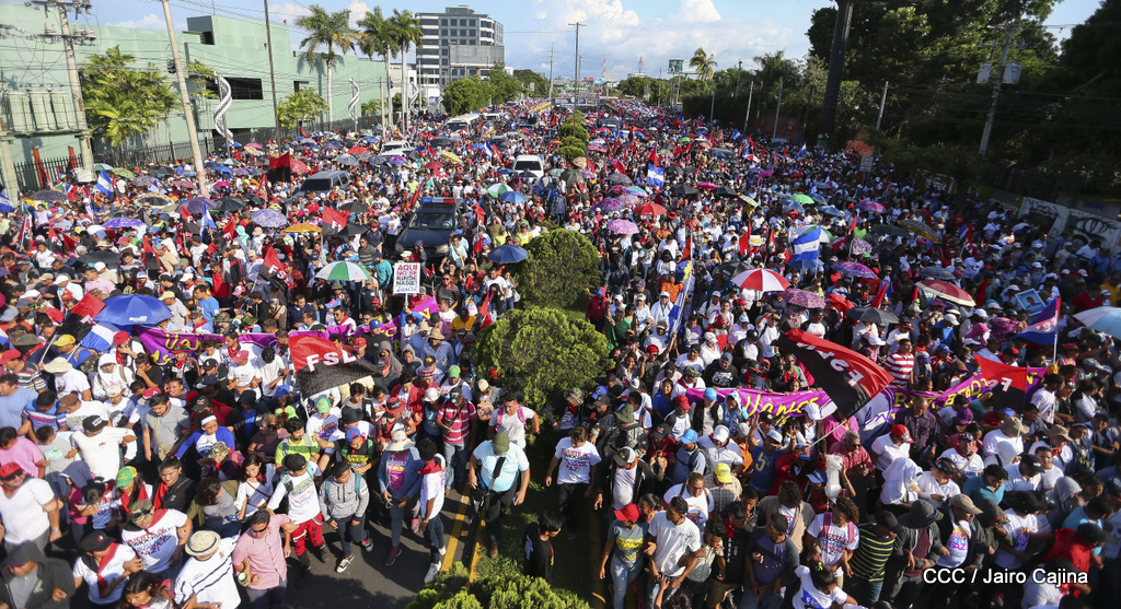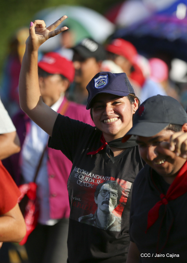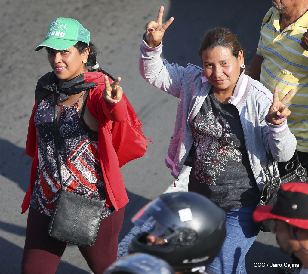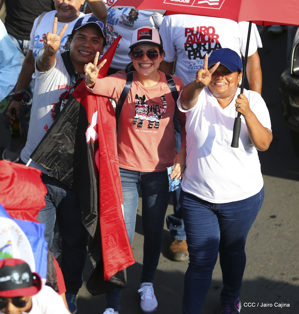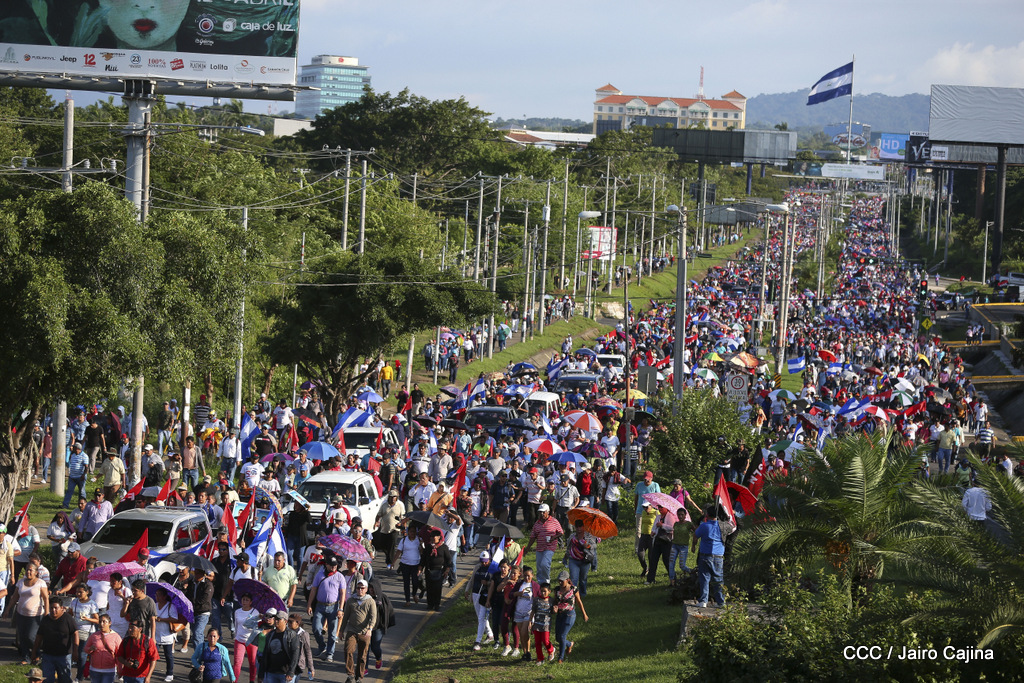 Miles de nicaragüenses marcharon este miércoles por la tarde desde la rotonda Jean Paul Genie hasta la Avenida de Bolívar y Chávez, donde fueron recibidos por nueve alcaldes de Managua, encabezados por la compañera Guiomar Irías, presidente ejecutiva de INIFOM, para ratificar su compromiso por la paz, la justicia y el resurgir de la Nación.