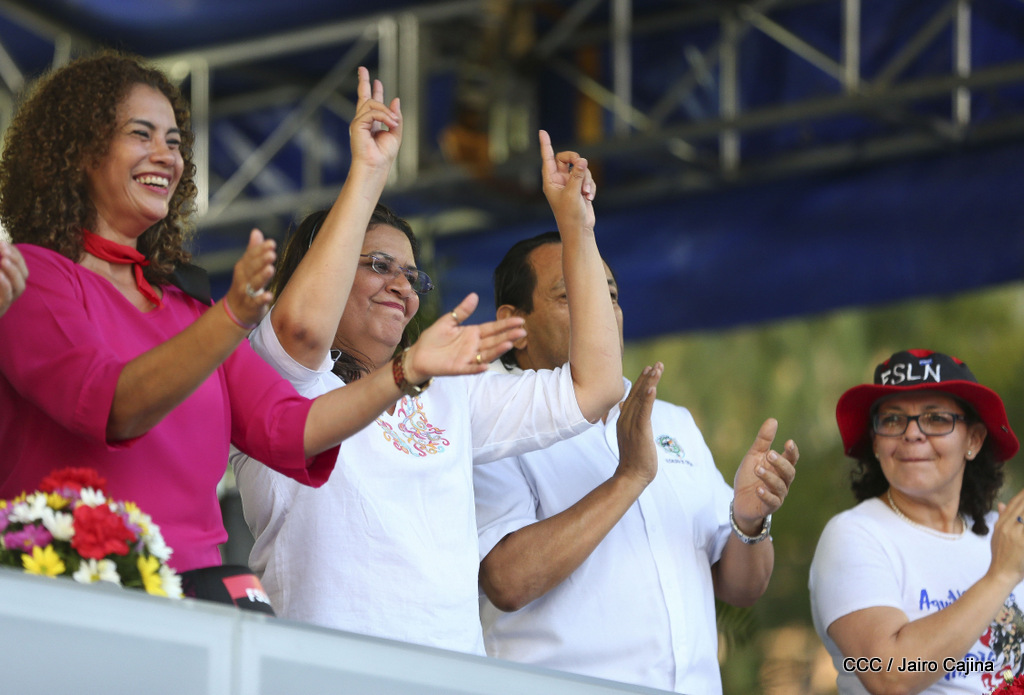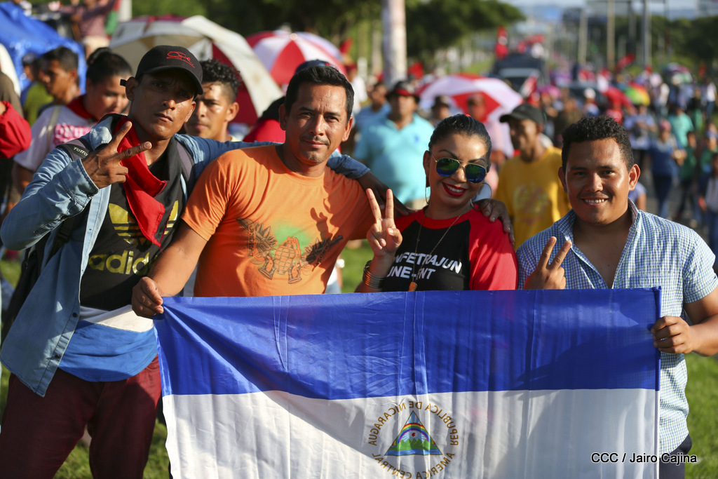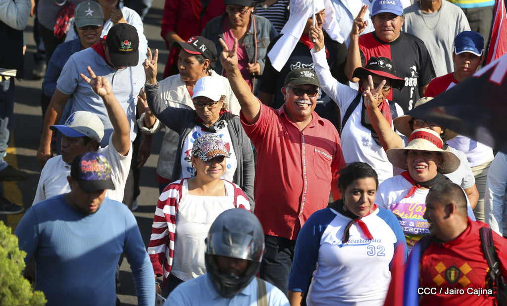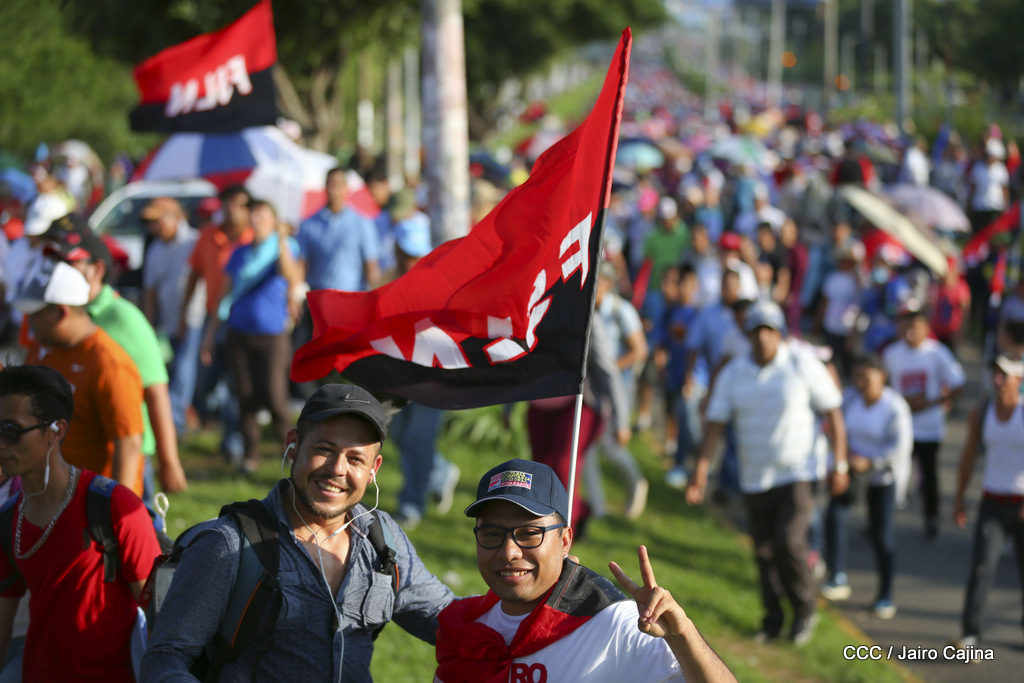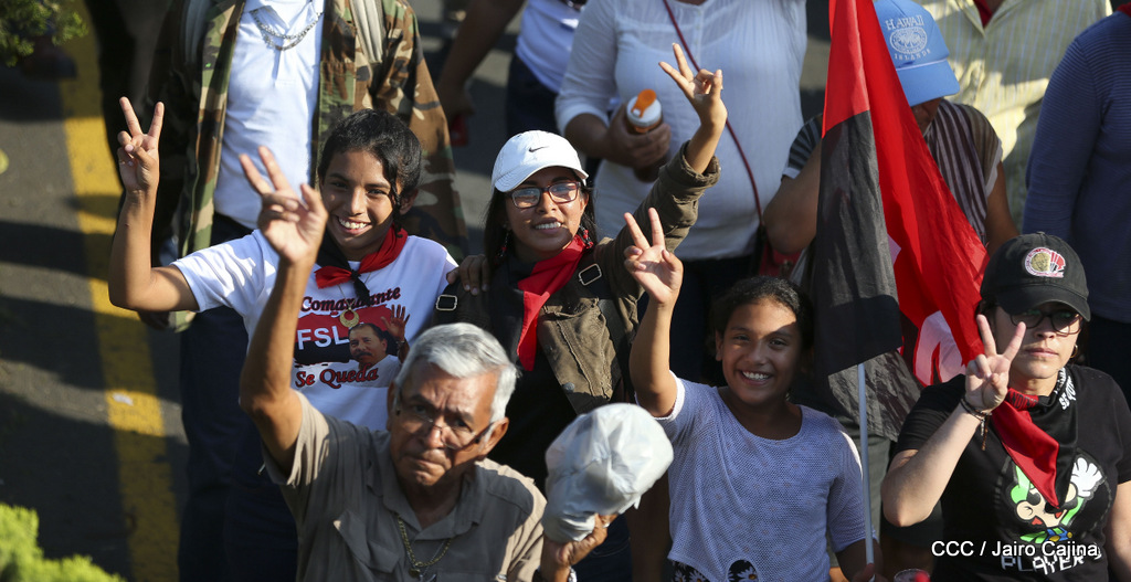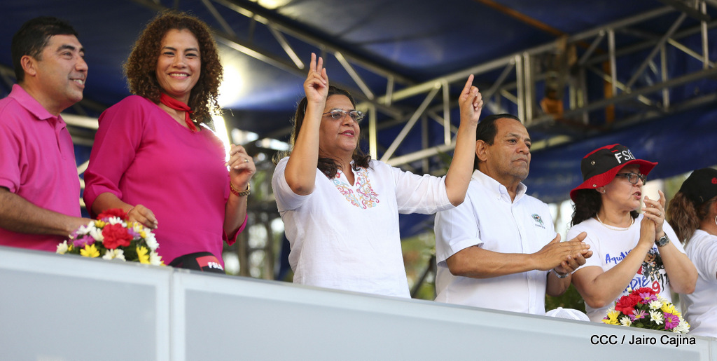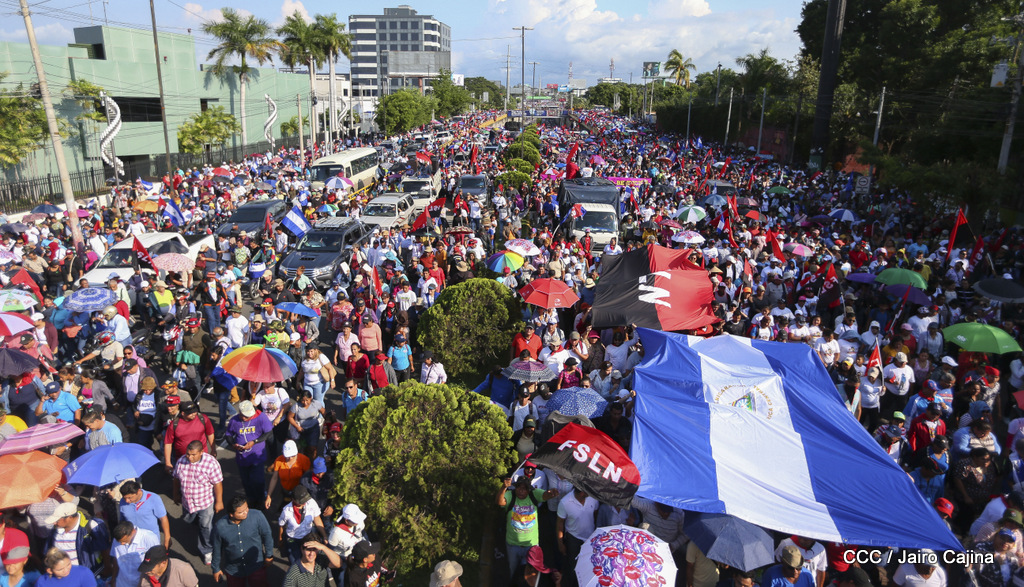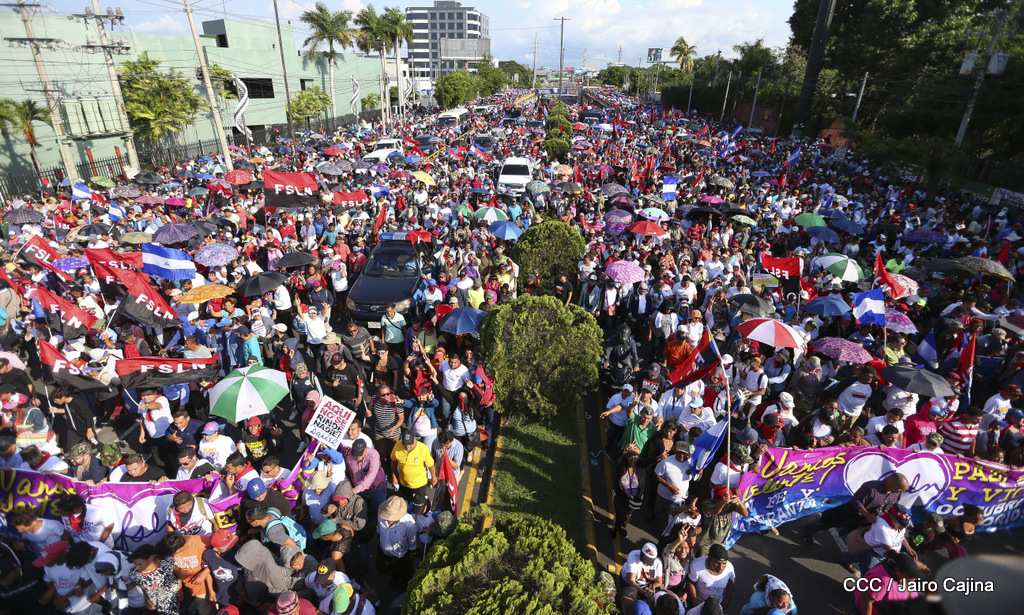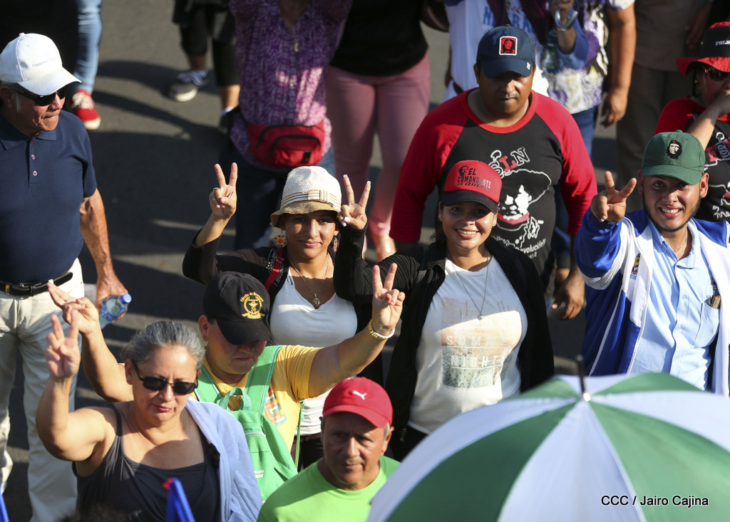 Miles de nicaragüenses marcharon este miércoles por la tarde desde la rotonda Jean Paul Genie hasta la Avenida de Bolívar y Chávez, donde fueron recibidos por nueve alcaldes de Managua, encabezados por la compañera Guiomar Irías, presidente ejecutiva de INIFOM, para ratificar su compromiso por la paz, la justicia y el resurgir de la Nación.