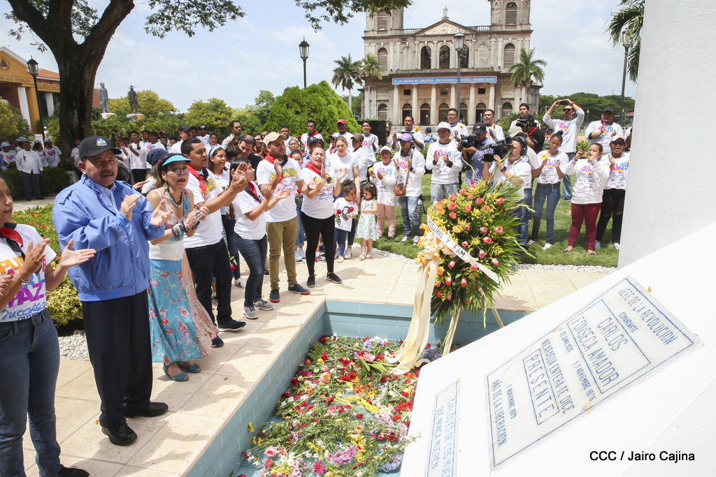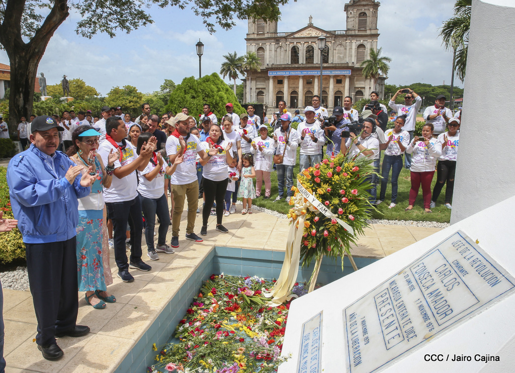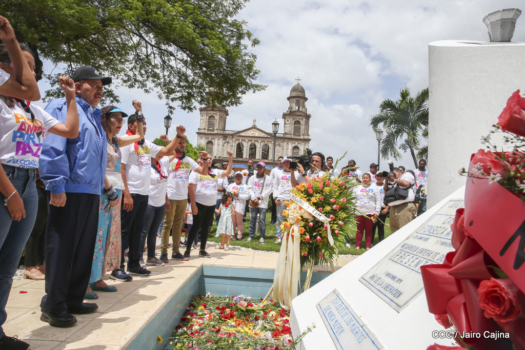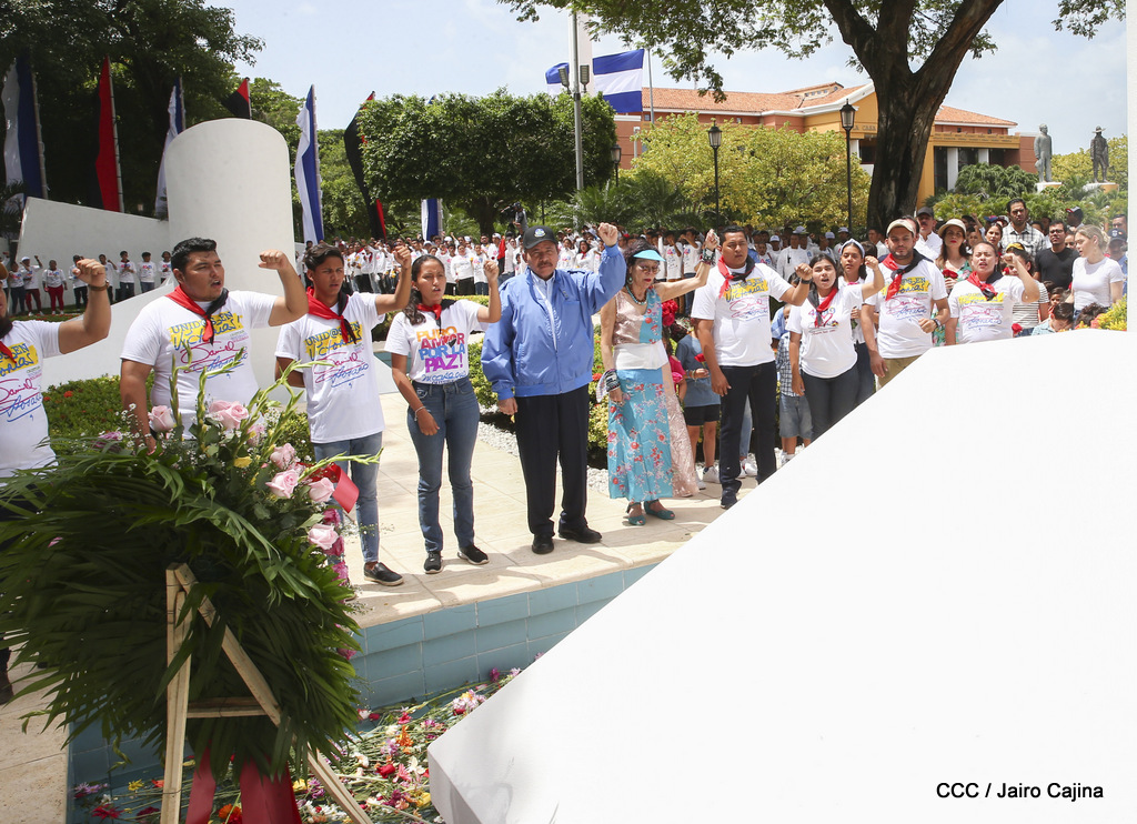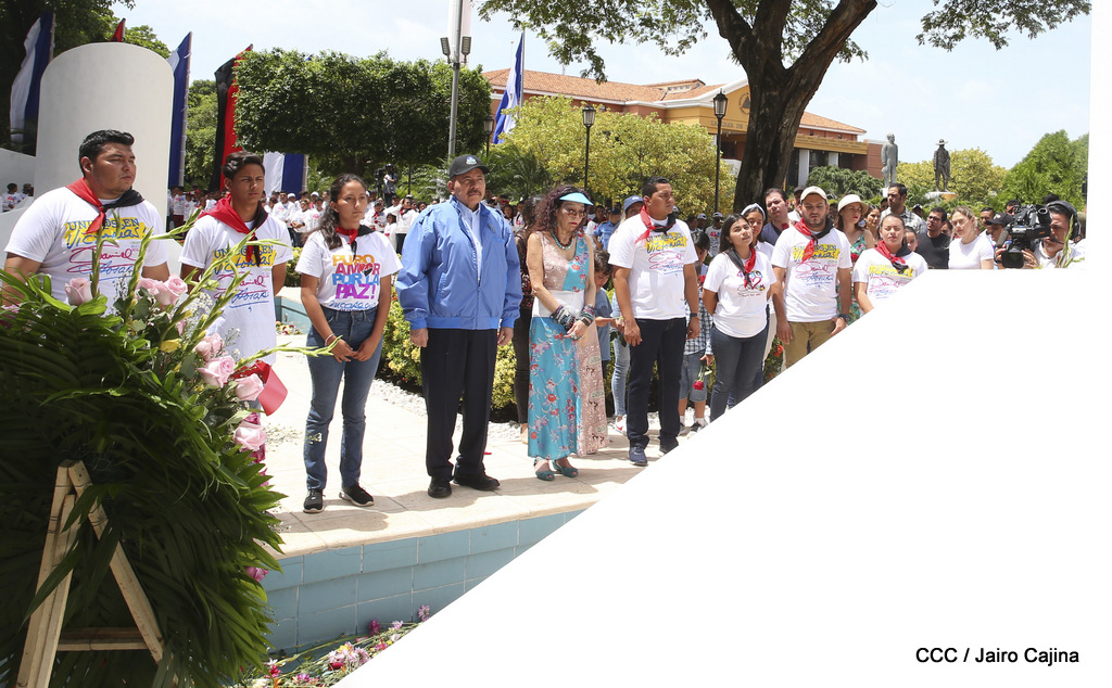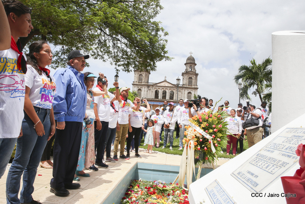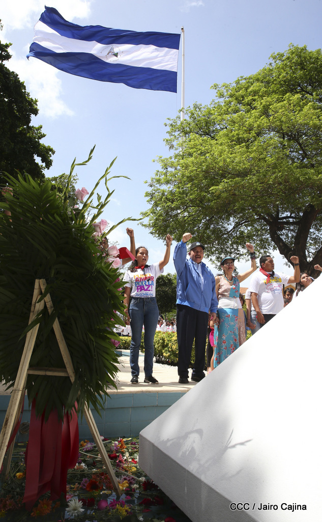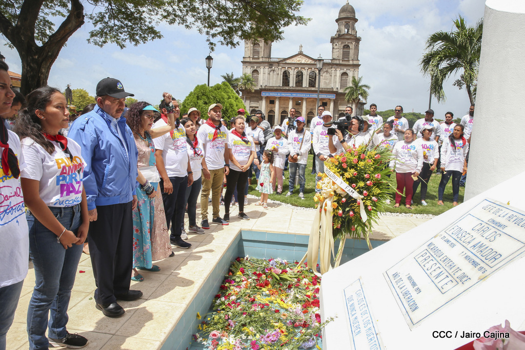 "Hoy en el aniversario de su nacimiento le decimos a Carlos que aquí estamos siempre luchando por la paz, porque queremos la paz, no queremos confrontación no queremos guerra, la paz que tantos nos ha costado conquistar, que tanto nos ha costado alcanzar, cuantos héroes, cuantos mártires a lo largo de nuestra historia para alcanzar la paz, para conquistar la paz”, reiteró el Comandante Daniel Ortega, Presidente de la República, en el homenaje al Comandante Carlos Fonseca Amador, en celebración del 83 aniversario del natalicio del Padre de la Revolución Popular Sandinista.