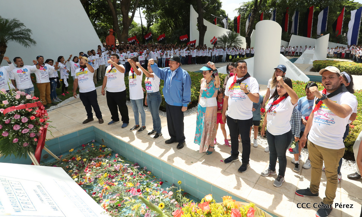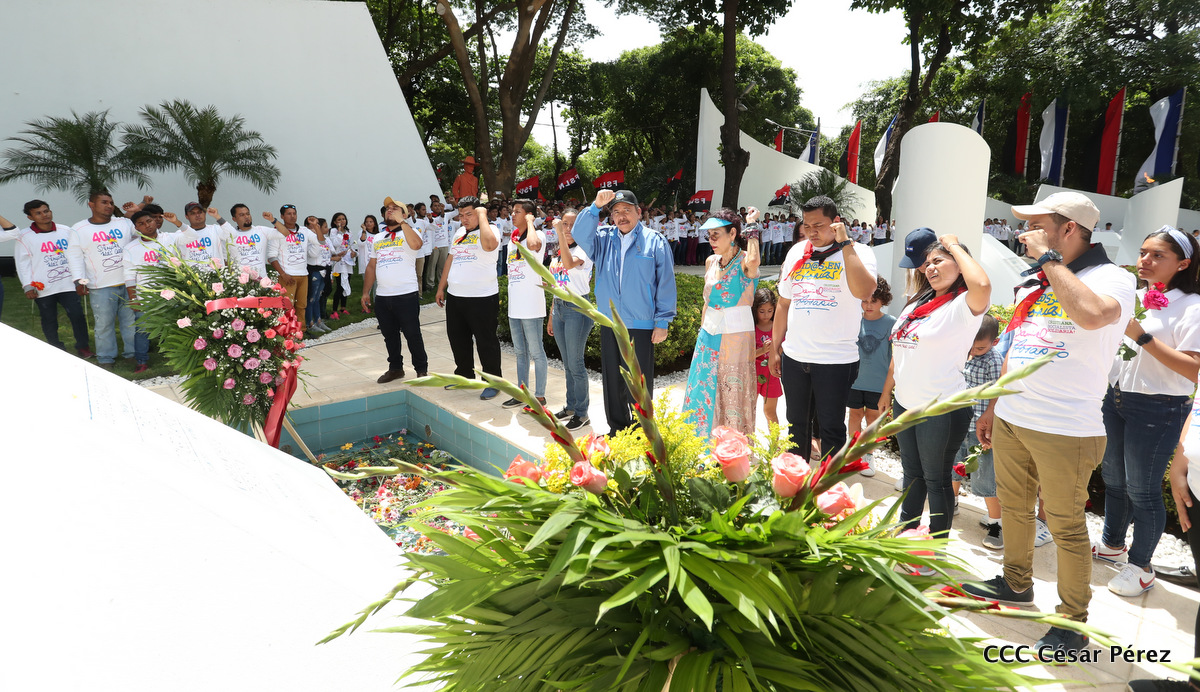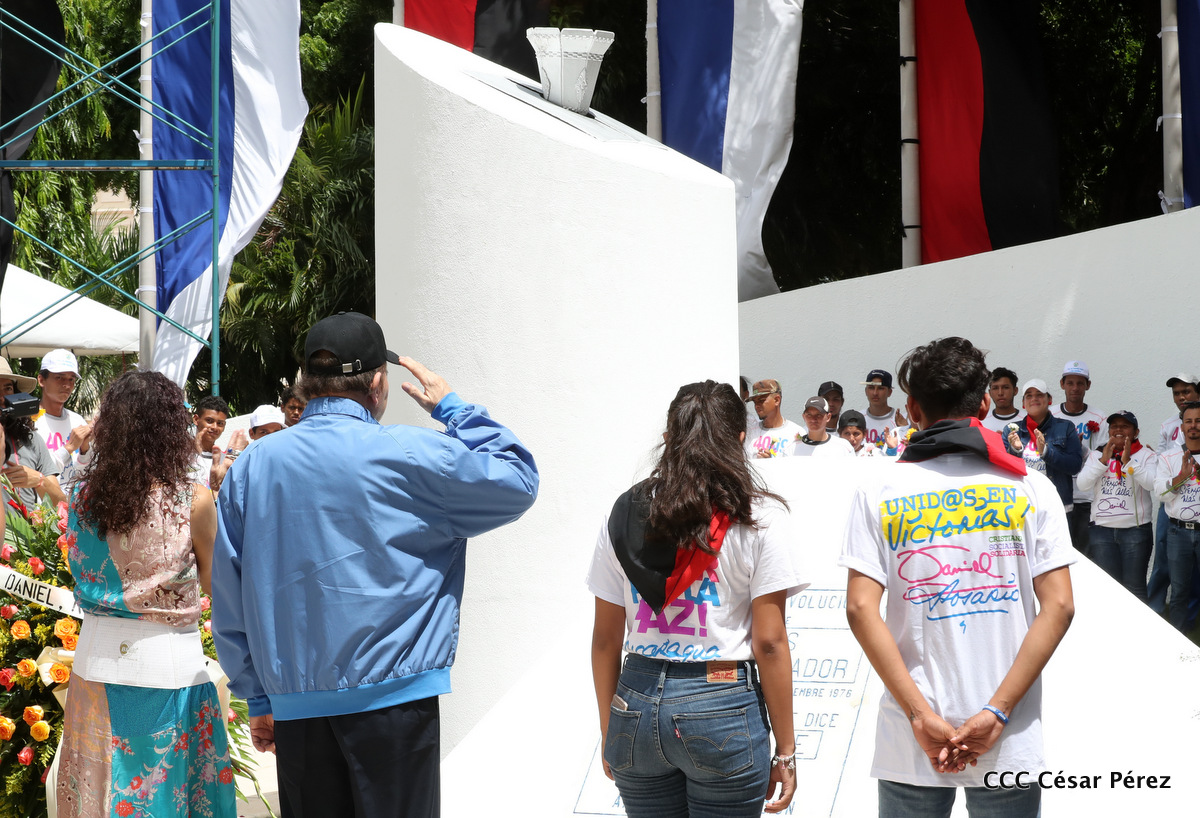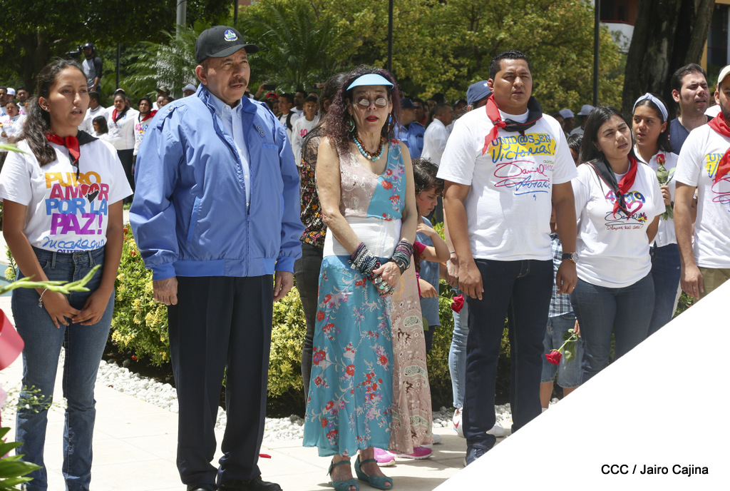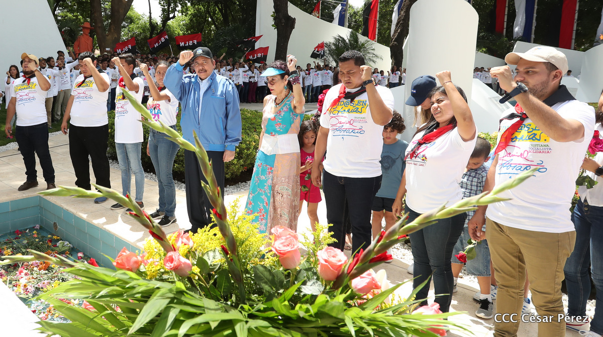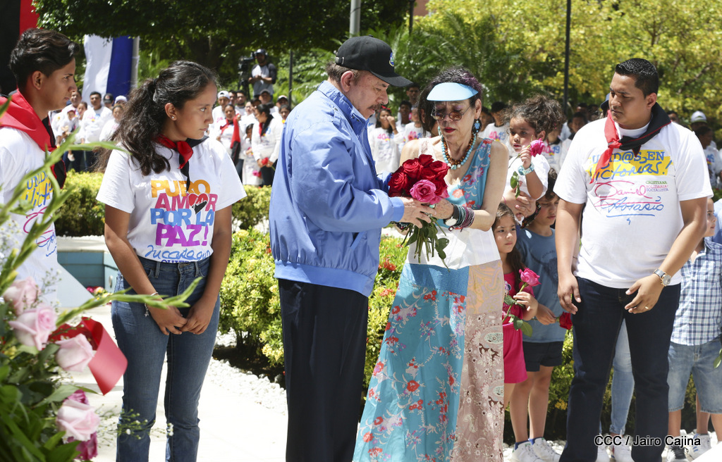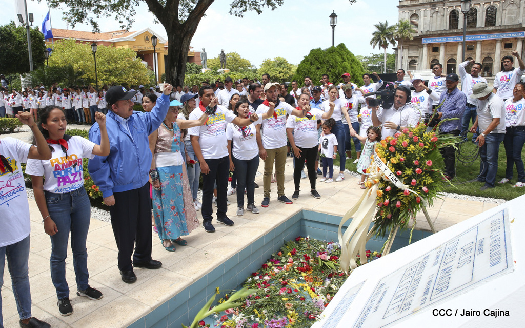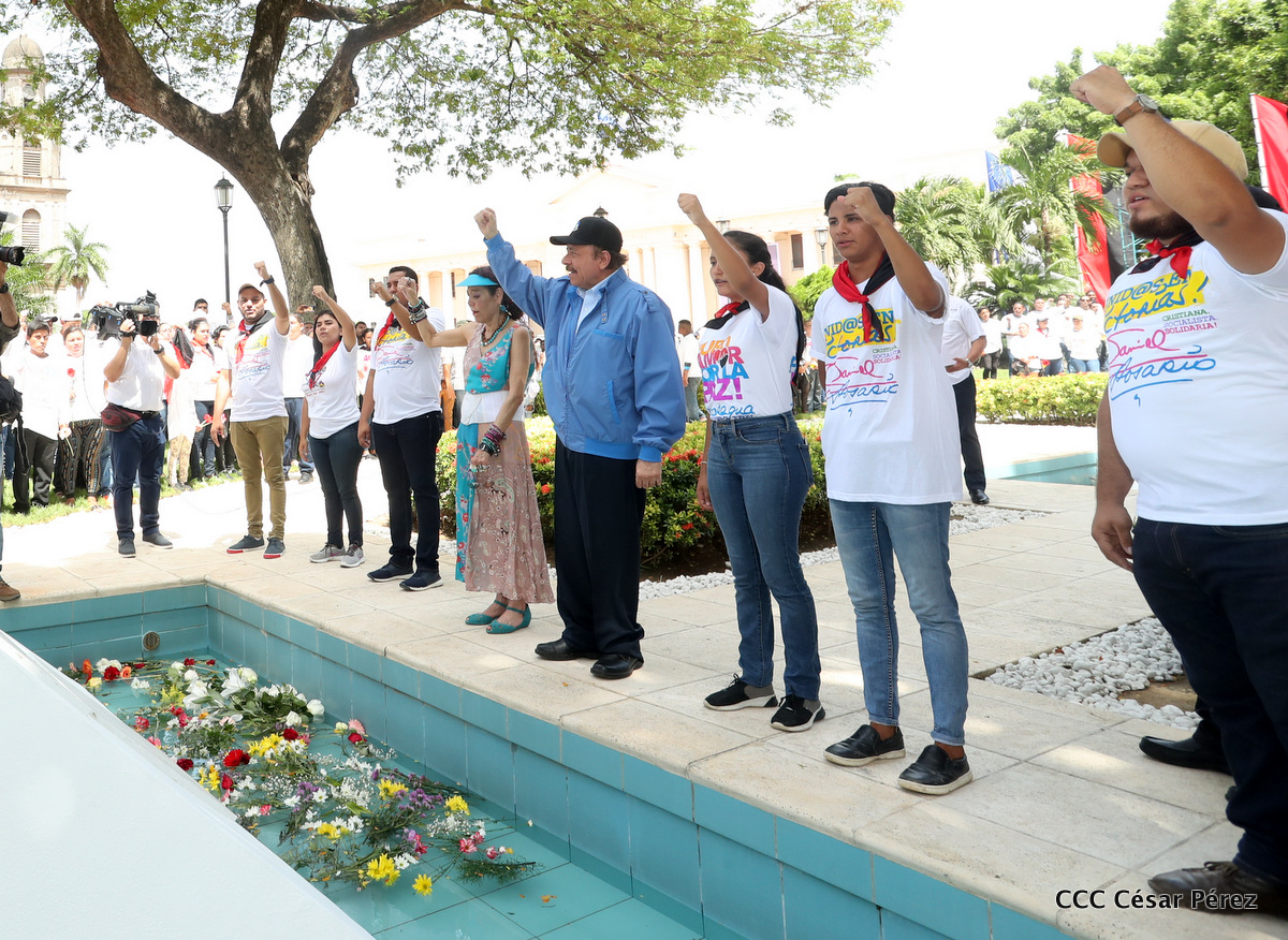"Hoy en el aniversario de su nacimiento le decimos a Carlos que aquí estamos siempre luchando por la paz, porque queremos la paz, no queremos confrontación no queremos guerra, la paz que tantos nos ha costado conquistar, que tanto nos ha costado alcanzar, cuantos héroes, cuantos mártires a lo largo de nuestra historia para alcanzar la paz, para conquistar la paz”, reiteró el Comandante Daniel Ortega, Presidente de la República, en el homenaje al Comandante Carlos Fonseca Amador, en celebración del 83 aniversario del natalicio del Padre de la Revolución Popular Sandinista.
