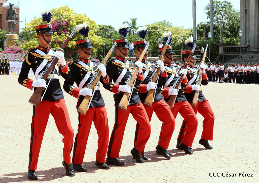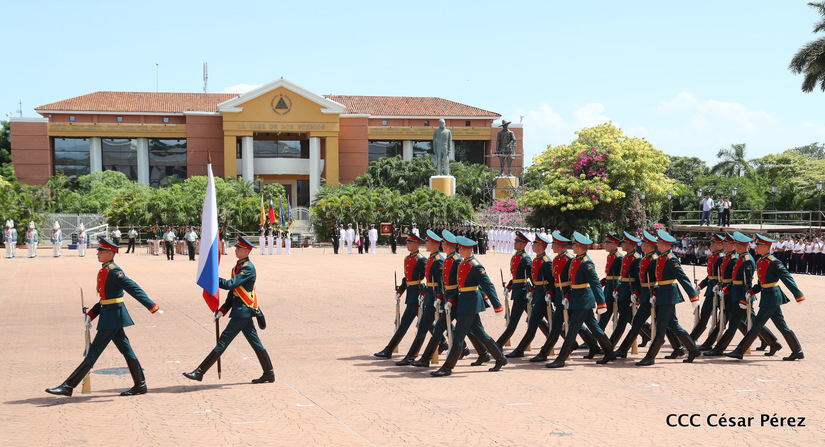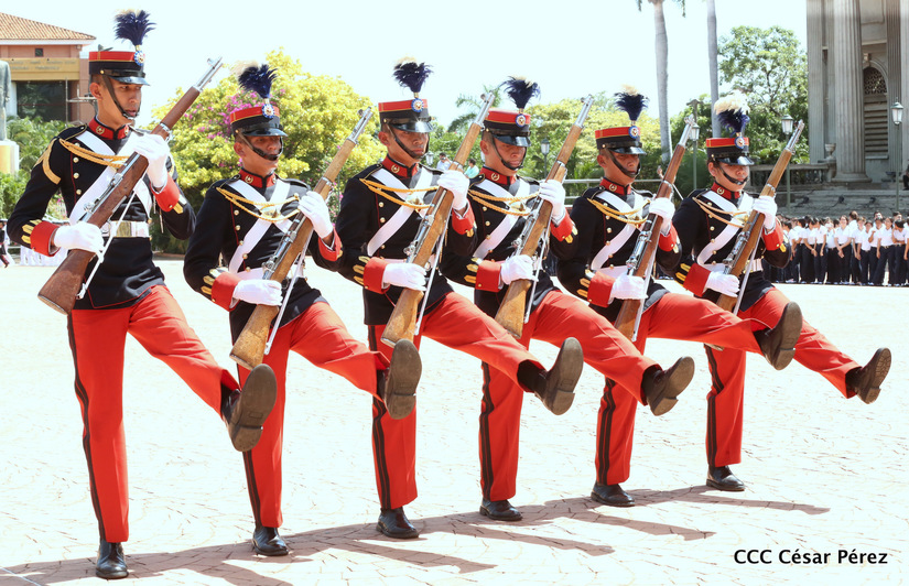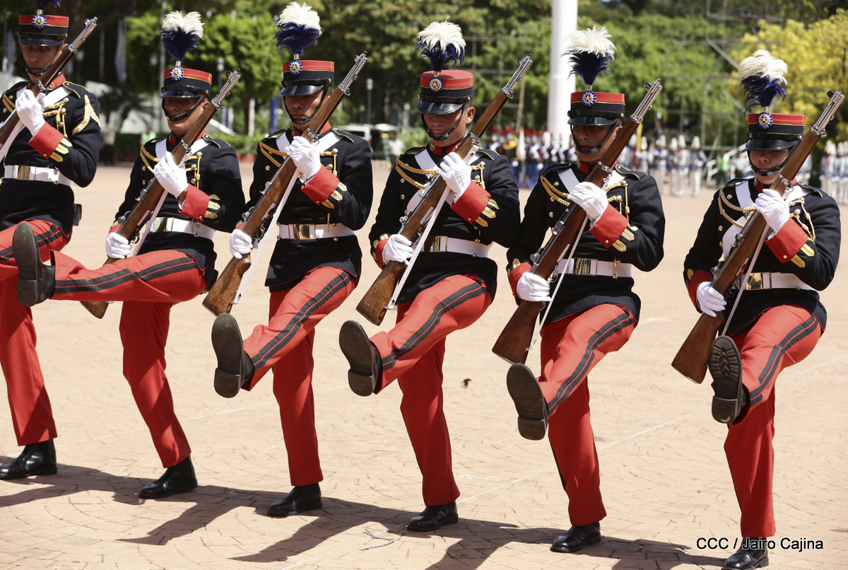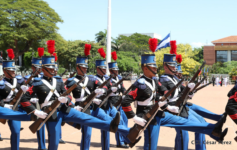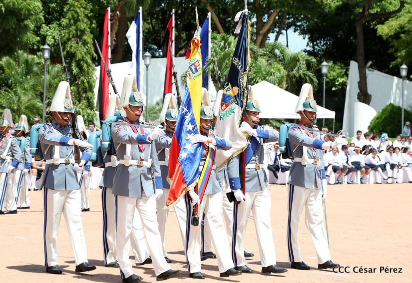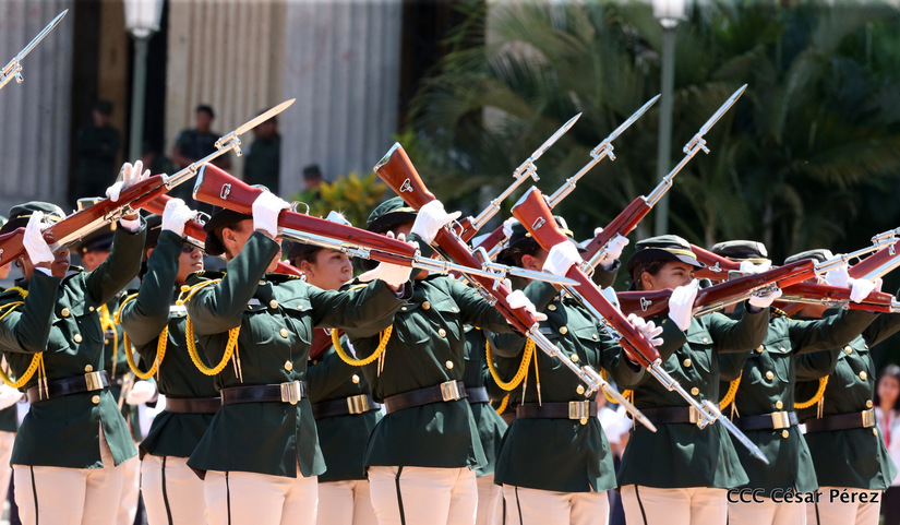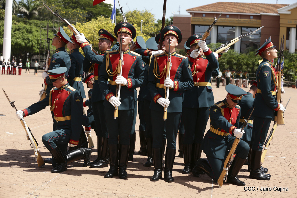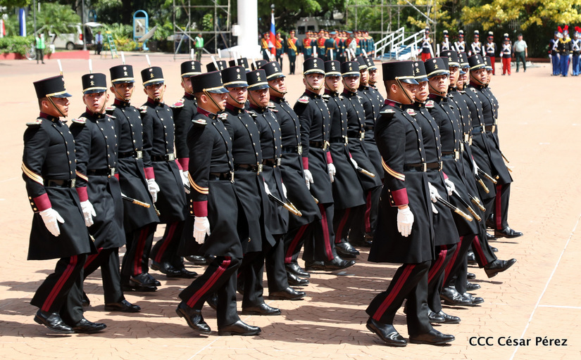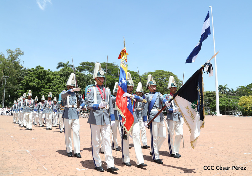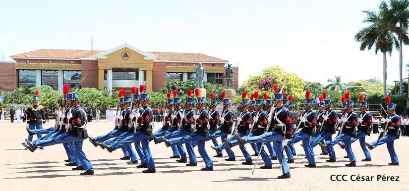 Representantes de academias y fuerzas armadas de países como Taiwán, México, Rusia, Guatemala, Honduras y Venezuela, realizaron una exhibición de movimientos de fantasía en la Plaza de la Revolución, como parte de las celebraciones del 40 aniversario de constitución del Ejército de Nicaragua.