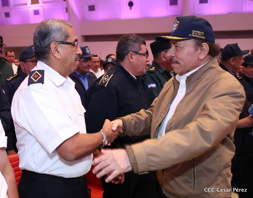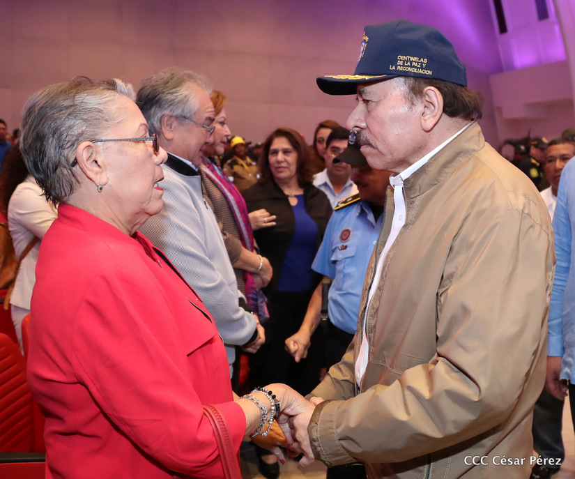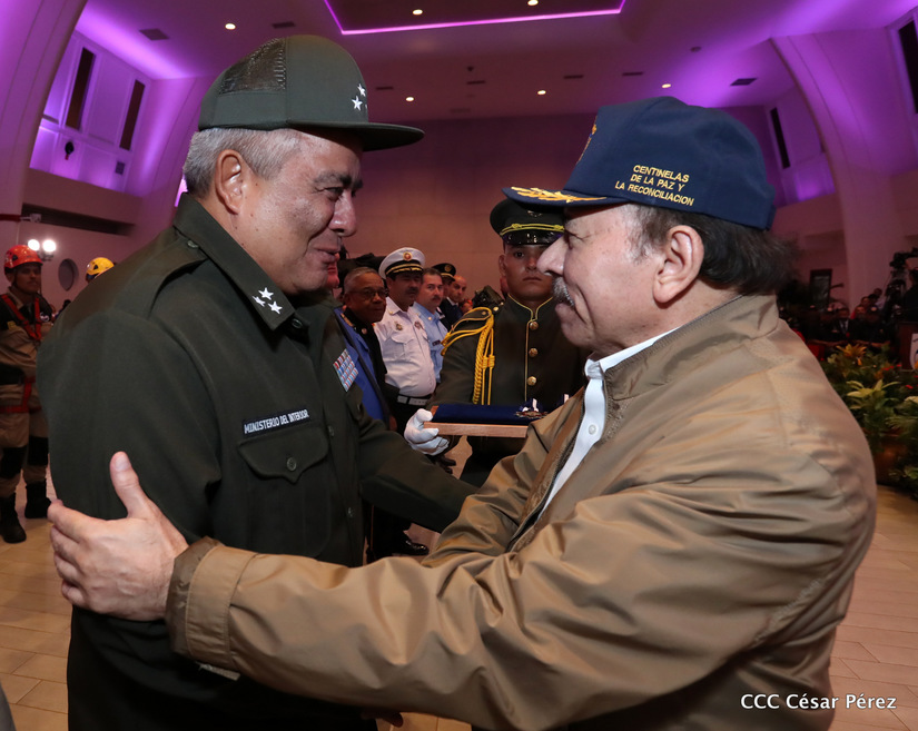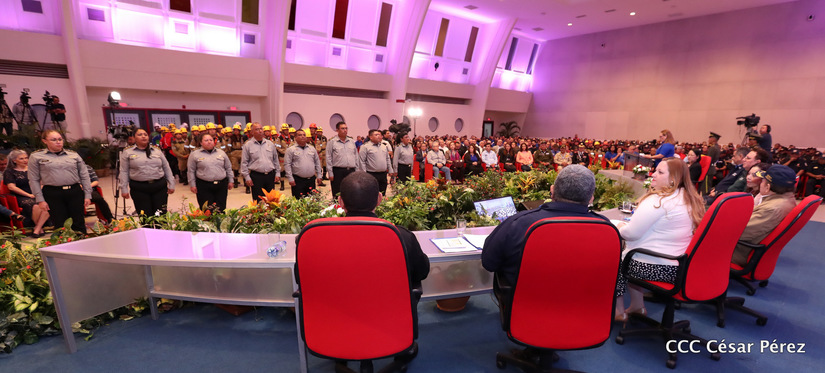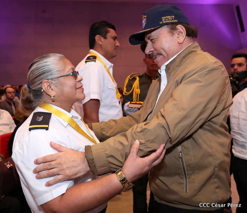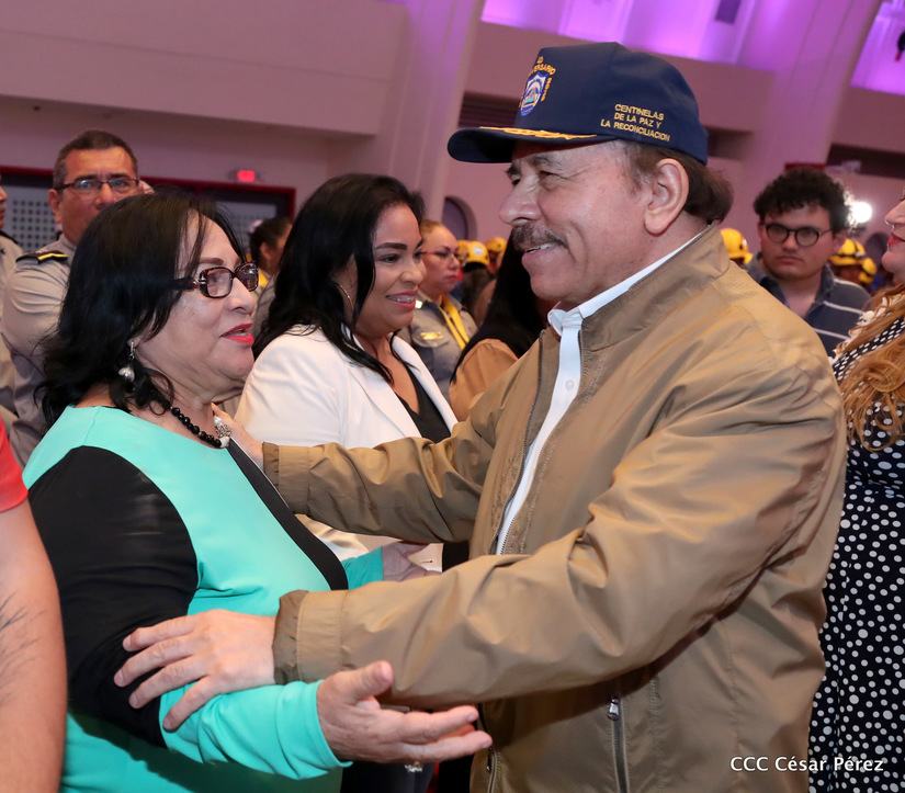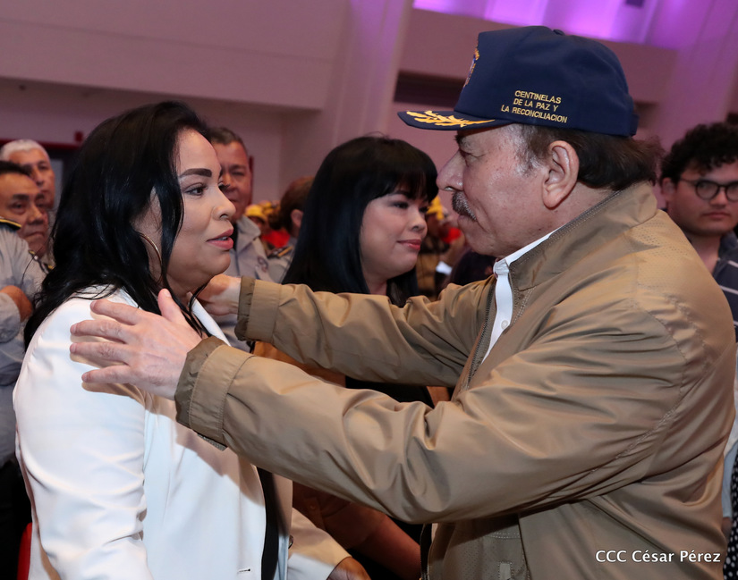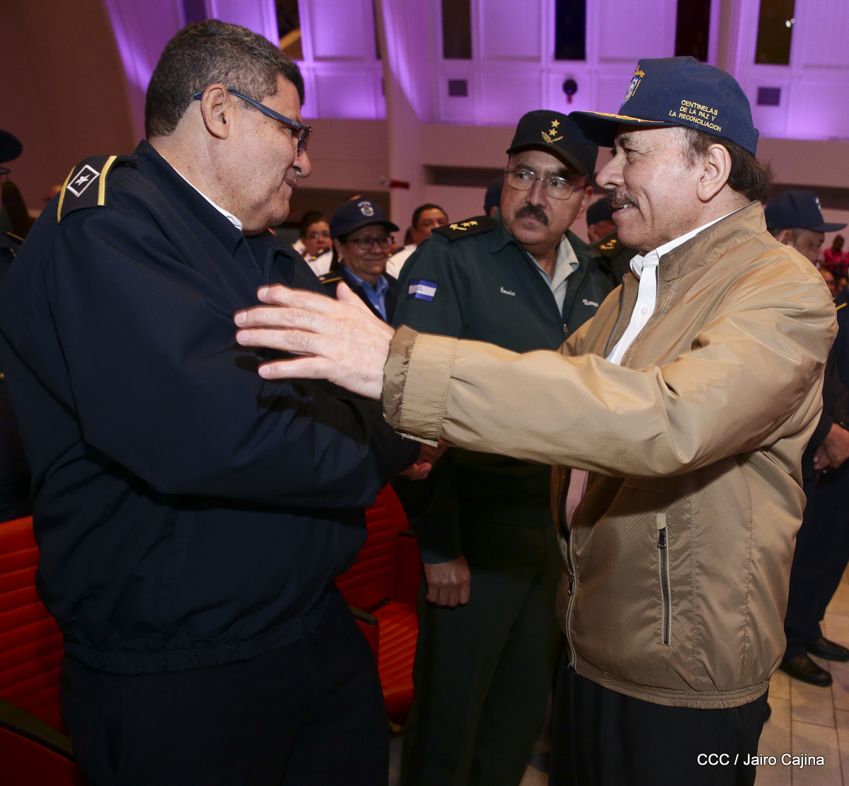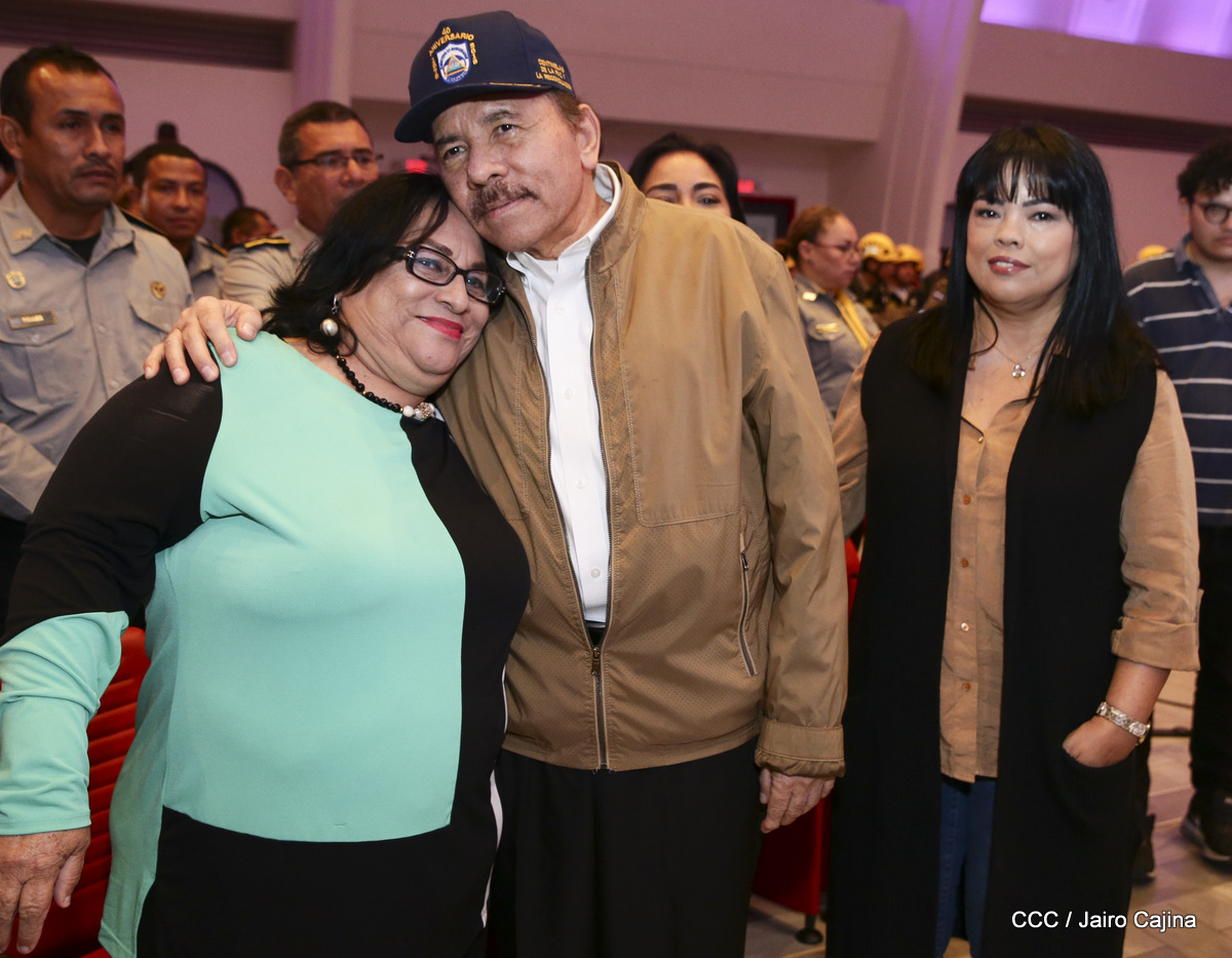 El presidente de la República, comandante Daniel Ortega y la vicepresidenta compañera Rosario Murillo, presiden el acto de 40 aniversario del Ministerio de Gobernación, junto a la compañera ministra María Amelia Coronel y compañera Rosa Adelina Barahona, ministra de Defensa.