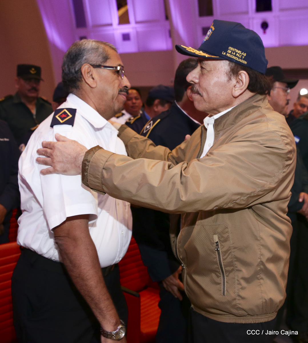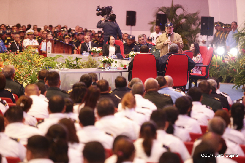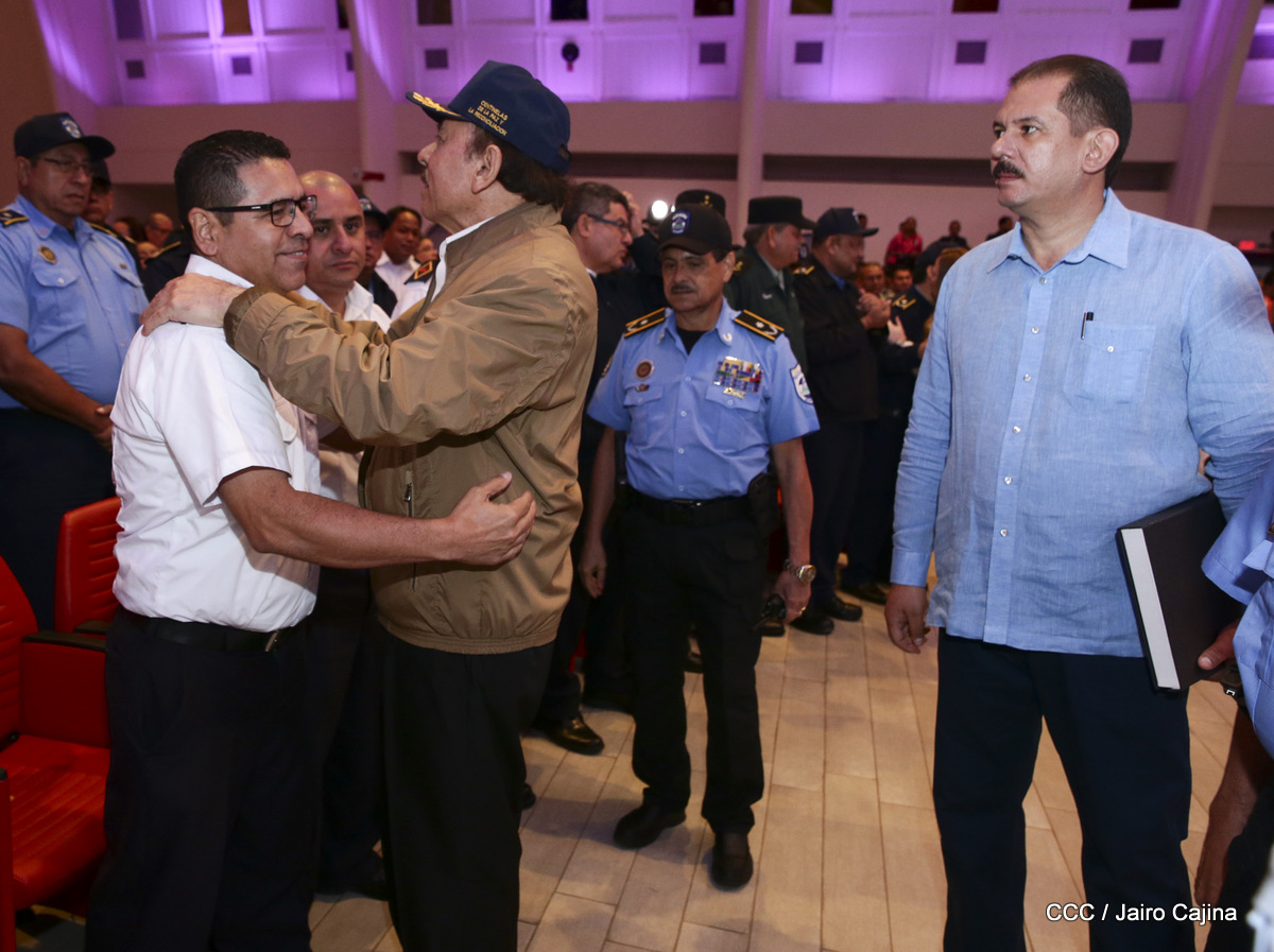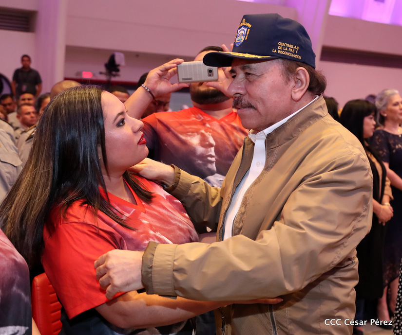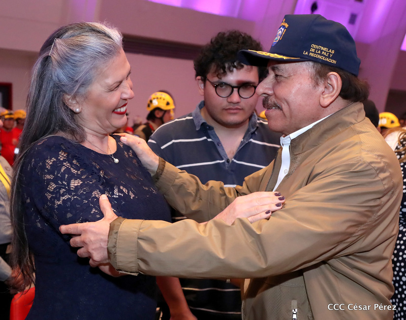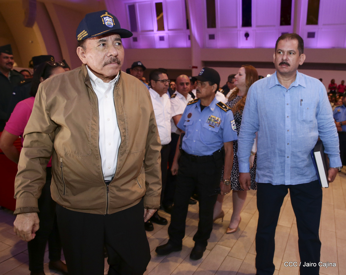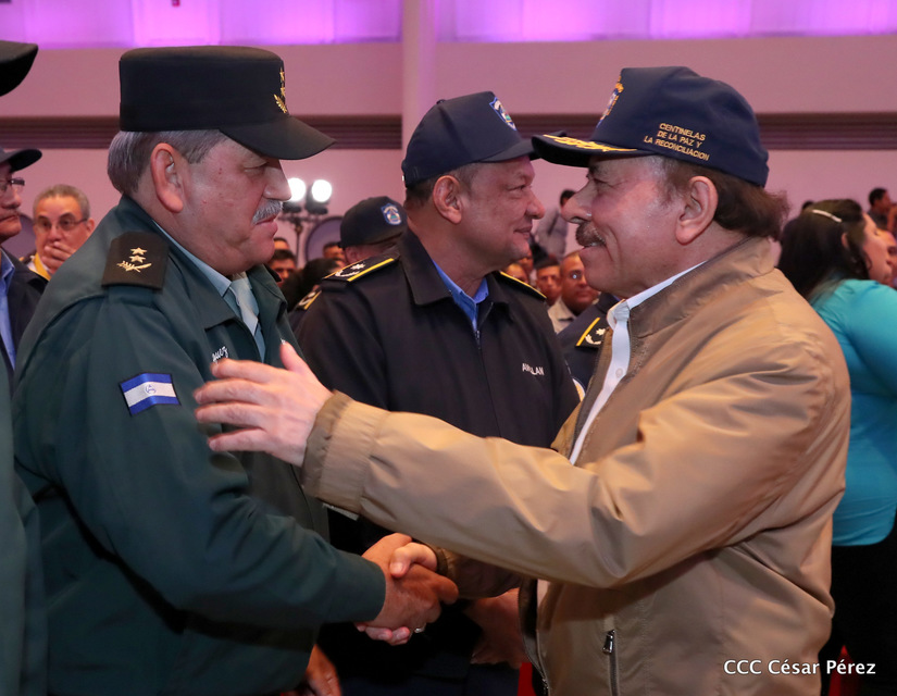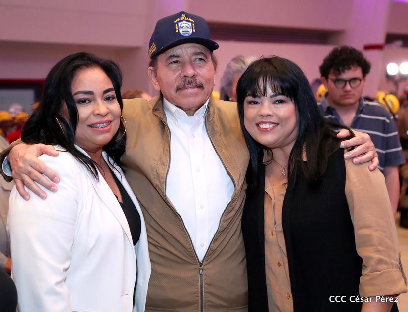 El presidente de la República, comandante Daniel Ortega y la vicepresidenta compañera Rosario Murillo, presiden el acto de 40 aniversario del Ministerio de Gobernación, junto a la compañera ministra María Amelia Coronel y compañera Rosa Adelina Barahona, ministra de Defensa.