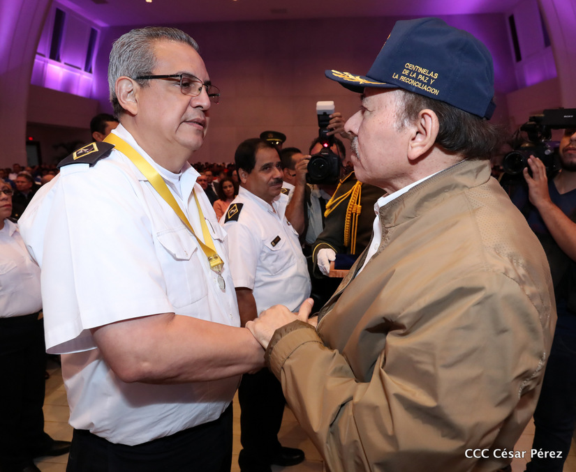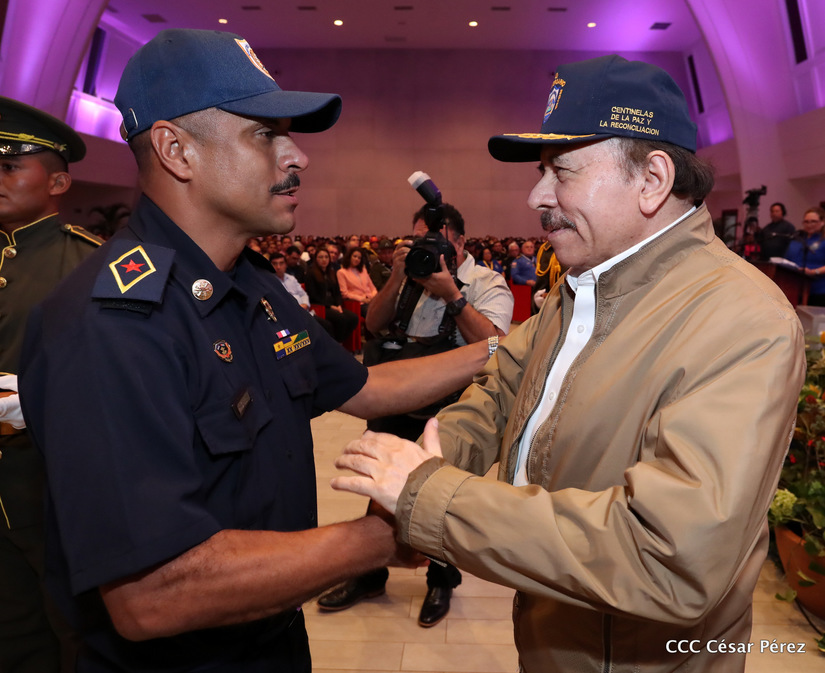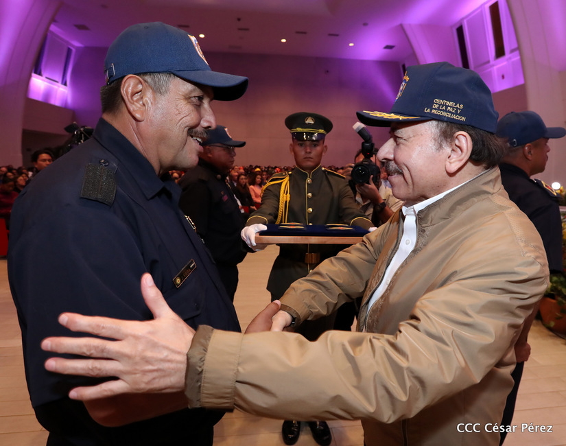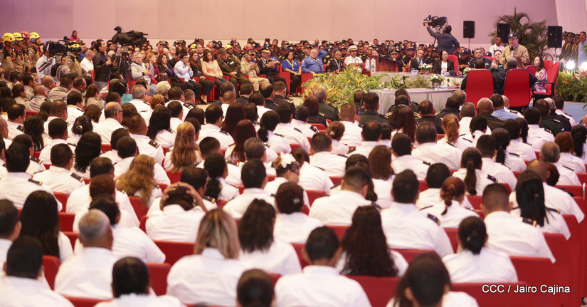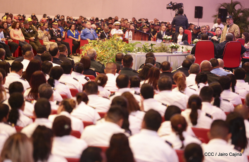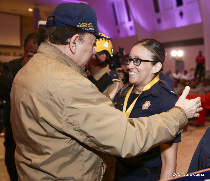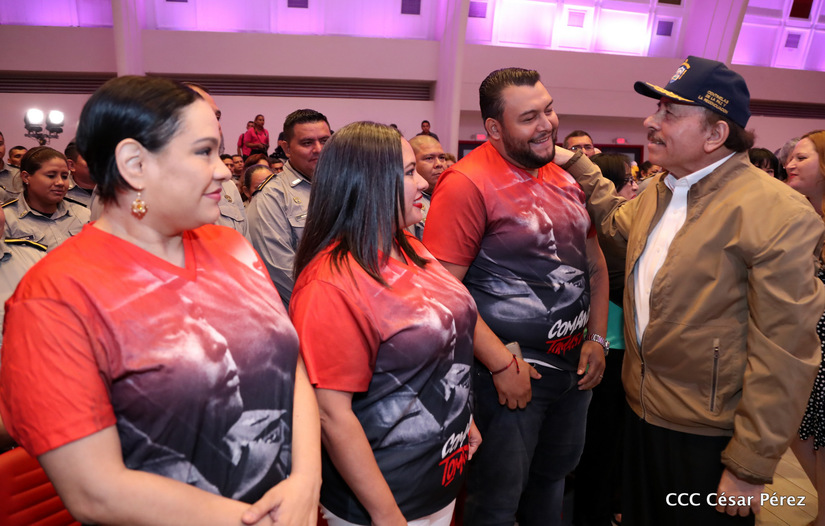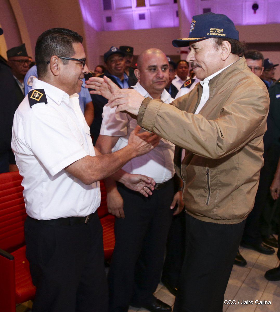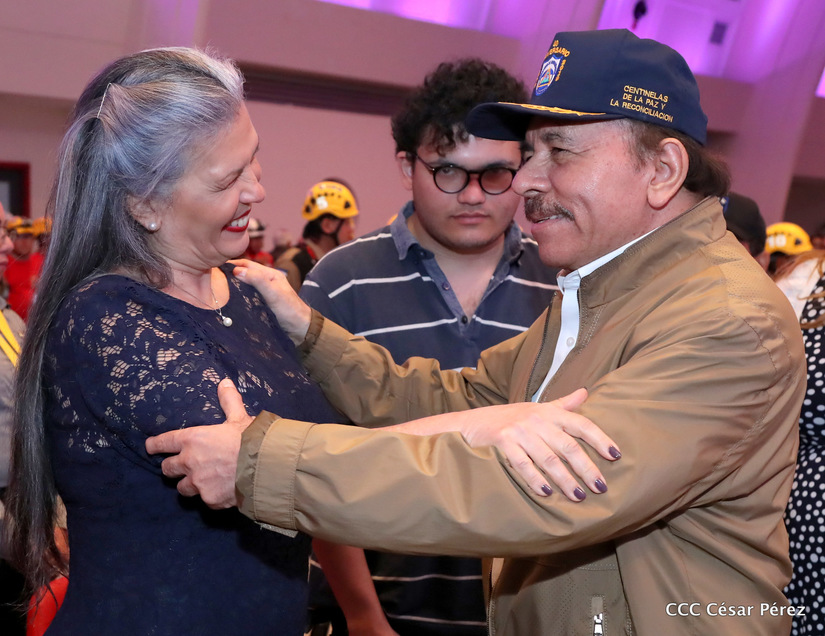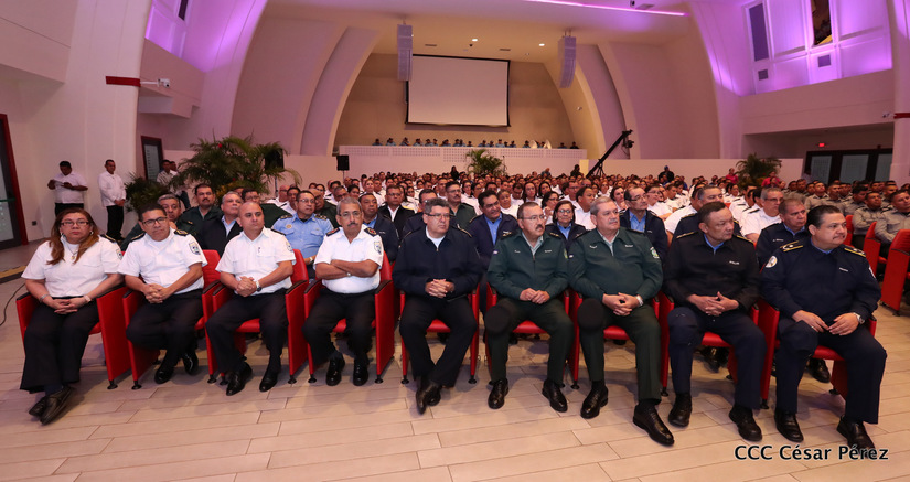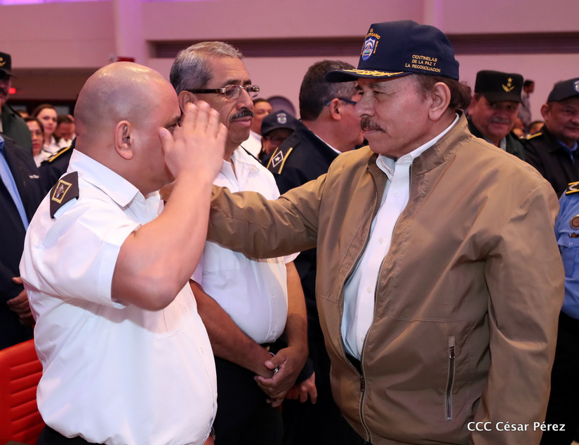 El presidente de la República, comandante Daniel Ortega y la vicepresidenta compañera Rosario Murillo, presiden el acto de 40 aniversario del Ministerio de Gobernación, junto a la compañera ministra María Amelia Coronel y compañera Rosa Adelina Barahona, ministra de Defensa.
