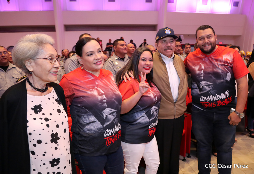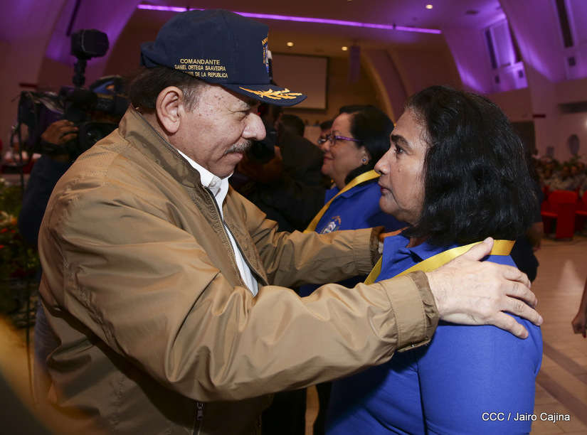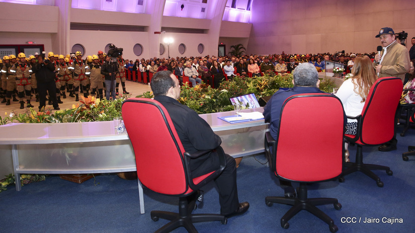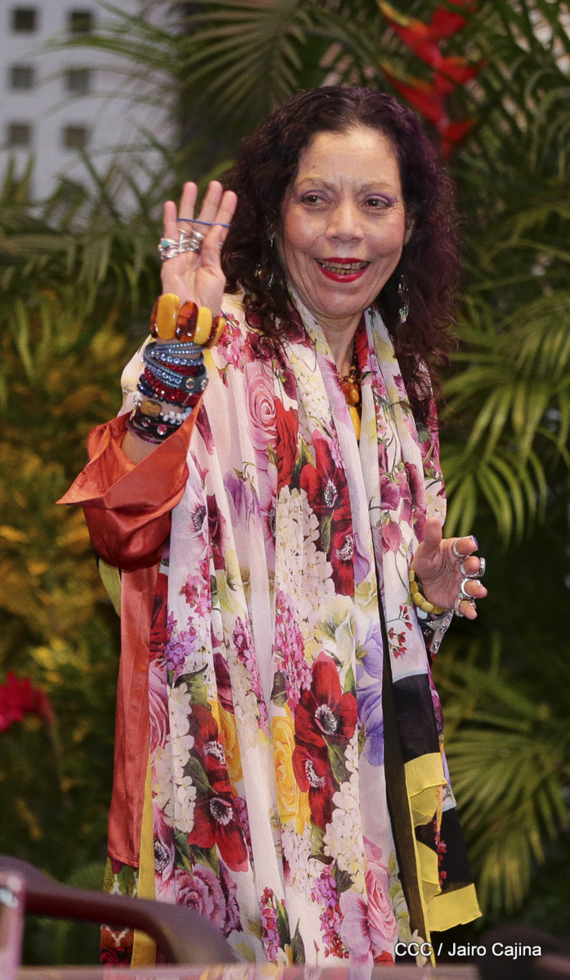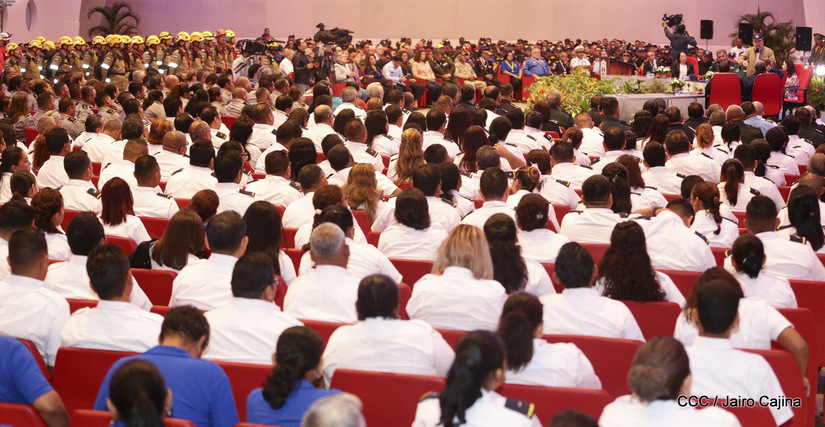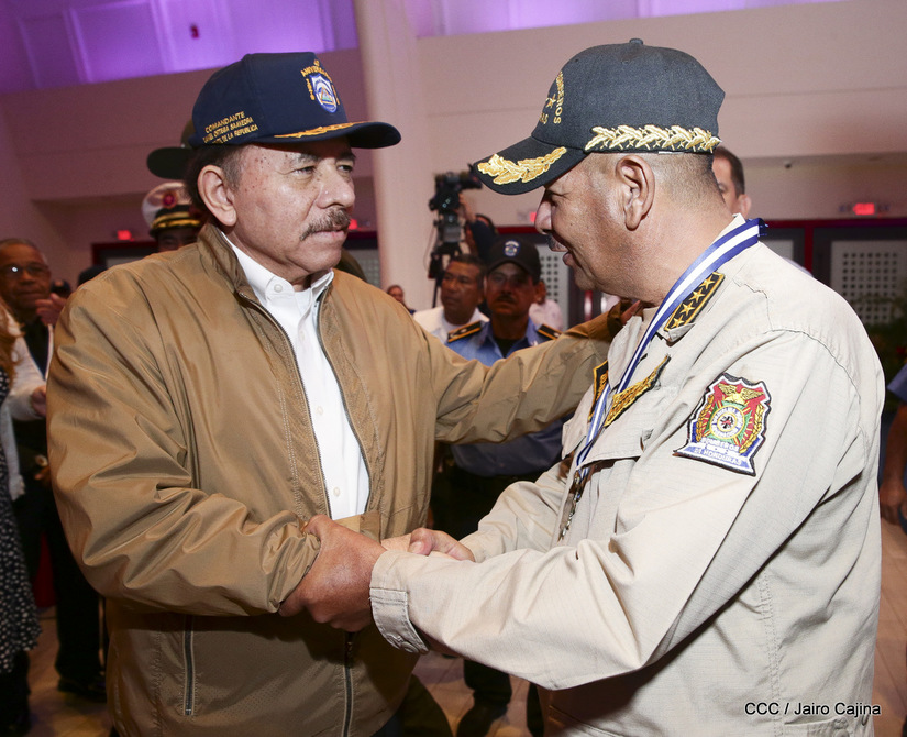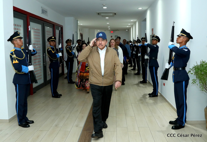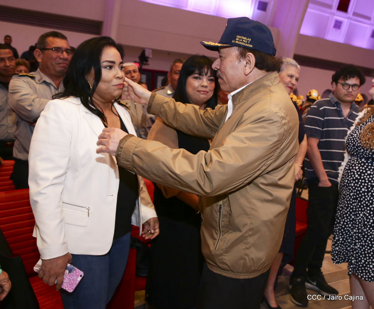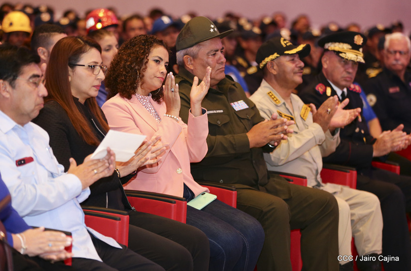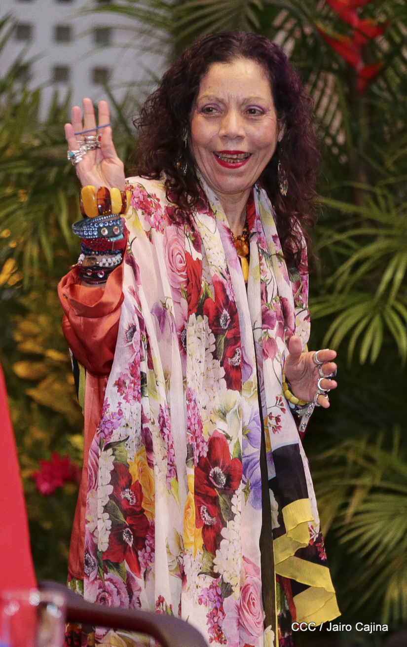 El presidente de la República, comandante Daniel Ortega y la vicepresidenta compañera Rosario Murillo, presiden el acto de 40 aniversario del Ministerio de Gobernación, junto a la compañera ministra María Amelia Coronel y compañera Rosa Adelina Barahona, ministra de Defensa.