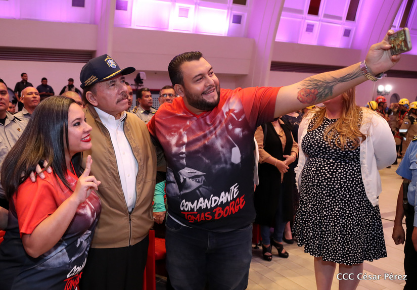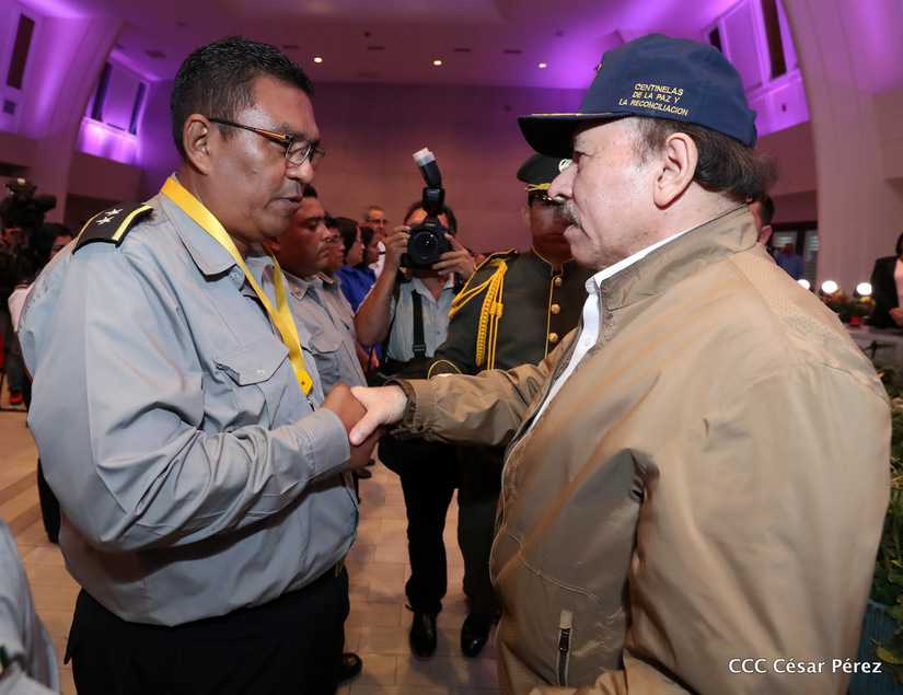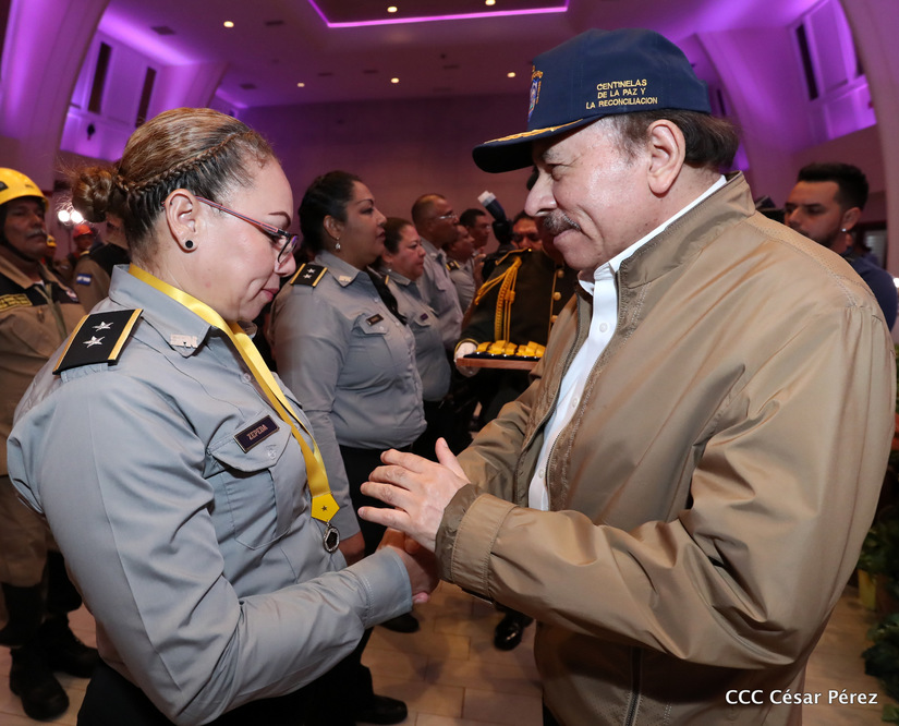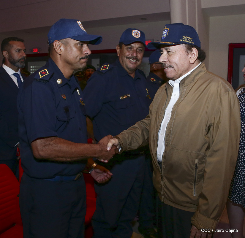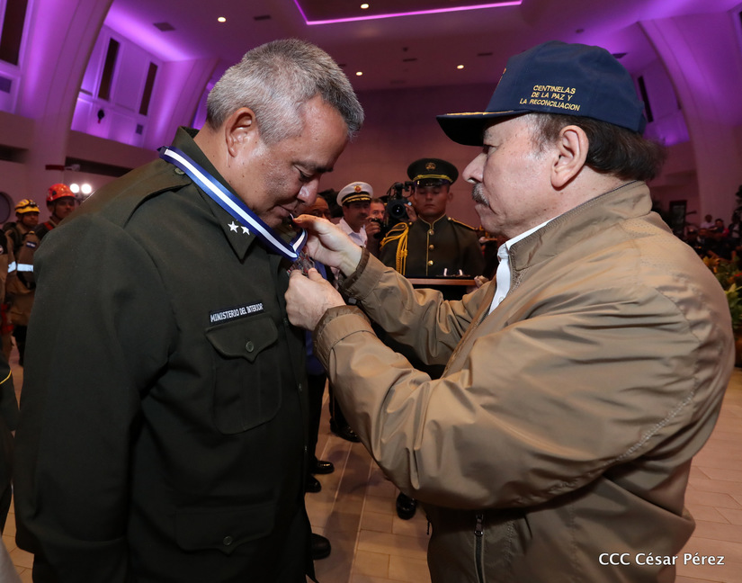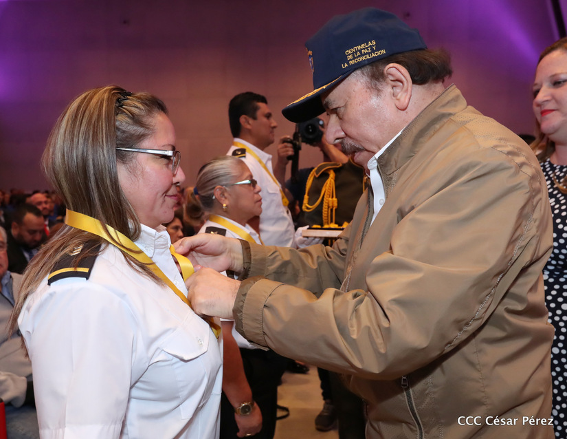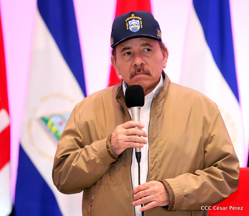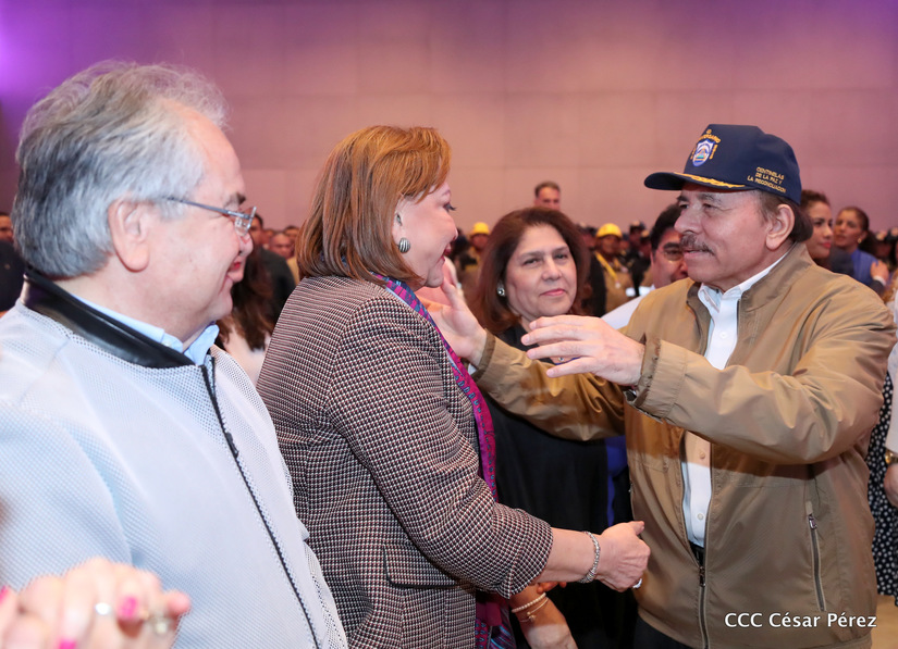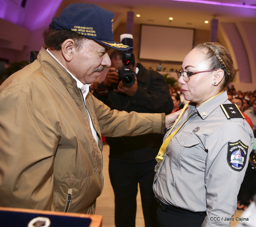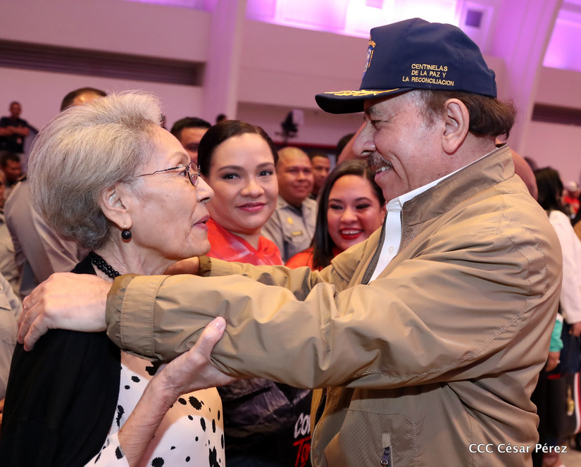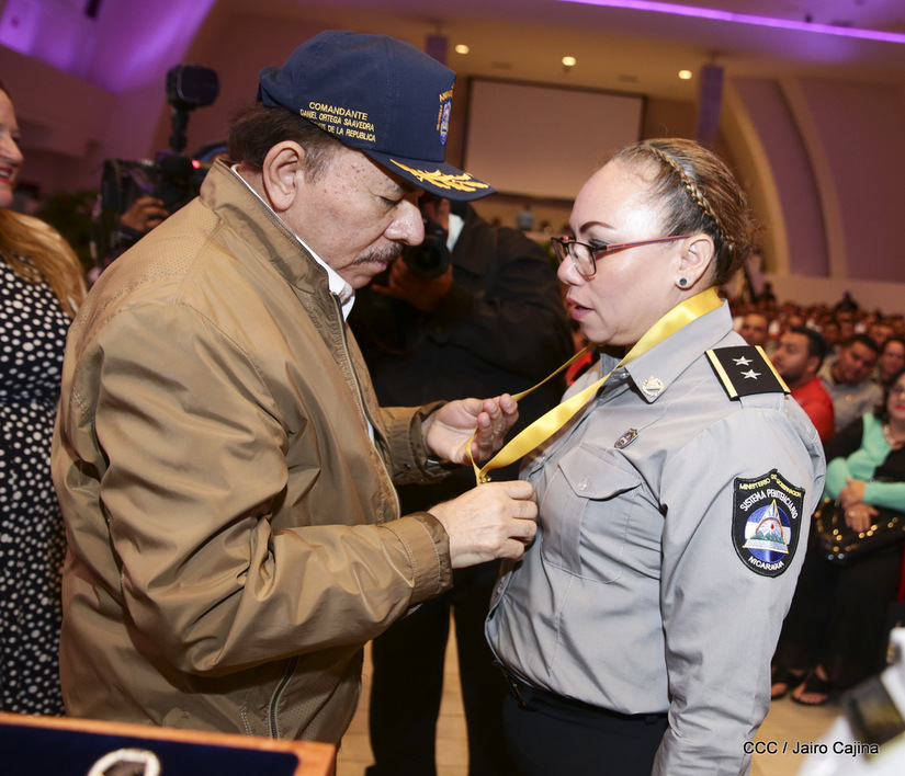 El presidente de la República, comandante Daniel Ortega y la vicepresidenta compañera Rosario Murillo, presiden el acto de 40 aniversario del Ministerio de Gobernación, junto a la compañera ministra María Amelia Coronel y compañera Rosa Adelina Barahona, ministra de Defensa.