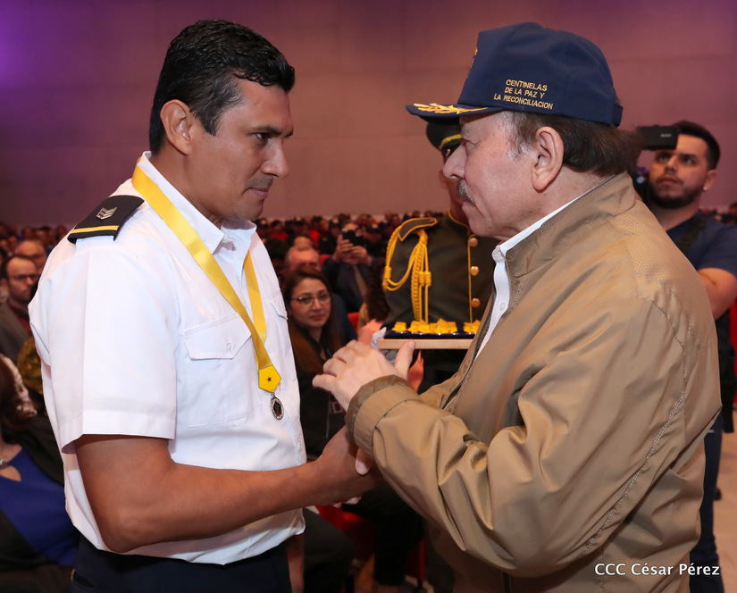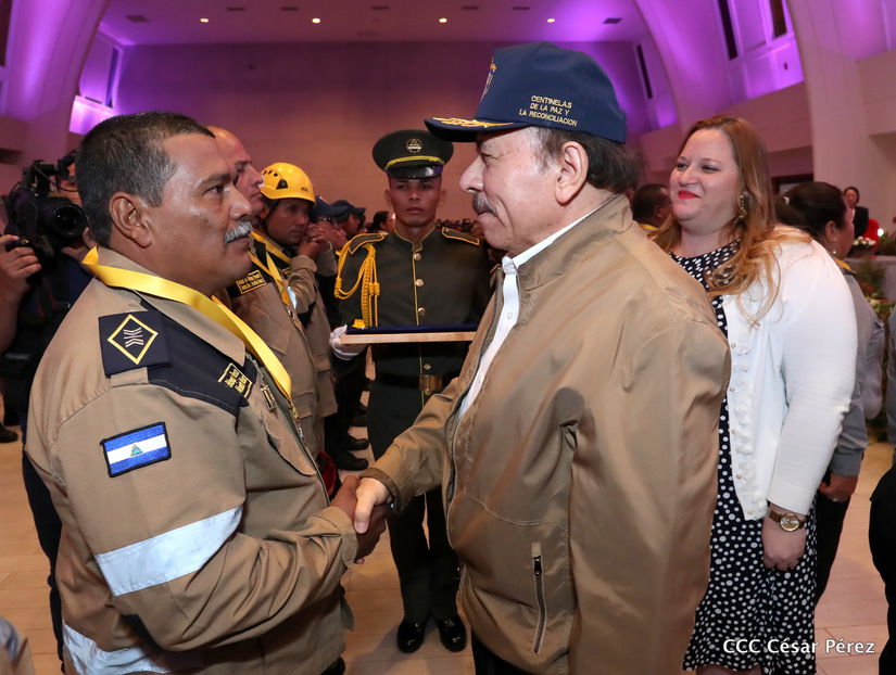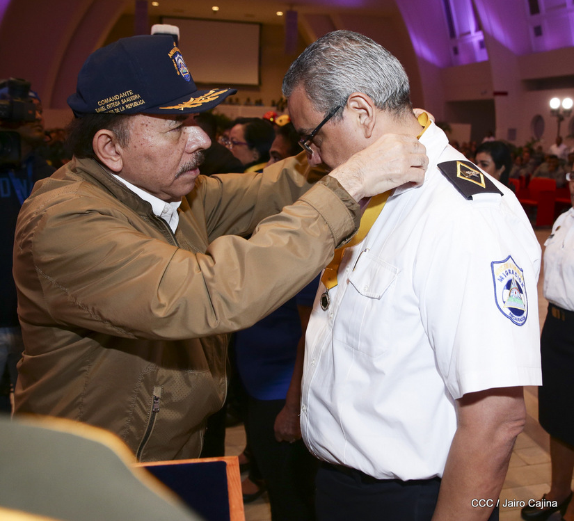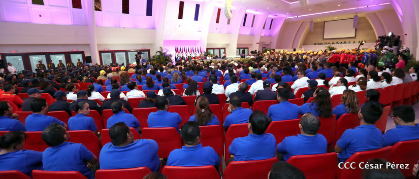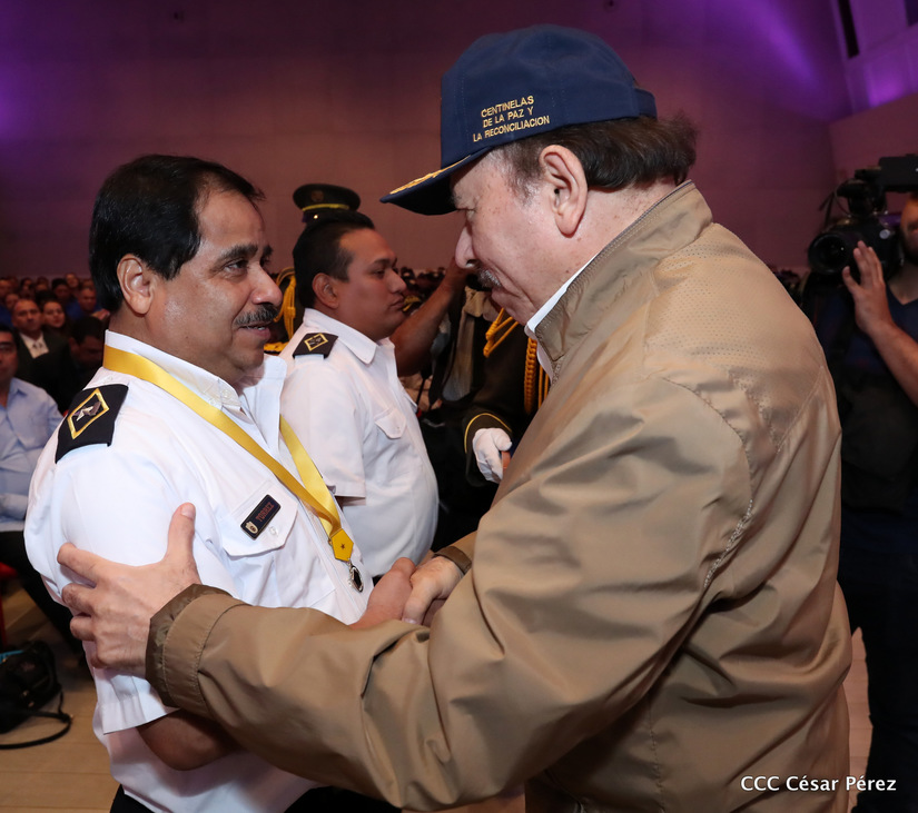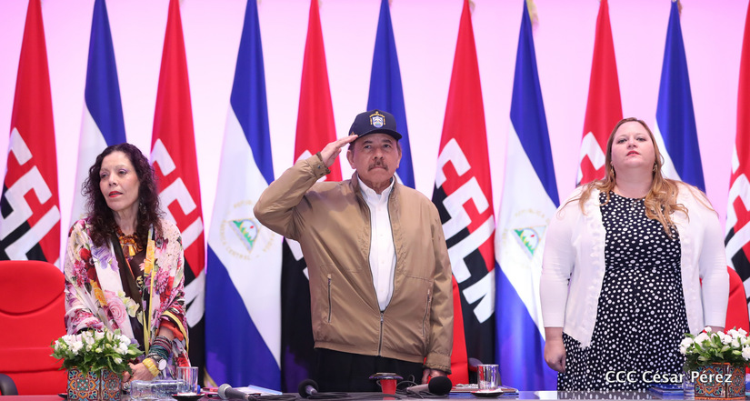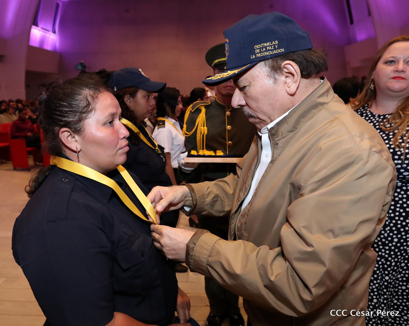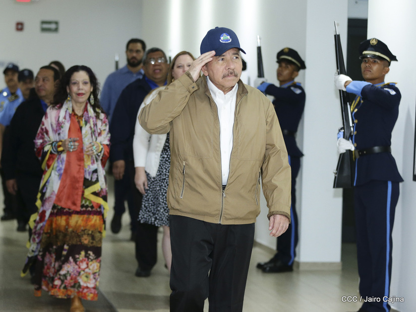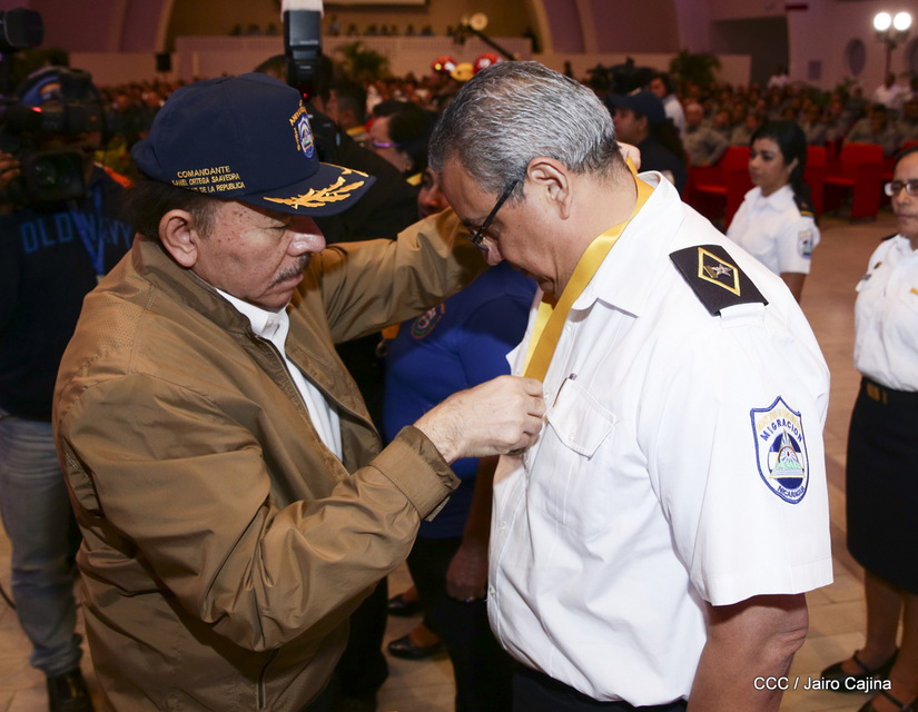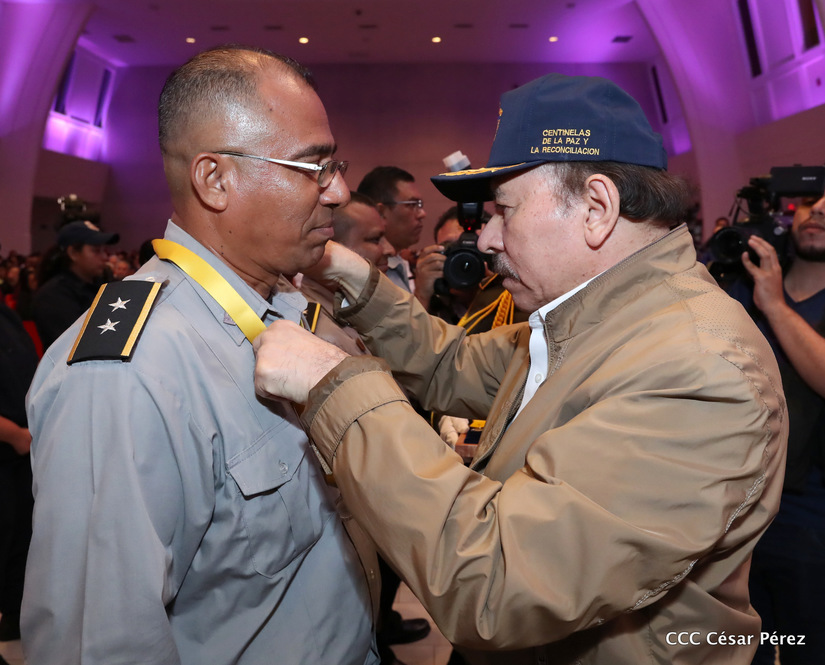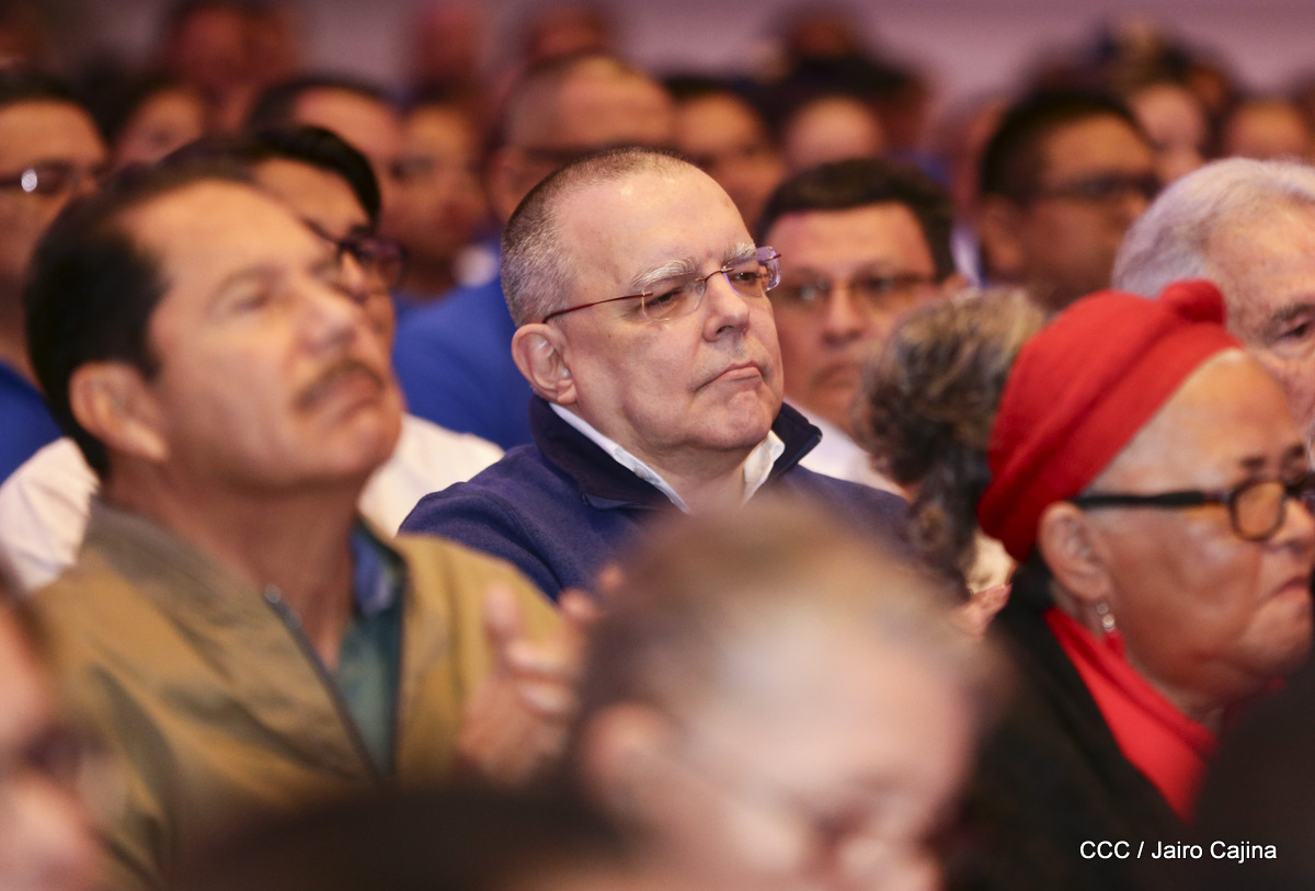 El presidente de la República, comandante Daniel Ortega y la vicepresidenta compañera Rosario Murillo, presiden el acto de 40 aniversario del Ministerio de Gobernación, junto a la compañera ministra María Amelia Coronel y compañera Rosa Adelina Barahona, ministra de Defensa.