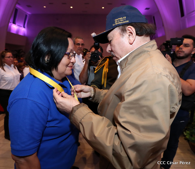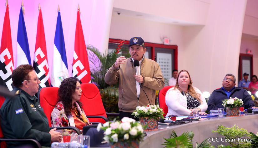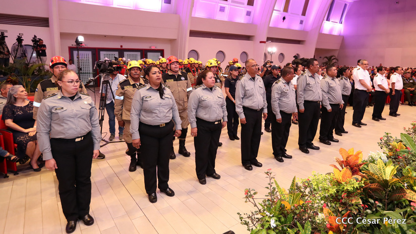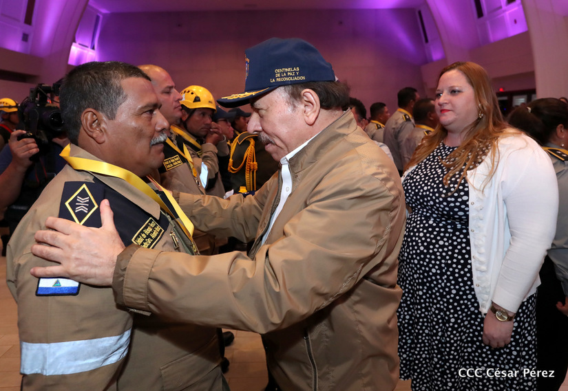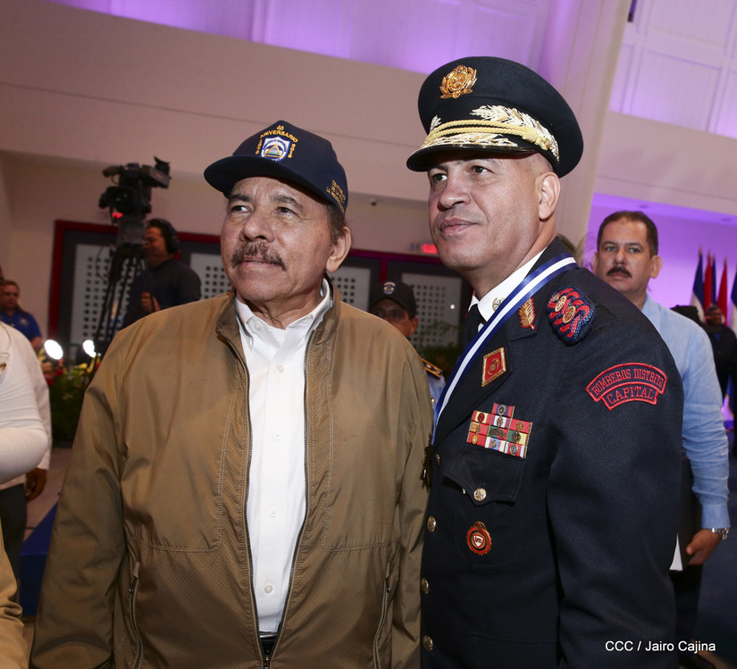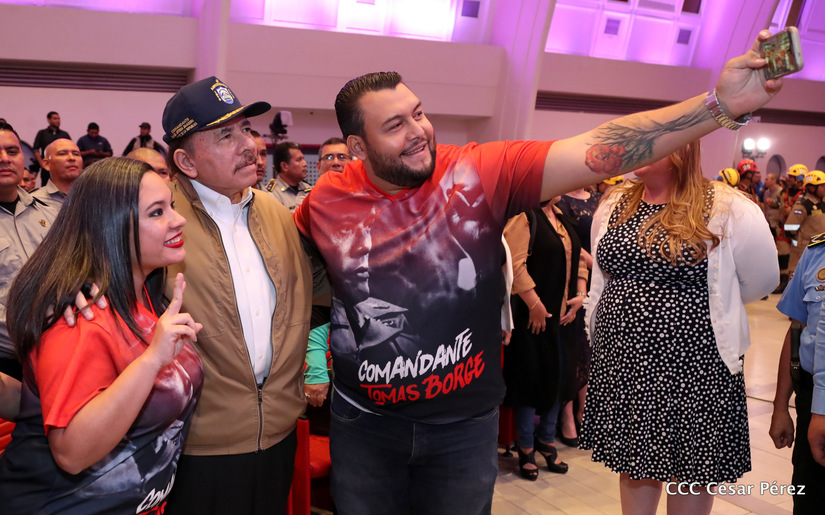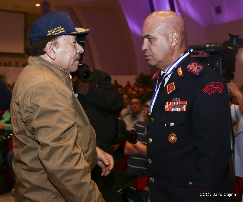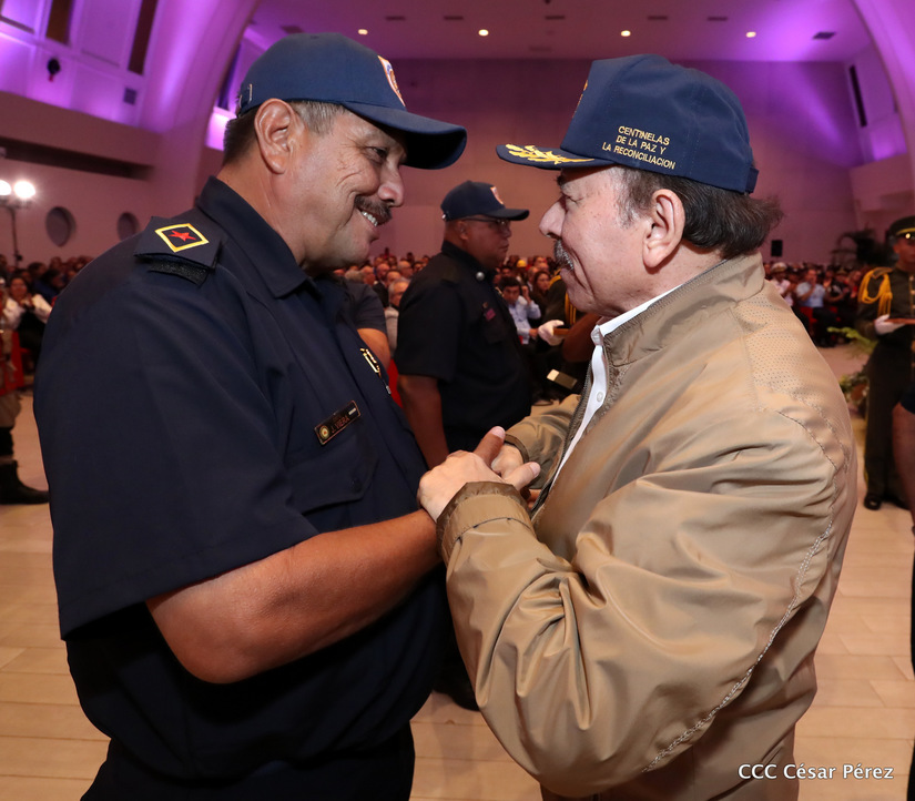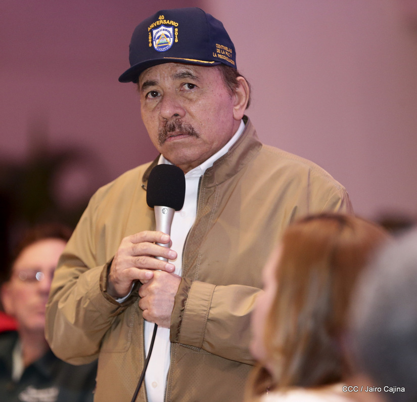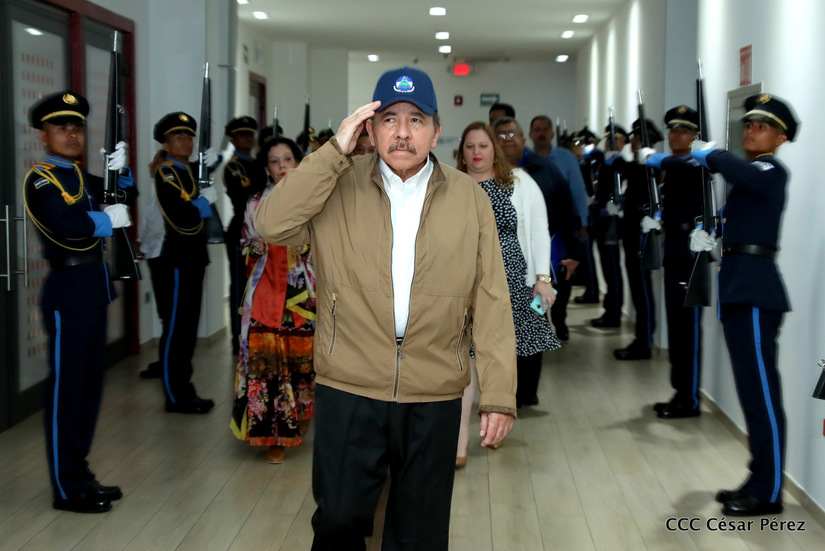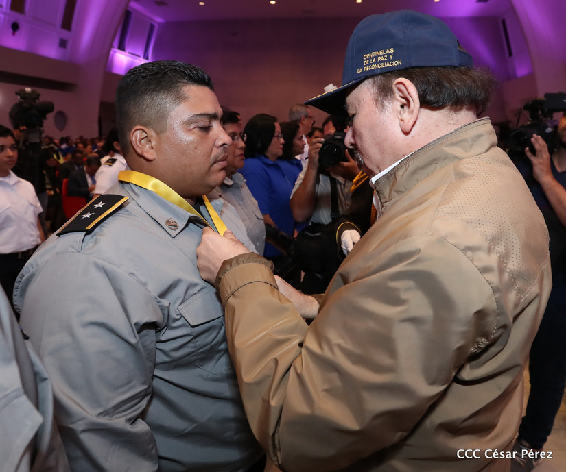 El presidente de la República, comandante Daniel Ortega y la vicepresidenta compañera Rosario Murillo, presiden el acto de 40 aniversario del Ministerio de Gobernación, junto a la compañera ministra María Amelia Coronel y compañera Rosa Adelina Barahona, ministra de Defensa.