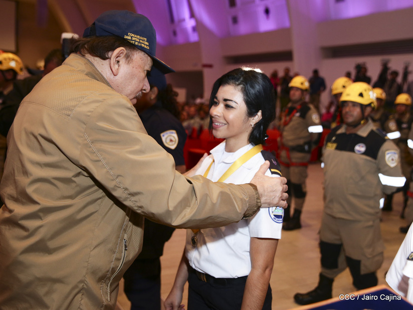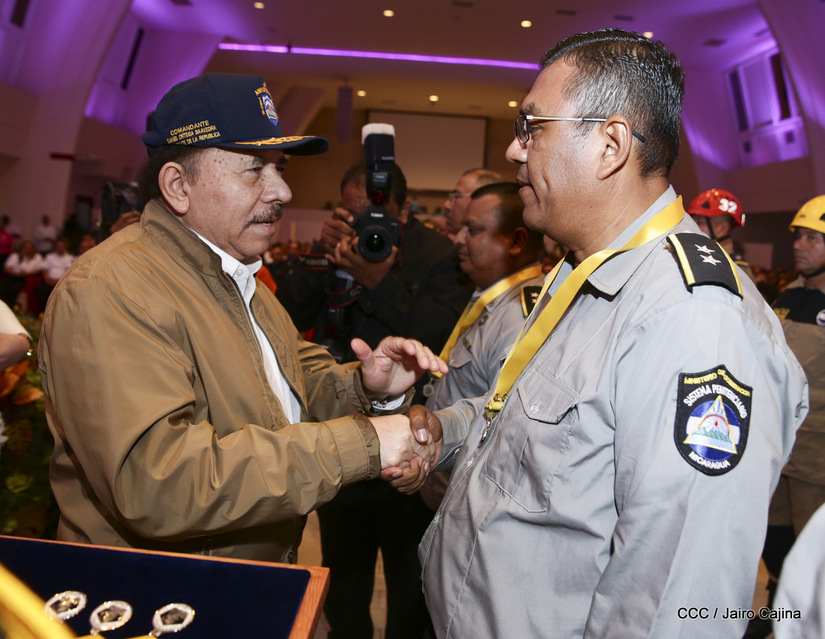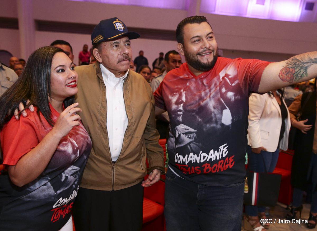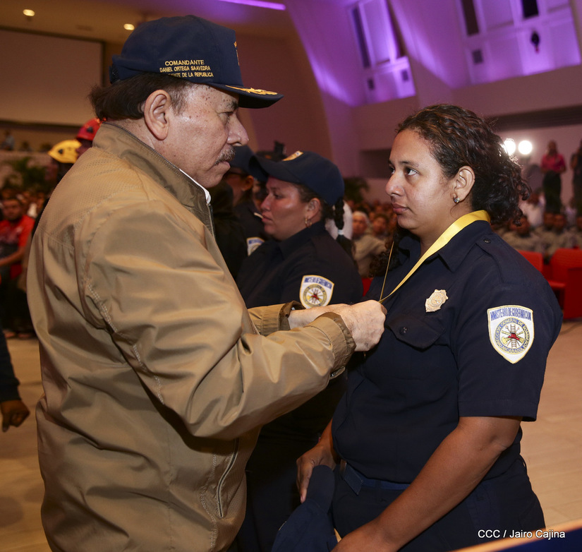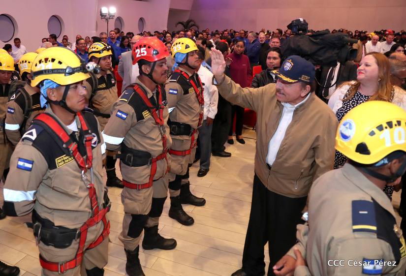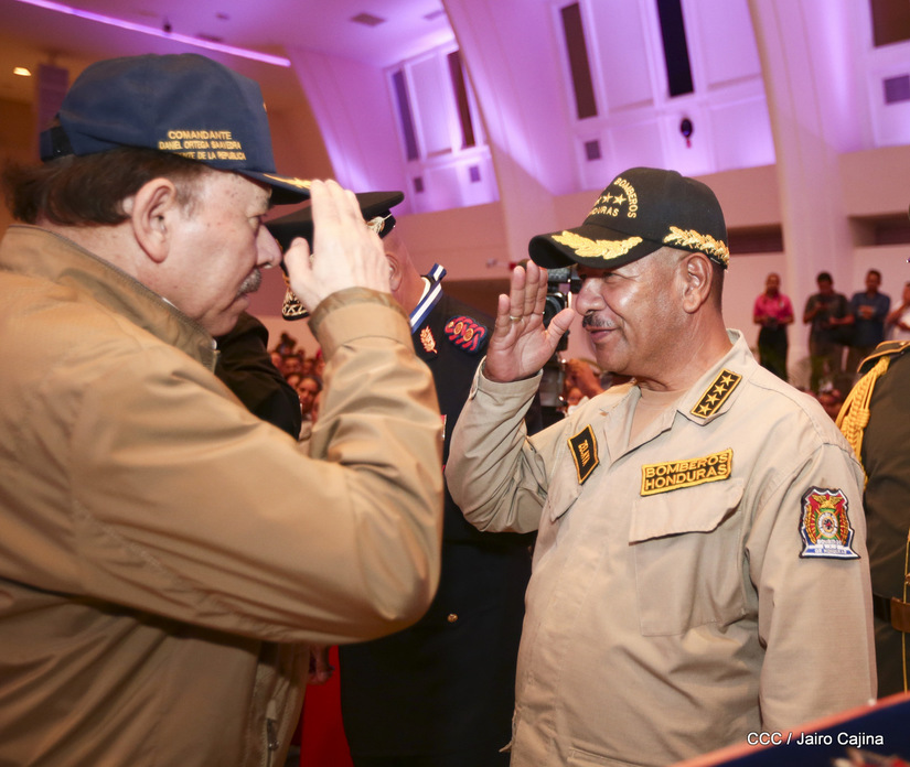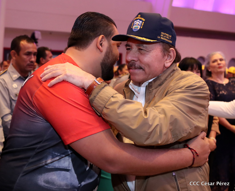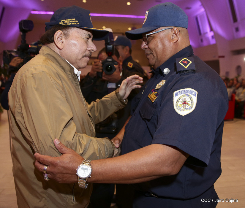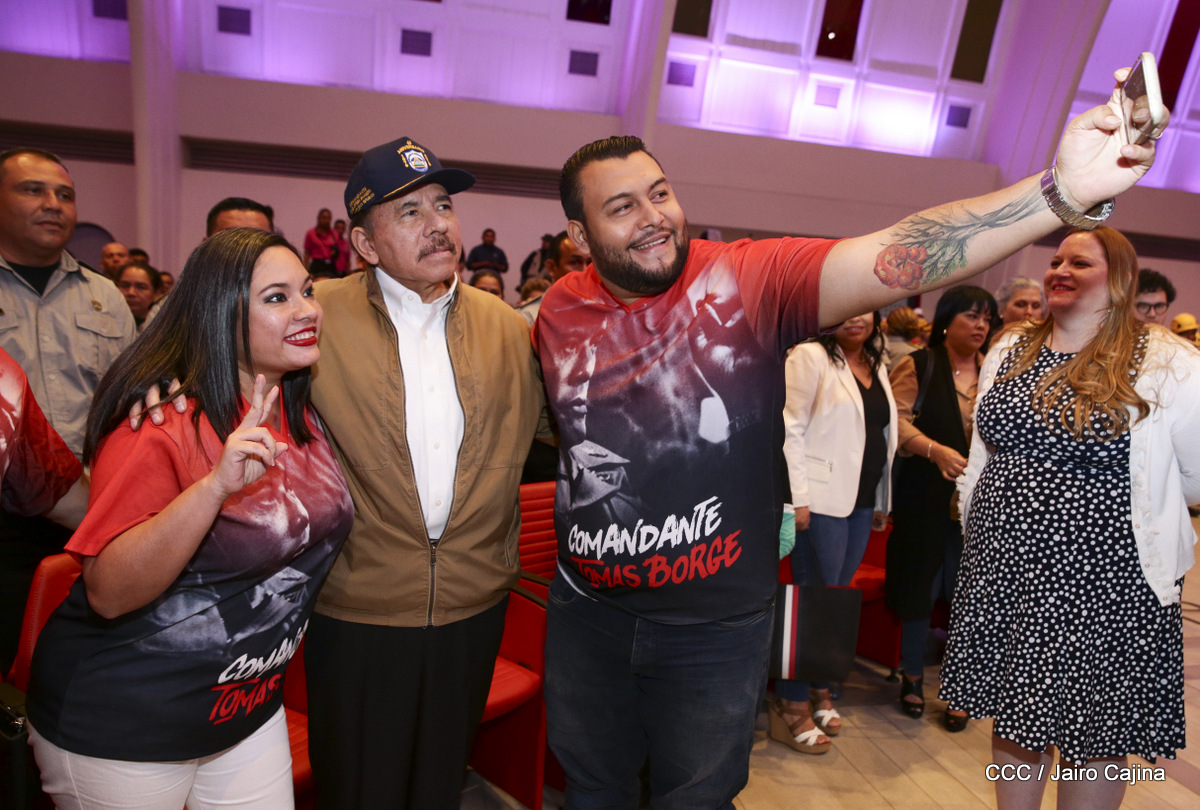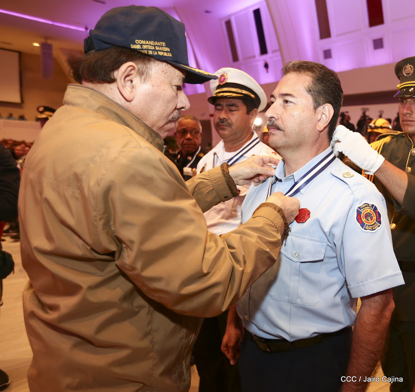 El presidente de la República, comandante Daniel Ortega y la vicepresidenta compañera Rosario Murillo, presiden el acto de 40 aniversario del Ministerio de Gobernación, junto a la compañera ministra María Amelia Coronel y compañera Rosa Adelina Barahona, ministra de Defensa.