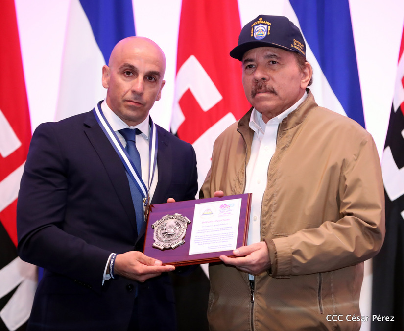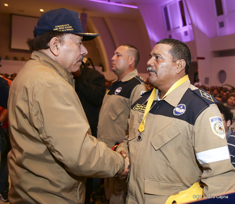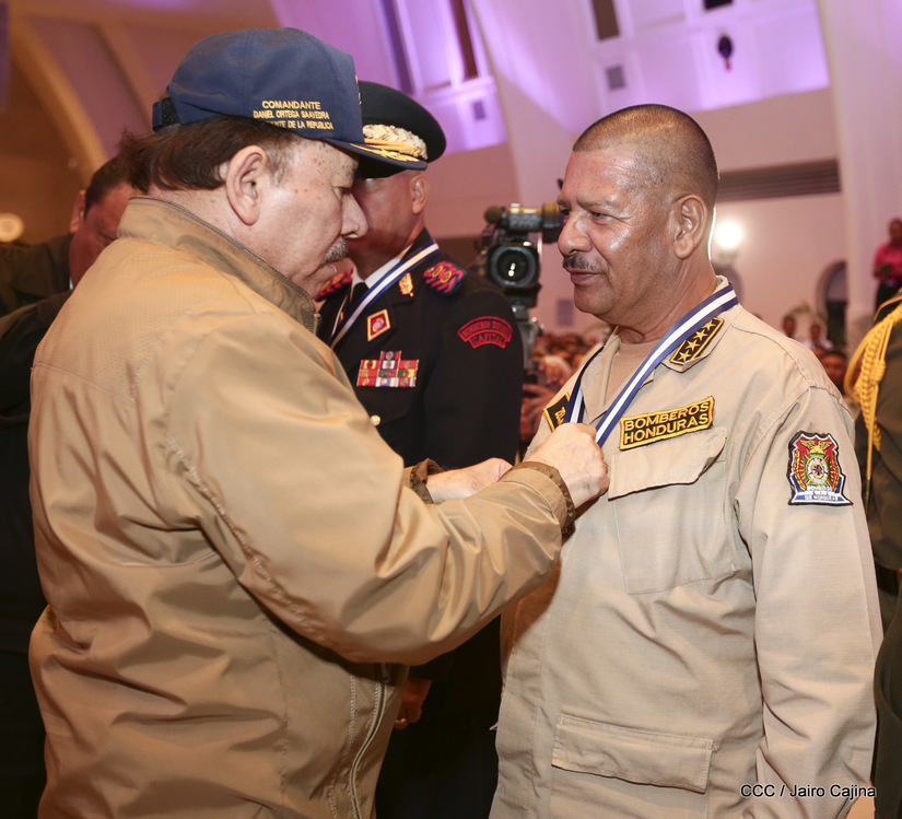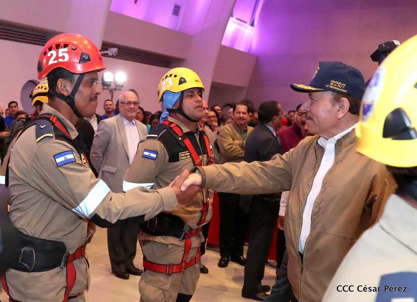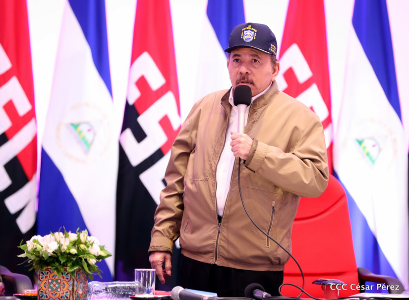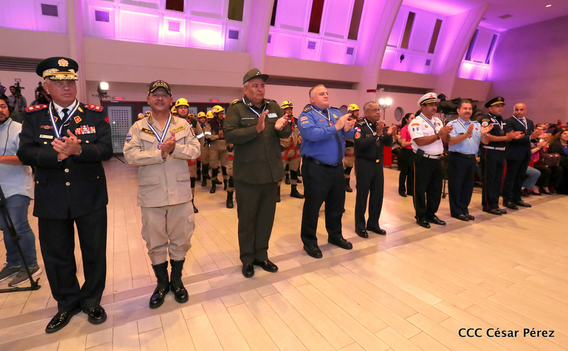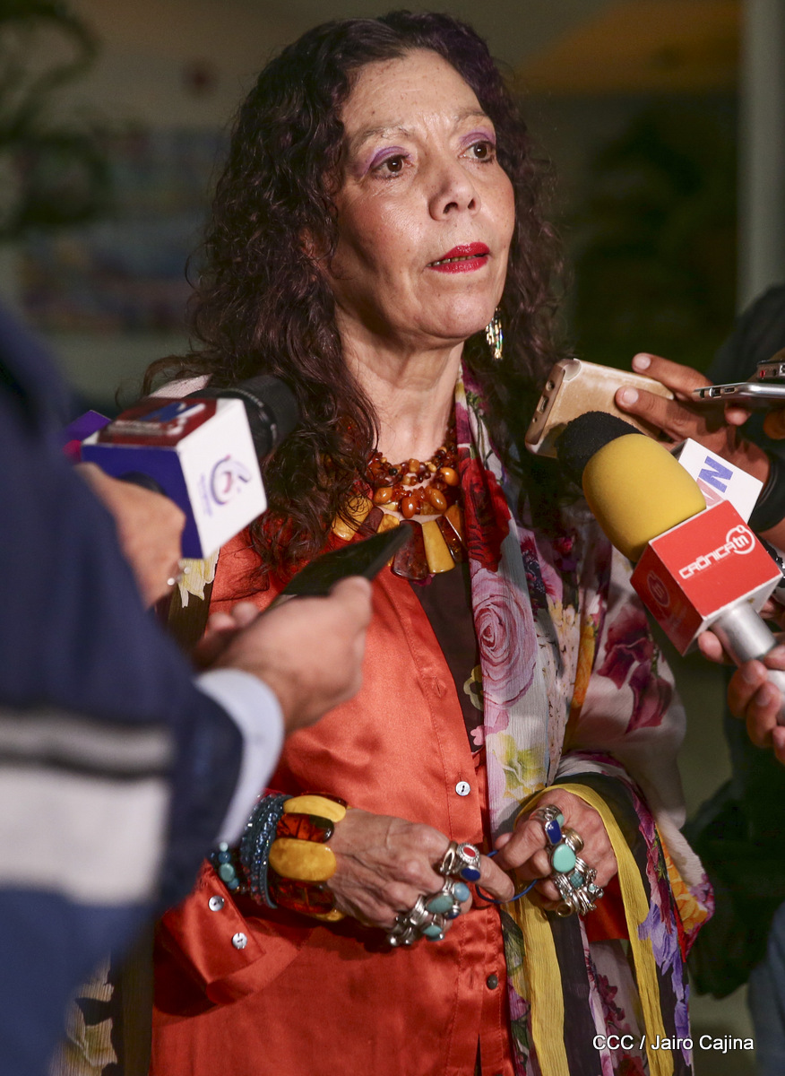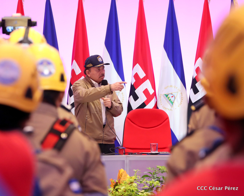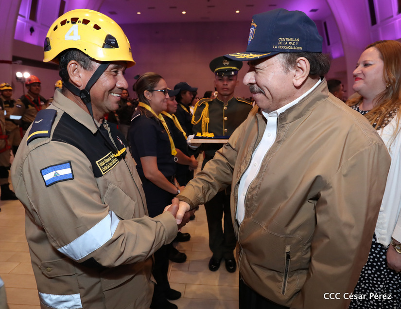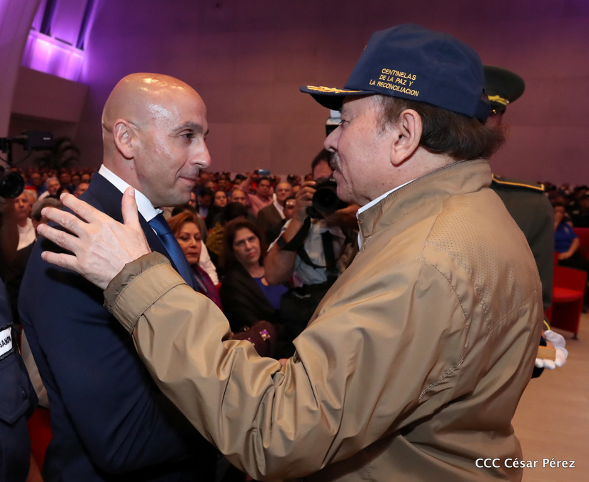 El presidente de la República, comandante Daniel Ortega y la vicepresidenta compañera Rosario Murillo, presiden el acto de 40 aniversario del Ministerio de Gobernación, junto a la compañera ministra María Amelia Coronel y compañera Rosa Adelina Barahona, ministra de Defensa.