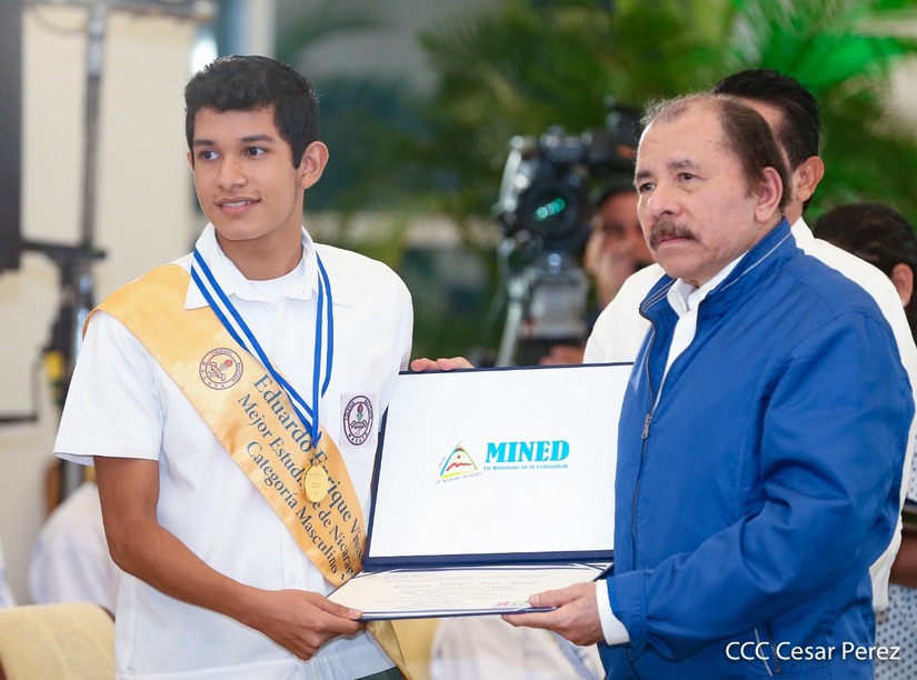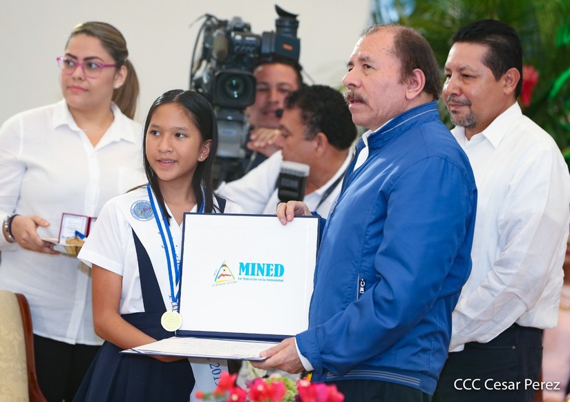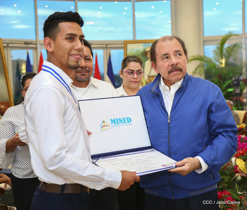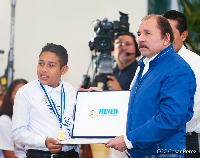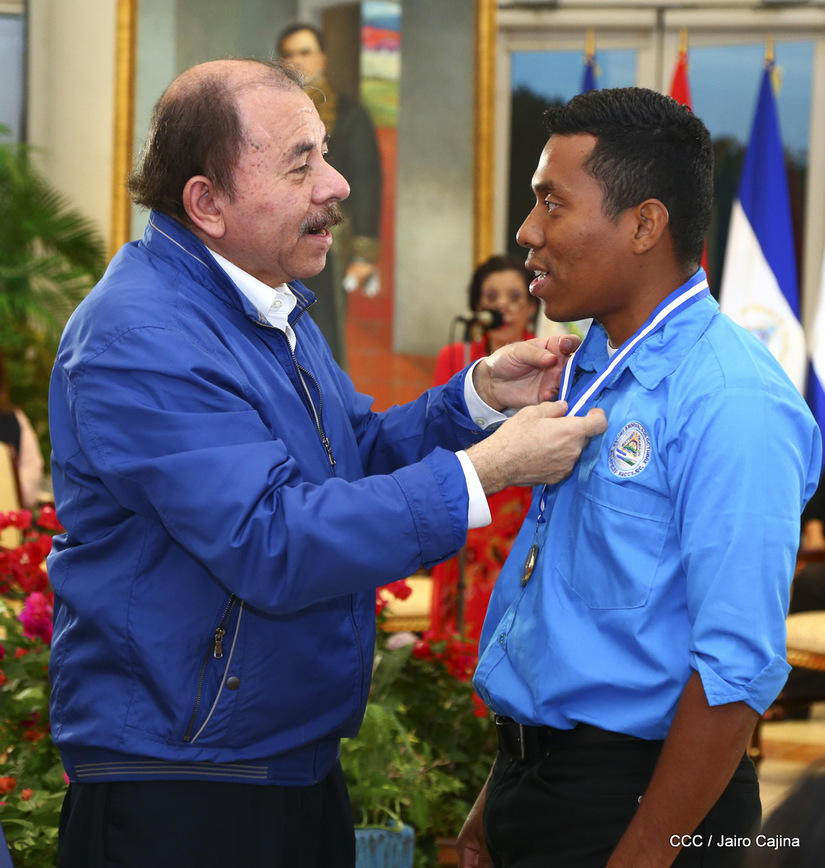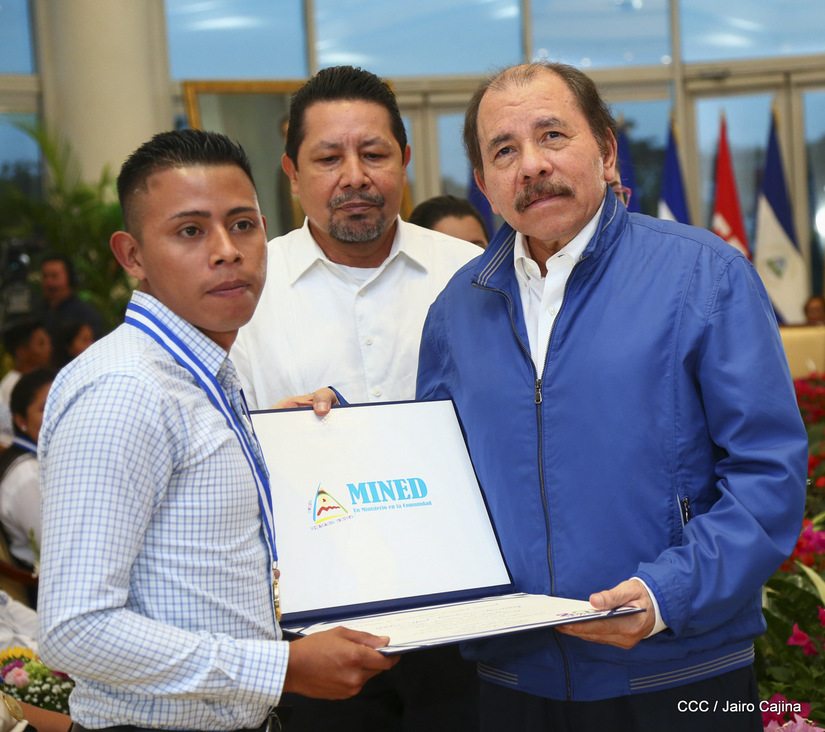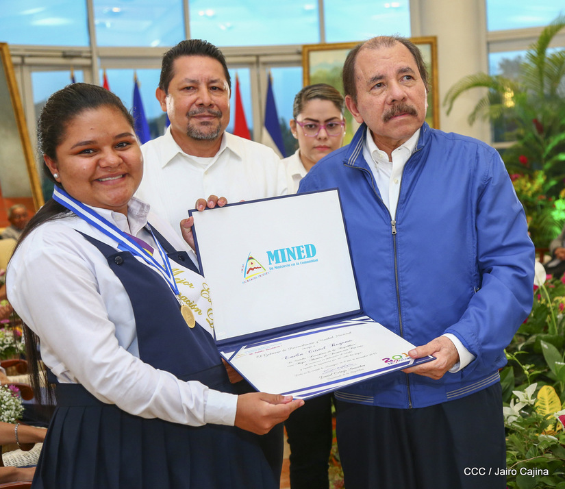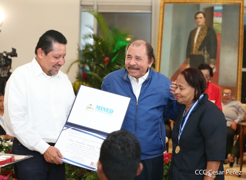 El presidente Daniel Ortega y la compañera vicepresidenta Rosario Murillo entregan la Orden de la Independencia Cultural Rubén Darío a los mejores docentes de Nicaragua, en reconocimiento a su destacada vocación de servicio. Asimismo recibieron medalla de Excelencia al mérito los mejores estudiantes 2019.