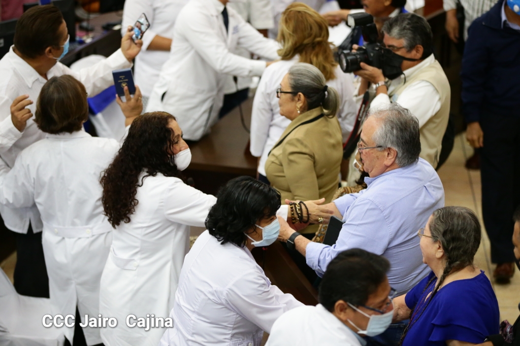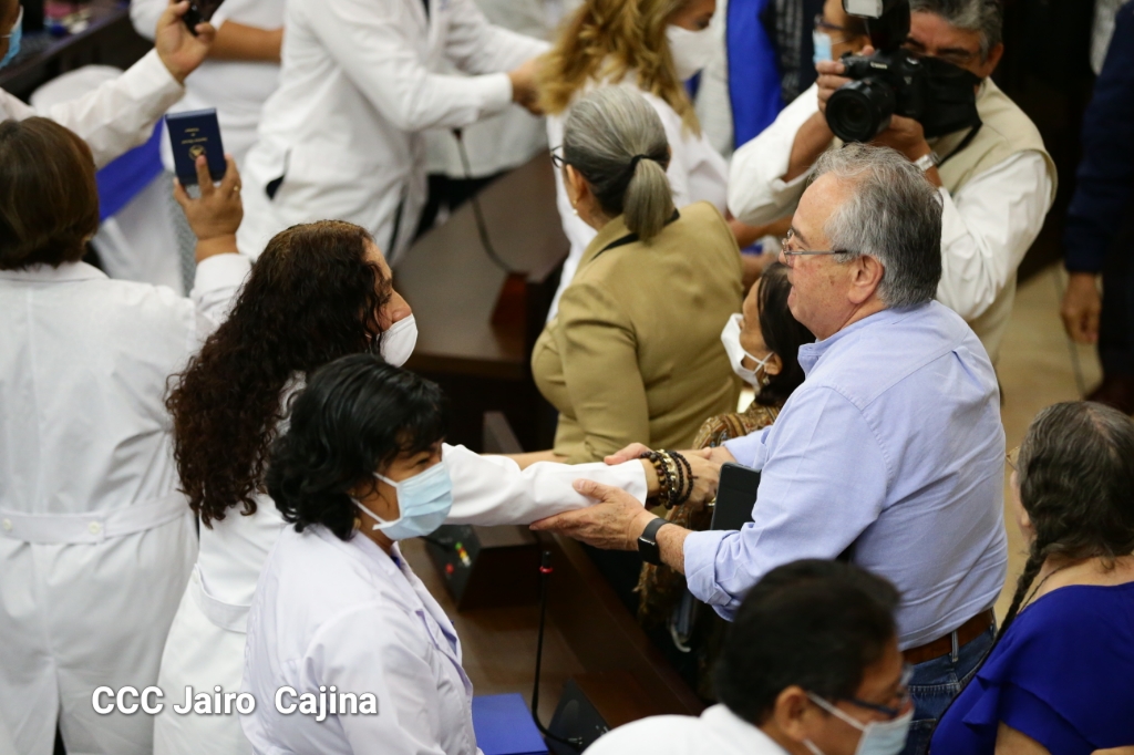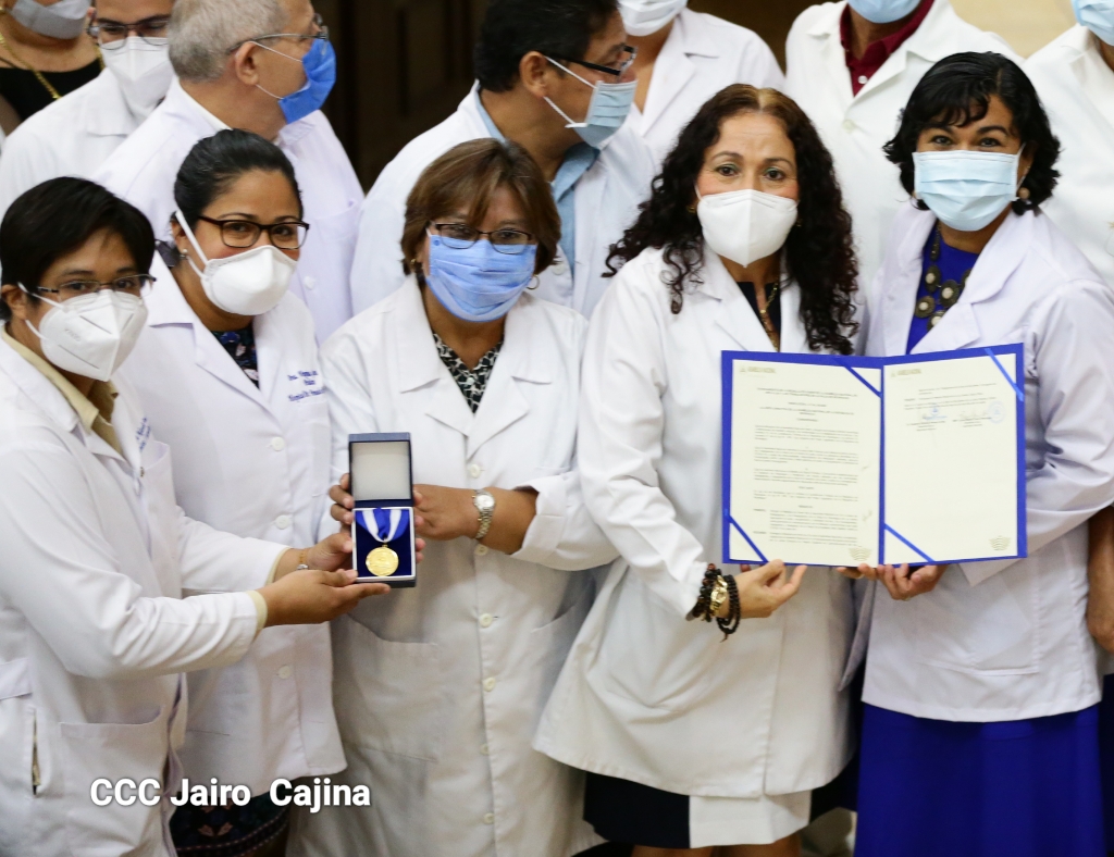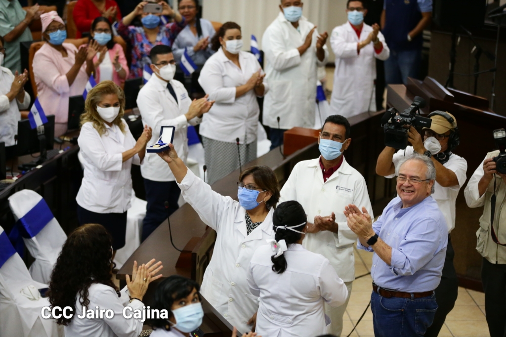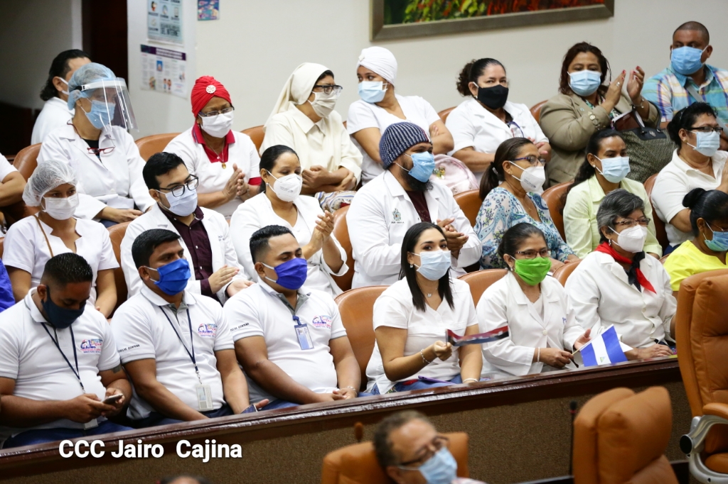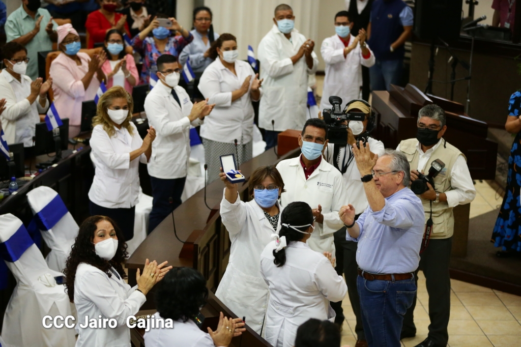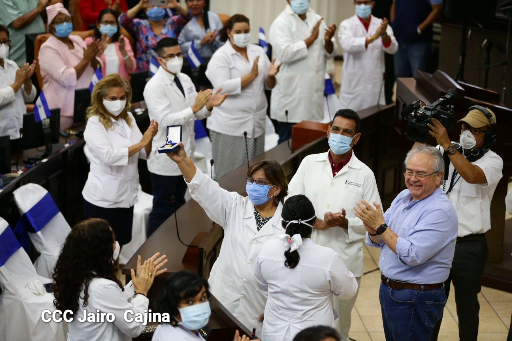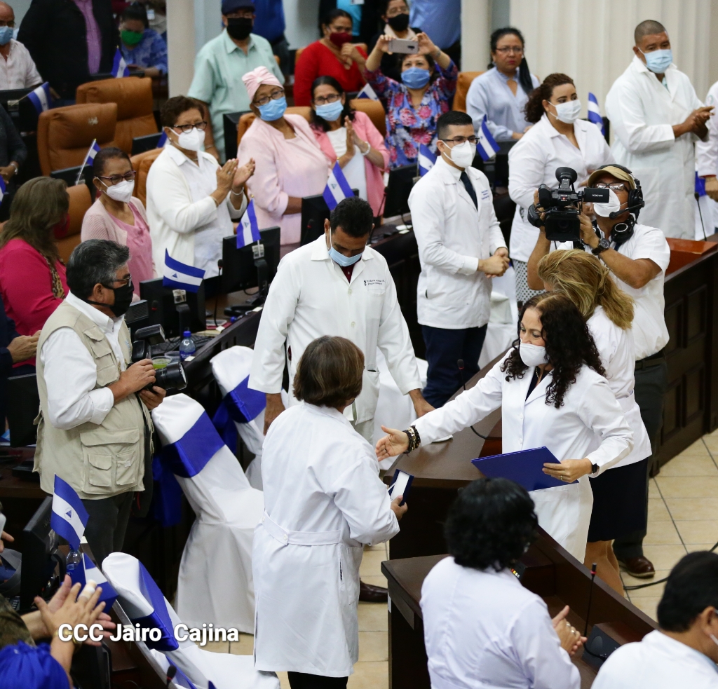 La Asamblea Nacional reconoce la ardua labor heroica que realiza el gremio de las y los trabajadores de la salud en el frente de la lucha contra la pandemia decretada del covid-19 y todas las enfermedades respondiendo con dedicación, esfuerzo, atención humanizada, cariño, compromiso y labor patriótica al cuido, recuperación y bienestar de todo el pueblo nicaragüense. Este reconocimiento fue entregado por la Junta Directiva y diputados en el marco del Día Nacional de las y los Trabajadores de la Salud, este 8 de agosto.