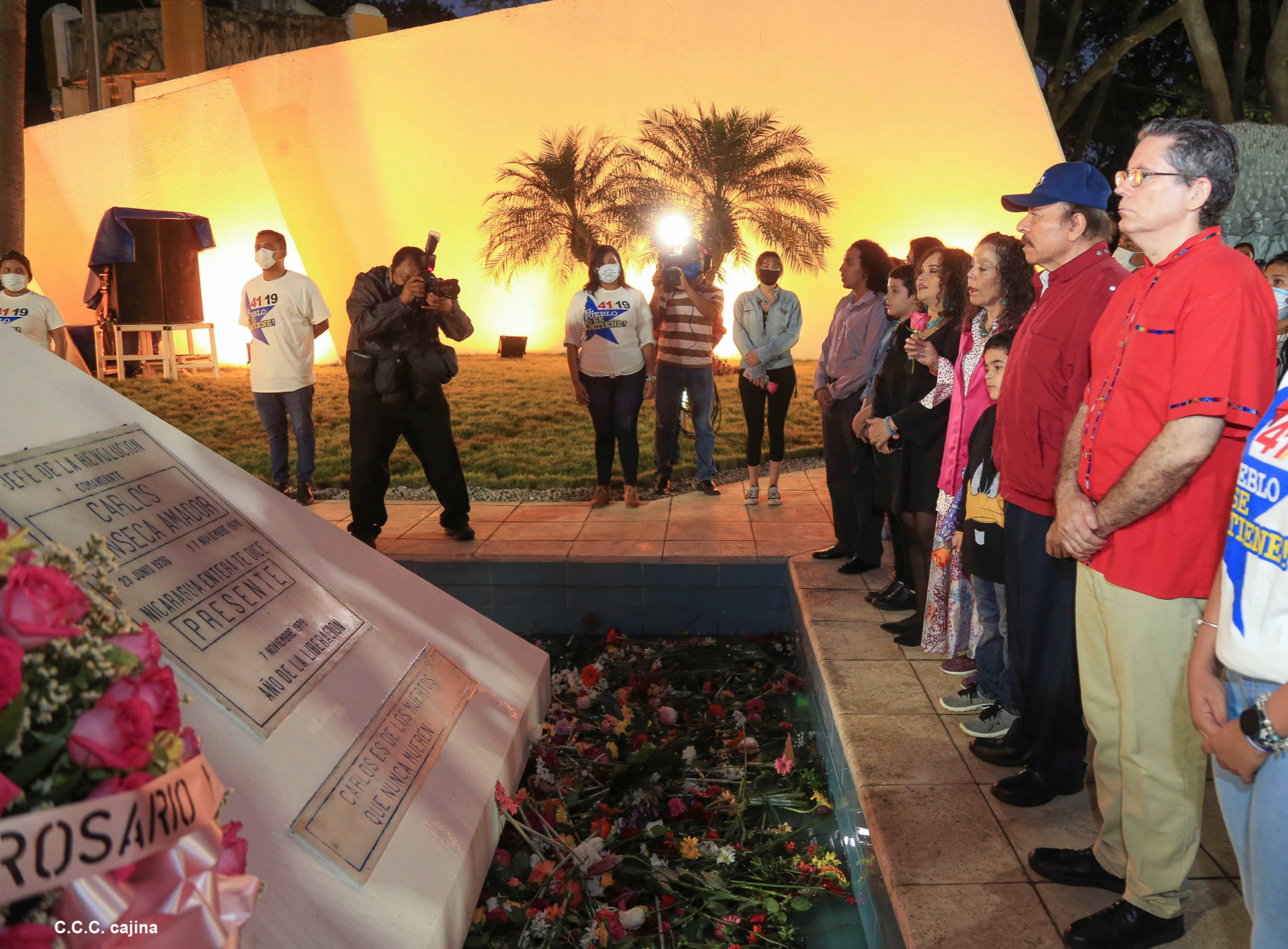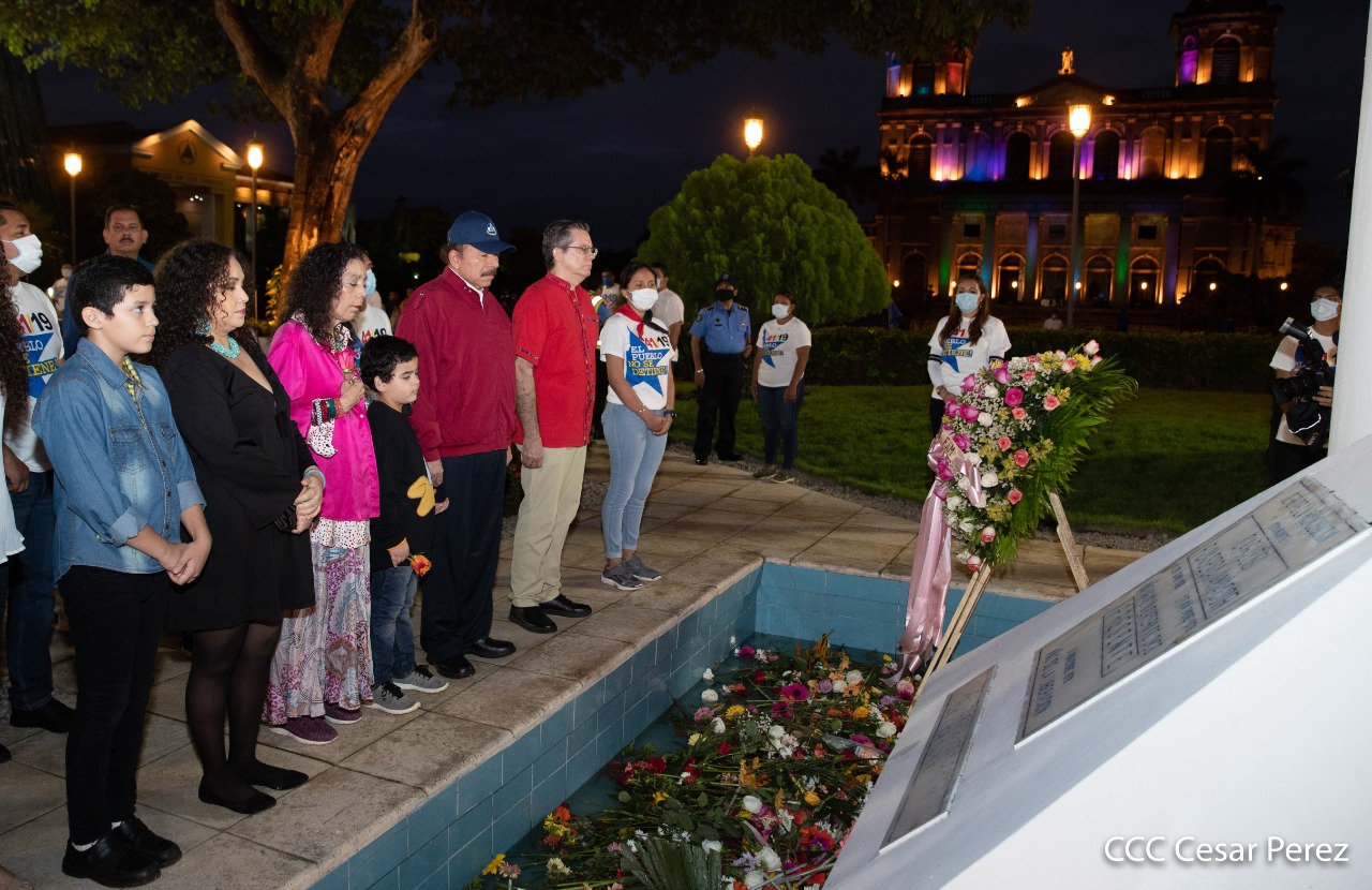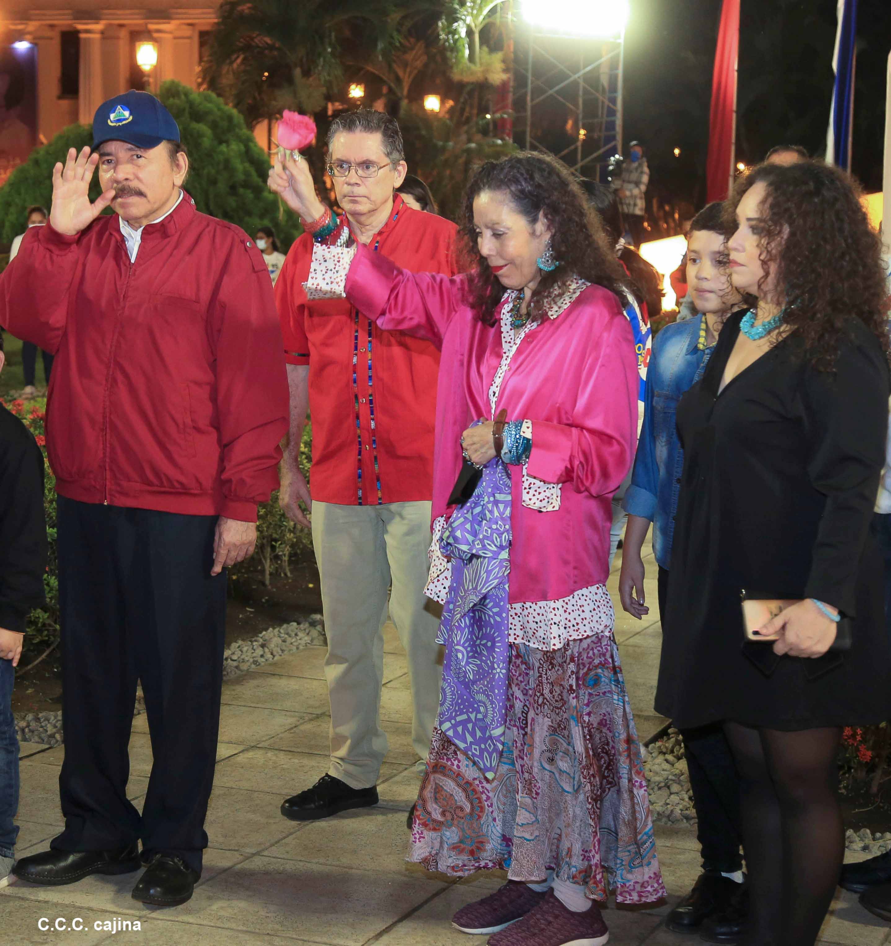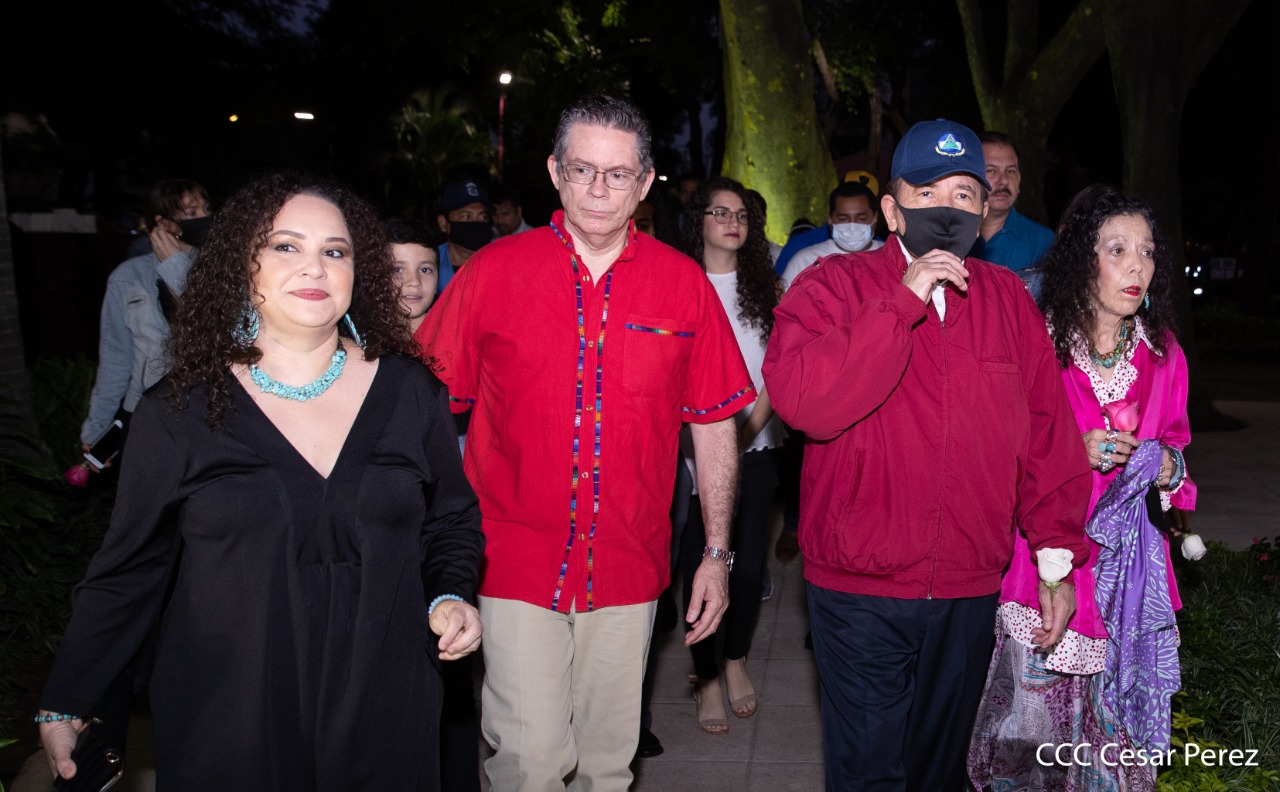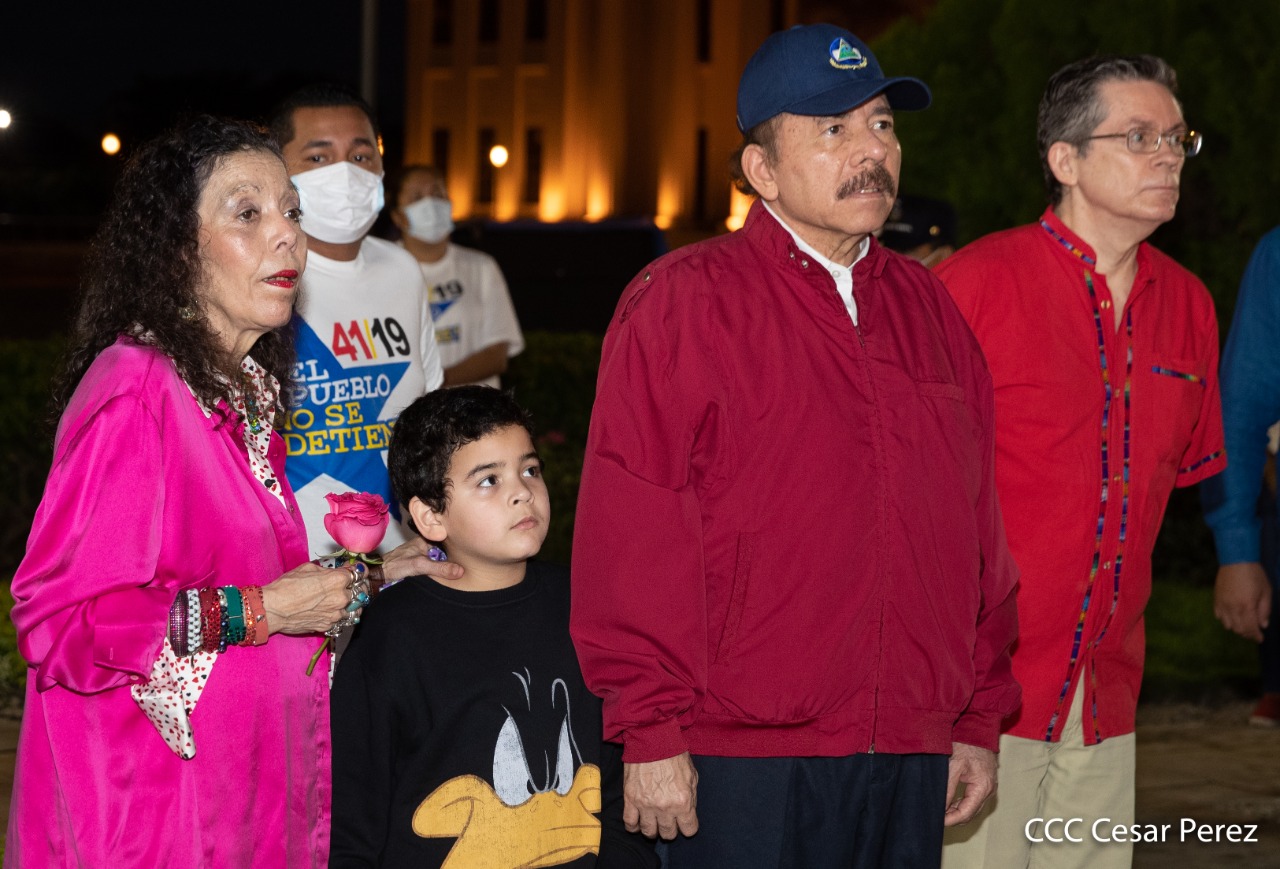 El Presidente de Nicaragua, Comandante Daniel Ortega y la compañera Rosario Murillo presiden el acto de conmemoración del 44 aniversario del paso a la inmortalidad del Comandante Carlos Fonseca Amador, desde el mausoleo en la plaza de la Revolución en Managua.