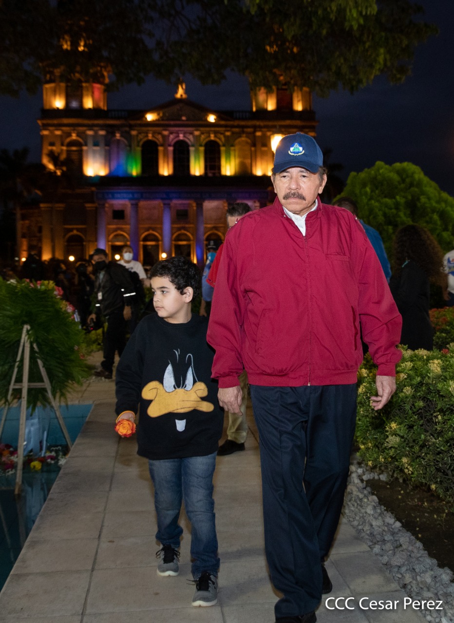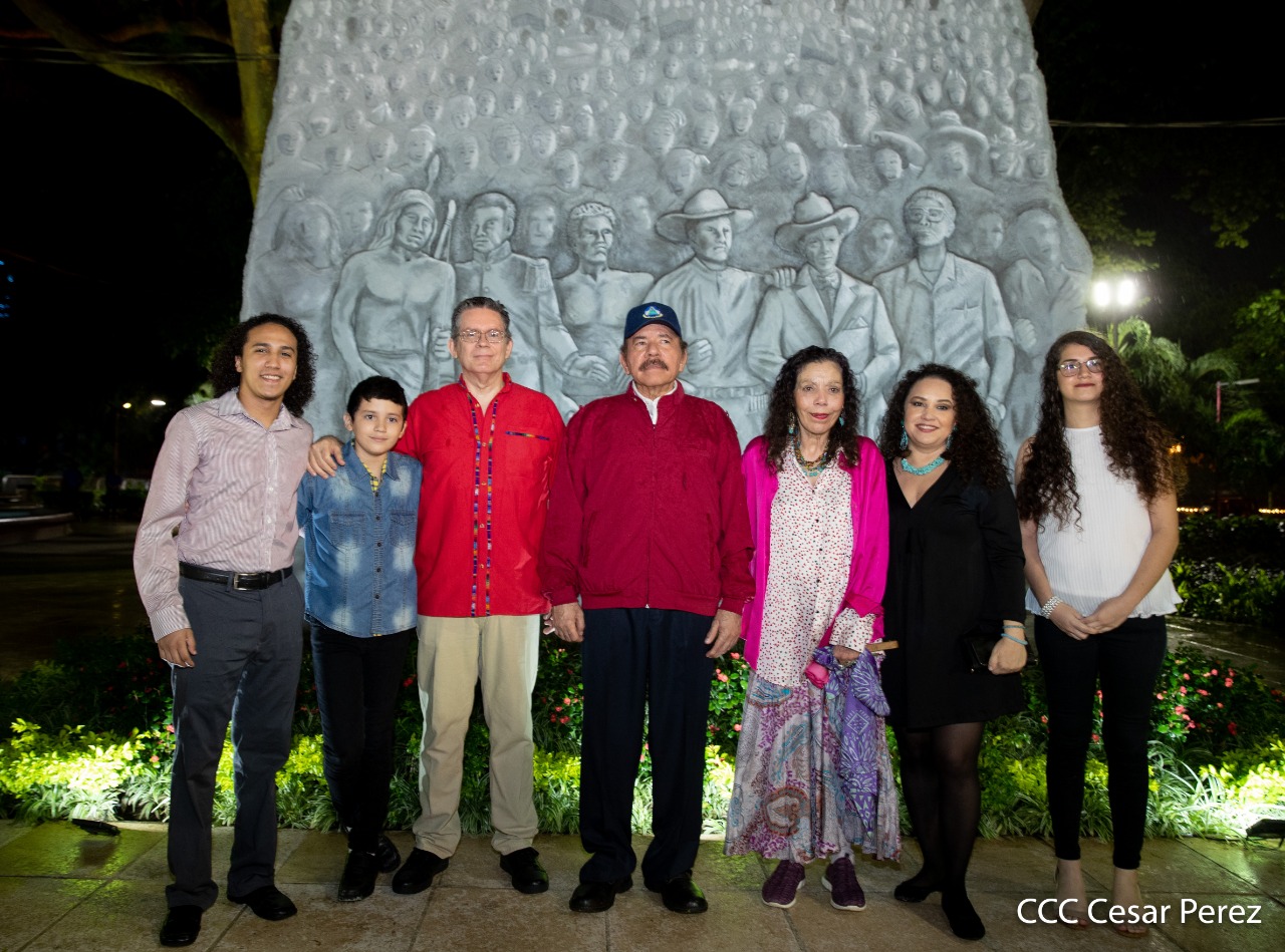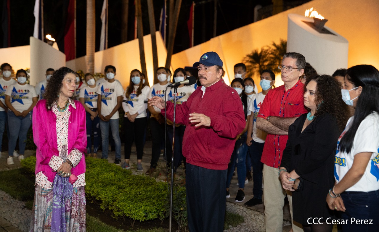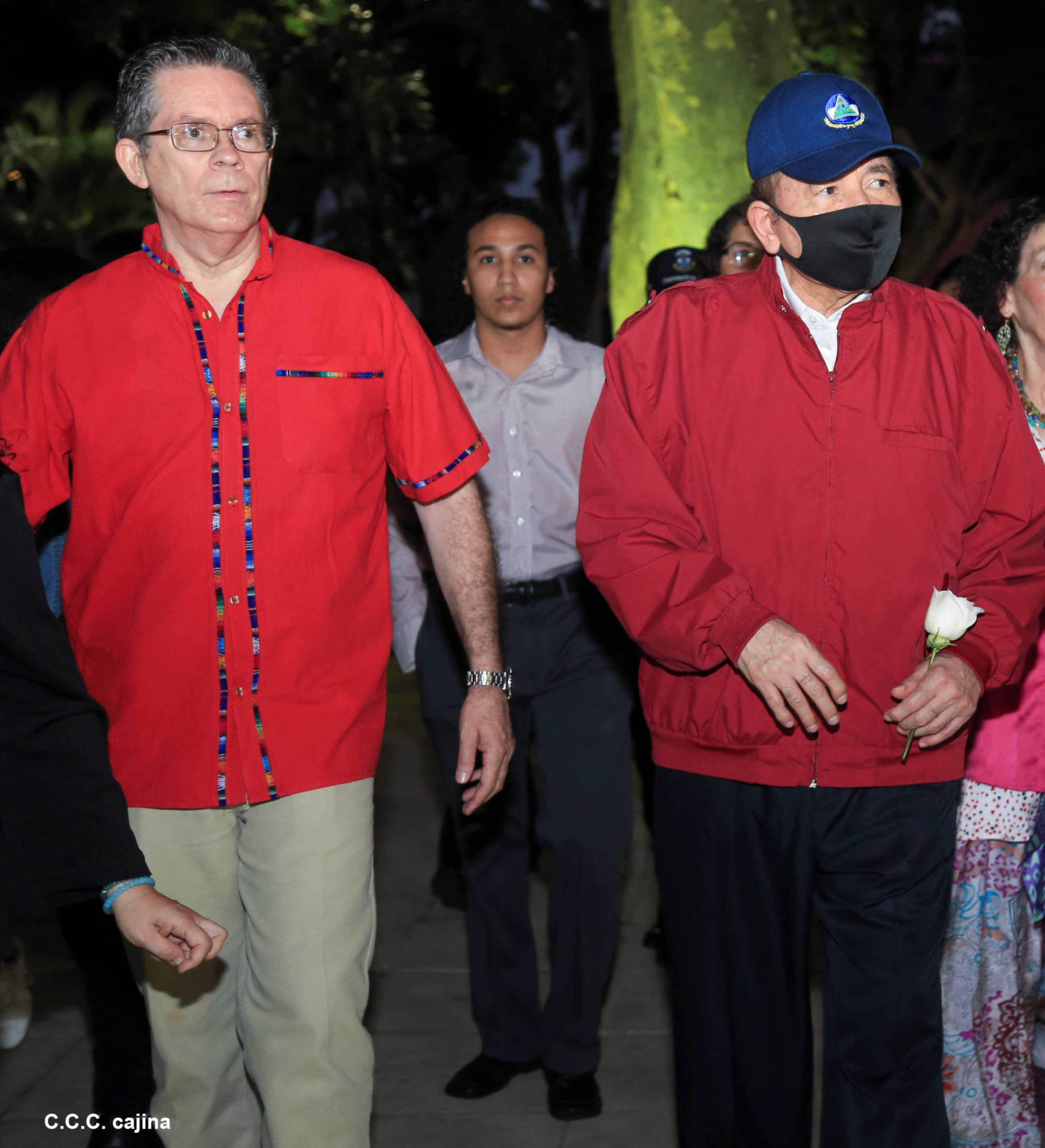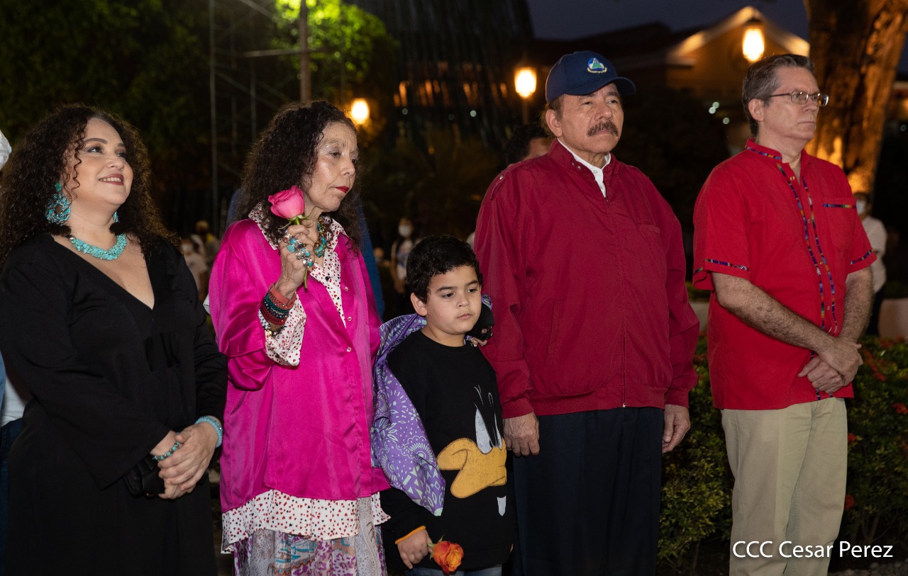 El Presidente de Nicaragua, Comandante Daniel Ortega y la compañera Rosario Murillo presiden el acto de conmemoración del 44 aniversario del paso a la inmortalidad del Comandante Carlos Fonseca Amador, desde el mausoleo en la plaza de la Revolución en Managua.