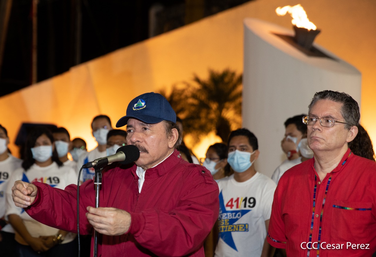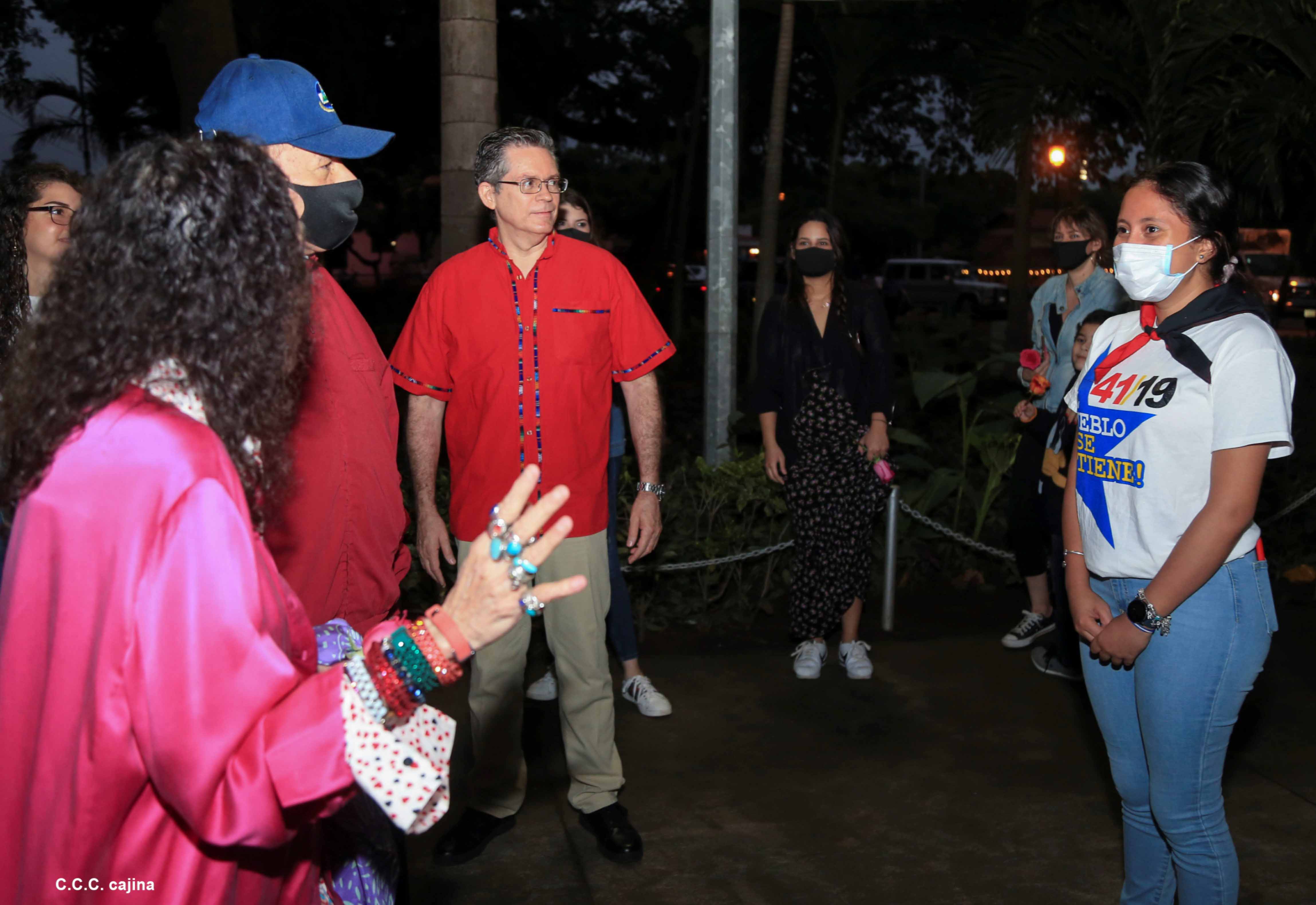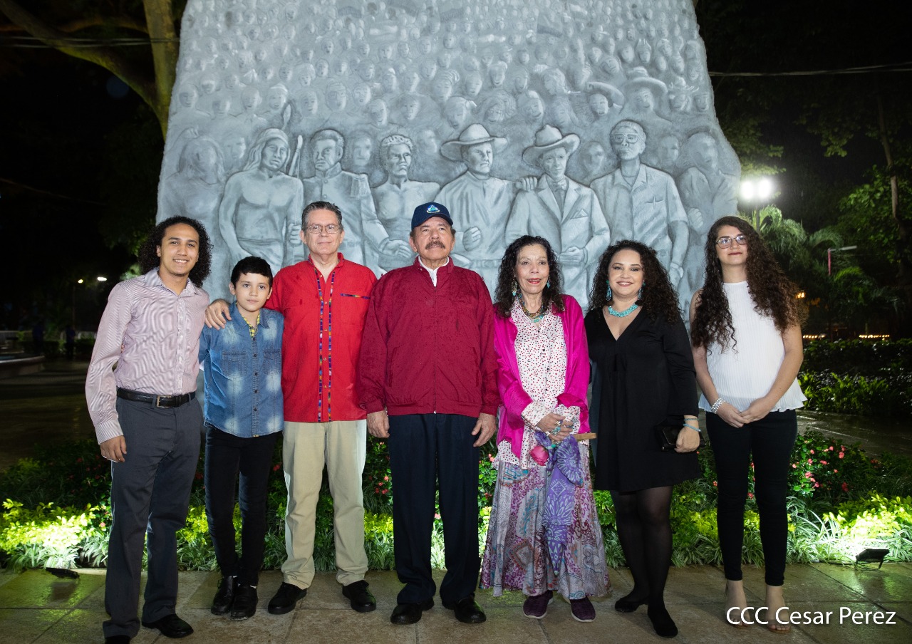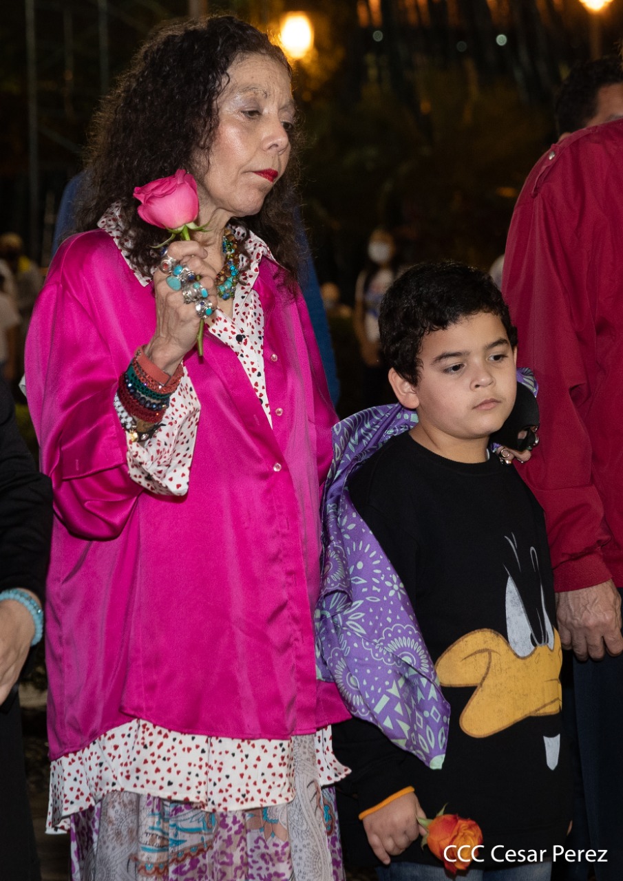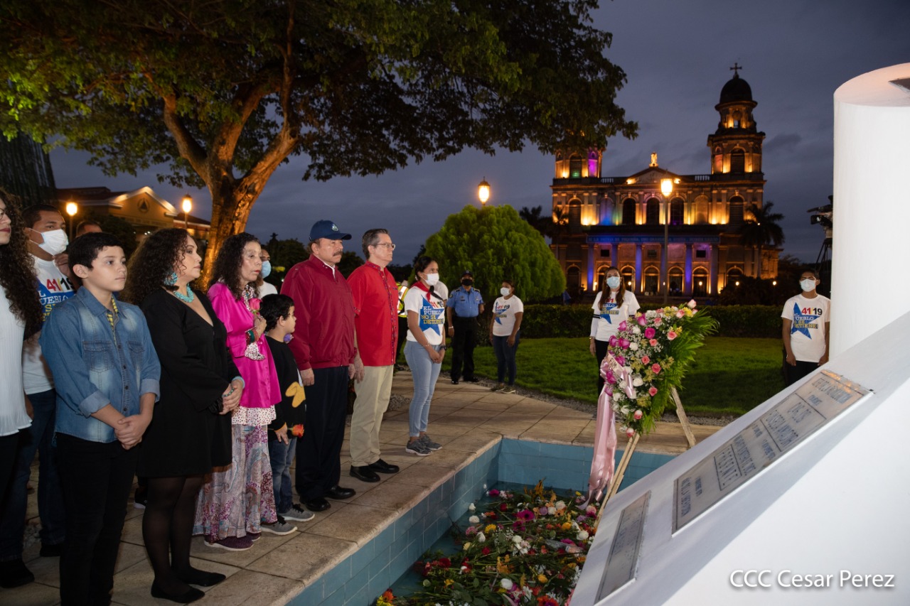 El Presidente de Nicaragua, Comandante Daniel Ortega y la compañera Rosario Murillo presiden el acto de conmemoración del 44 aniversario del paso a la inmortalidad del Comandante Carlos Fonseca Amador, desde el mausoleo en la plaza de la Revolución en Managua.