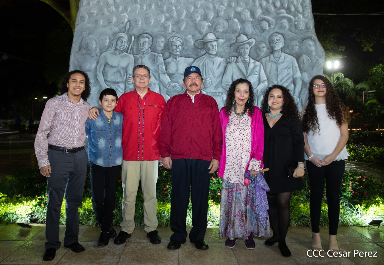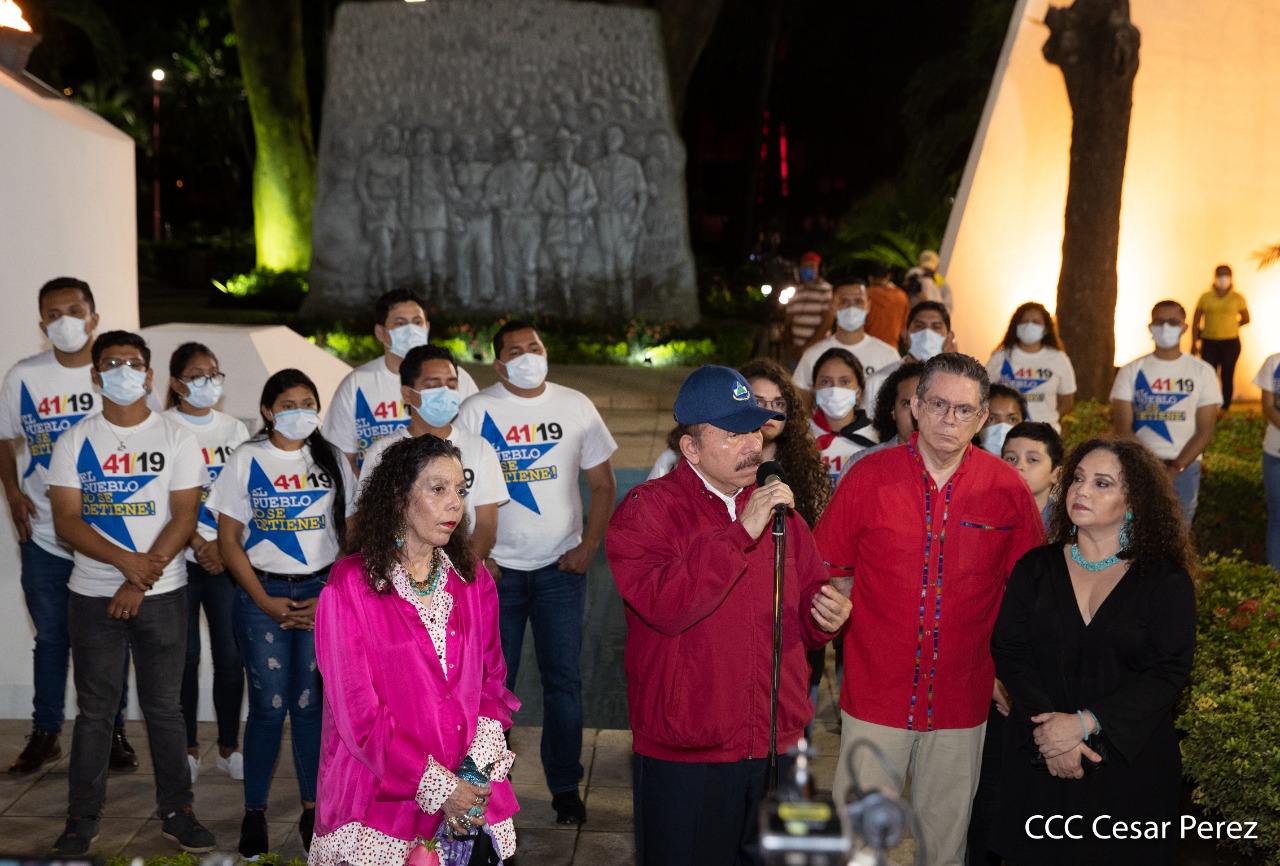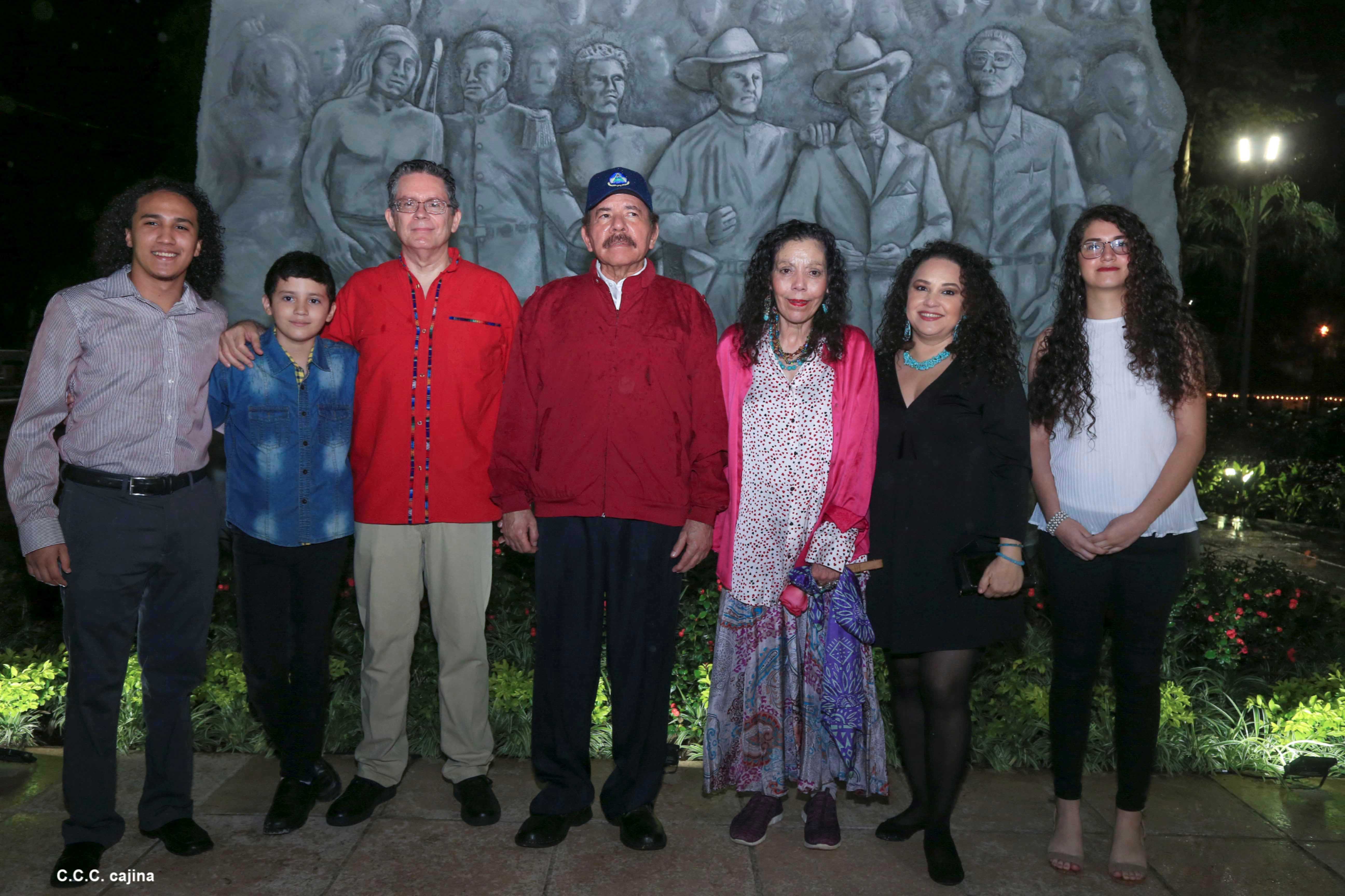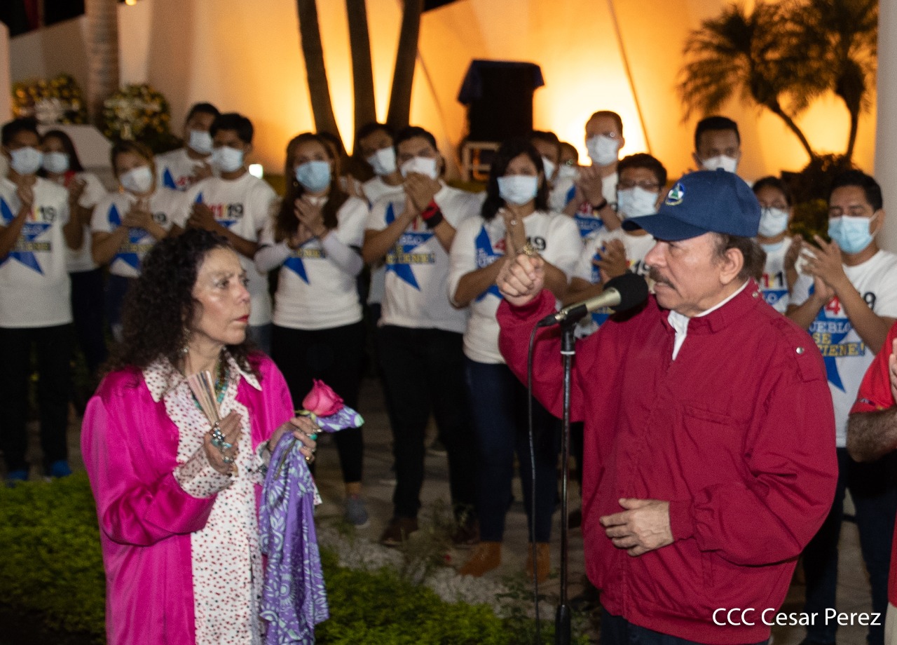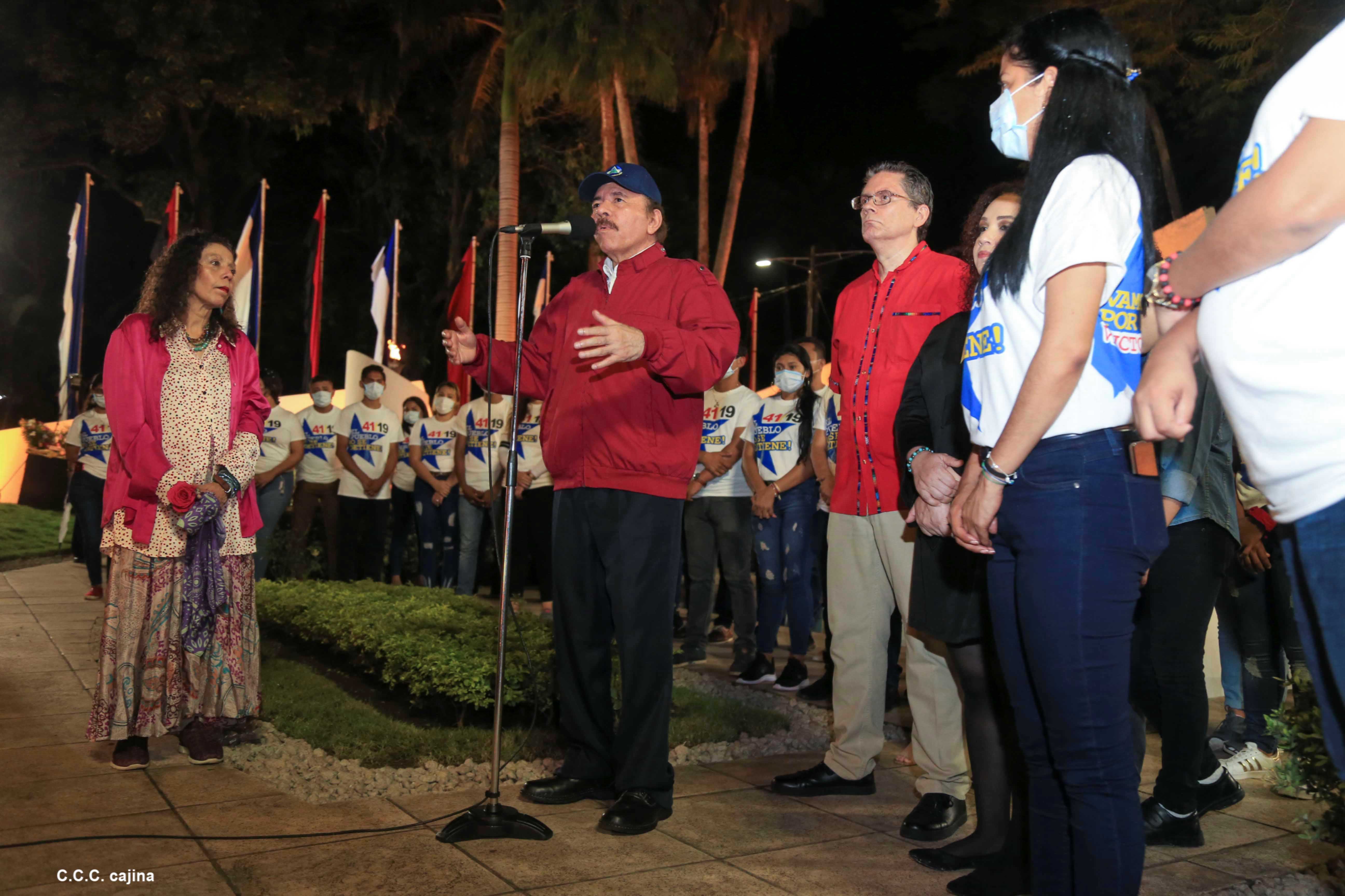 El Presidente de Nicaragua, Comandante Daniel Ortega y la compañera Rosario Murillo presiden el acto de conmemoración del 44 aniversario del paso a la inmortalidad del Comandante Carlos Fonseca Amador, desde el mausoleo en la plaza de la Revolución en Managua.