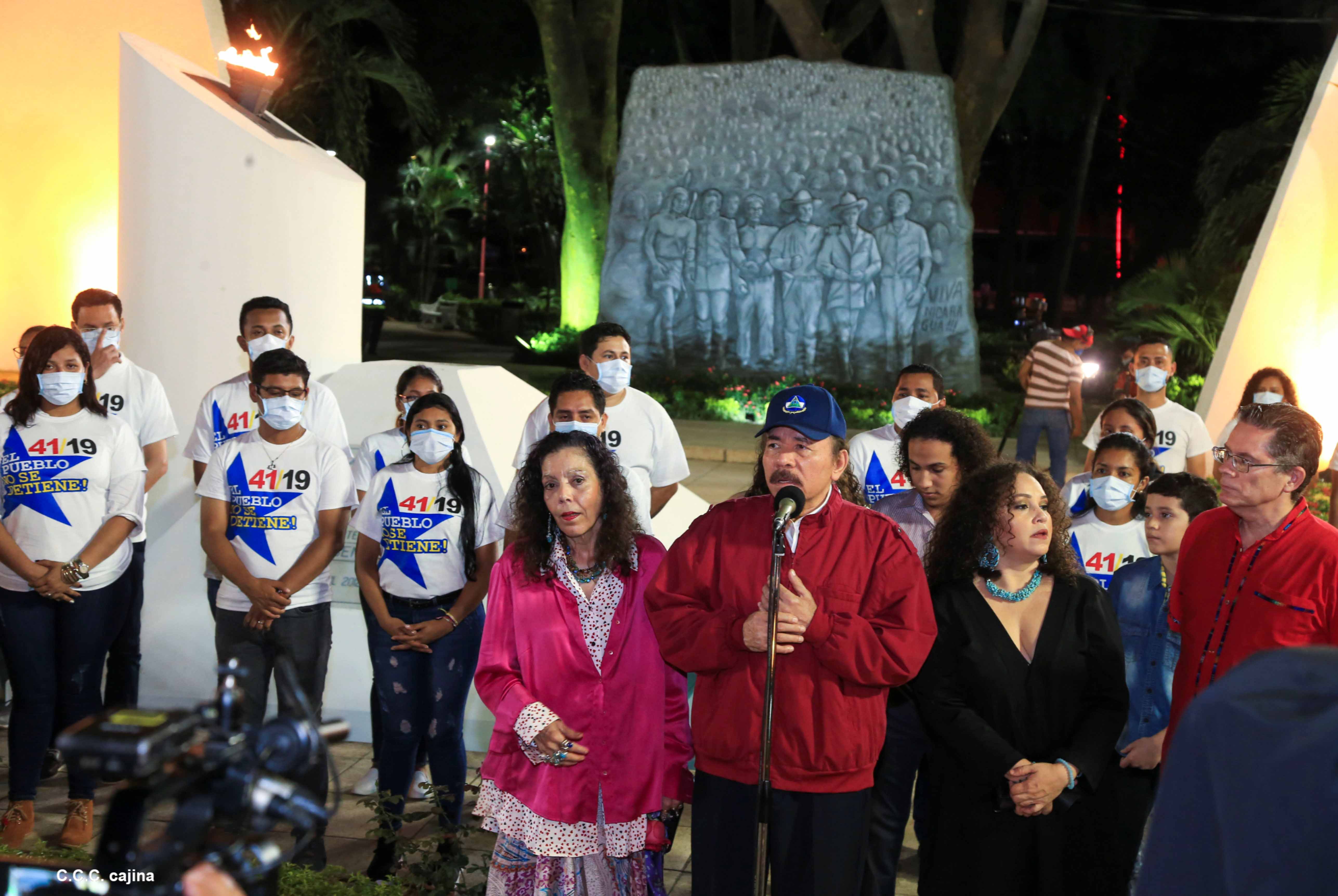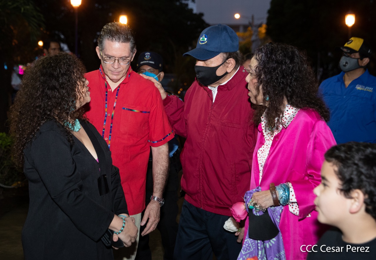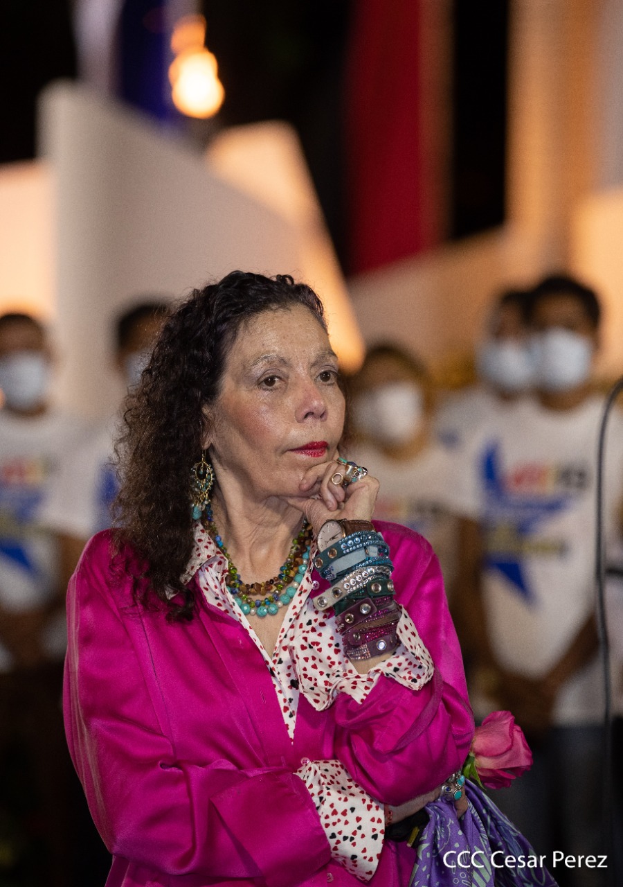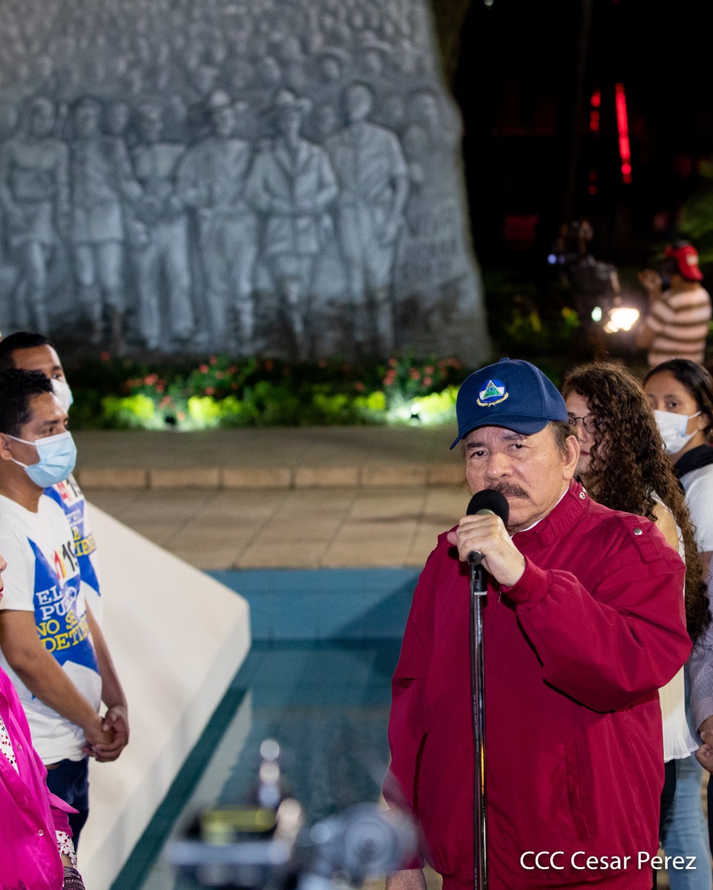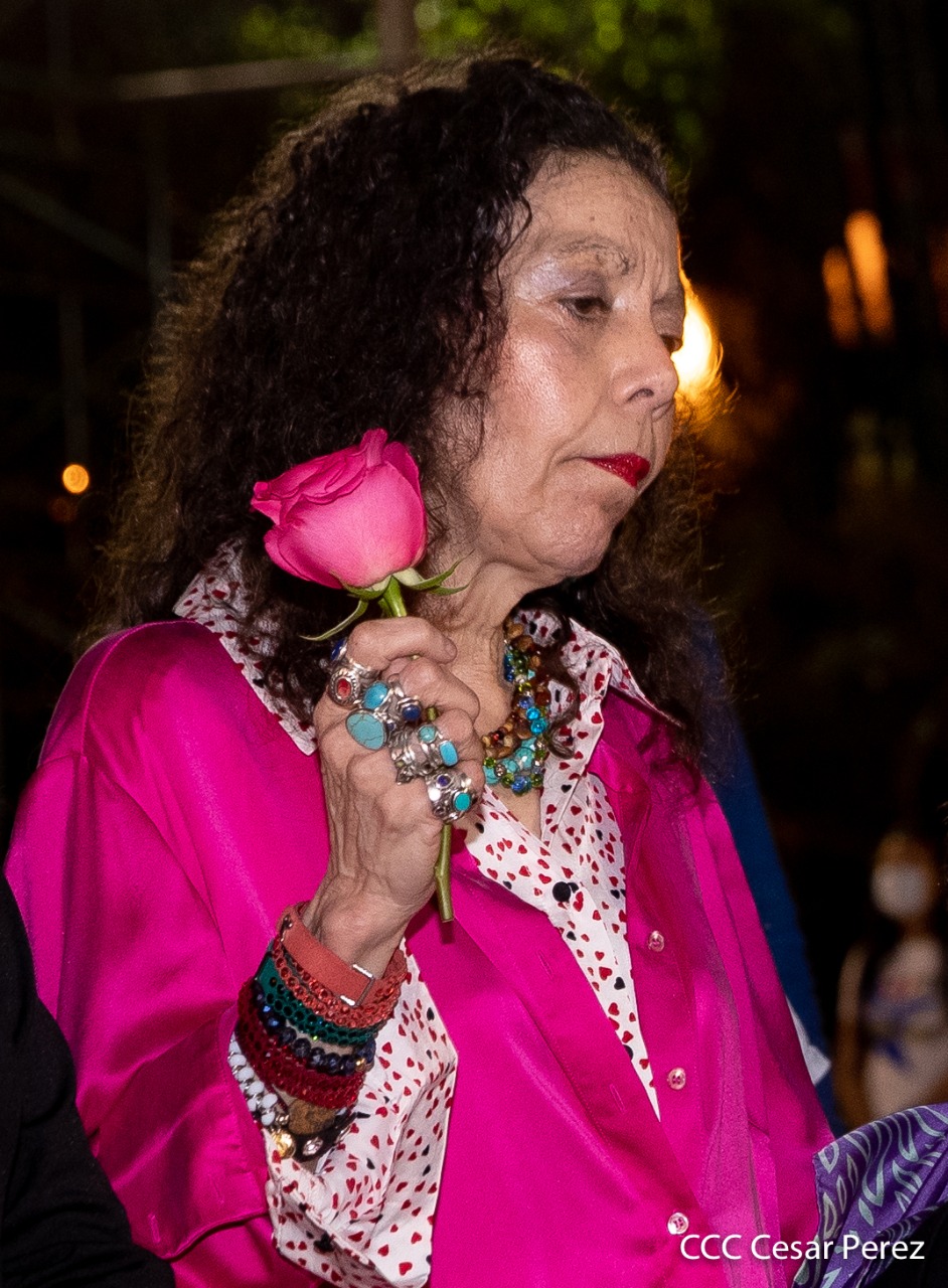 El Presidente de Nicaragua, Comandante Daniel Ortega y la compañera Rosario Murillo presiden el acto de conmemoración del 44 aniversario del paso a la inmortalidad del Comandante Carlos Fonseca Amador, desde el mausoleo en la plaza de la Revolución en Managua.
