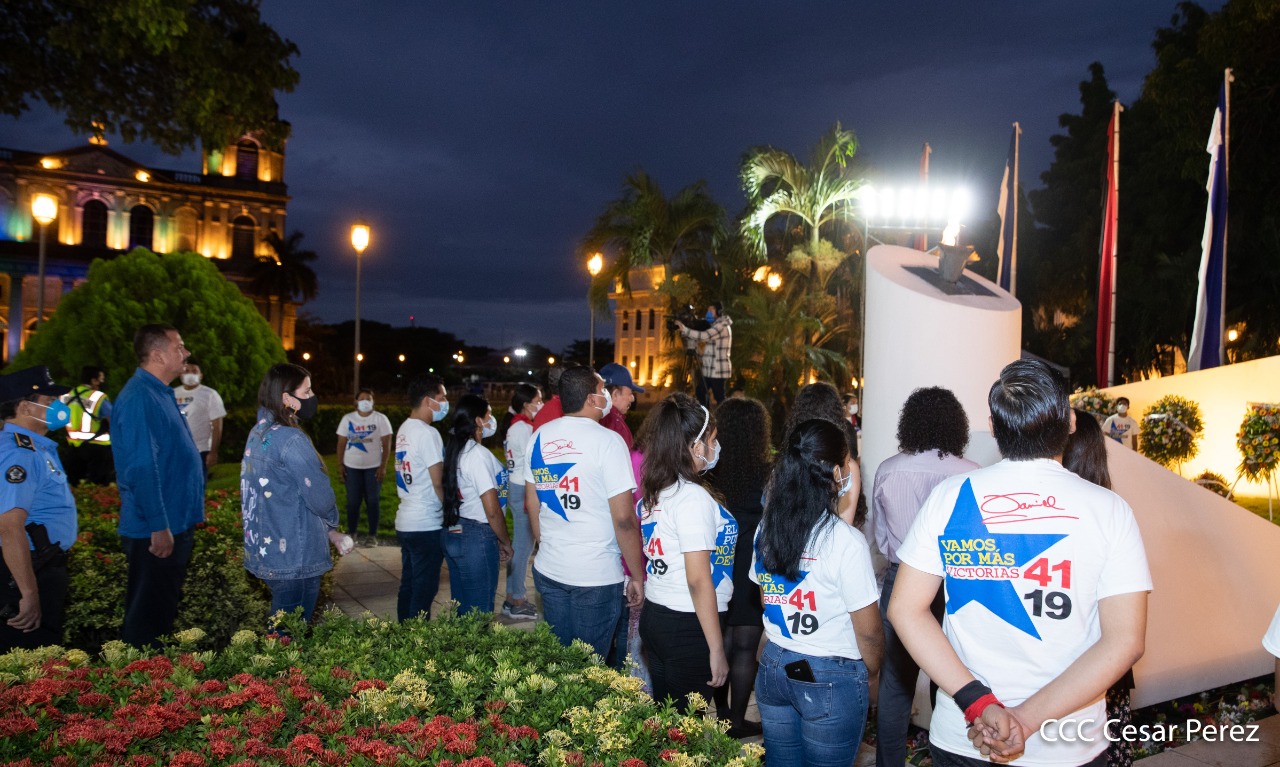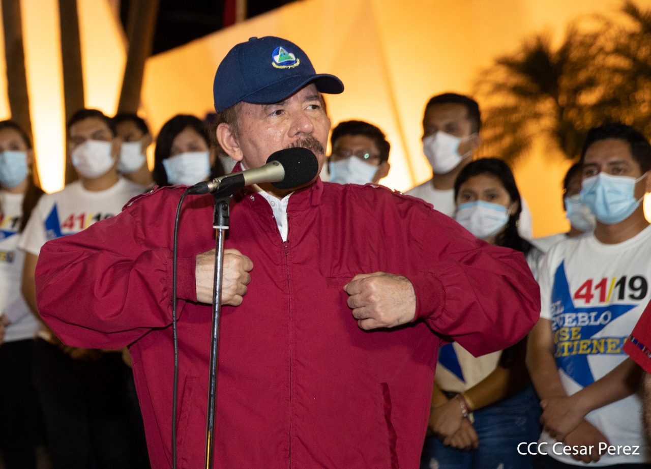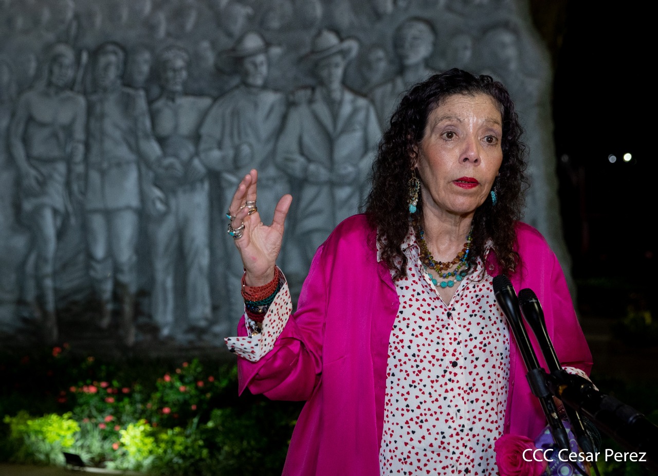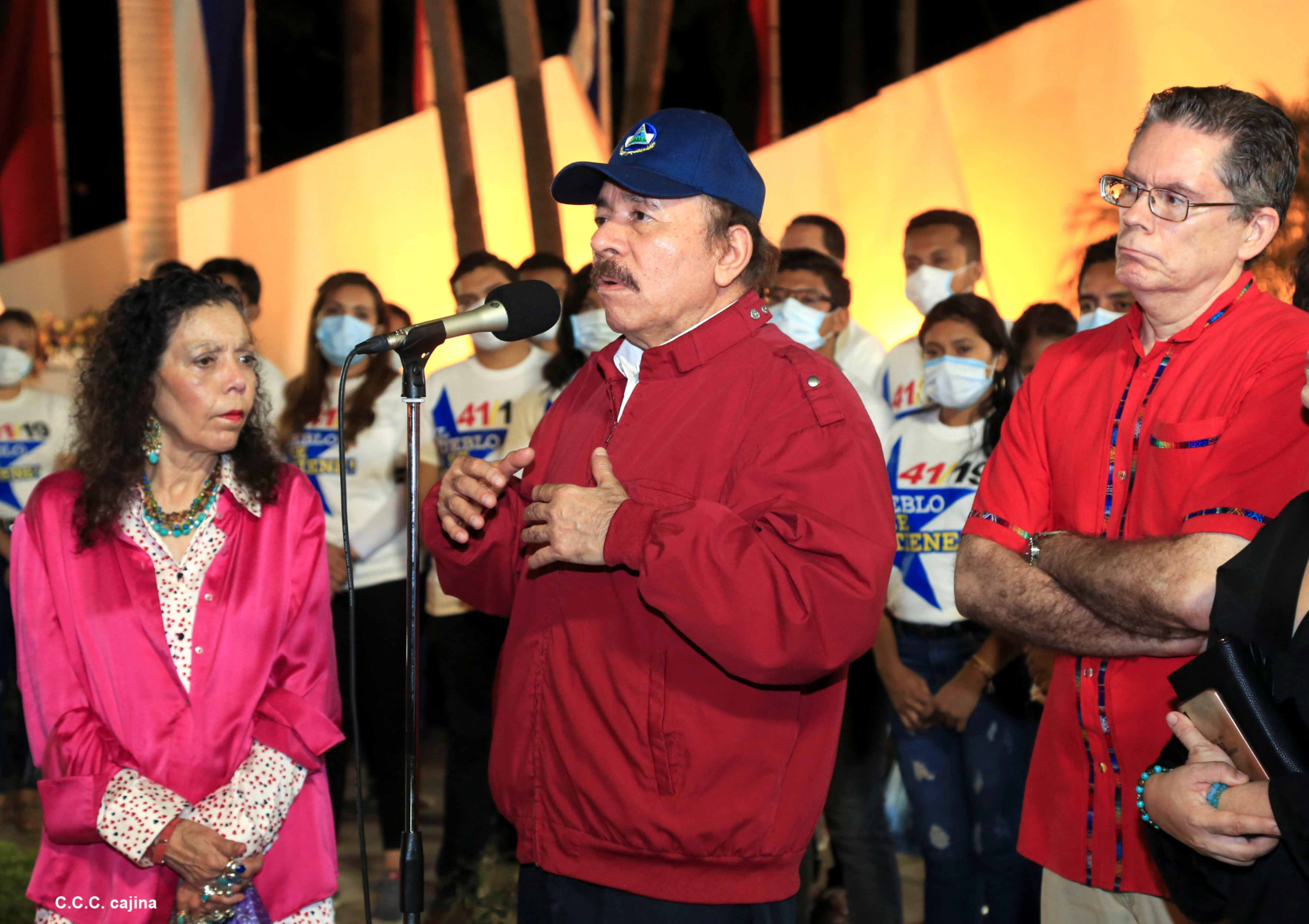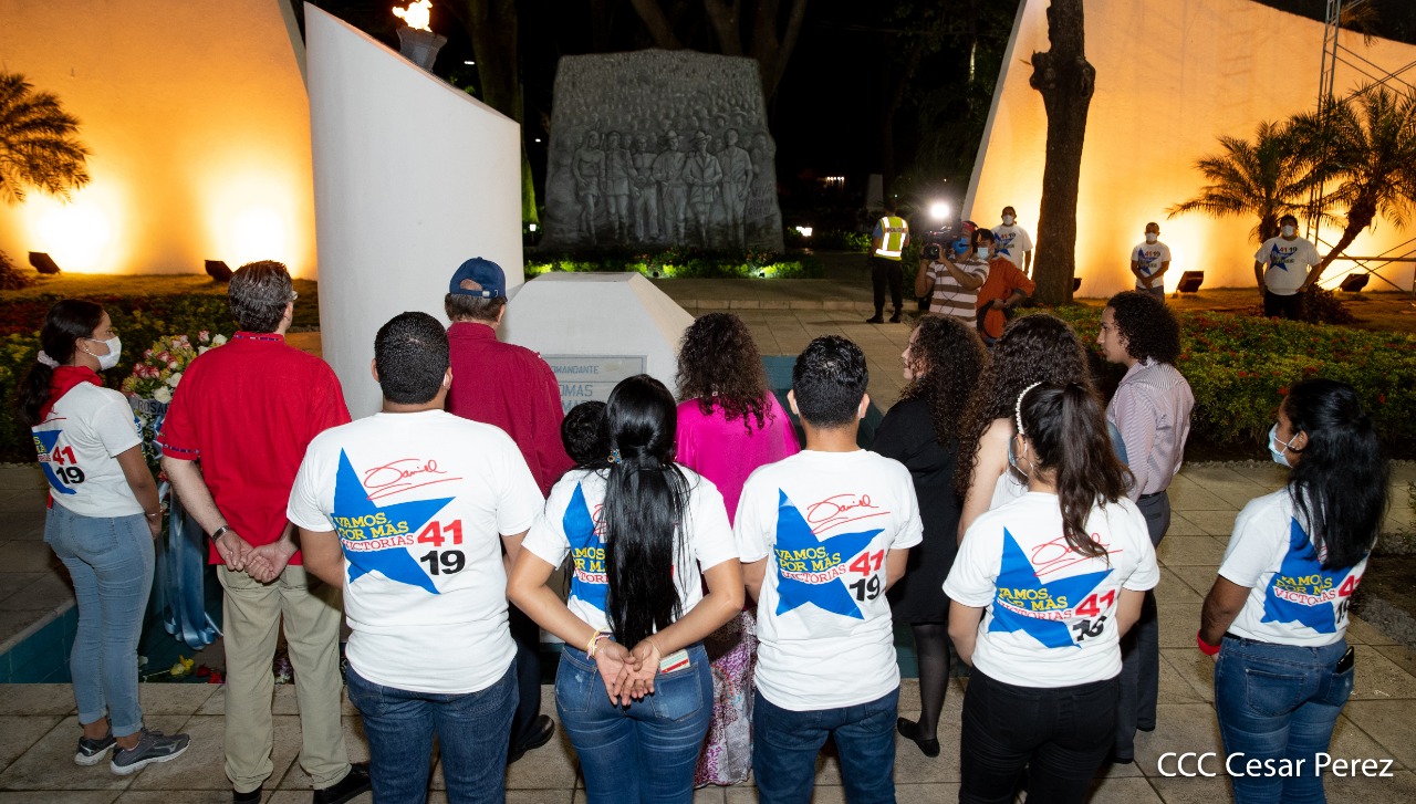El Presidente de Nicaragua, Comandante Daniel Ortega y la compañera Rosario Murillo presiden el acto de conmemoración del 44 aniversario del paso a la inmortalidad del Comandante Carlos Fonseca Amador, desde el mausoleo en la plaza de la Revolución en Managua.