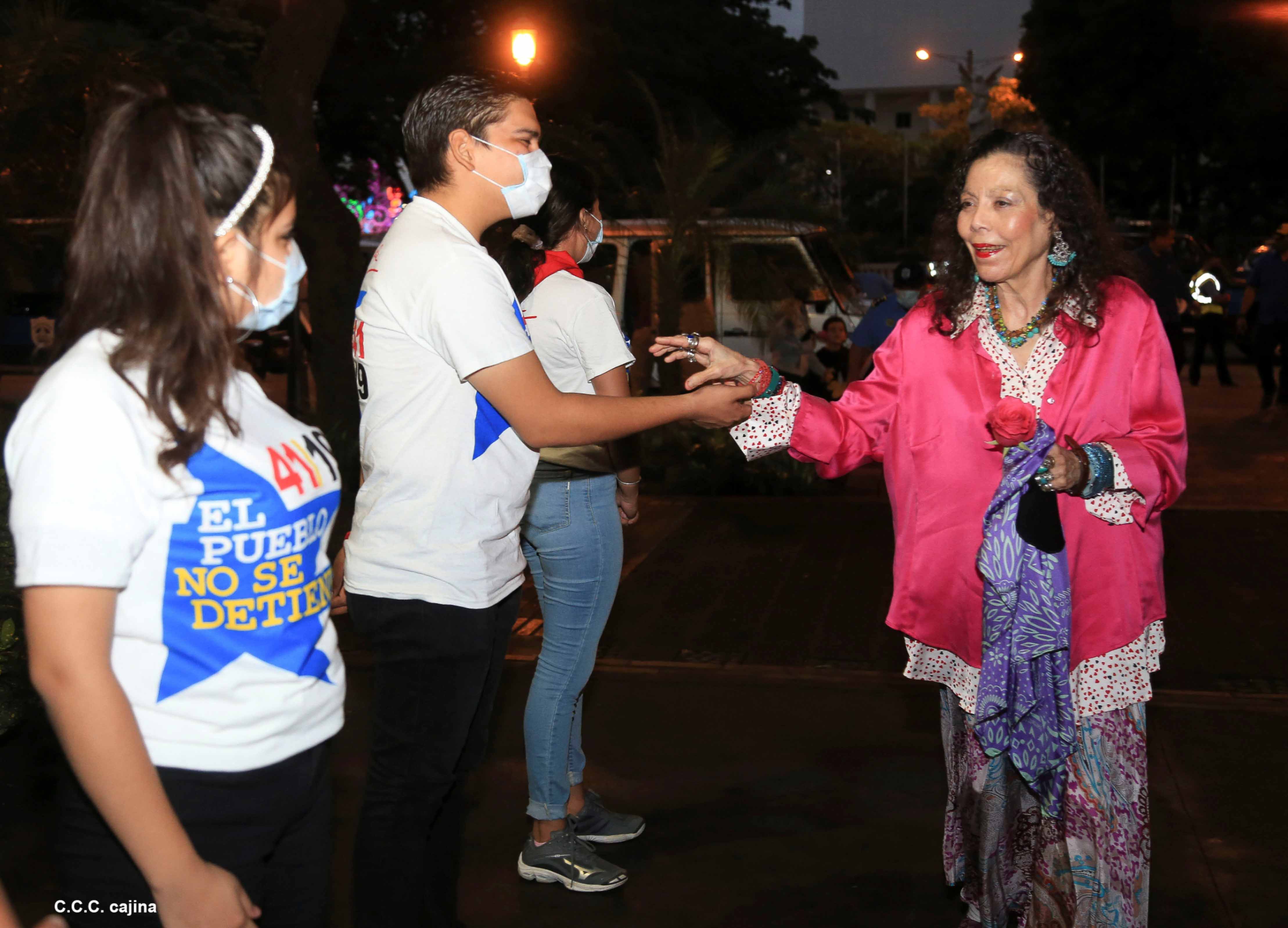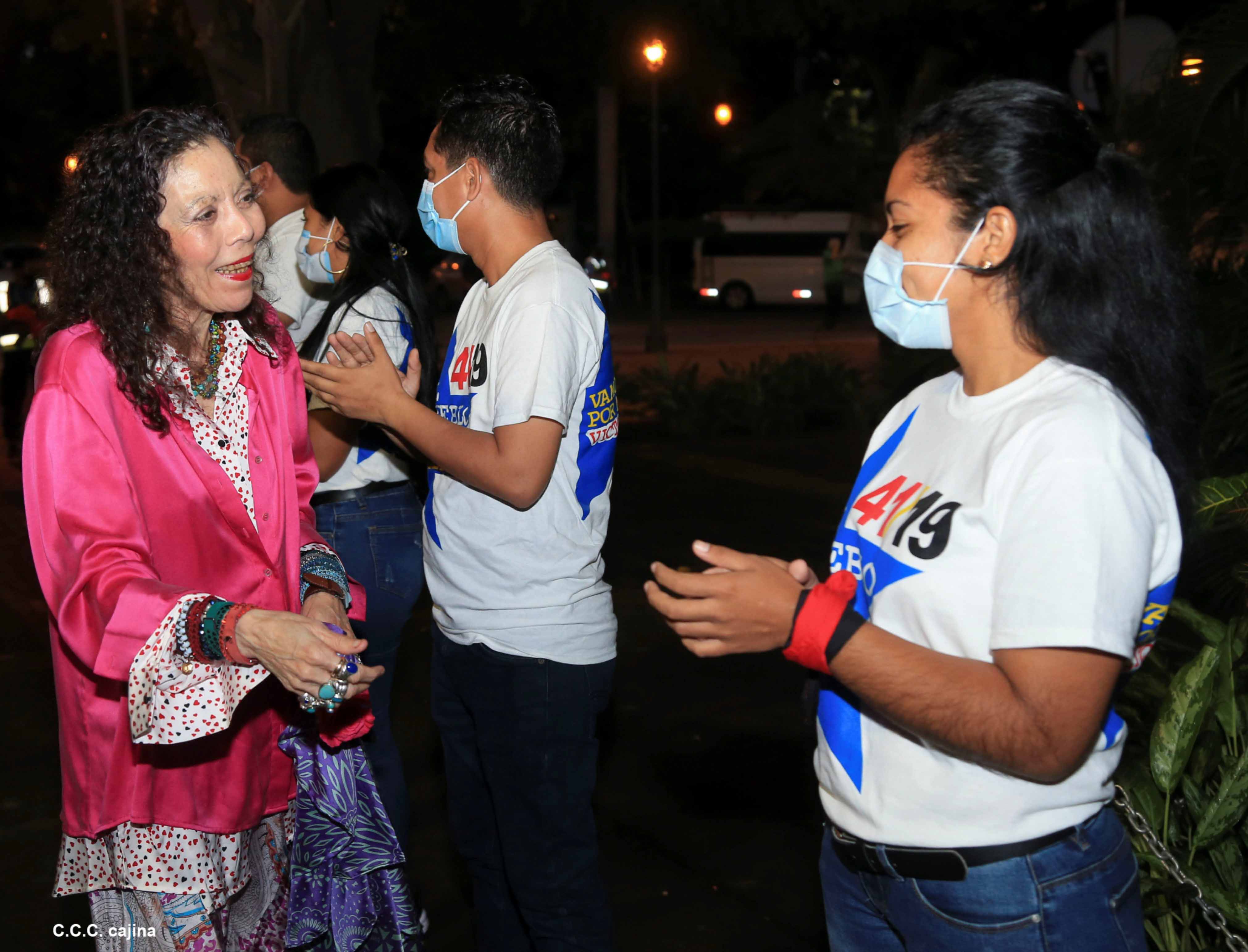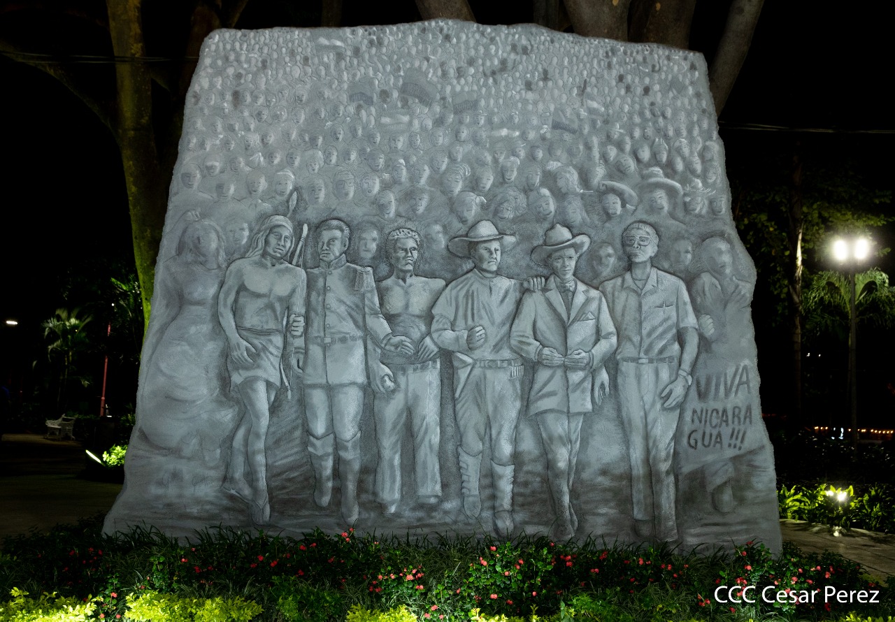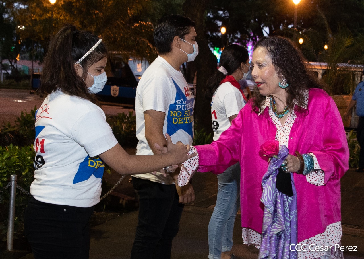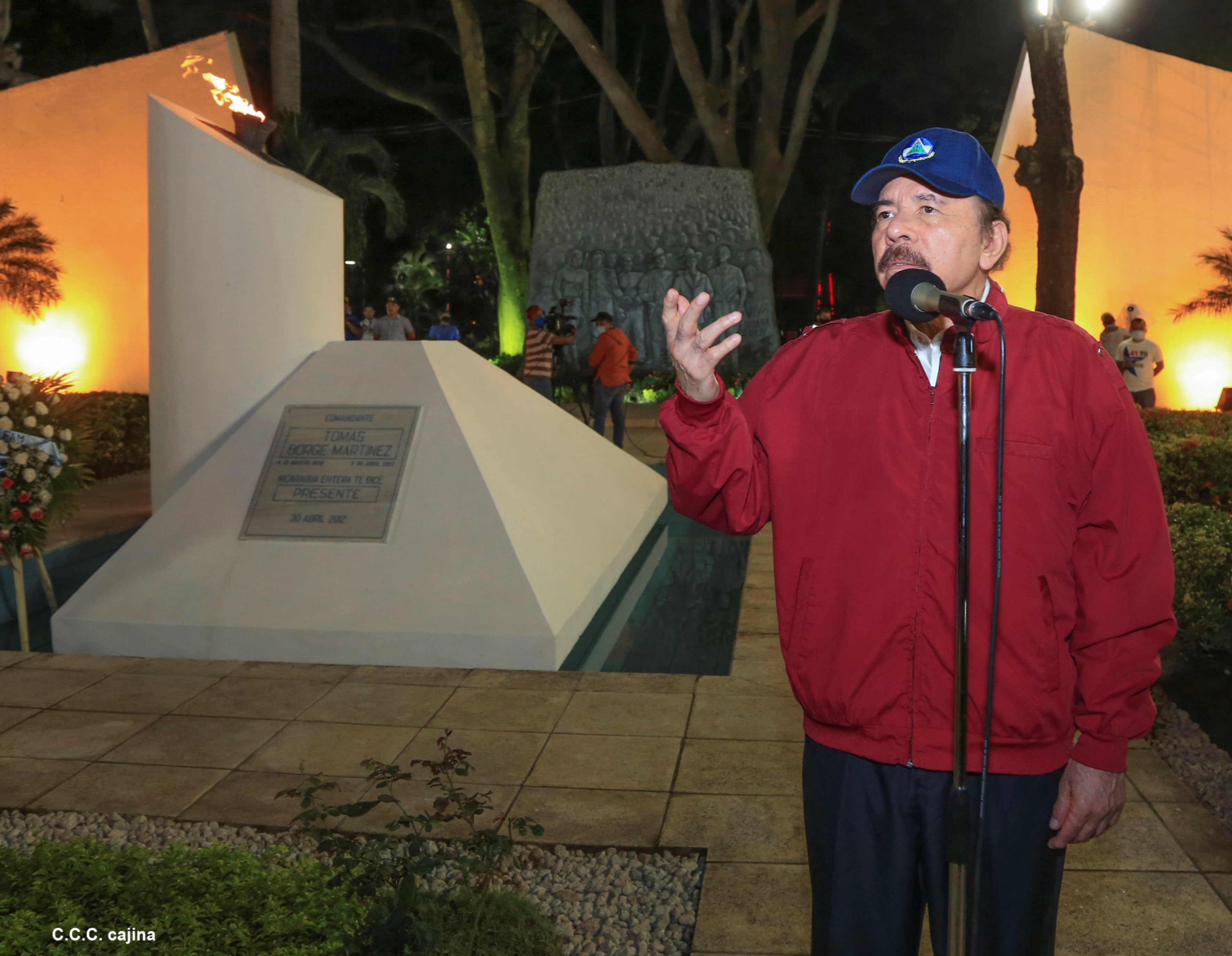 El Presidente de Nicaragua, Comandante Daniel Ortega y la compañera Rosario Murillo presiden el acto de conmemoración del 44 aniversario del paso a la inmortalidad del Comandante Carlos Fonseca Amador, desde el mausoleo en la plaza de la Revolución en Managua.