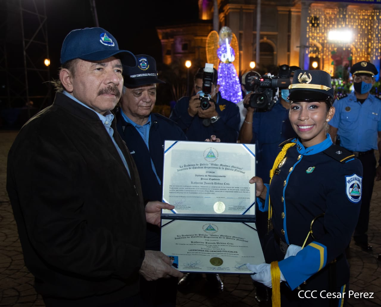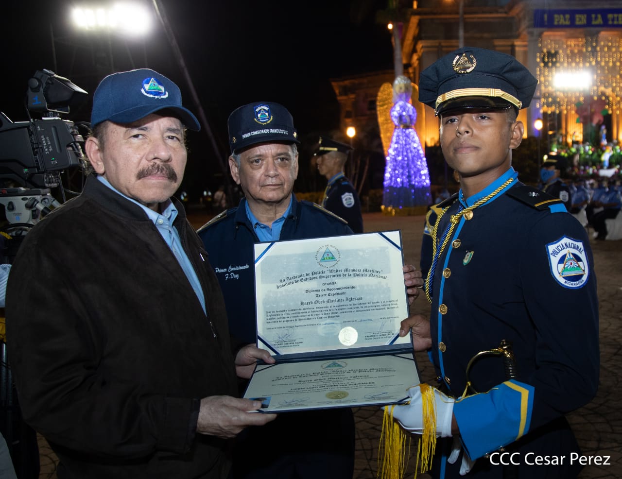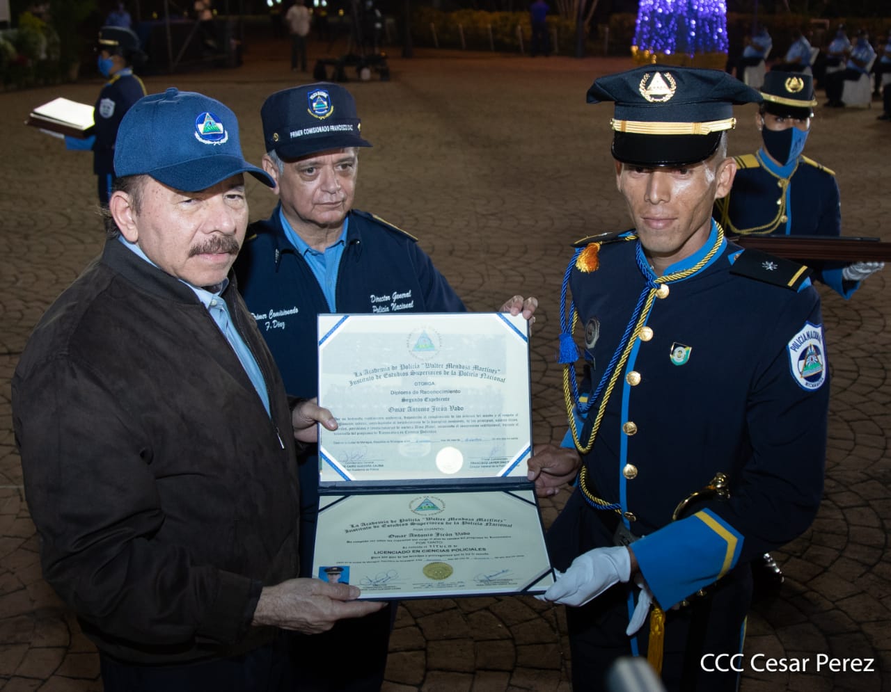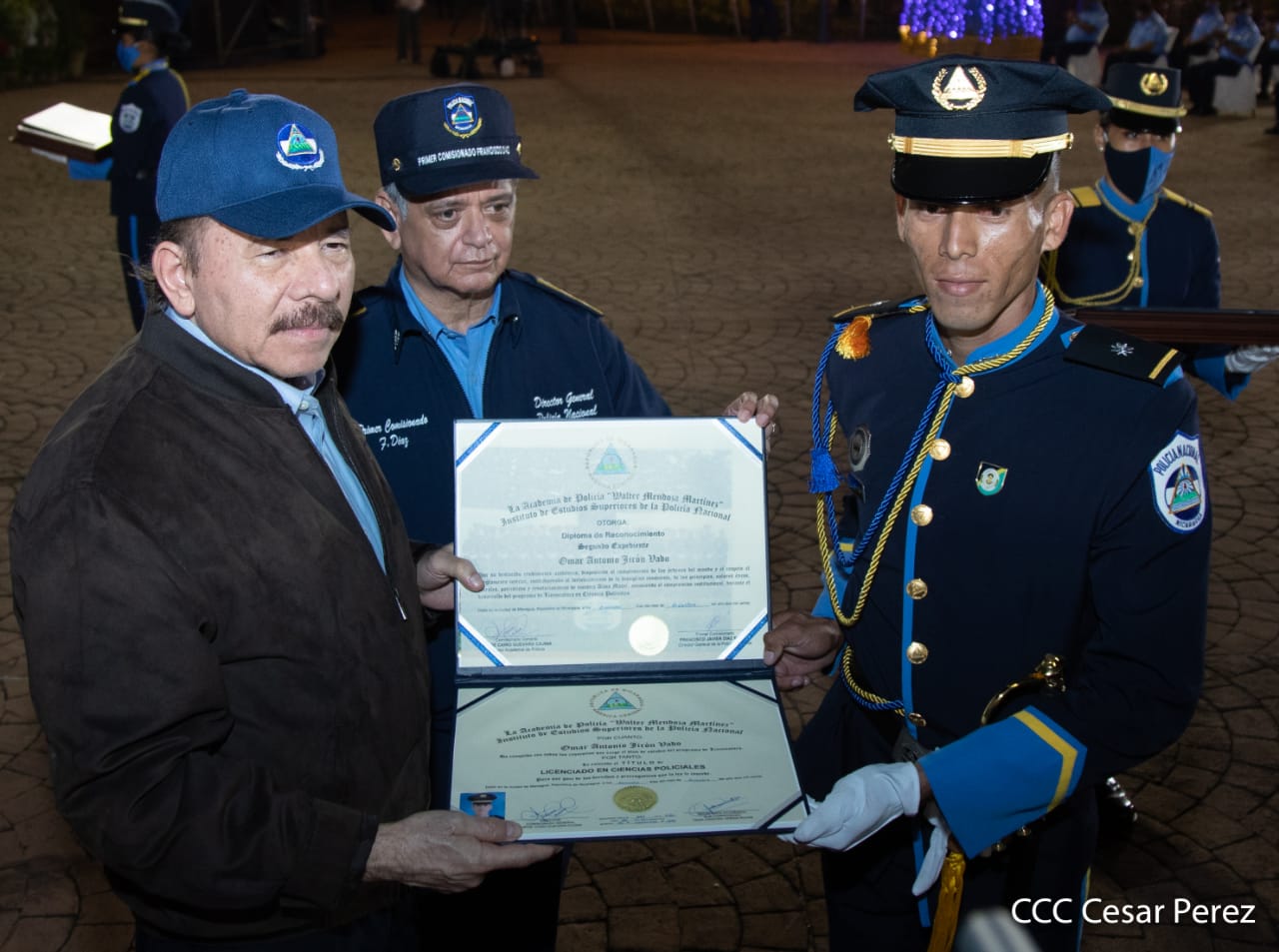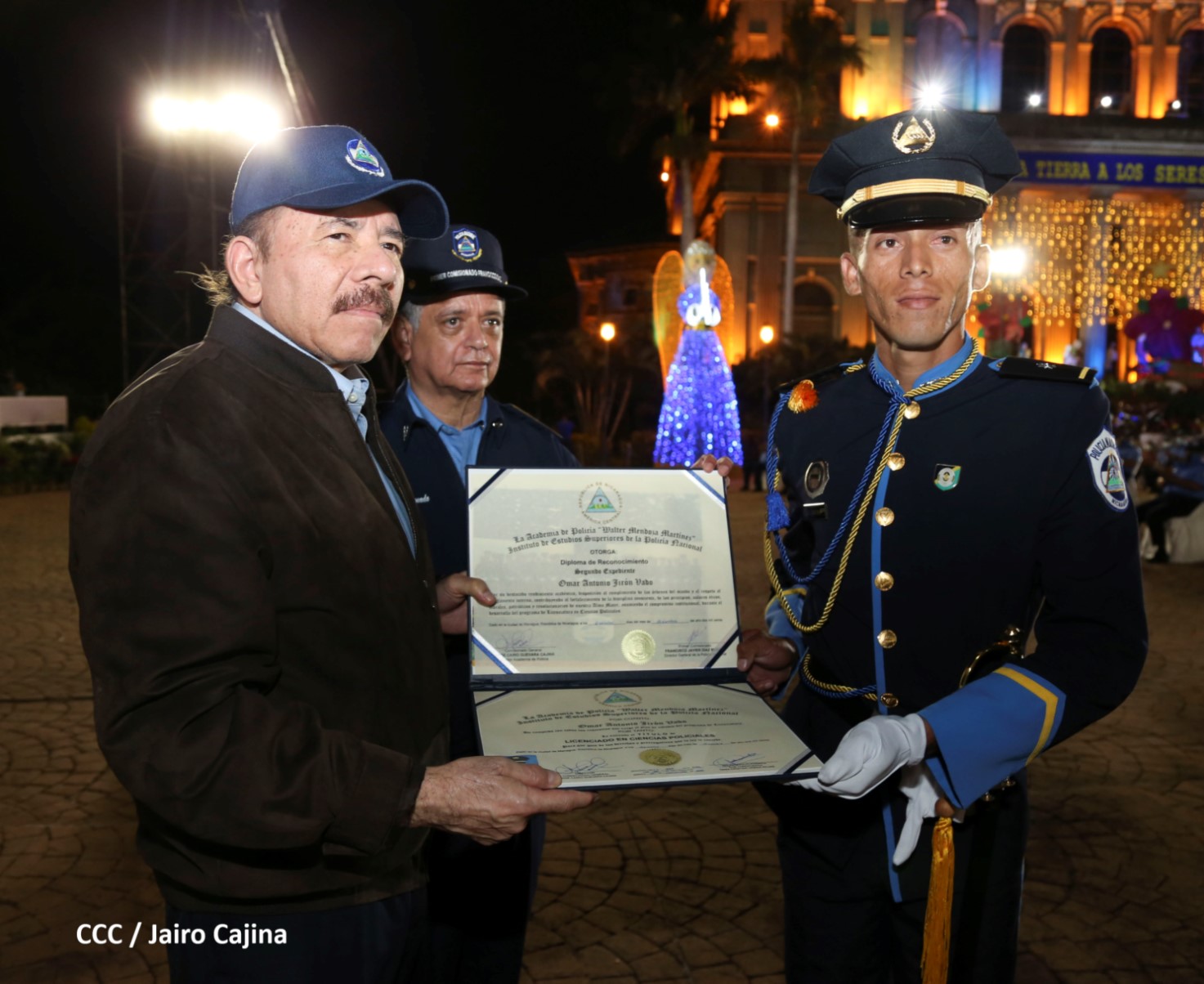 El Comandante Daniel Ortega, acompañado del Primer Comisionado Francisco Javier Díaz Madriz, entregaron títulos y reconocimientos a los tres pimeros expedientes