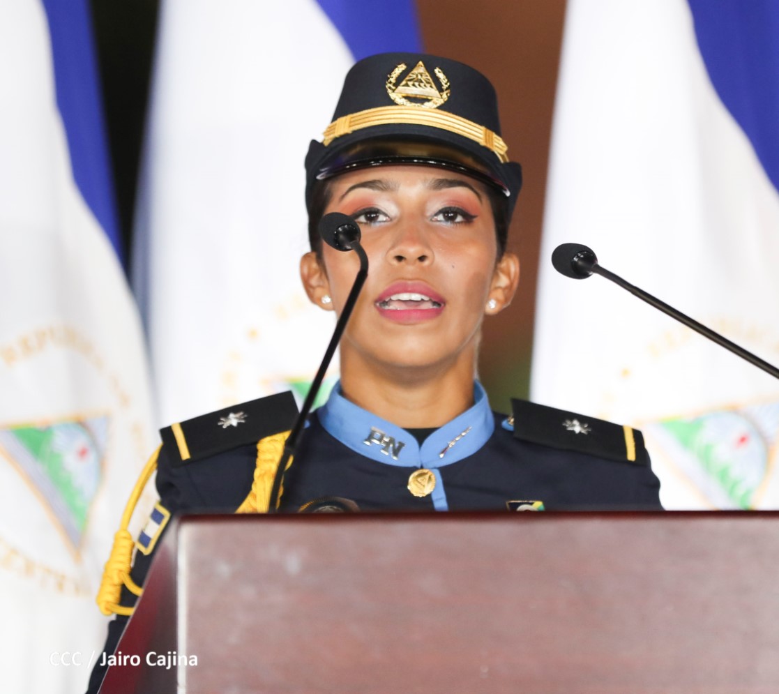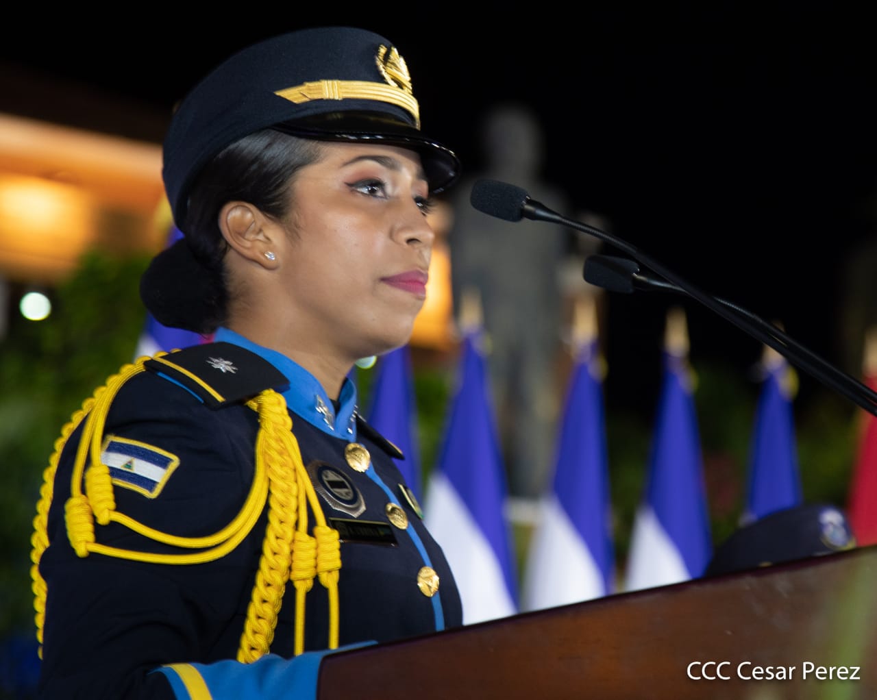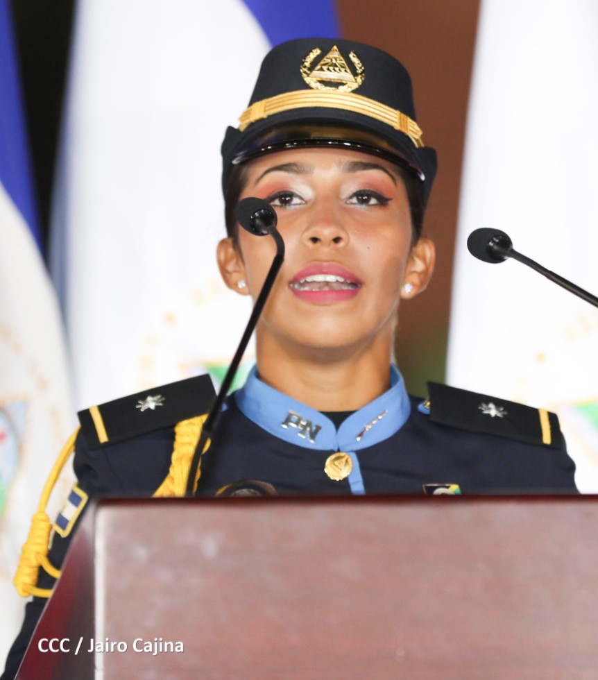 El primer expediente, La Cadete Katherine Junieth Urbina Cruz, primer expediente ofeció las palabras de agradecimiento y compromiso de todos los graduados en la XXIII Graduación de Damas y Caballeros Cadetes, Licenciados en Ciencias Policiales, la cual fue dedicada al Comisionado General Olivio Hernández Salguera, fundador de la Policía Nacional.