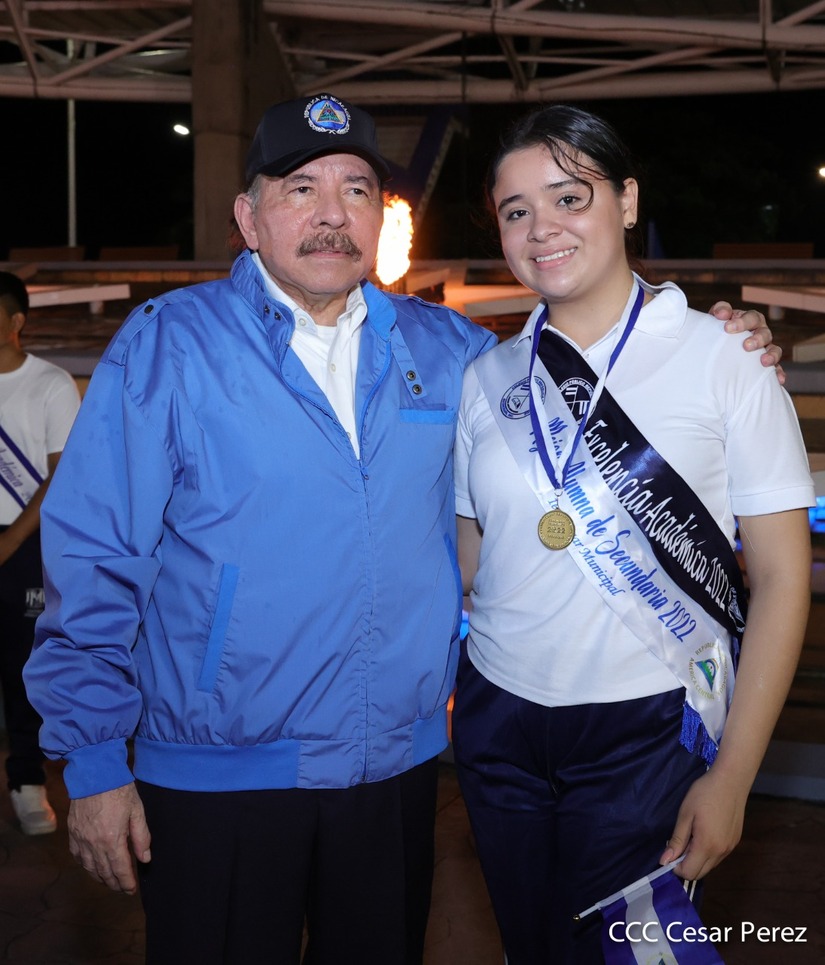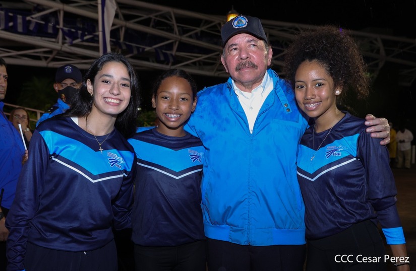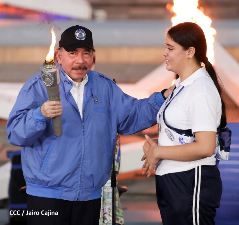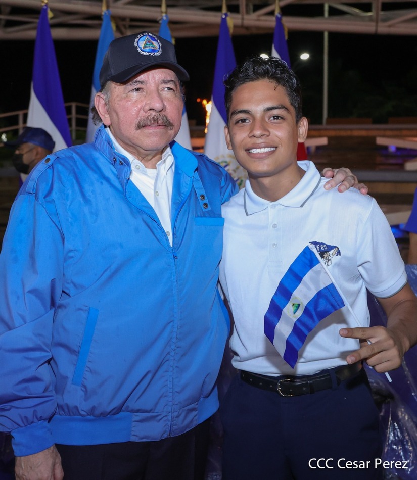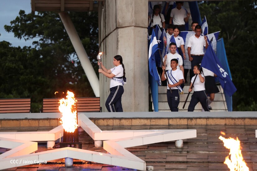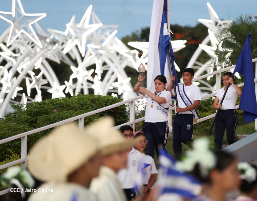 El Presidente de la República Comandante Daniel Ortega Saavedra recibió la antorcha de la paz y la libertad de manos de la mejor estudiante de Managua Esmeralda Carolina Méndez Cruz del Centro Escolar República de Ecuador. La bandera de Nicaragua era portada por el estudiante José González Flores del Instituto Experimental México y de la Federación de Estudiantes de Secundaria Julieth Jarquín Maltez del colegio Che Guevara de Villa El Carmen.