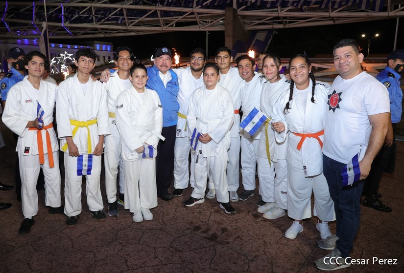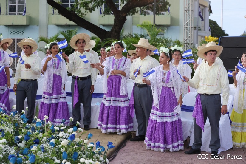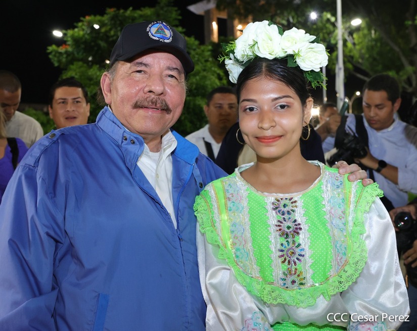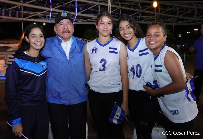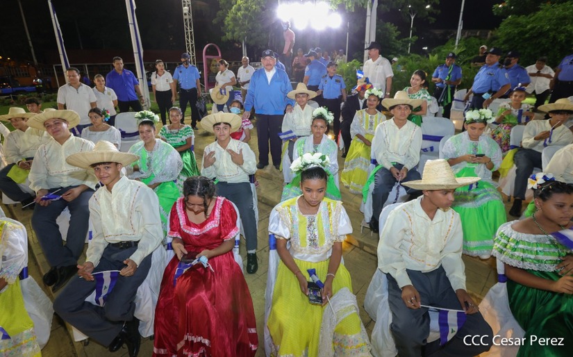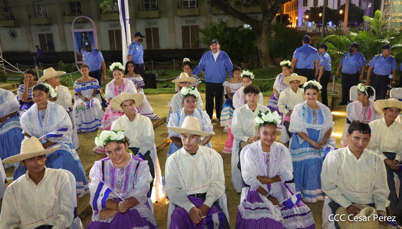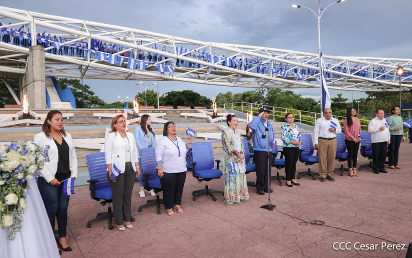 El Presidente de la República Comandante Daniel Ortega Saavedra recibió la antorcha de la paz y la libertad de manos de la mejor estudiante de Managua Esmeralda Carolina Méndez Cruz del Centro Escolar República de Ecuador. La bandera de Nicaragua era portada por el estudiante José González Flores del Instituto Experimental México y de la Federación de Estudiantes de Secundaria Julieth Jarquín Maltez del colegio Che Guevara de Villa El Carmen.