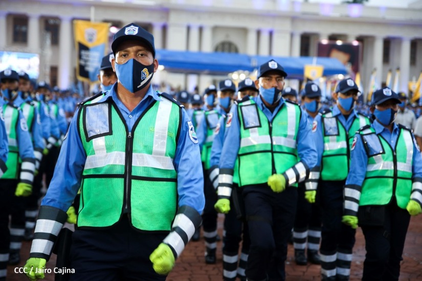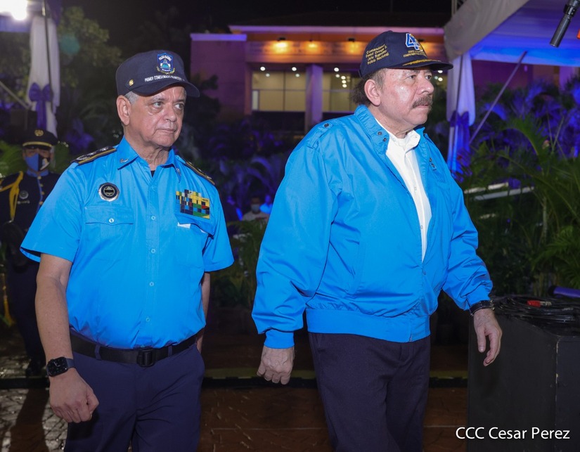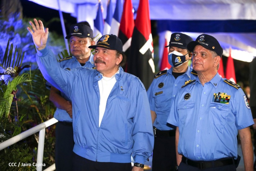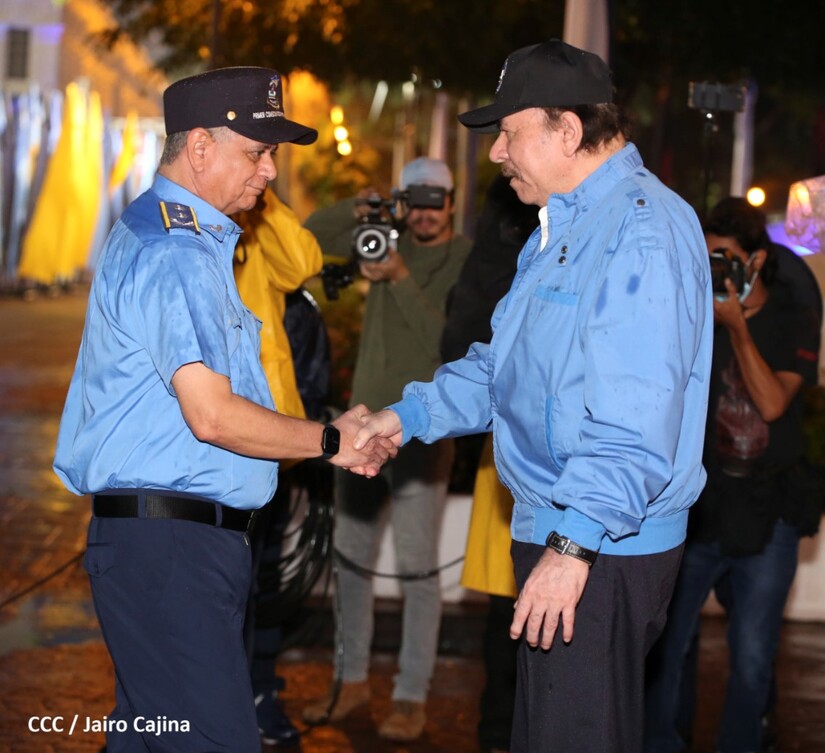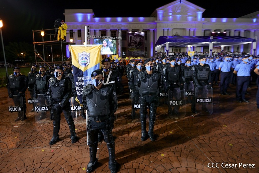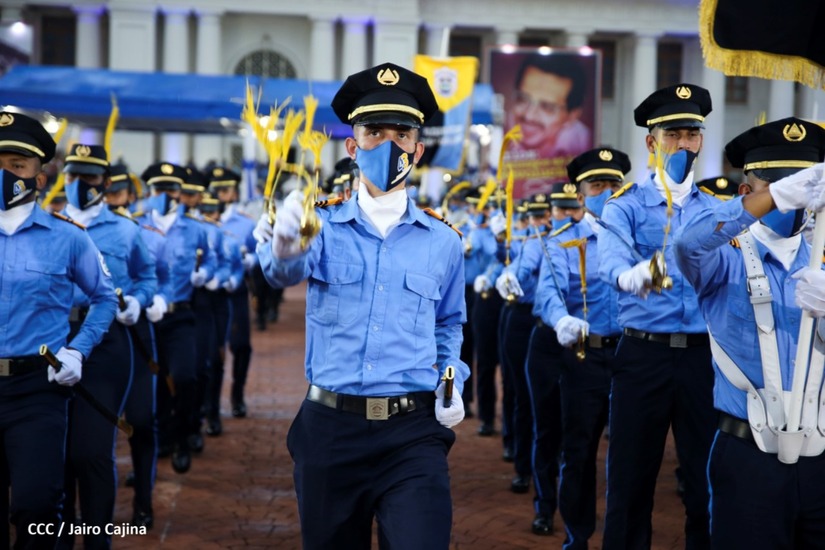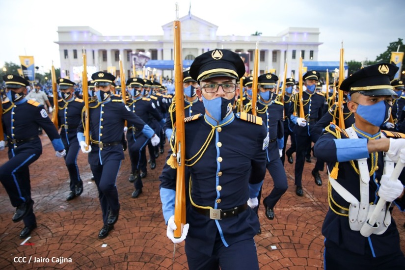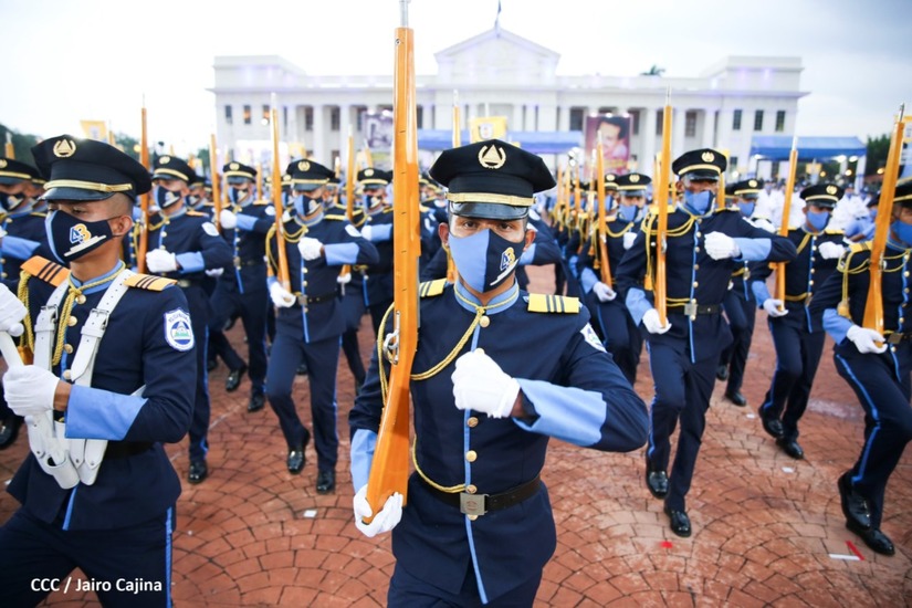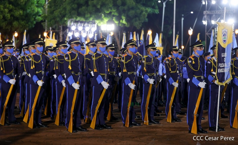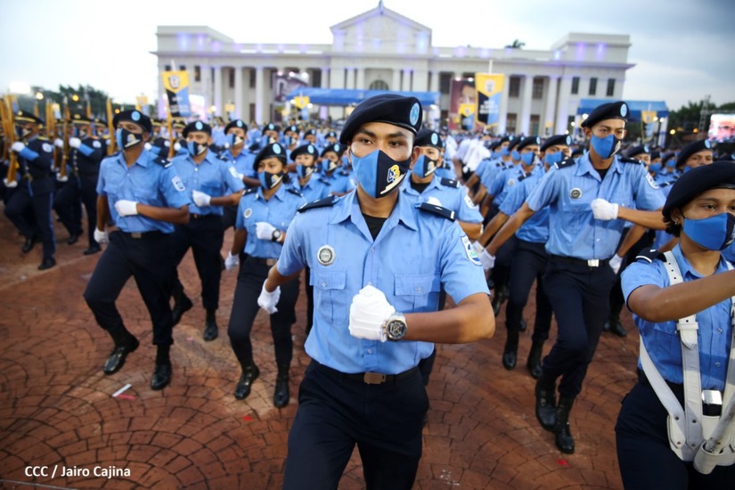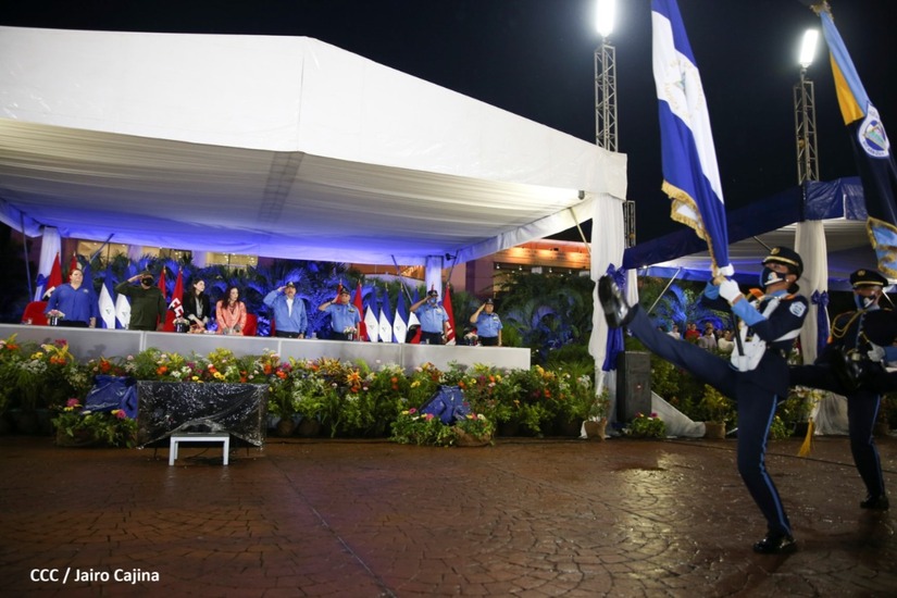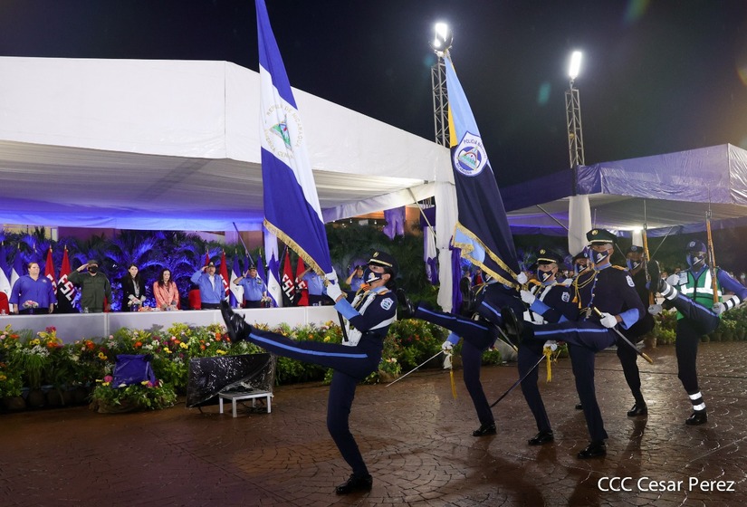 Desde la Plaza de la Revolución, el Presidente de la República, comandante Daniel Ortega Saavedra y la vicepresidenta compañera Rosario Murillo, presiden junto al primer comisionado general Francisco Díaz Director de la Policía Nacional, el acto en conmemoración del 43 aniversario de constitución de la Policía Nacional.