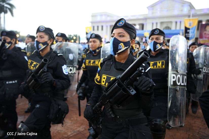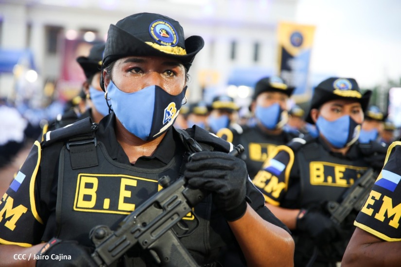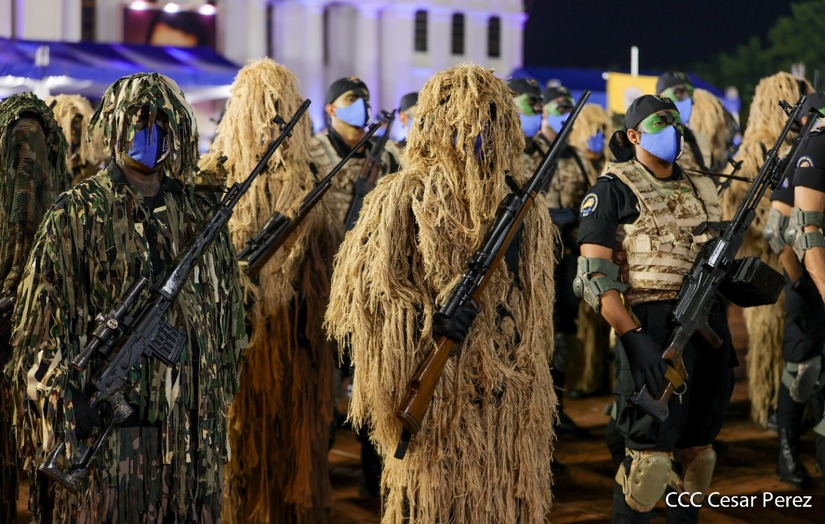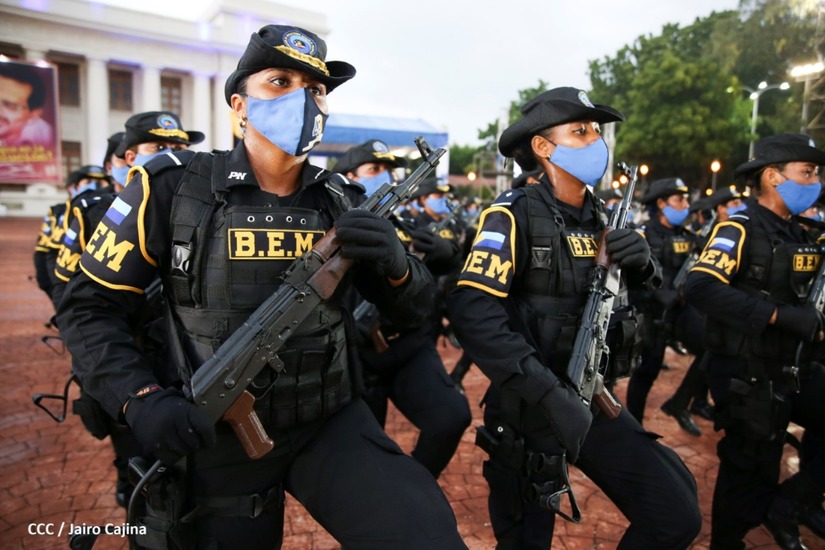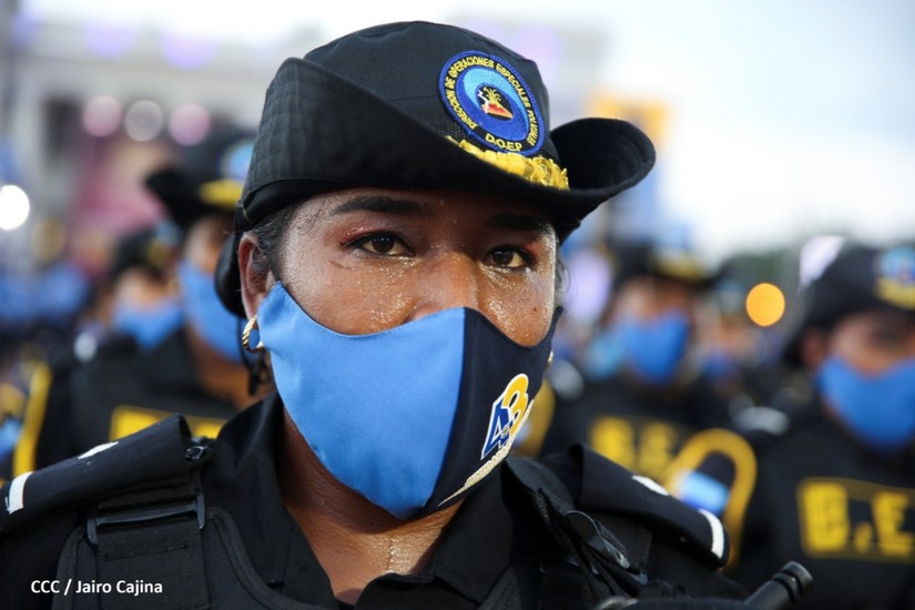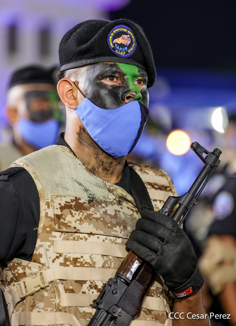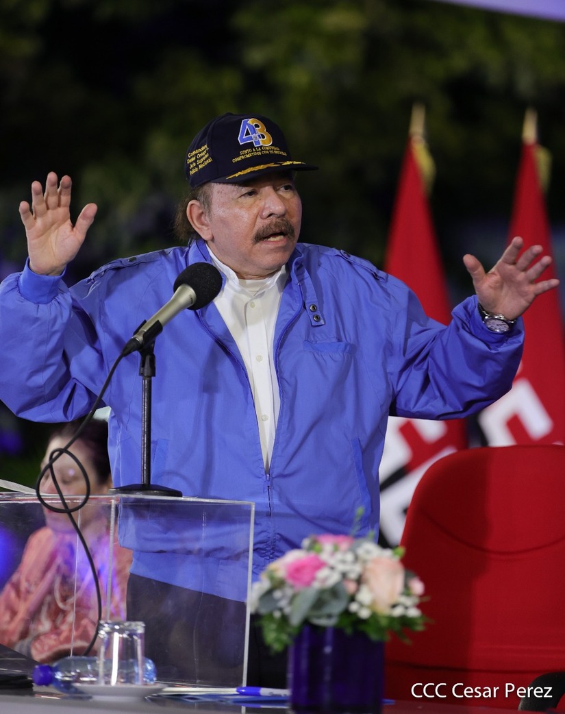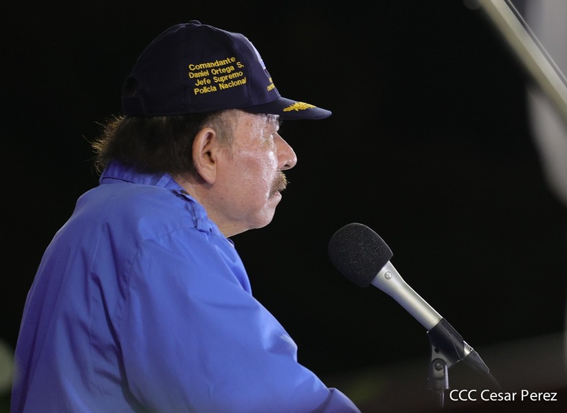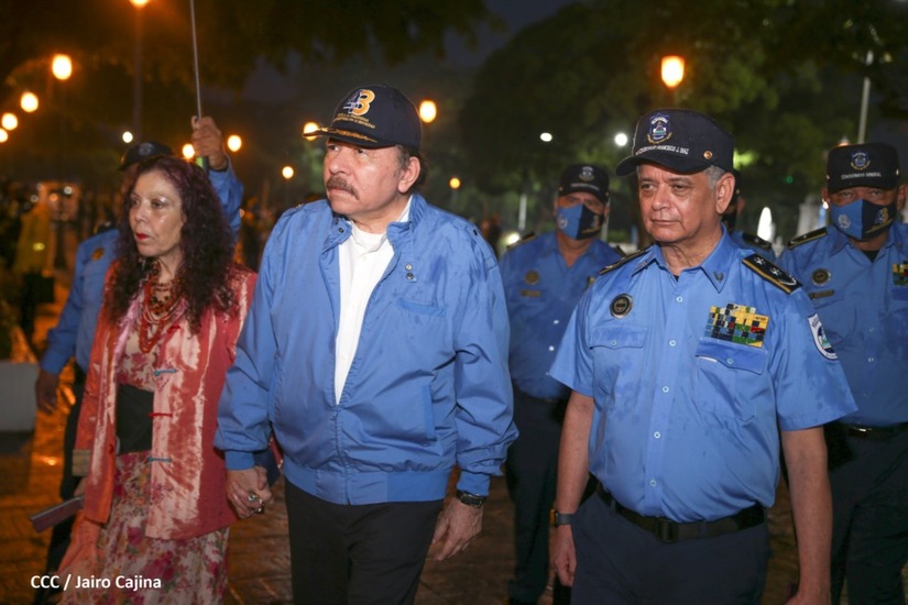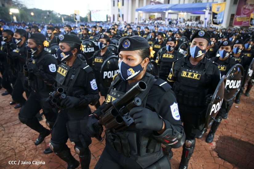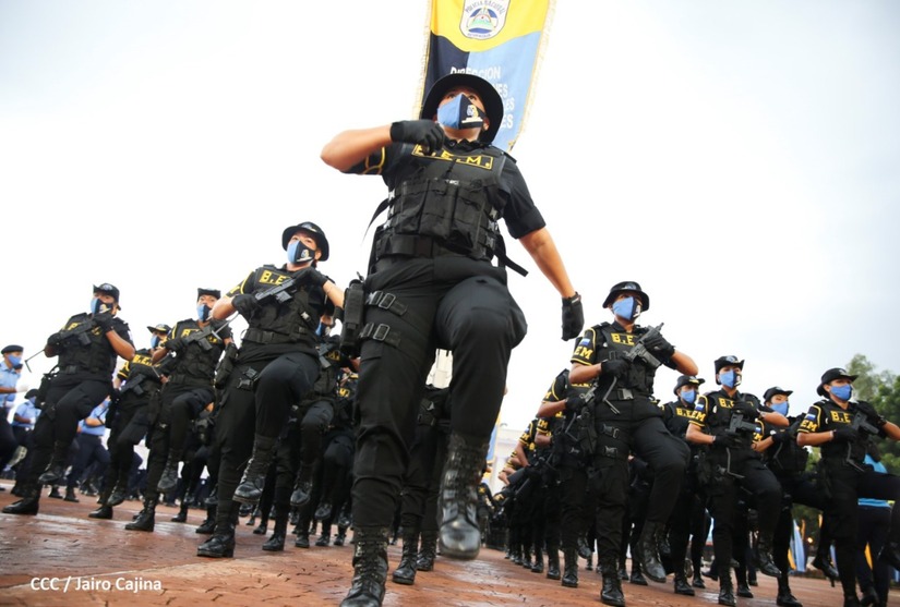 Desde la Plaza de la Revolución, el Presidente de la República, comandante Daniel Ortega Saavedra y la vicepresidenta compañera Rosario Murillo, presiden junto al primer comisionado general Francisco Díaz Director de la Policía Nacional, el acto en conmemoración del 43 aniversario de constitución de la Policía Nacional.