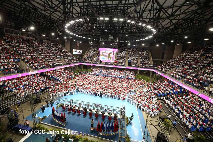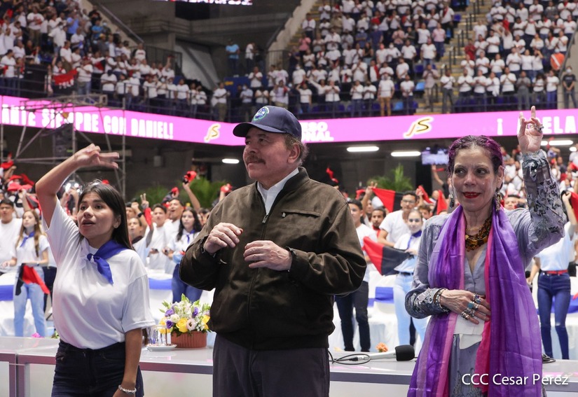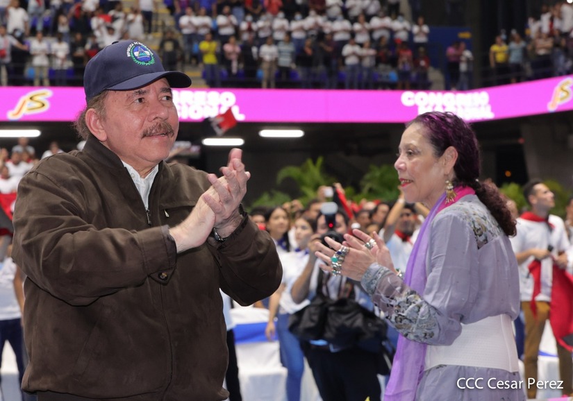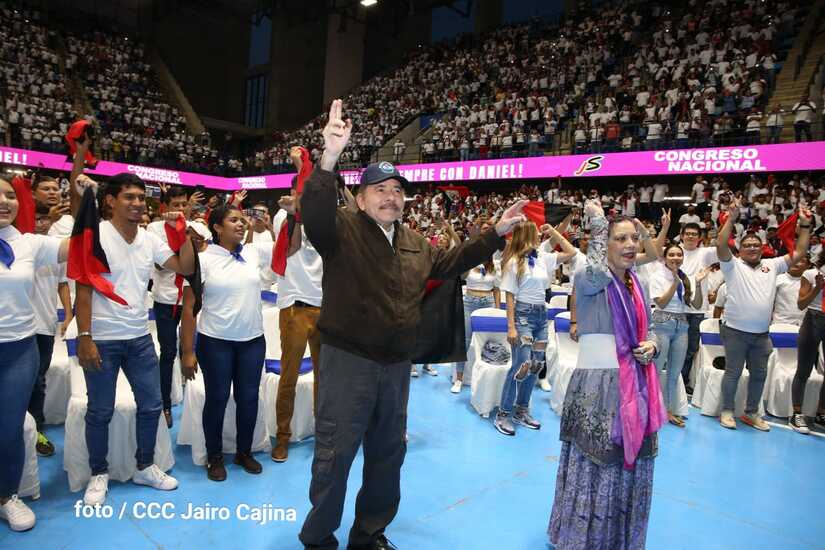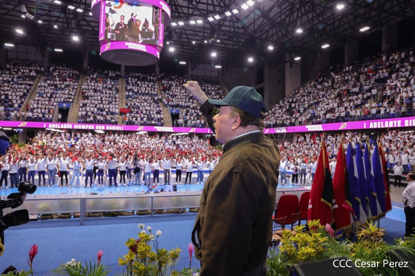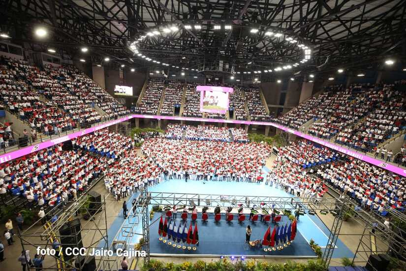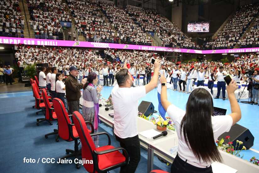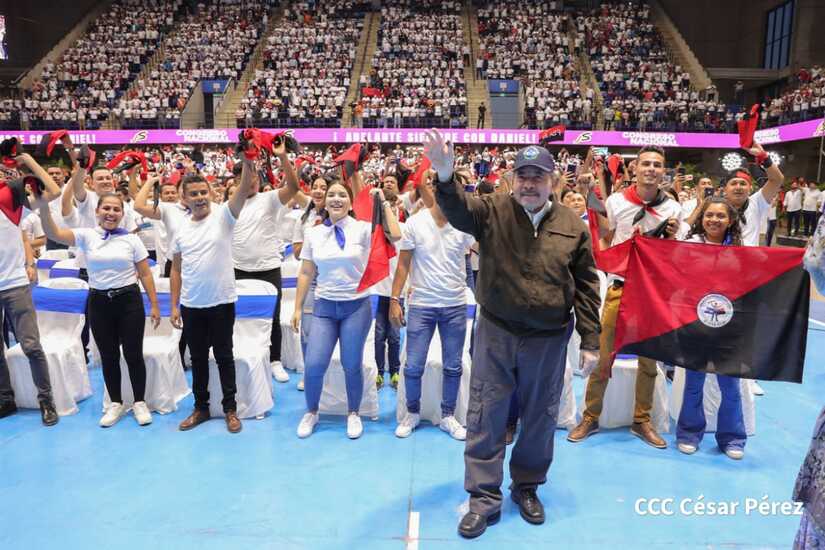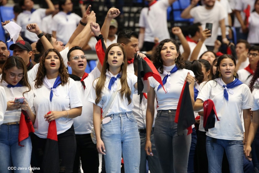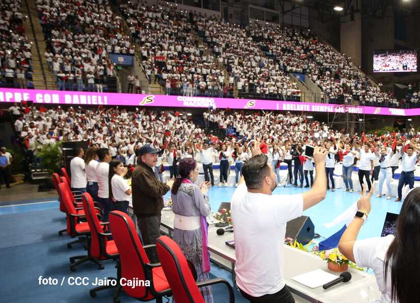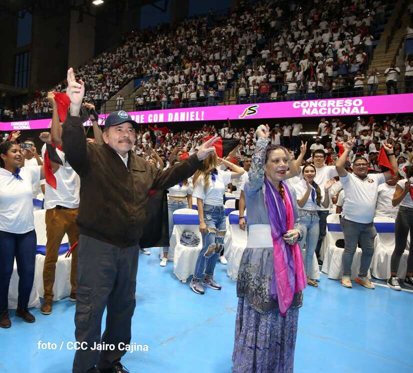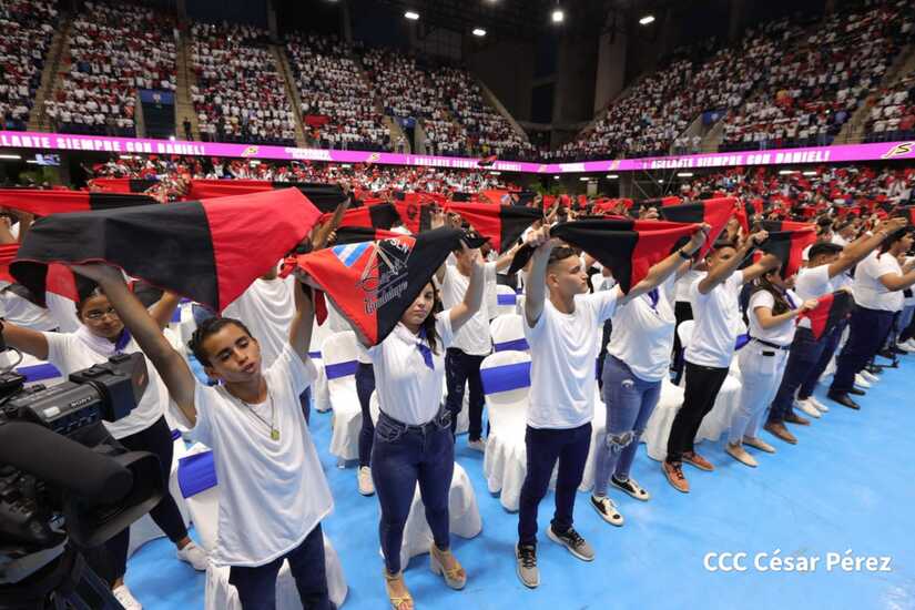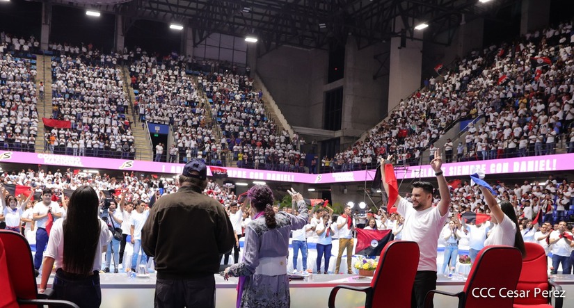 El Presidente Comandante Daniel Ortega y la Vicepresidenta Compañera Rosario Murillo participan en la clausura del Congreso Nacional de la Juventud Sandinista desde el Polideportivo Alexis Argüello.