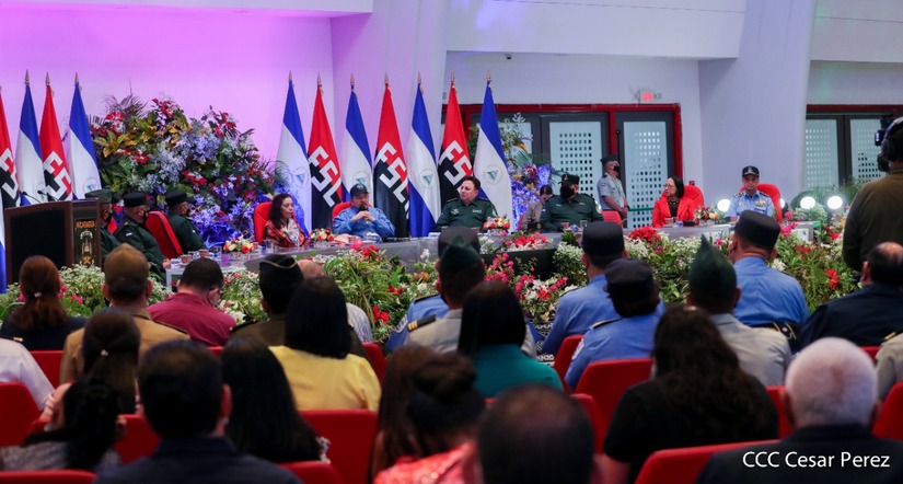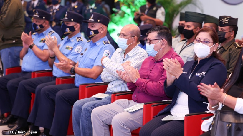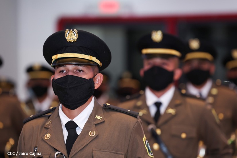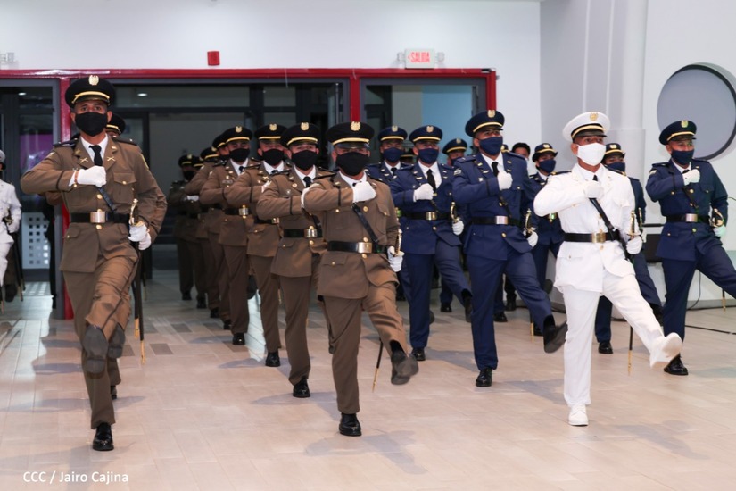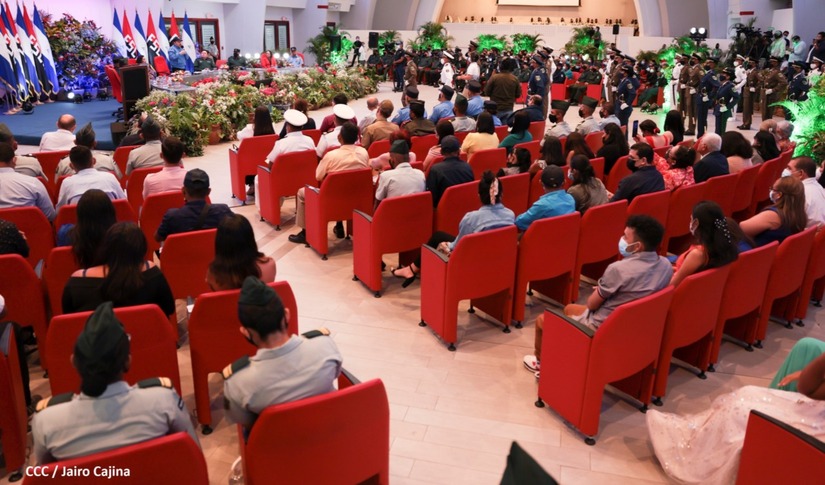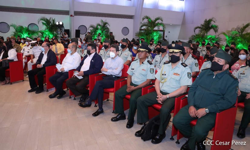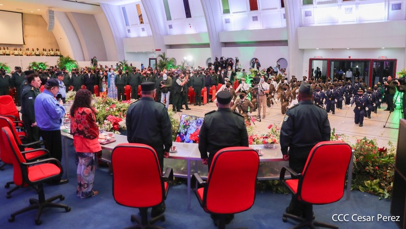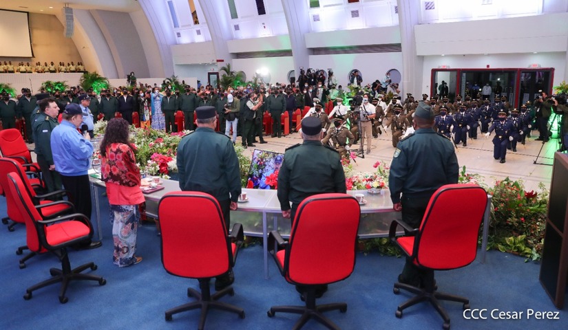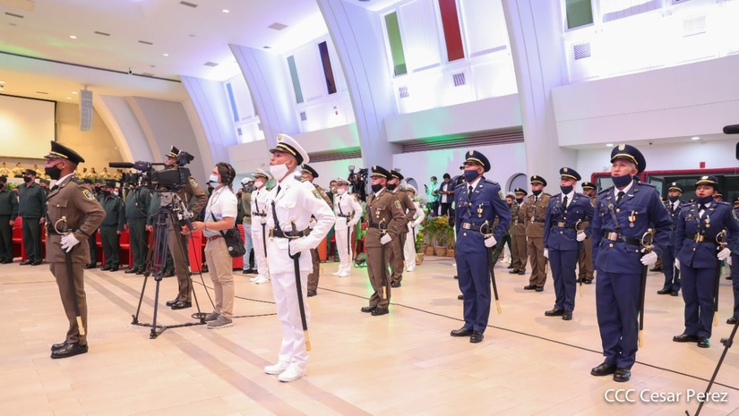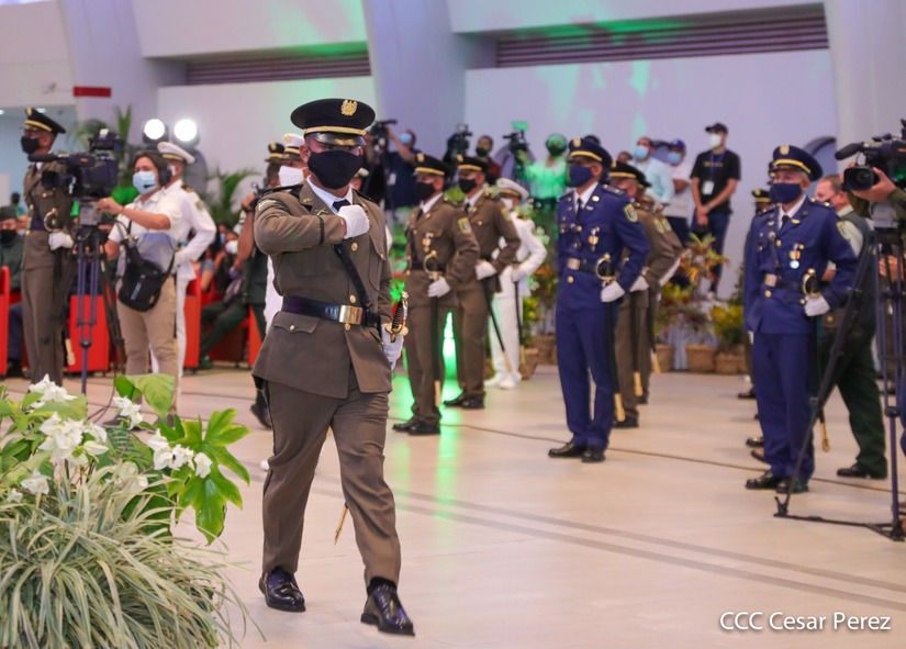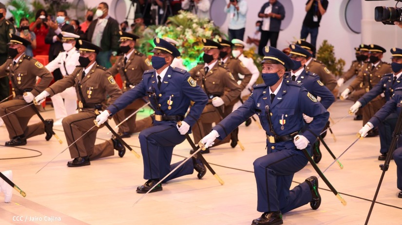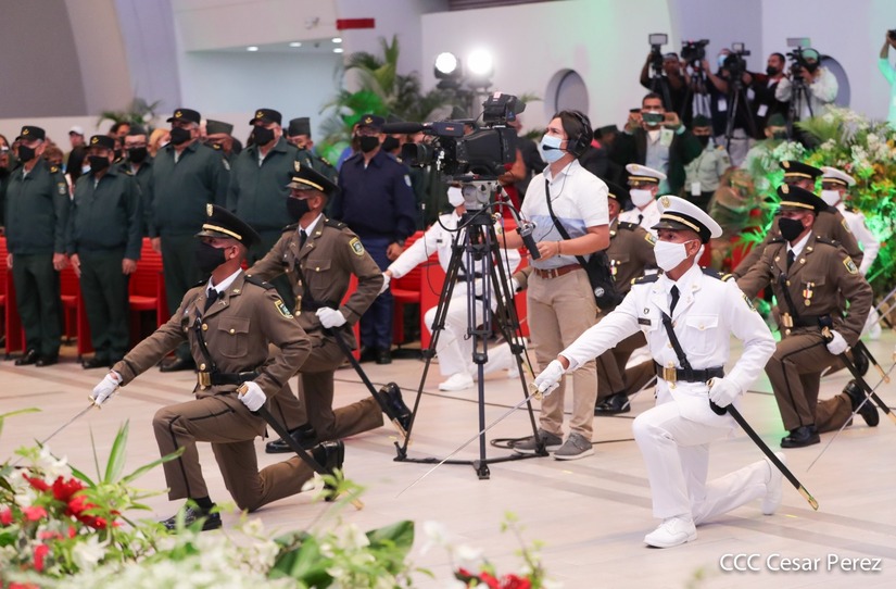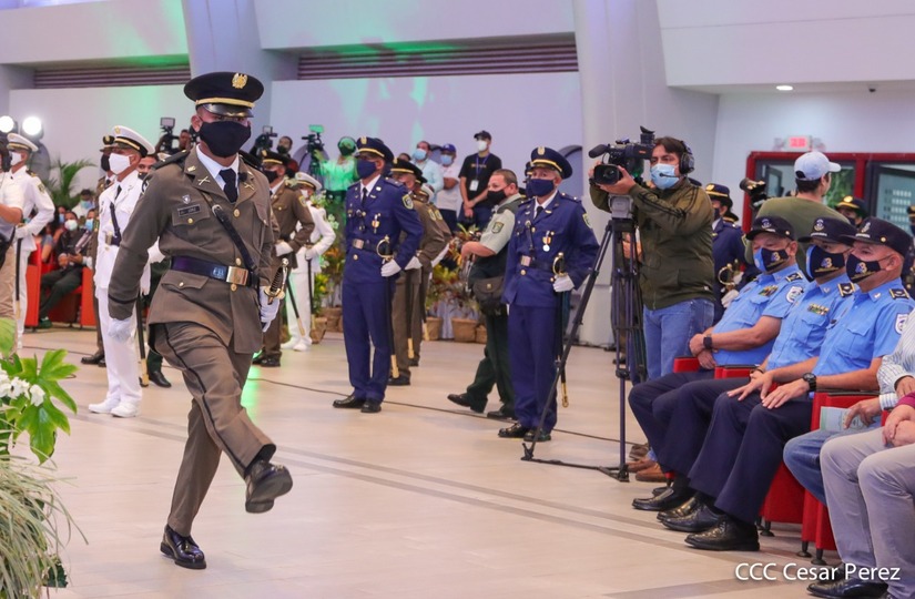 El acto de graduación que es dedicado al General de Hombres y Mujeres Libres, Augusto C. Sandino, se celebra desde el Centro de Convenciones Olof Palme y se gradúan 34 nuevos oficiales entre ellos 3 compañeras.
