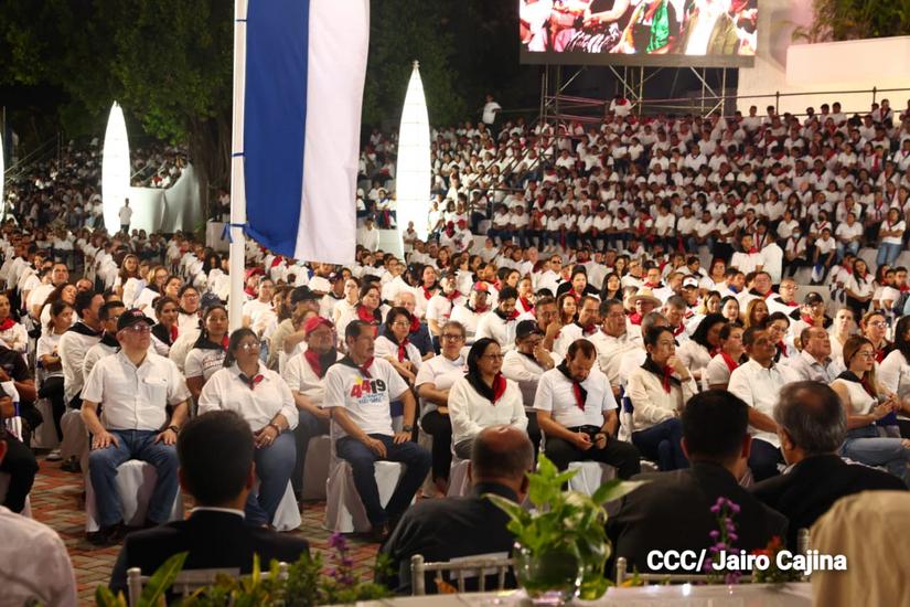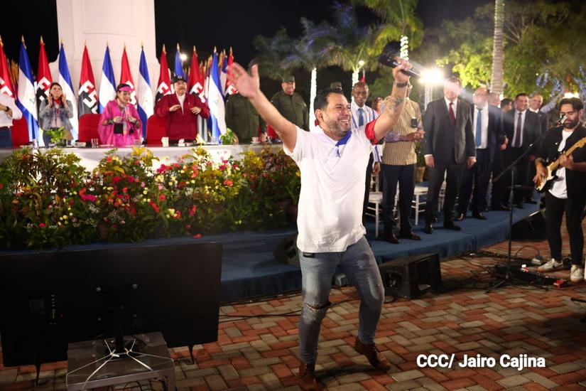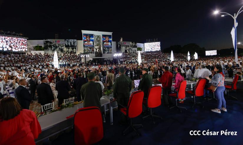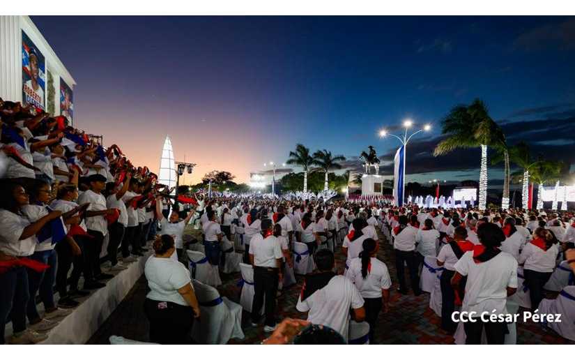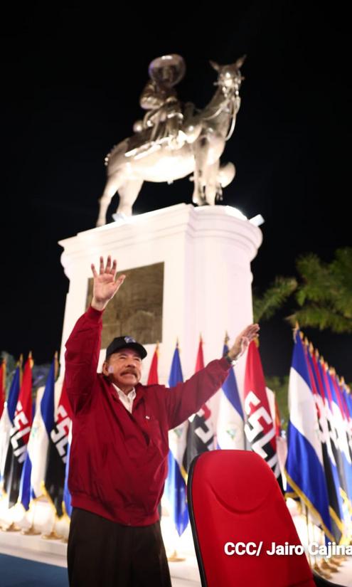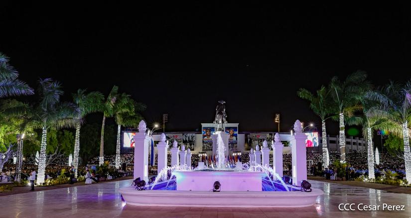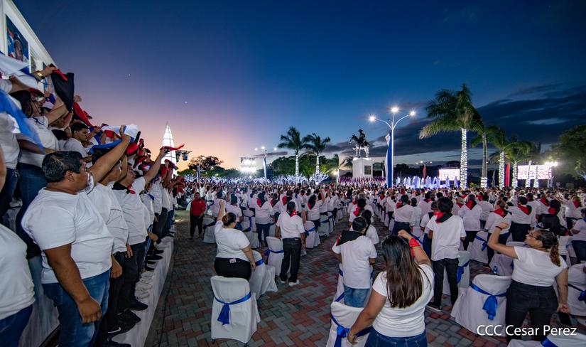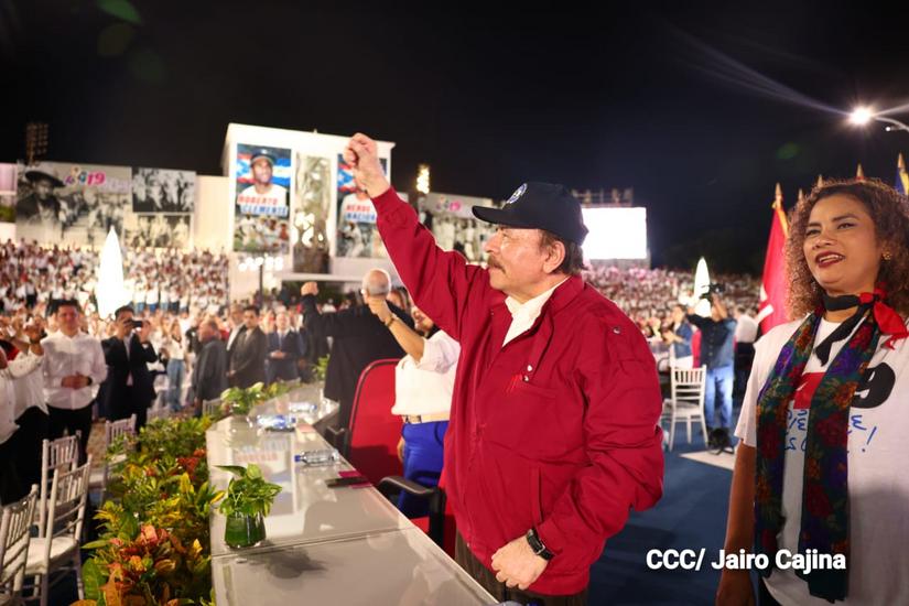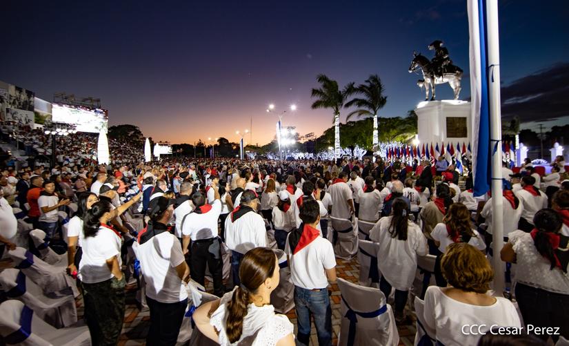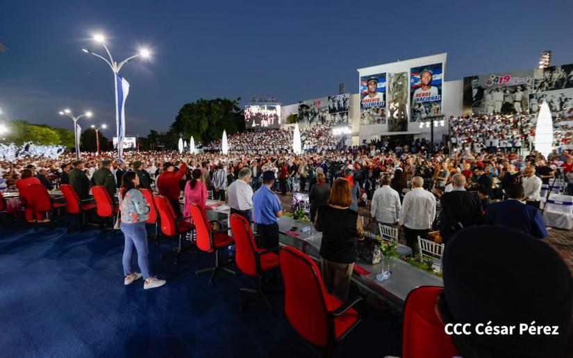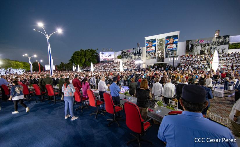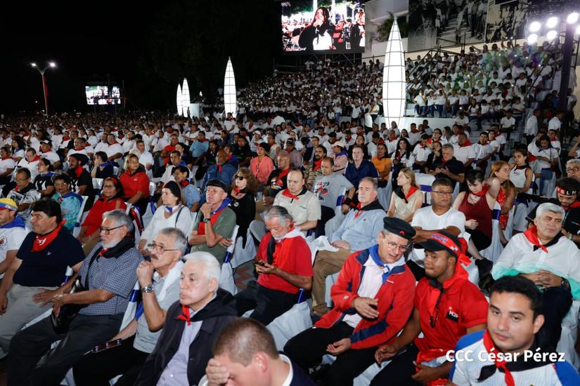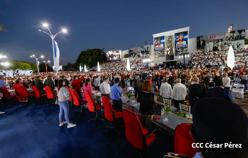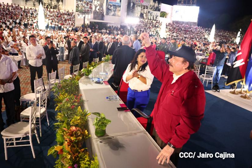 En la Plaza Parque de la Dignidad Nacional el Presidente Comandante Daniel Ortega Saavedra y la Vicepresidenta Compañera Rosario Murillo, presidieron el acto conmemorativo del 44 aniversario del triunfo de la Revolución Popular Sandinista.