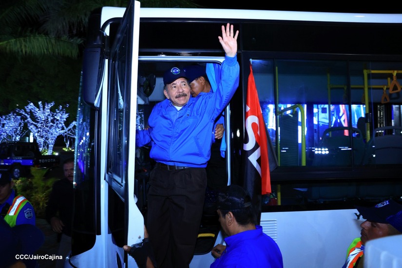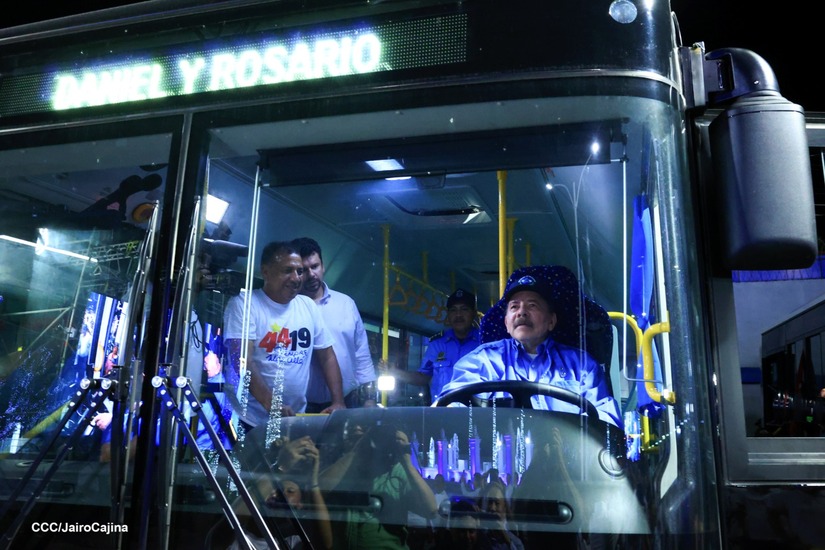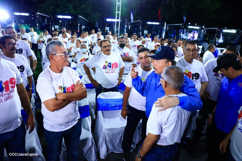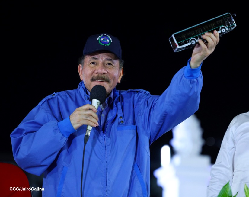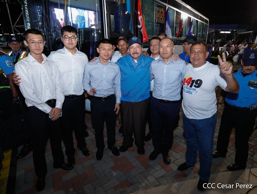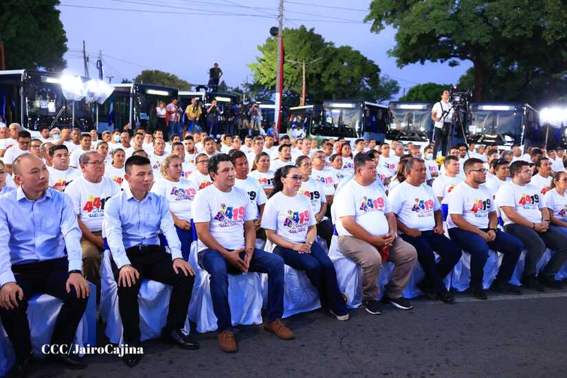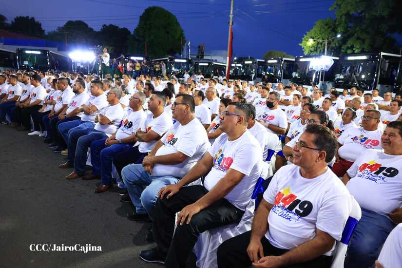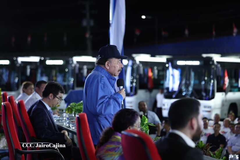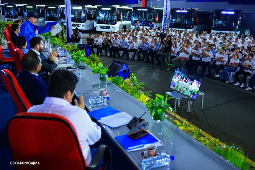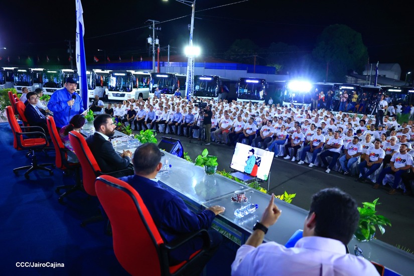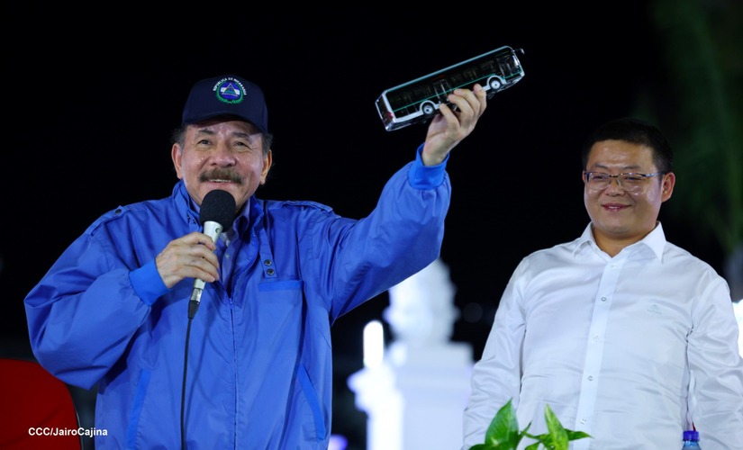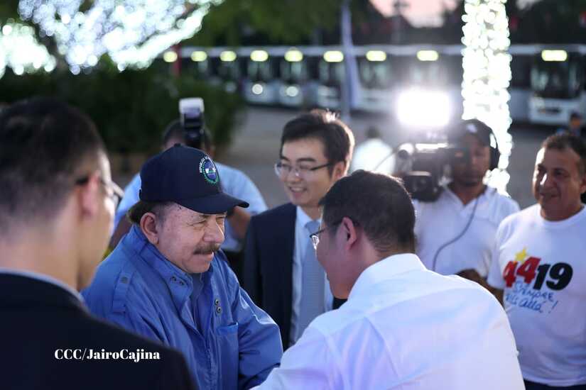 El Presidente de la República, Comandante Daniel Ortega y la Vicepresidenta Compañera Rosario Murillo, presiden el acto en donde se realiza la entrega de los 250 autobuses provenientes de la República Popular China a transportistas de Managua y Ciudad Sandino.